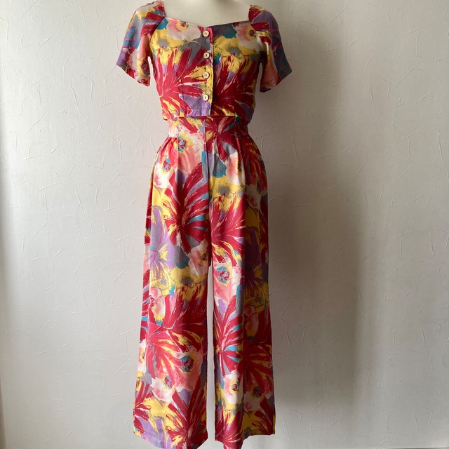 レーヨンのさらっとした肌触りの涼しげなセットアップ◯ 暑い夏に弾ける古着らしい柄がかっこよいです。短めのトップスはデニムと合わせたりショートパンツと合わせたり、夏に着やすい一枚。パンツもハイウエストでワイドめな履きやすいシルエット。それぞれが楽しめる嬉しいセットアップになっています。 サイズ表示M レーヨン100% 日本製 Size (平置き寸法) トップス 身幅 約42cm 着丈 約34.5cm ボトムス ウエスト幅 約28cm〜40cmくらい ゴム入り ヒップ 約110cm 股上 約36cm 股下 約60cm 着丈 約93.5cm ■ 商品について 経年によるシミ、ほつれ、匂い、くすみ、すり傷 などのダメージは可能な限りチェックをし、主なものは記載・写真掲載をするよう努めておりますが、細かいものは見逃す可能性がございます。 古さゆえに愛おしいものである事を何とぞご理解の上、ご購入いただければ幸いです。 特に色味・質感は、当方の撮影環境やお客様の表示環境などにより、実物と印象が若干違う可能性がございますので、疑問等ありましたら積極的に後述の"お問い合わせ方法"でご確認いただければと思います。 ■ 返品・返金・交換 返品・返金・交換は基本的にお受けできませんが、聞く耳は持ち合わせております。瑕疵・不備・問題点・ご不満などございましたら、後述の"お問い合わせ方法"でお気軽にご連絡ください。 ■ お問い合わせ方法 当店は、お客様の声は大切なフィードバックだと考えています。 何かご不明な点・ご意見などございましたら、事前・事後問わず何なりと、お気軽にお問い合わせください。 ・メッセージ 画面下(ショップに質問する)や隅(パソコンの場合)にある吹き出しアイコン ・電子メール メニュー → CONTACT の入力フォーム ■ さいごに ビンテージ衣料・アクセサリー・グッズの醍醐味は、上記のような多少の欠点と引き換えに、古いものや経年変化でしか得られない、他にはないデザイン、センス、色味、渋み、時間の重み などの価値を得る事ができるの点だと当店は考えています。 何とぞご理解の上、ご購入を検討いただければ幸いです。 ご一読いただき、どうもありがとうございました。