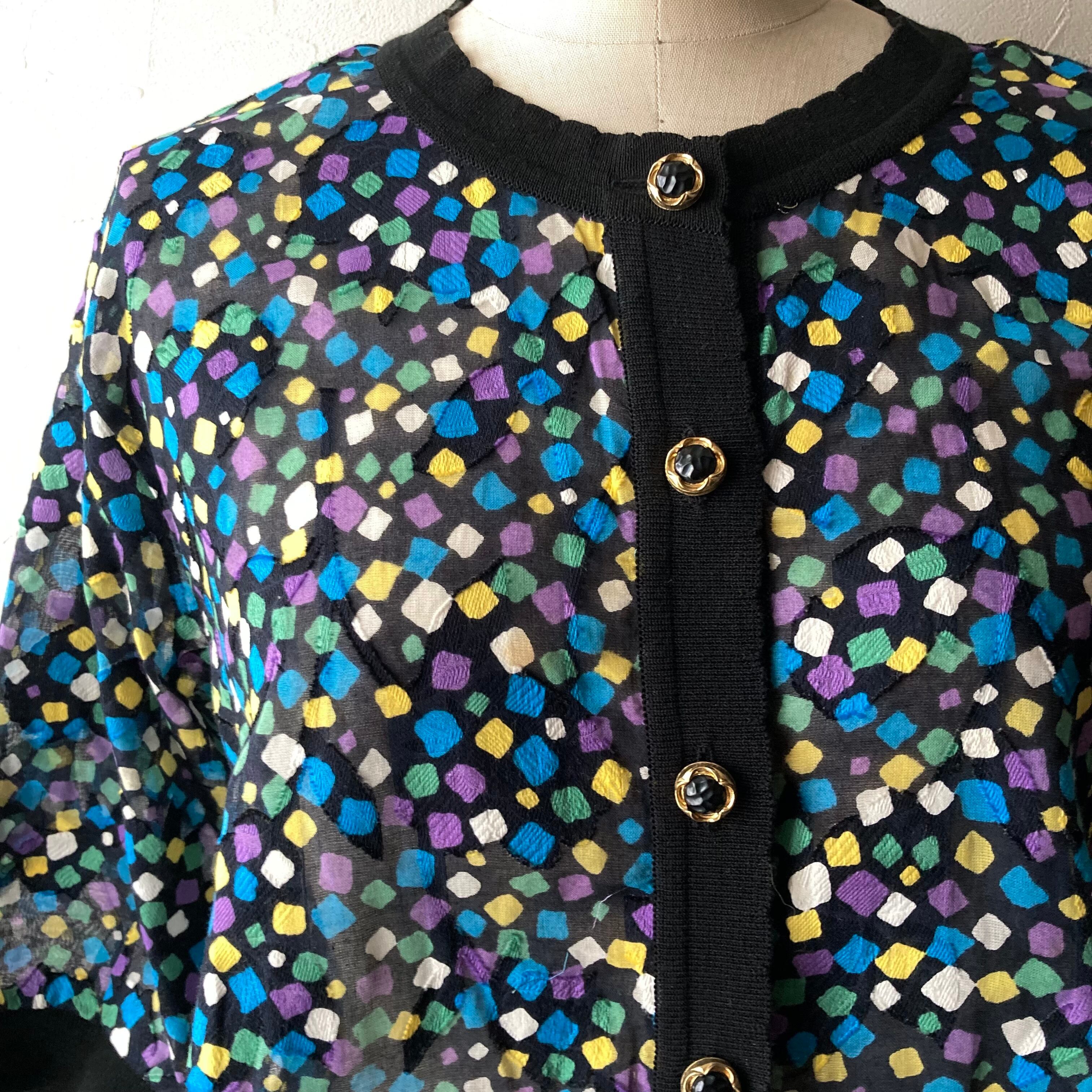 黒地にカラフルな四角い柄が古着らしい雰囲気で可愛いコットントップス。