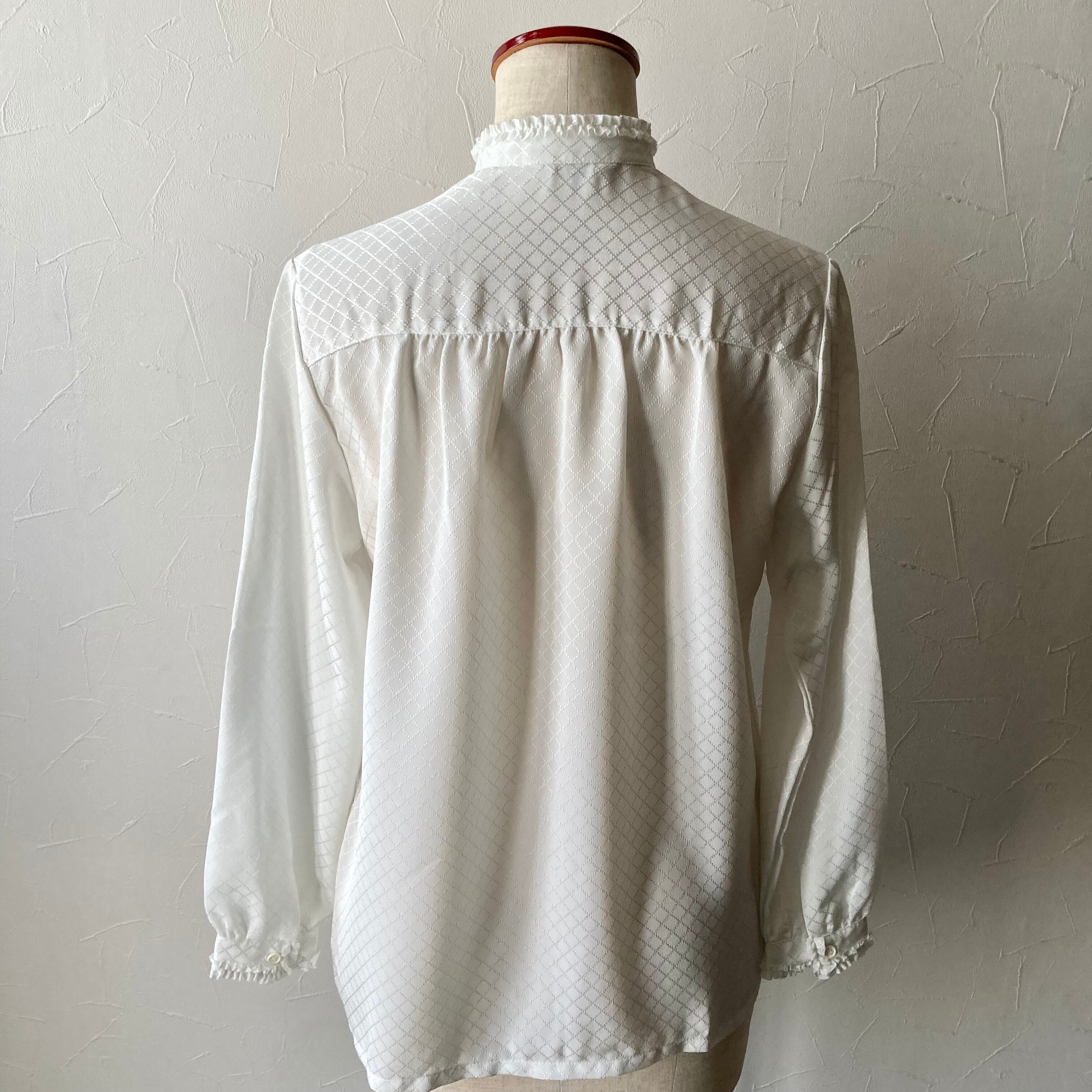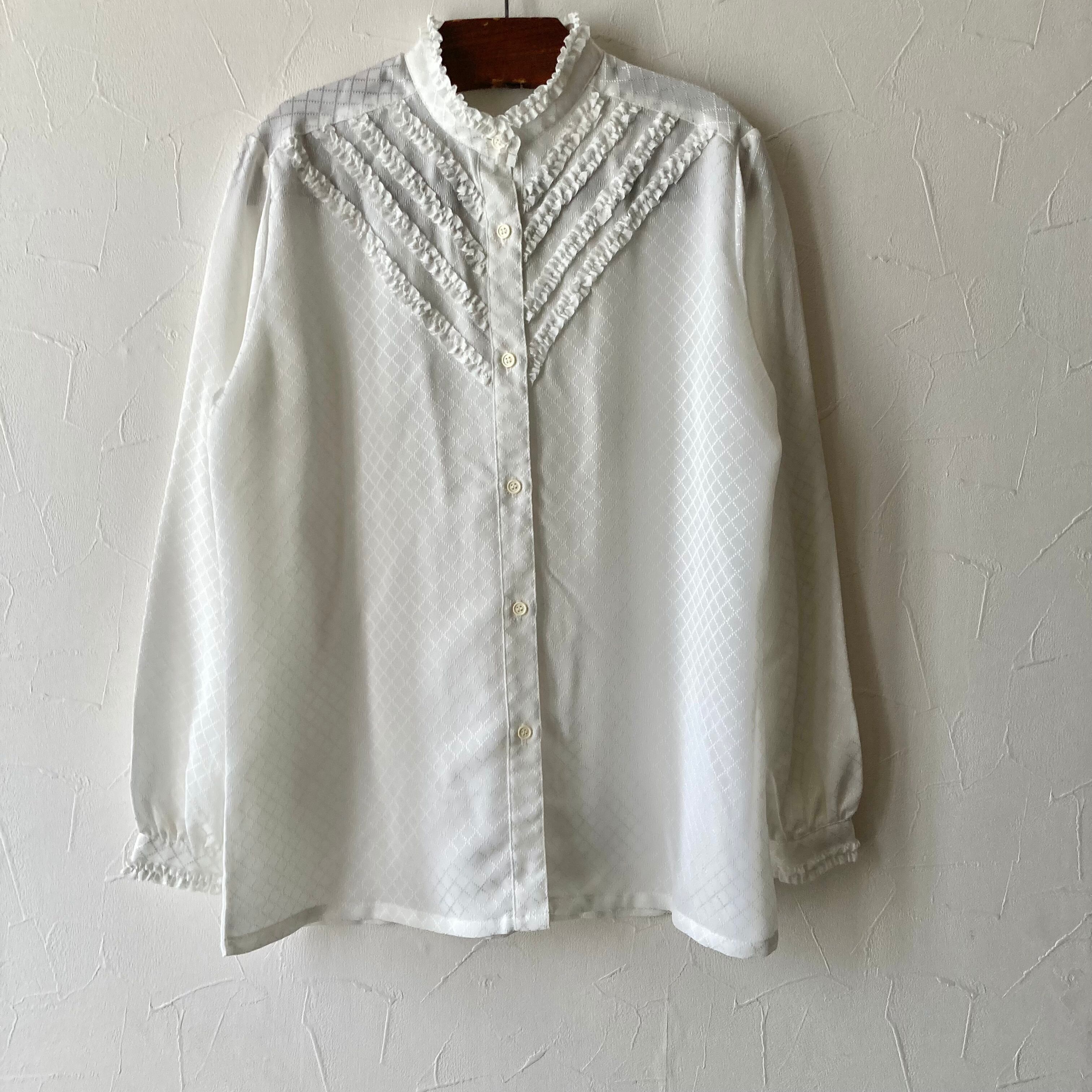 クシュクシュしたレースが首胸袖に装飾されたレトロブラウス。