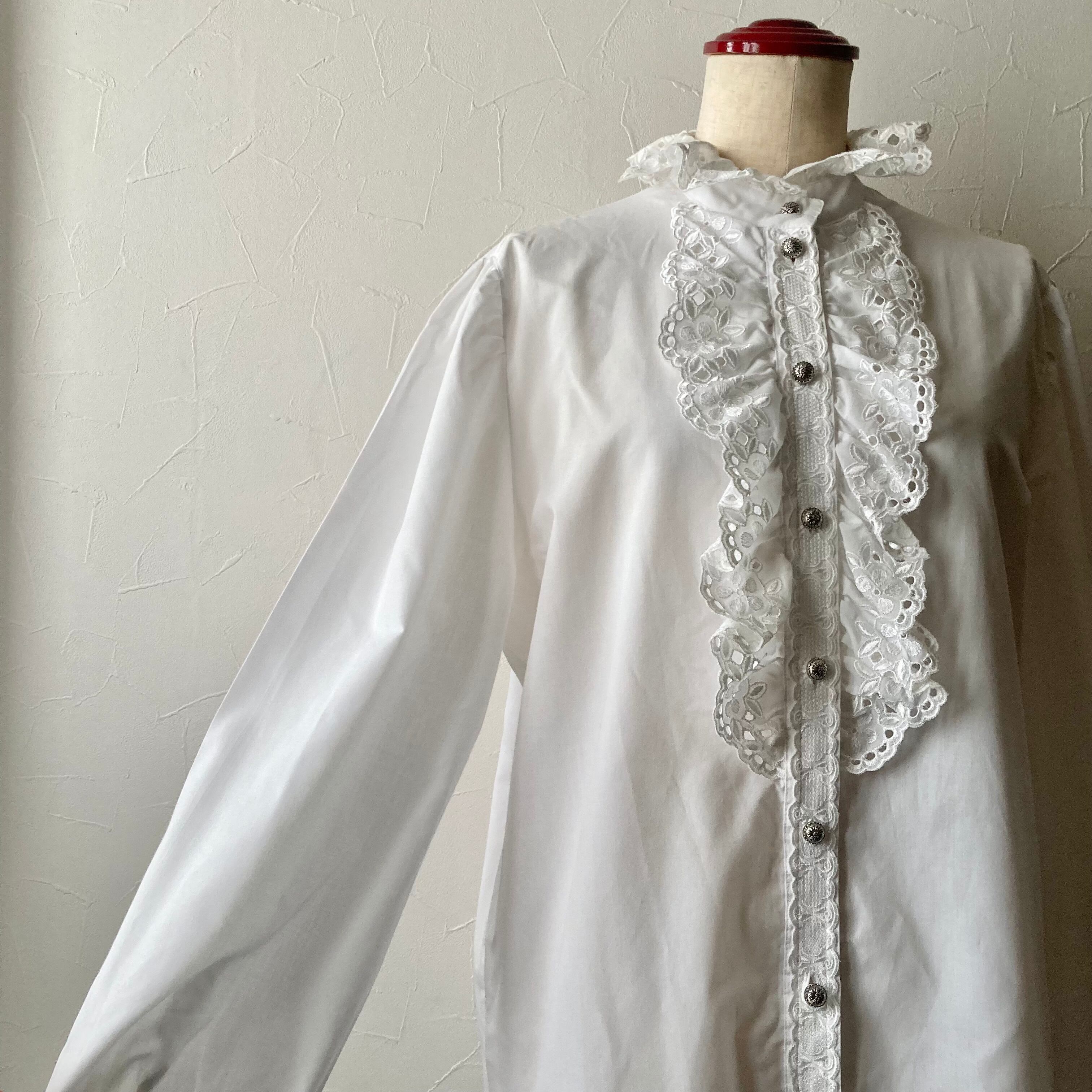 潔いホワイトカラーに存在感のある刺繍レースフリル、ボタンのラインにはレトロな可愛い刺繍が施されて、隅々までデザインが凝ったステキなブラウスです。シルバーのボタンもアクセントになっています。