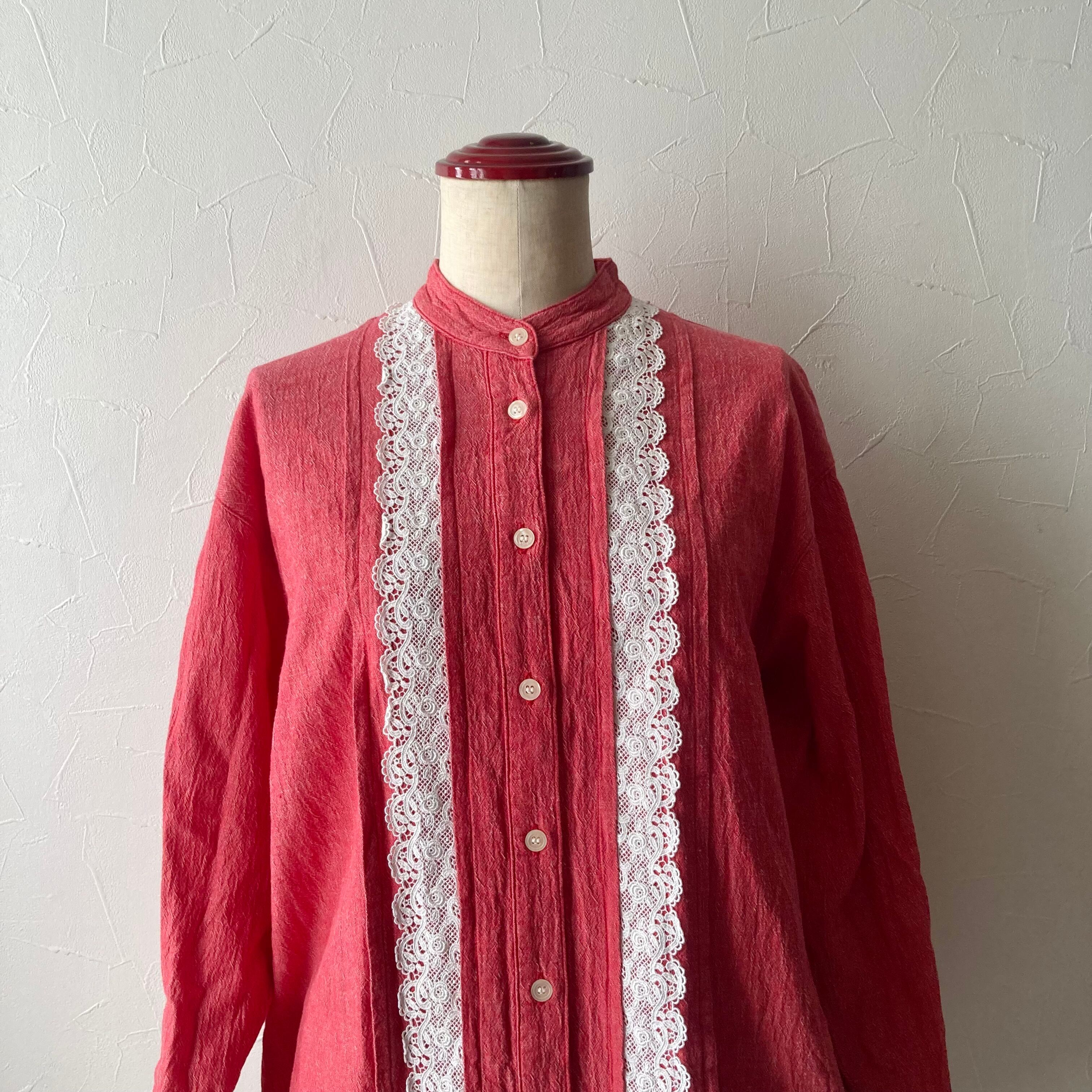 赤色のウォッシャブルなコットン素材にレトロなレースが可愛らしいレナウン製ブラウス。