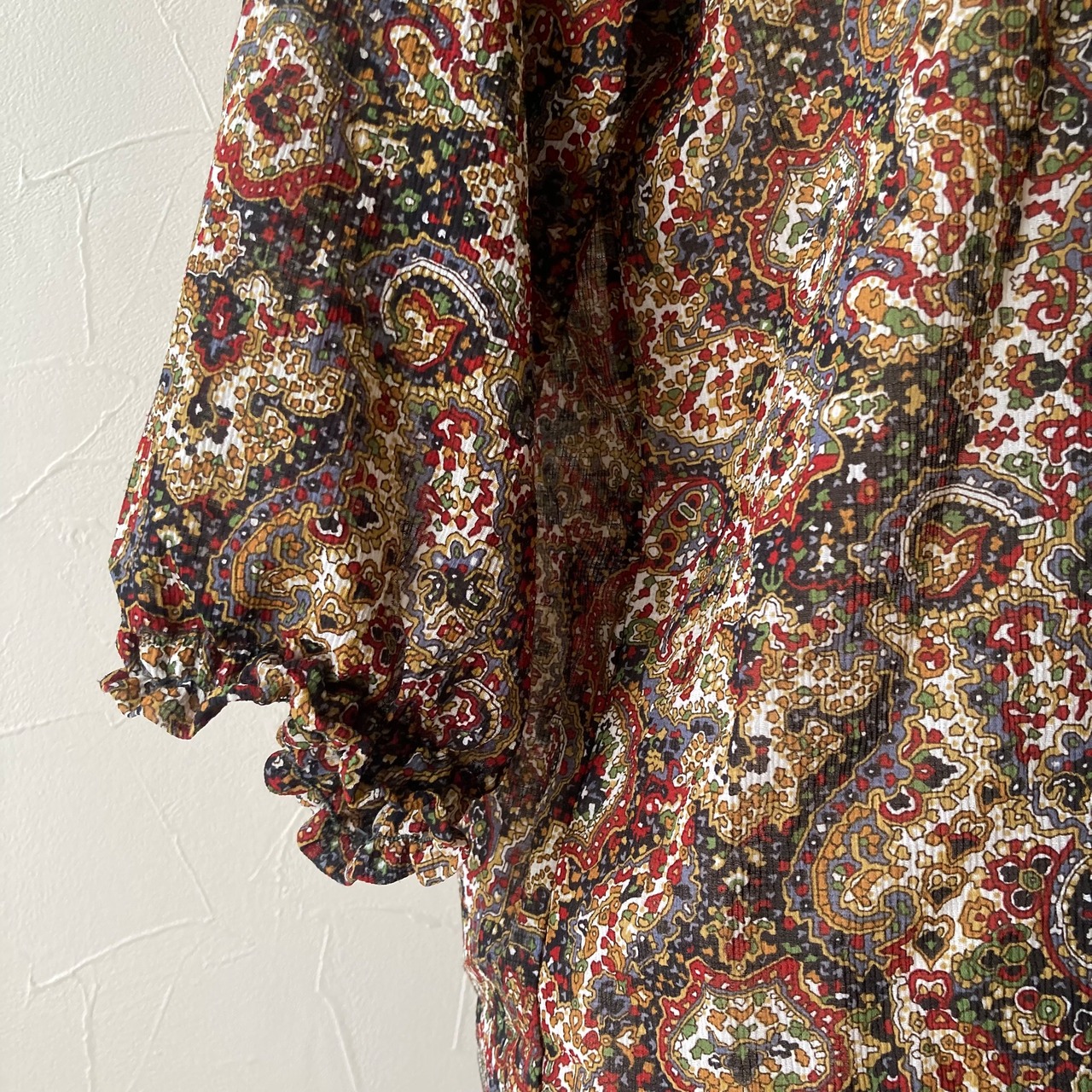 古着らしい柄が魅力的な五分袖程のブラウス。