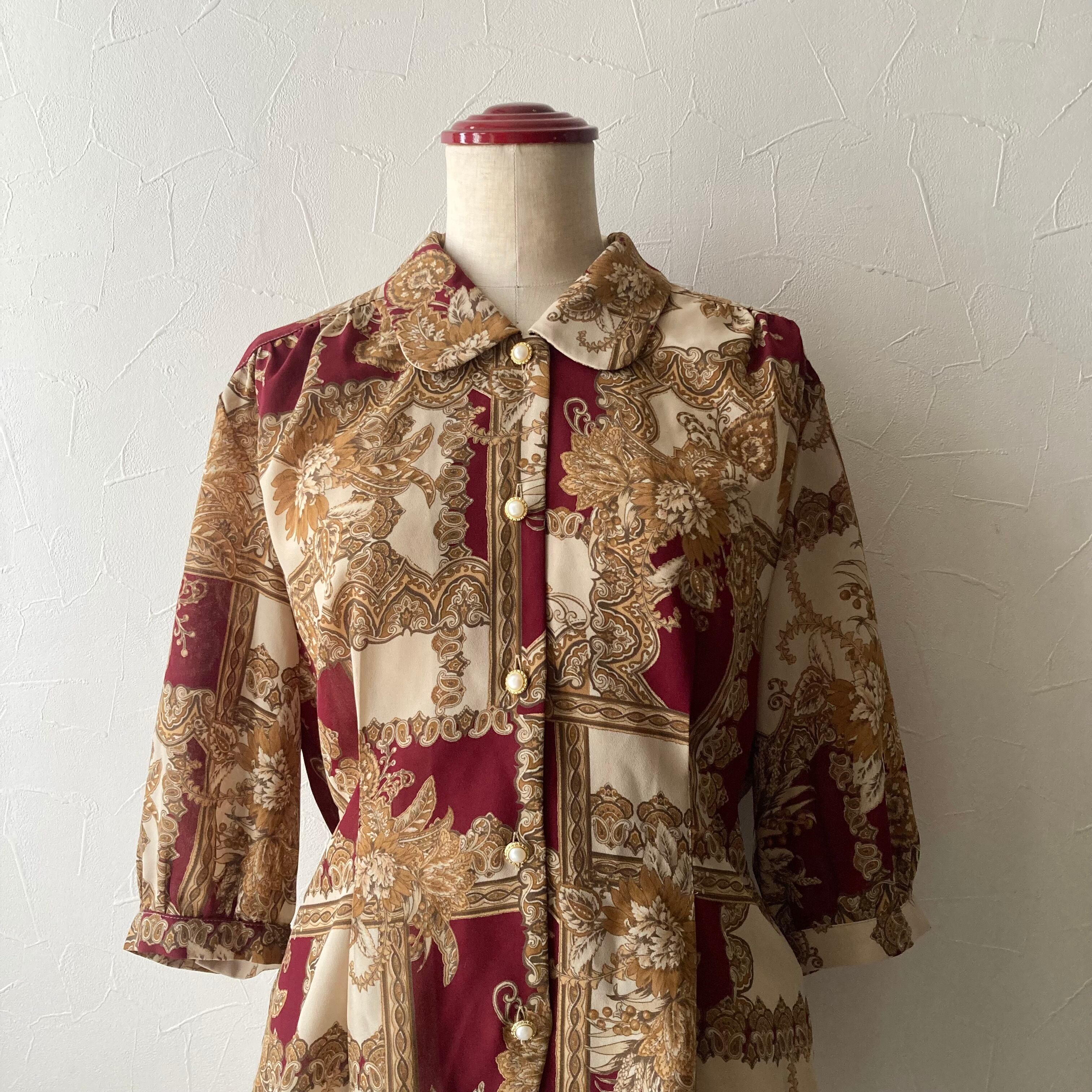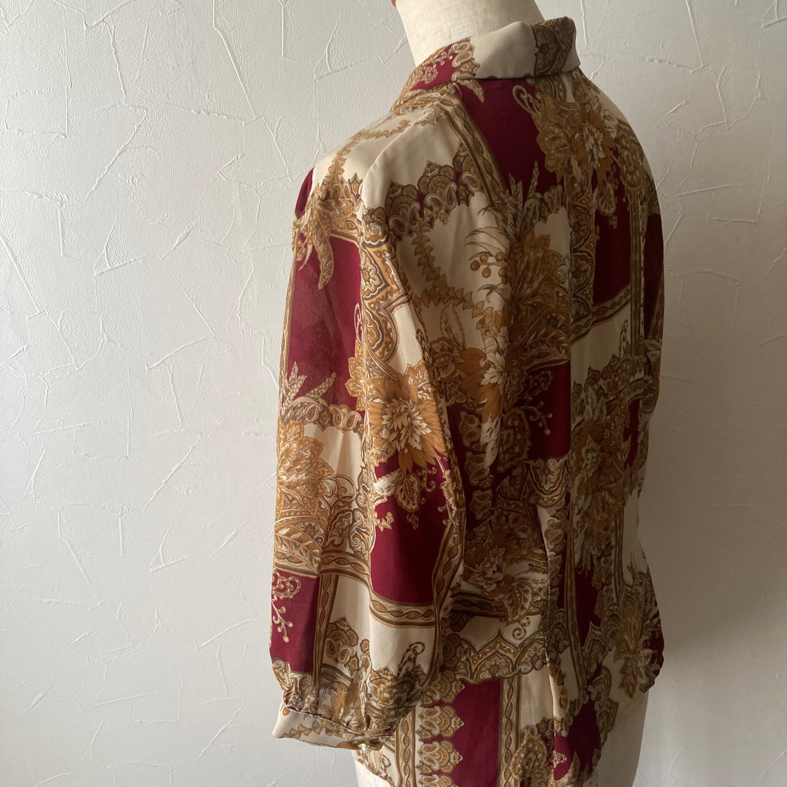 古着らしいエレガントな雰囲気の柄がステキなブラウス。白とゴールドのパール風ボタンもレトロで可愛いです。
