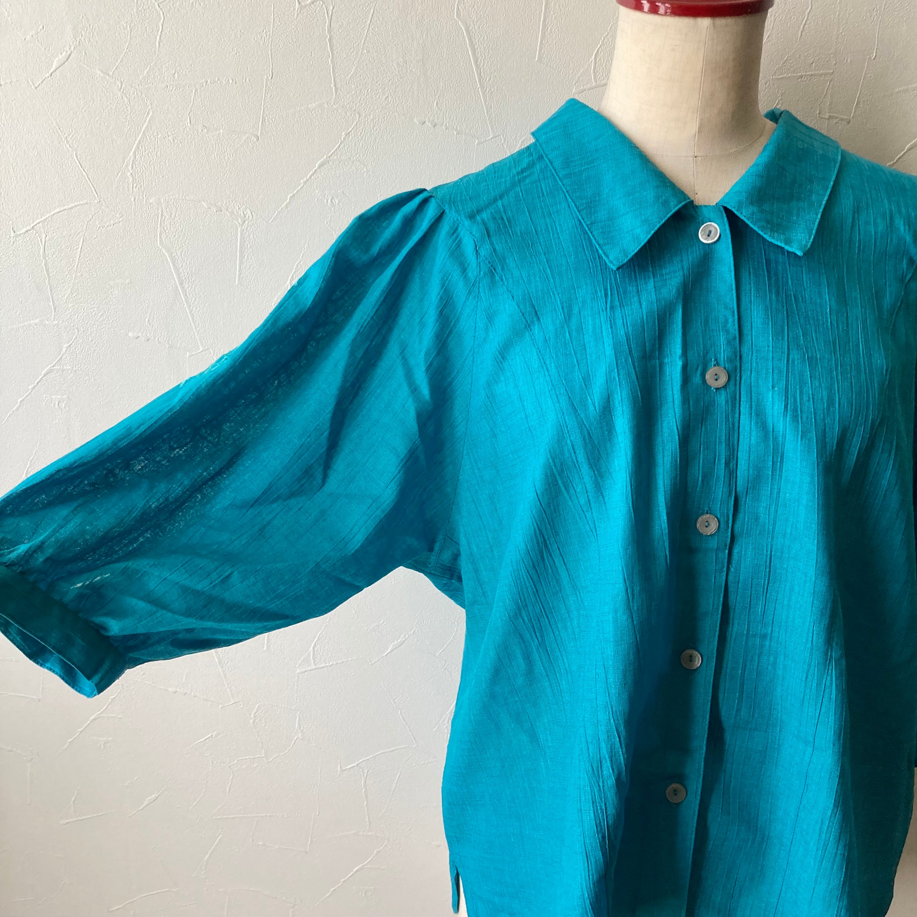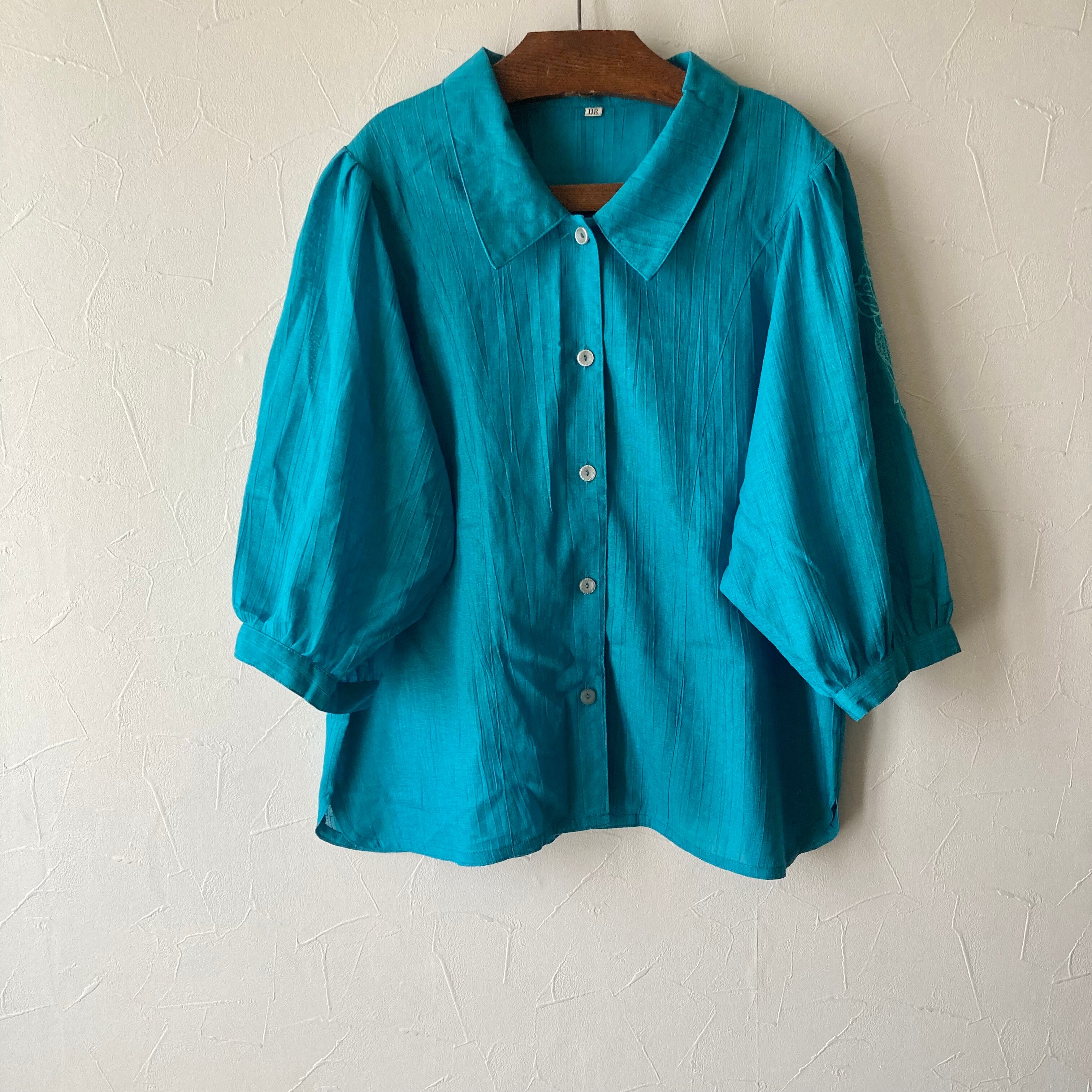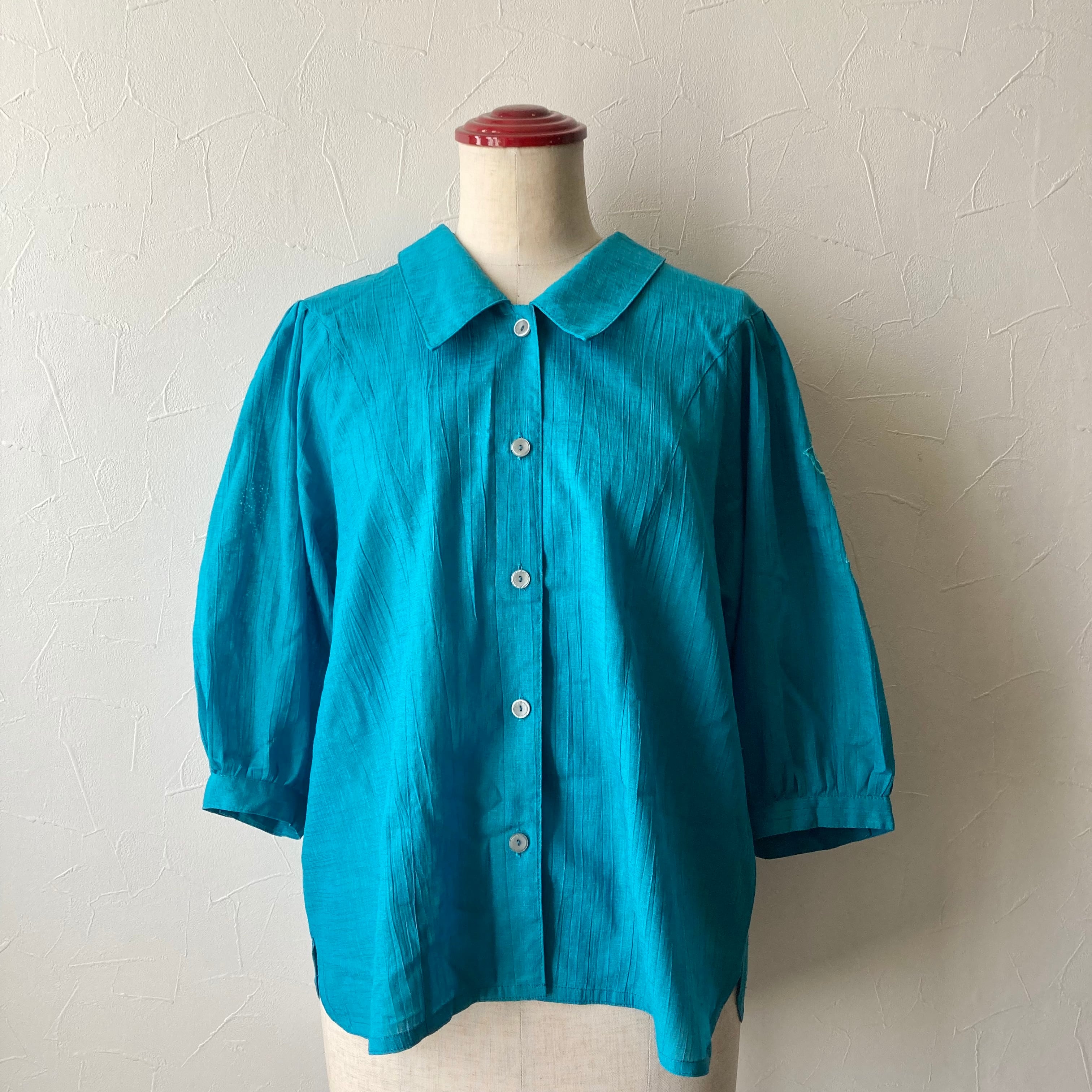 パッと目を惹く綺麗なお色と袖のカットワーク刺繍が魅力的な六部袖ほどのブラウス。