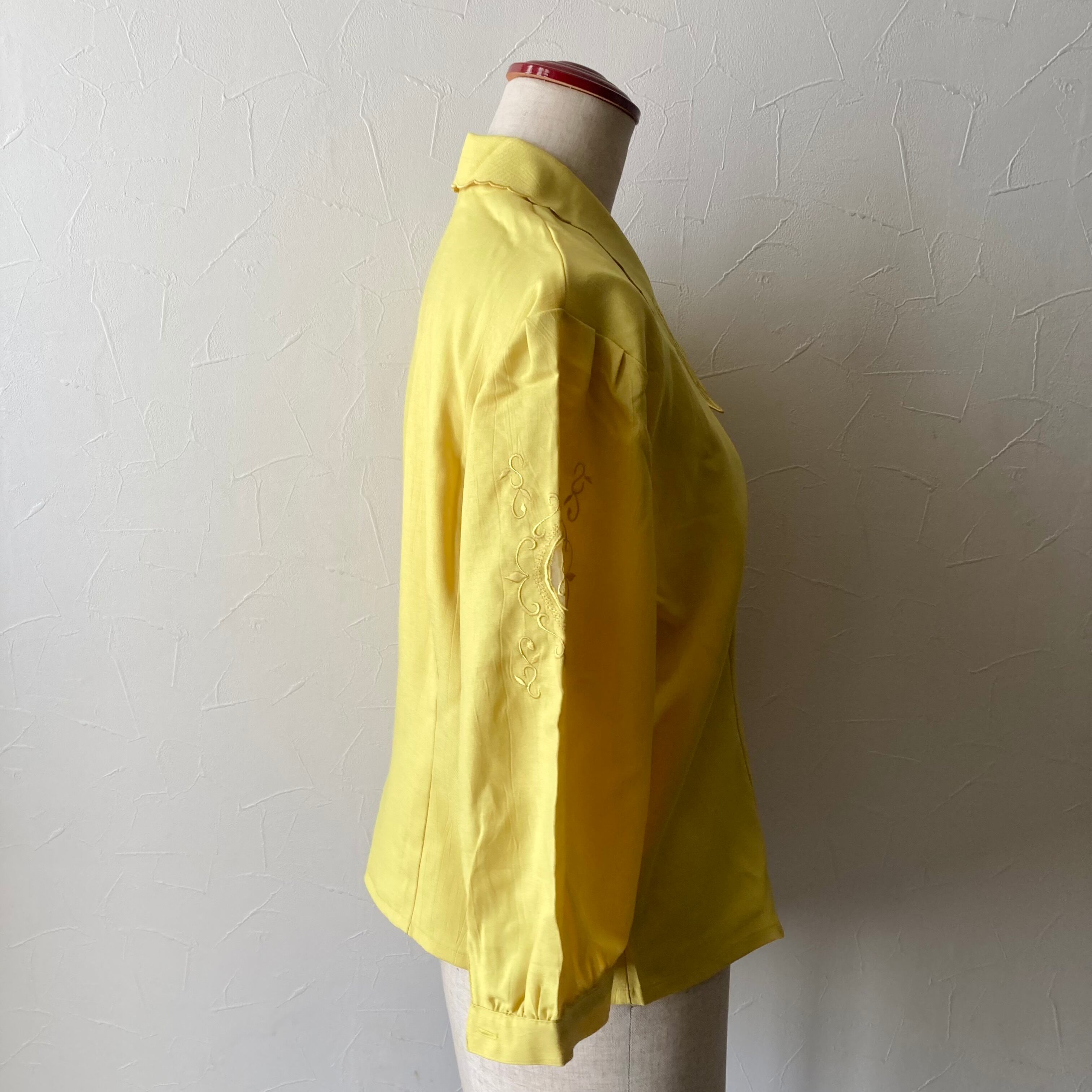 ポップな黄色に襟と袖の刺繍が可愛らしいレトロな六部袖ほどのブラウス。襟はカットワーク刺繍に加えスカラップデザイン、袖はレトロな刺繍模様に透け感がとってもステキです。