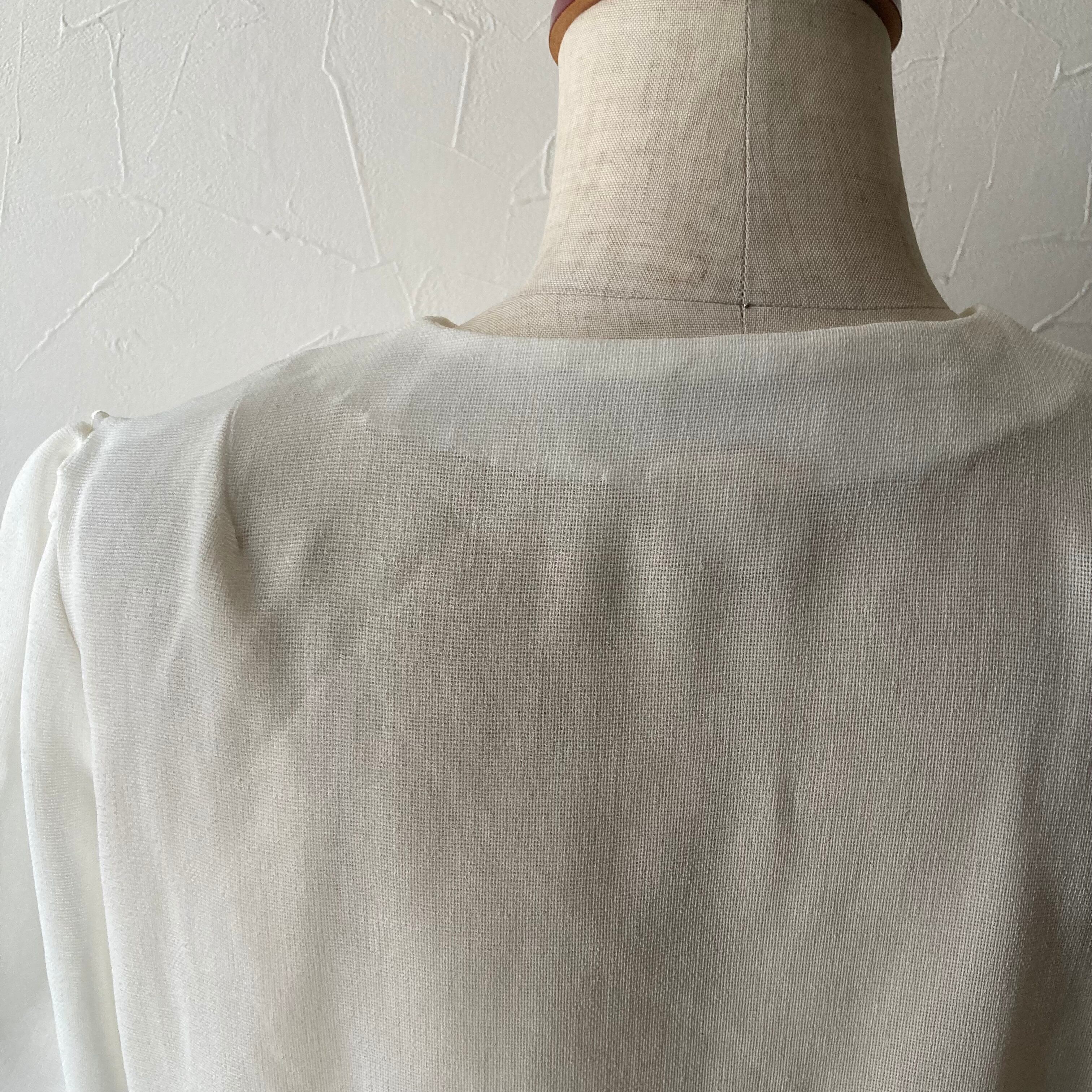 Vのスカラップにビーズ付き花びらの装飾が付いた可愛らしいブラウス。パフスリーブのシルエットとこじんまりとしたサイズ感も可愛いです。