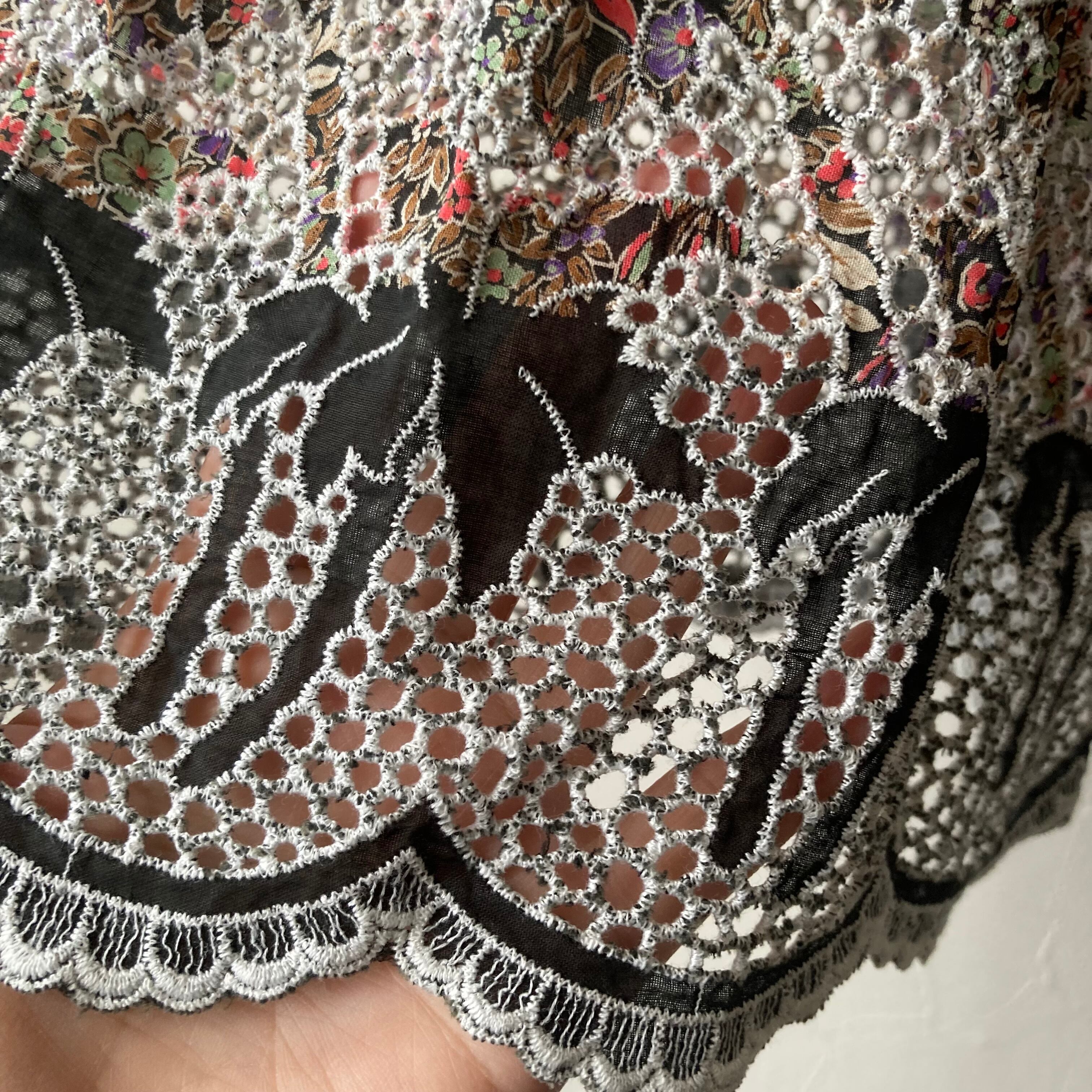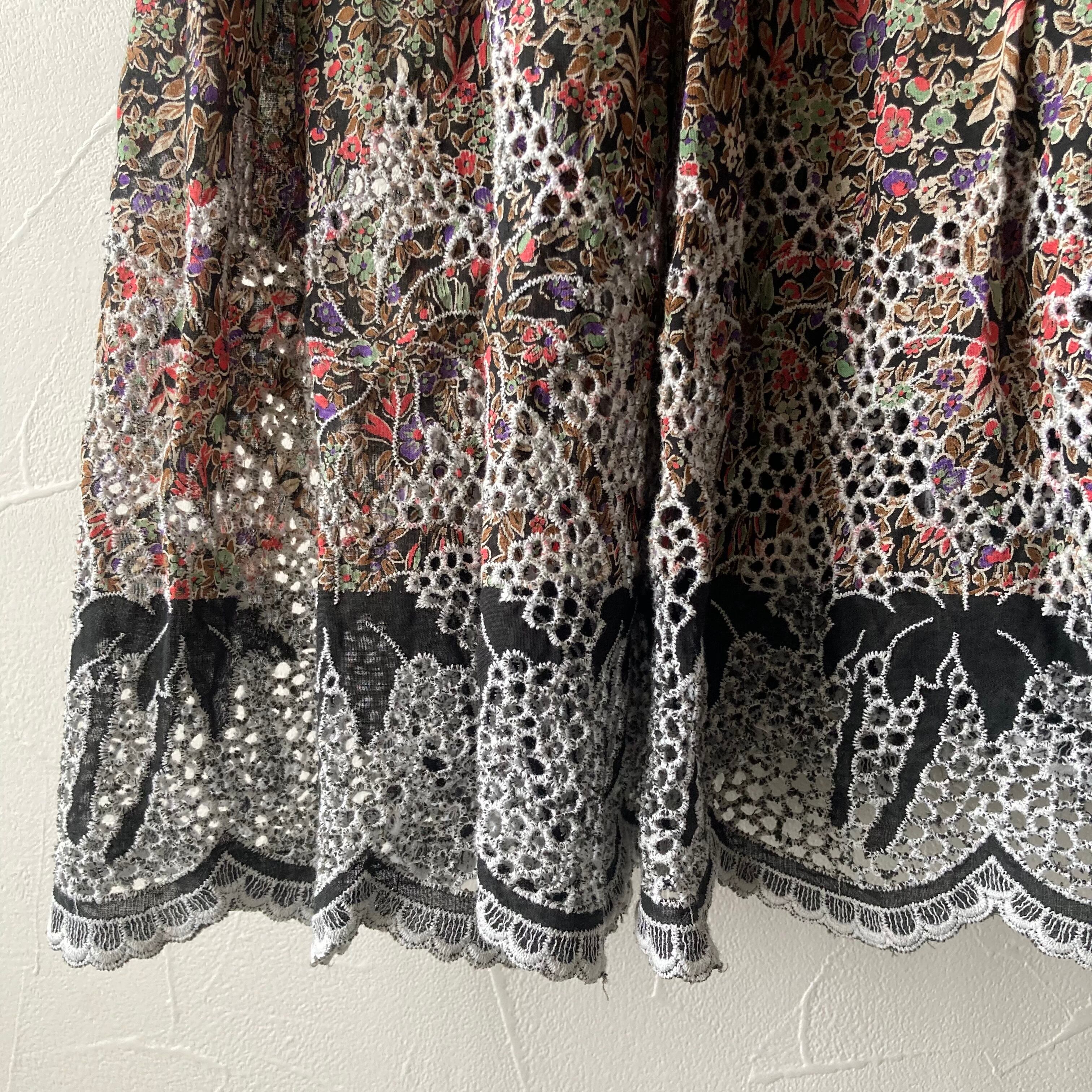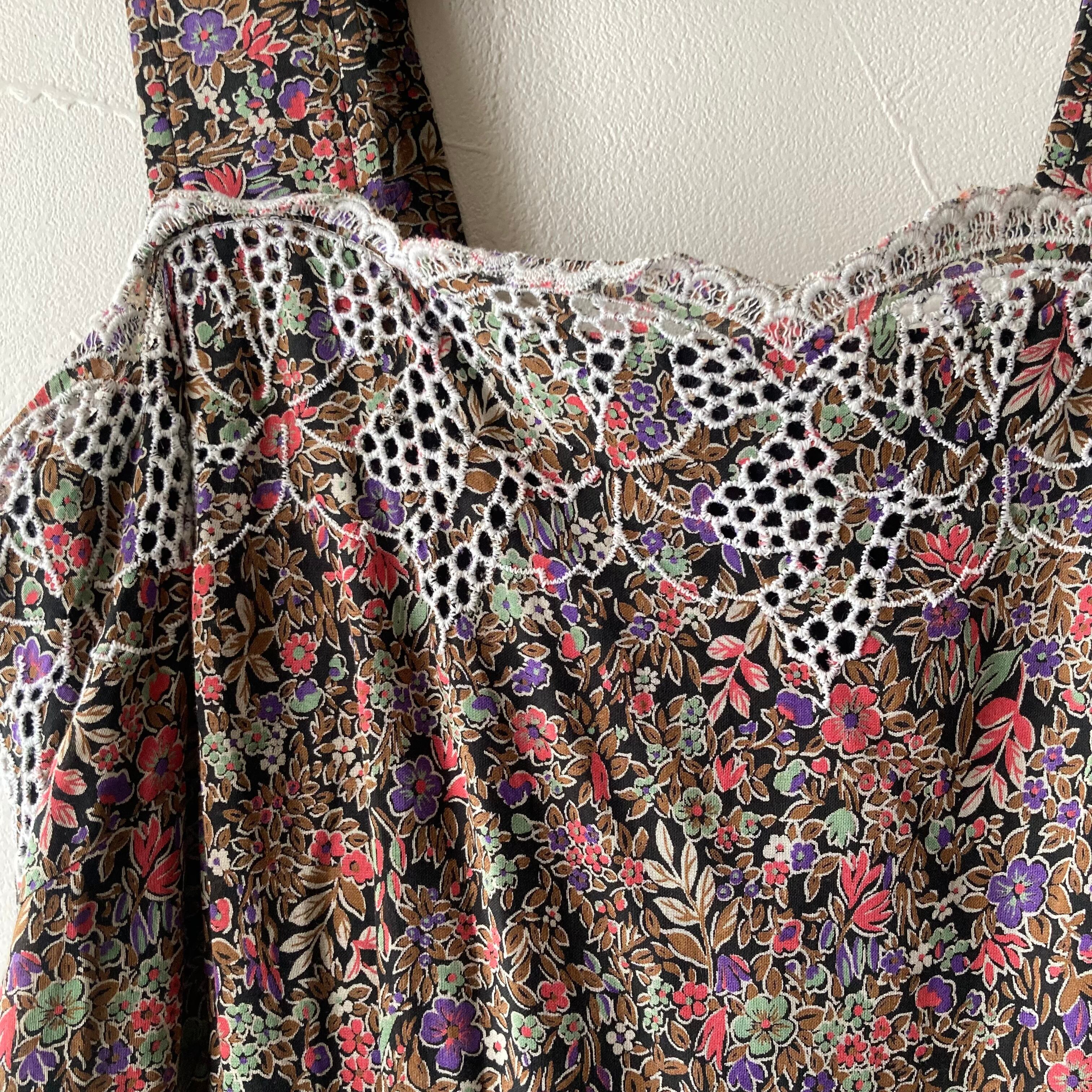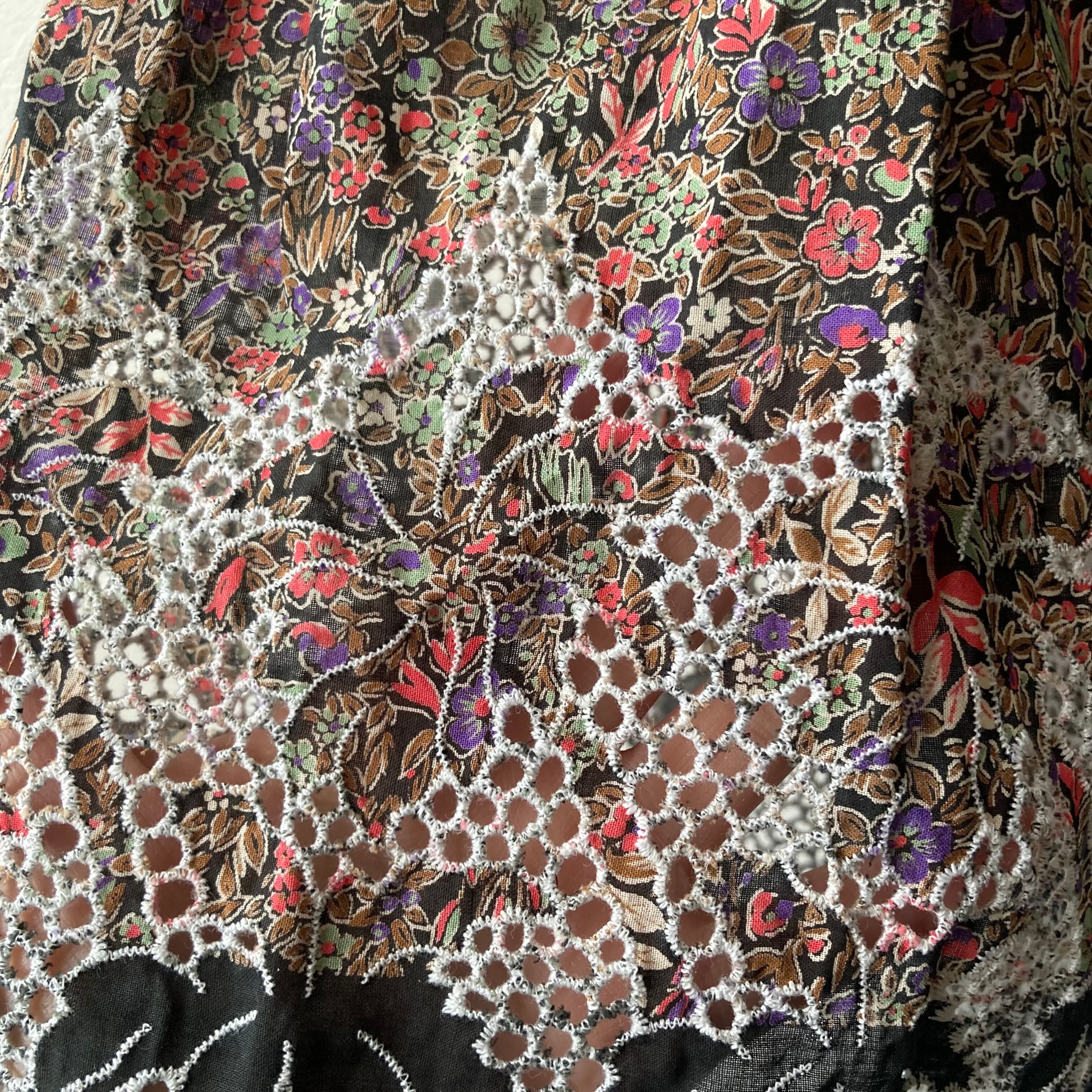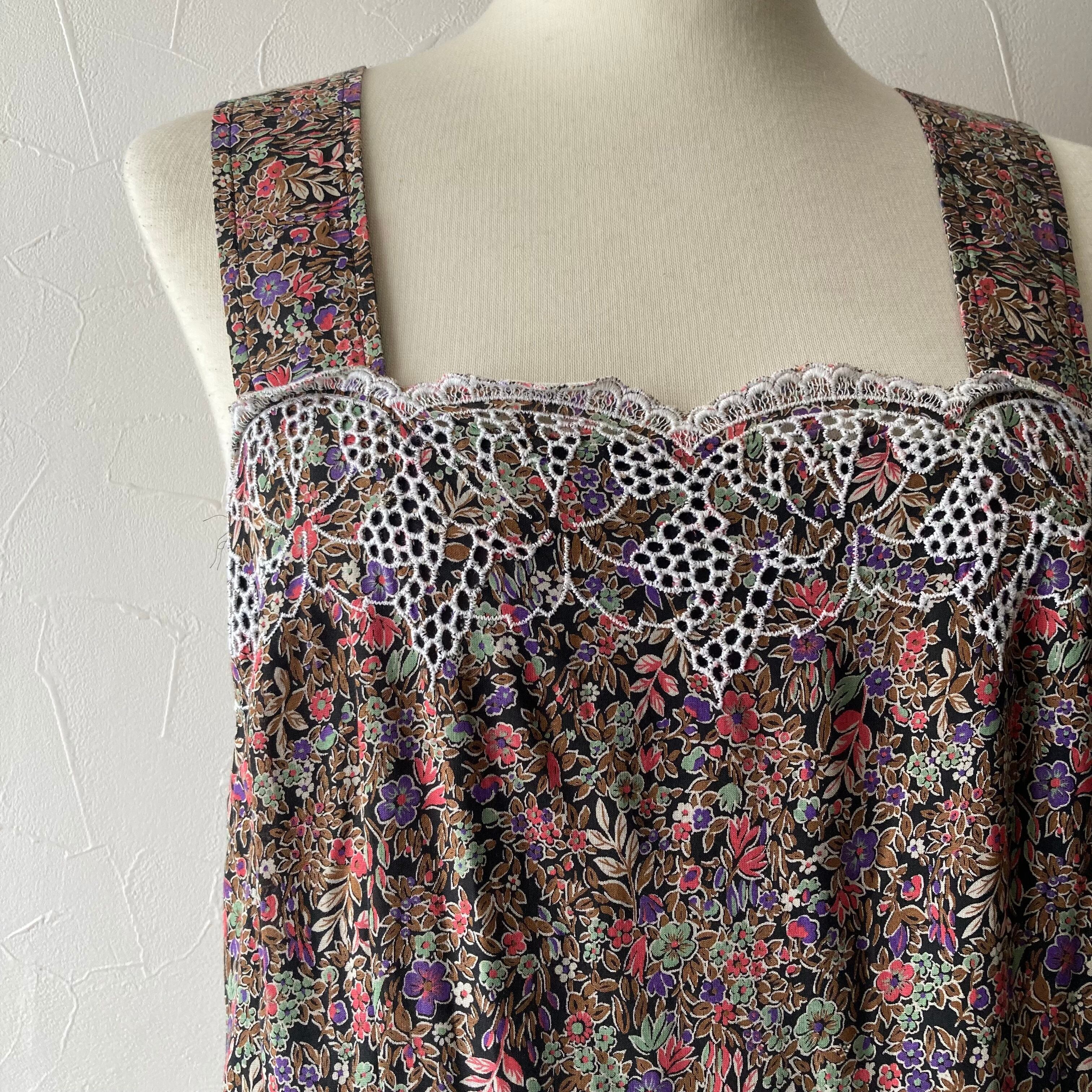 ヤシの木のレースが可愛らしいデザインのワンピース。落ち着いた色味のボタニカル柄で派手すぎず着やすい夏に活躍の一枚だと思います。
