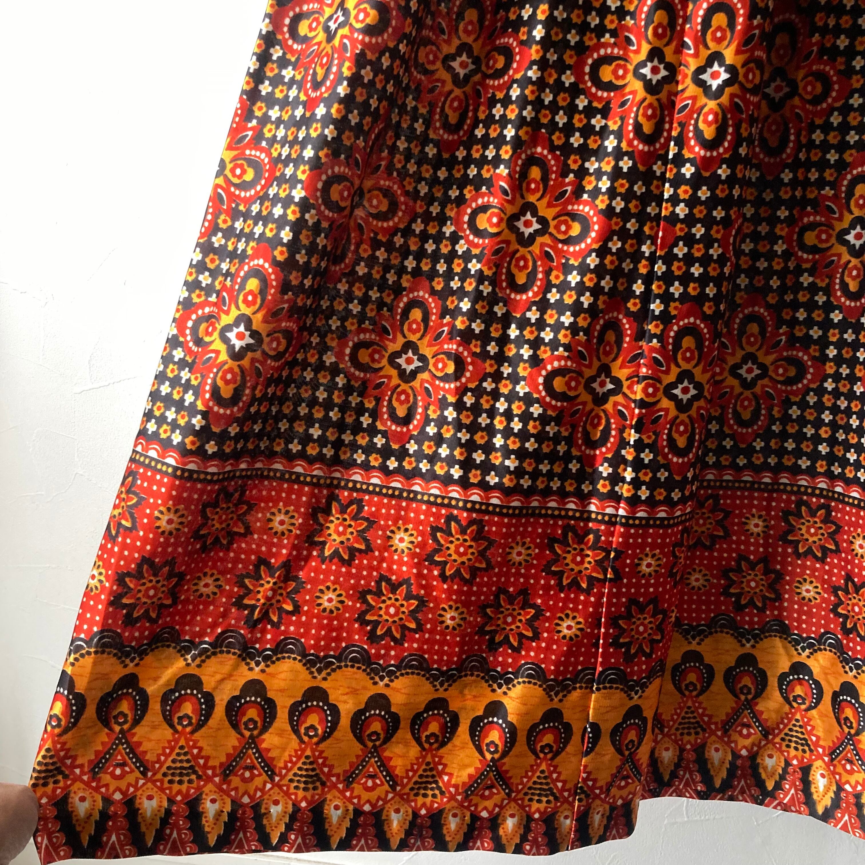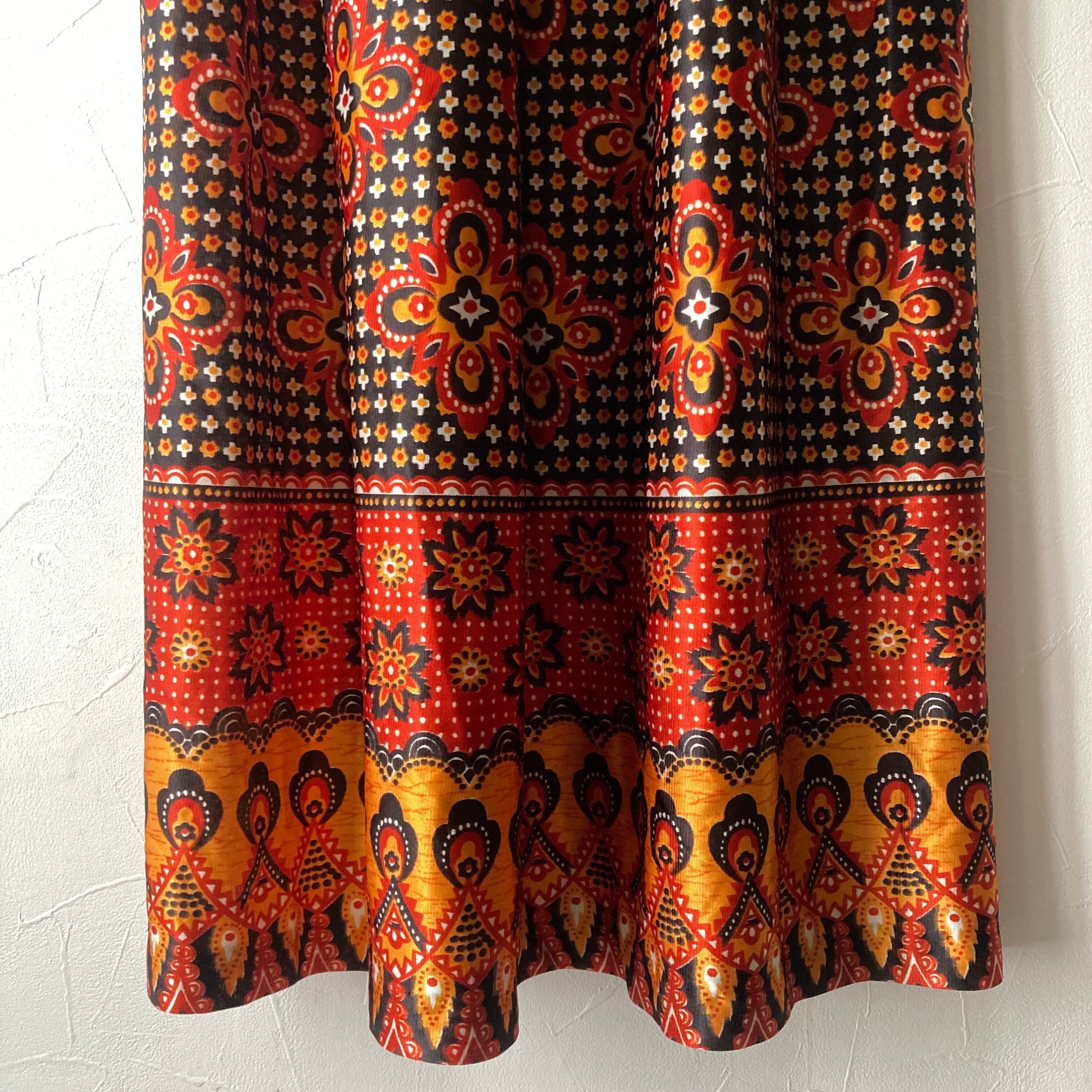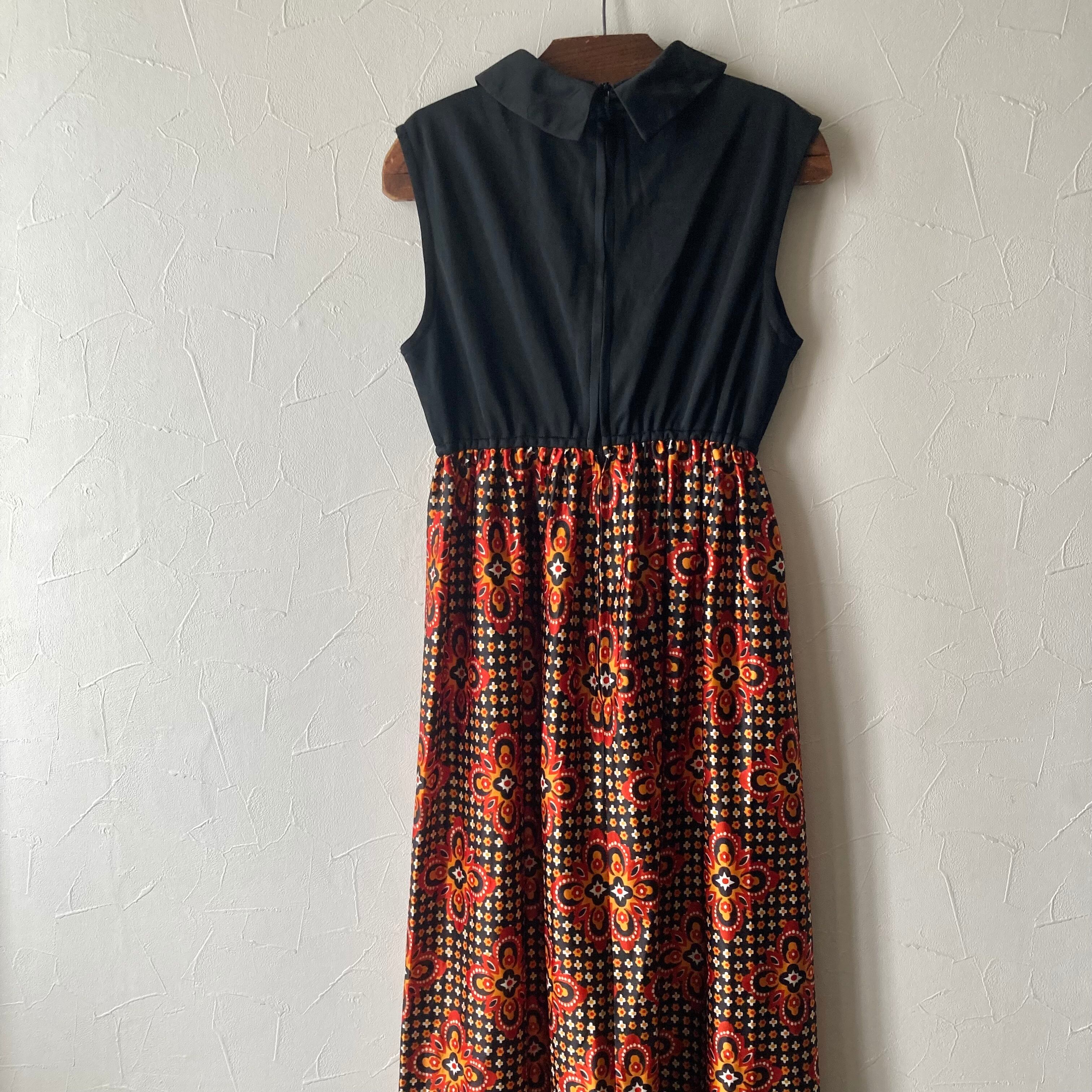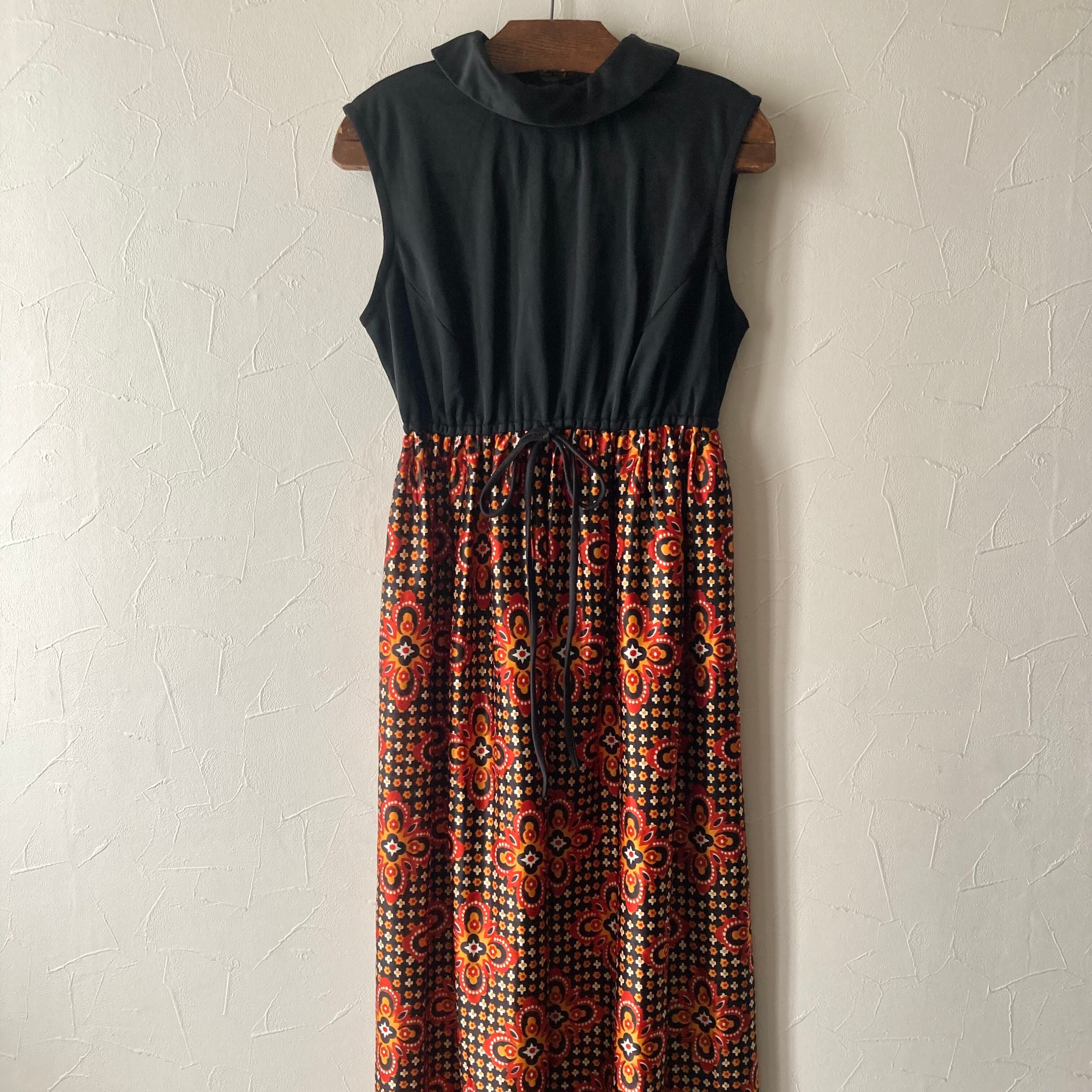 黒に胸の下辺りで切り替えの70sな柄が映えるサイケなワンピース◯