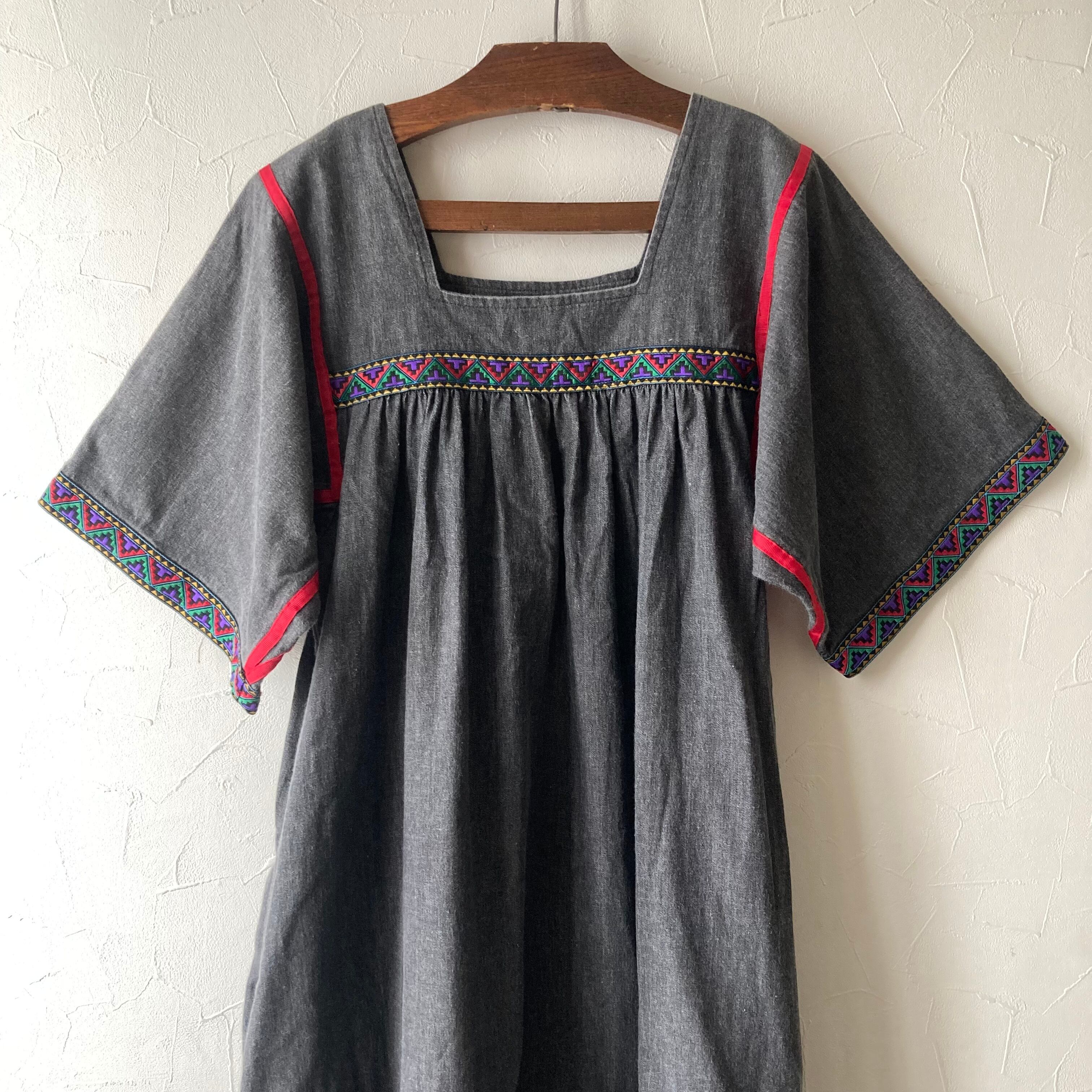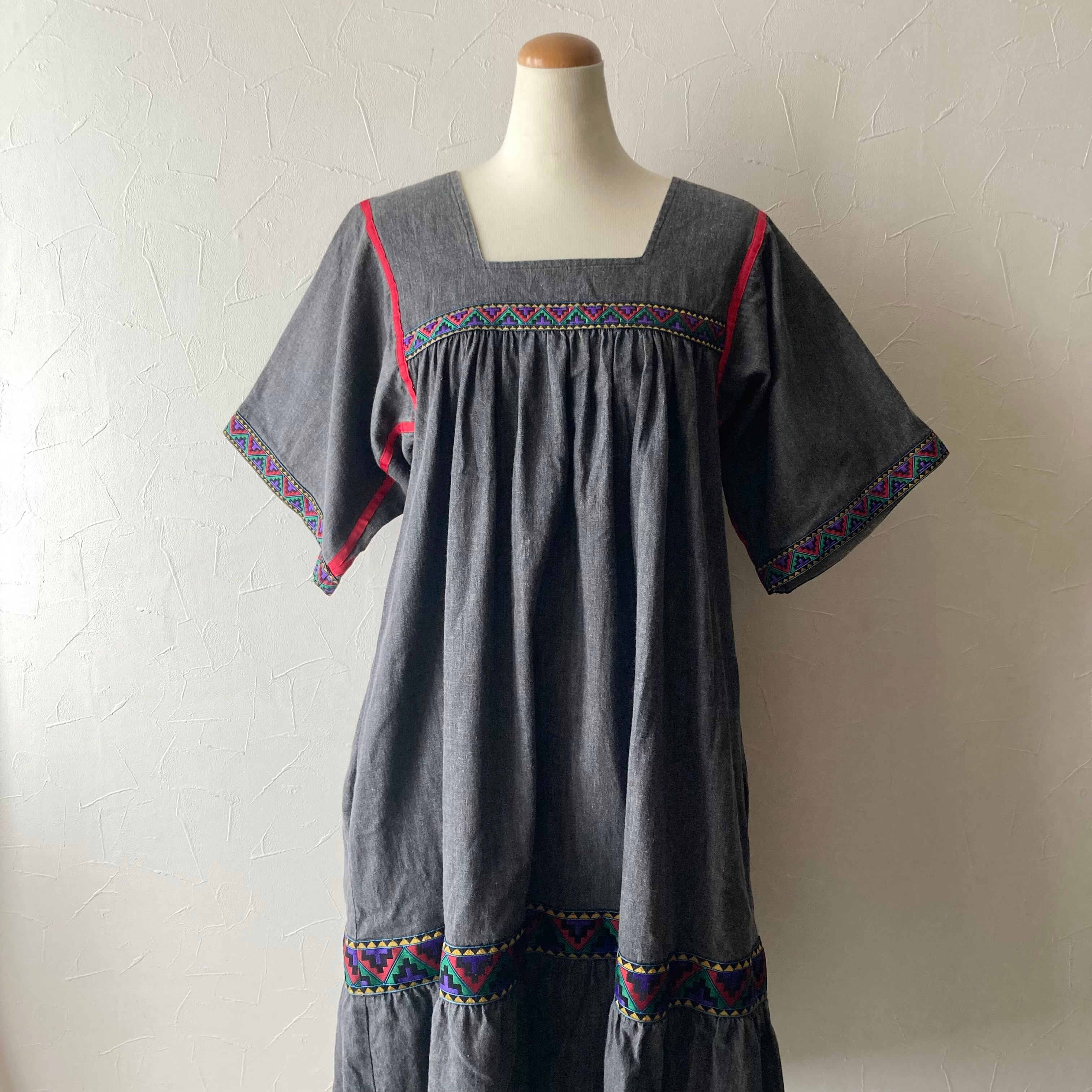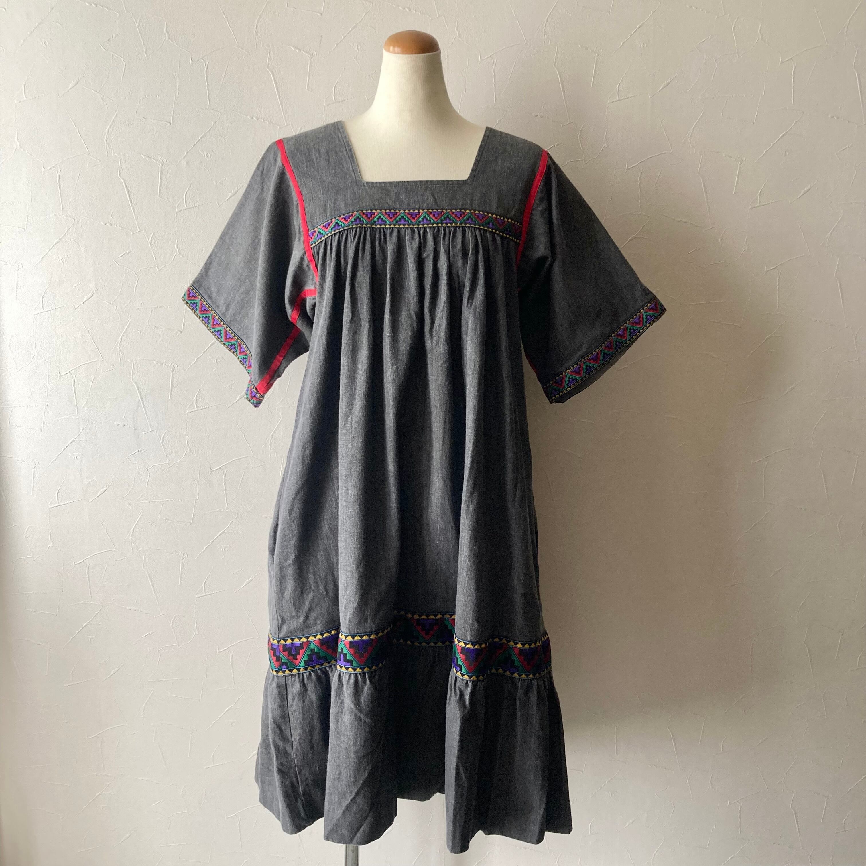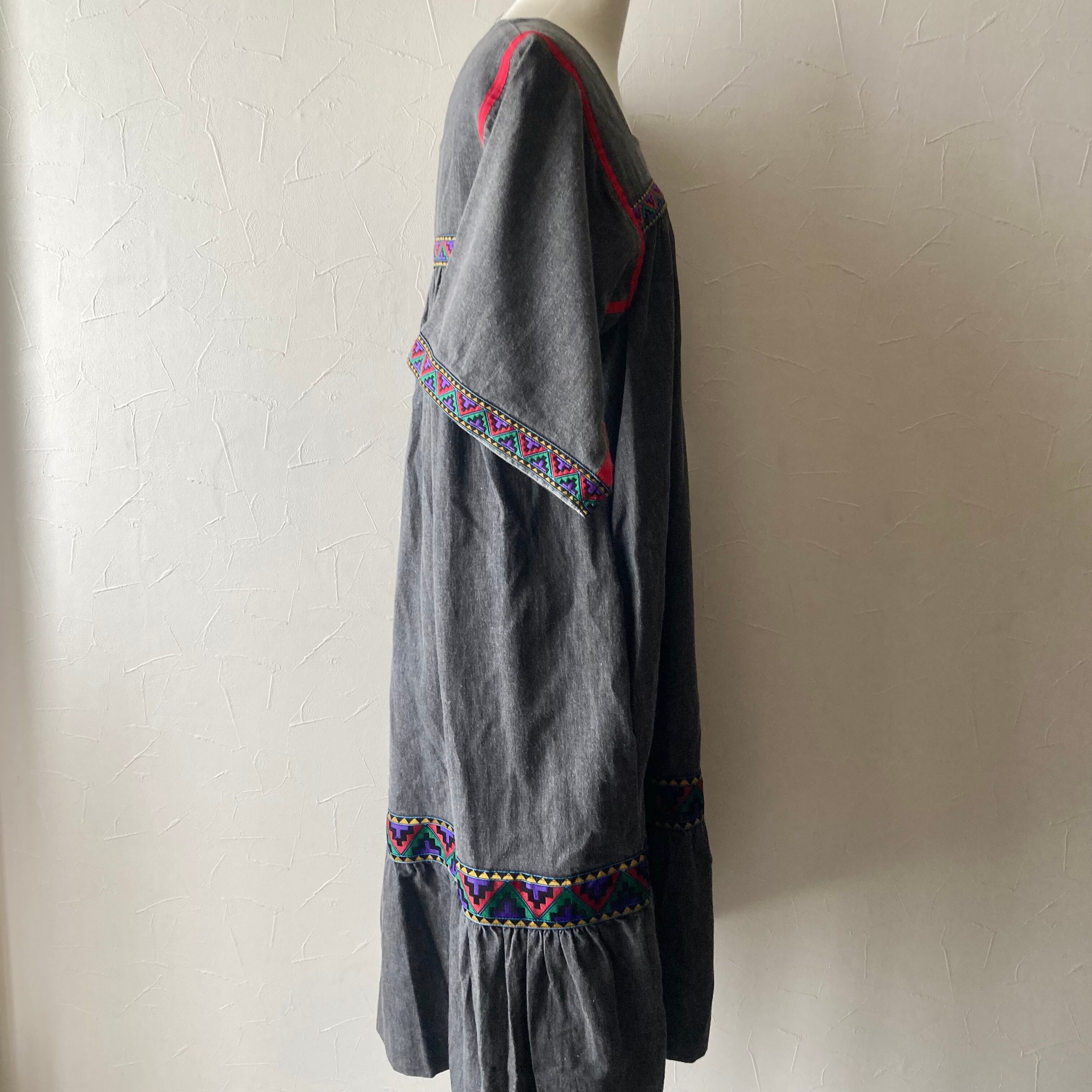 エスニックなチロリアンテープに黒の色落ちしたデニムの組み合わせが可愛らしいワンピース。