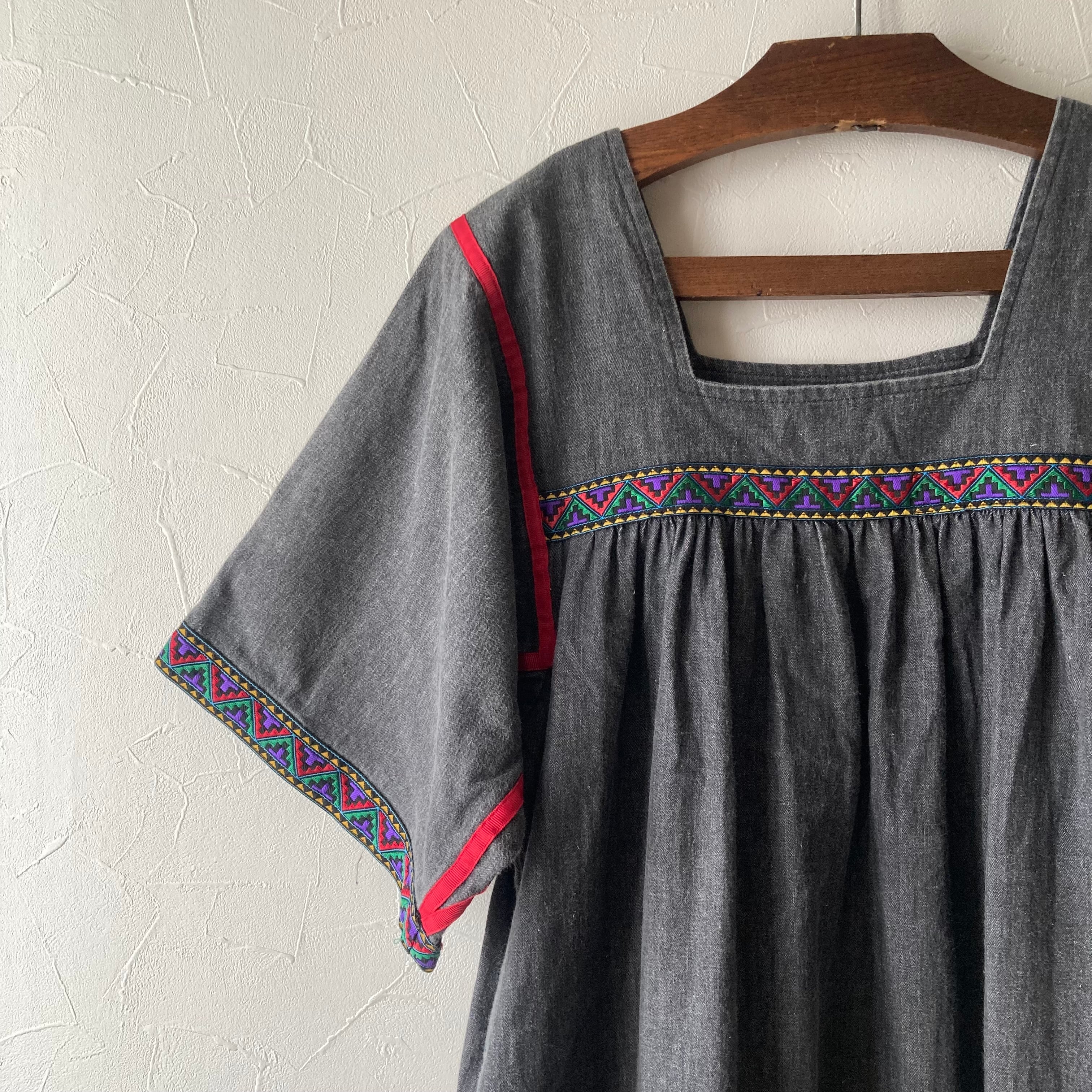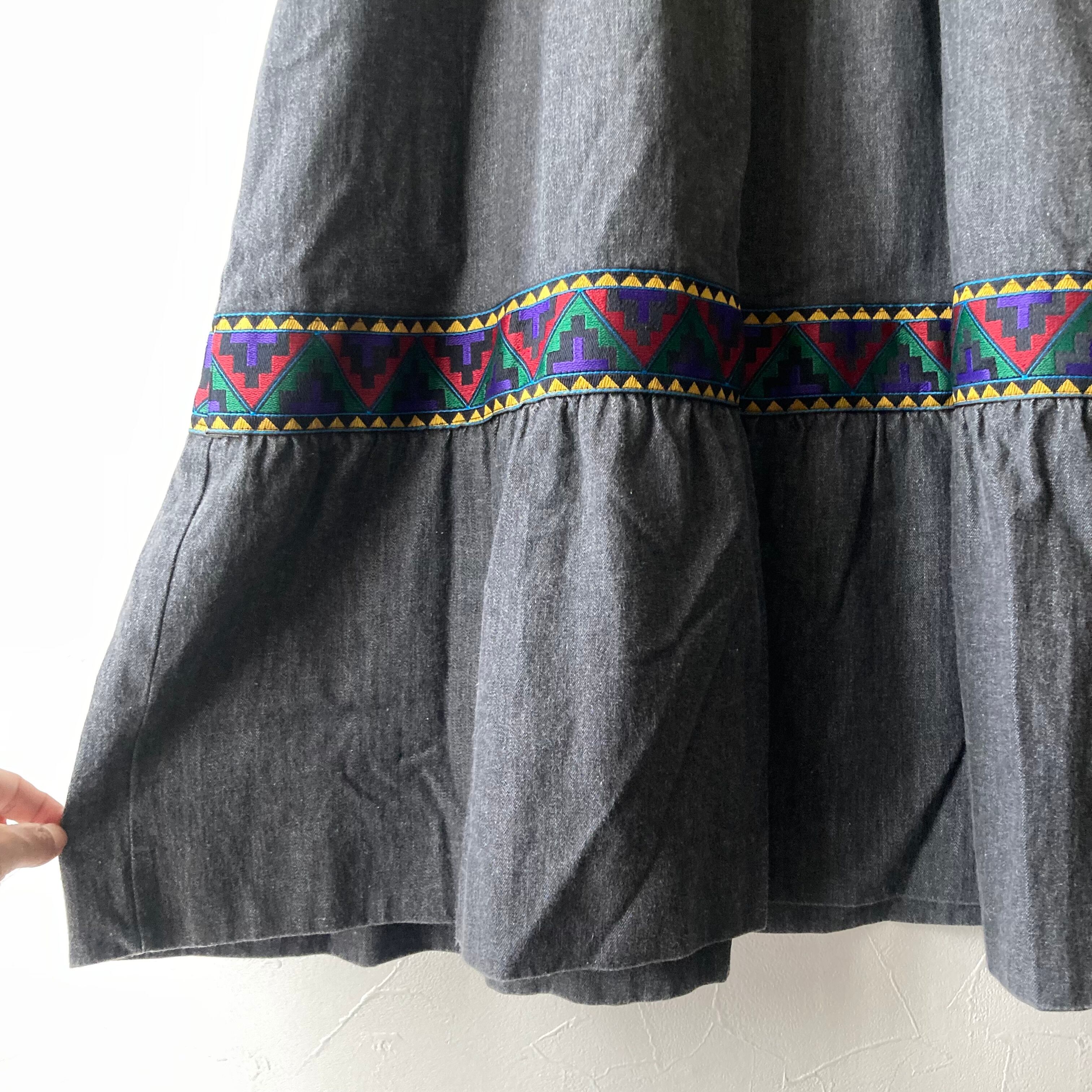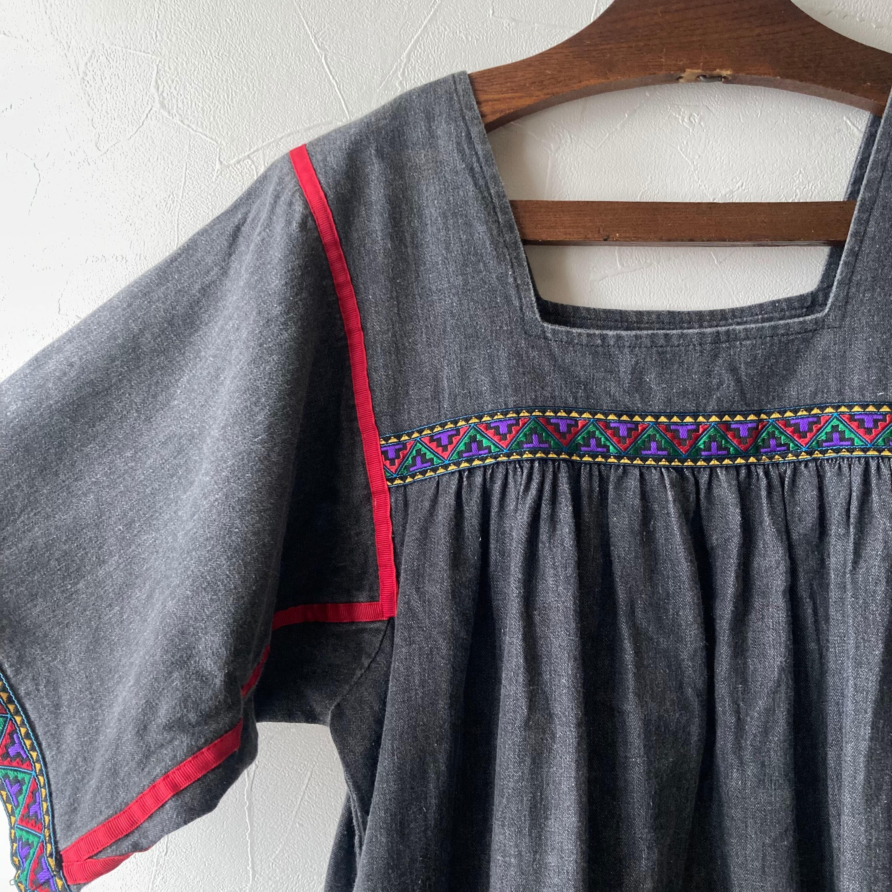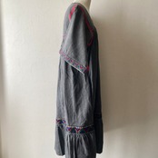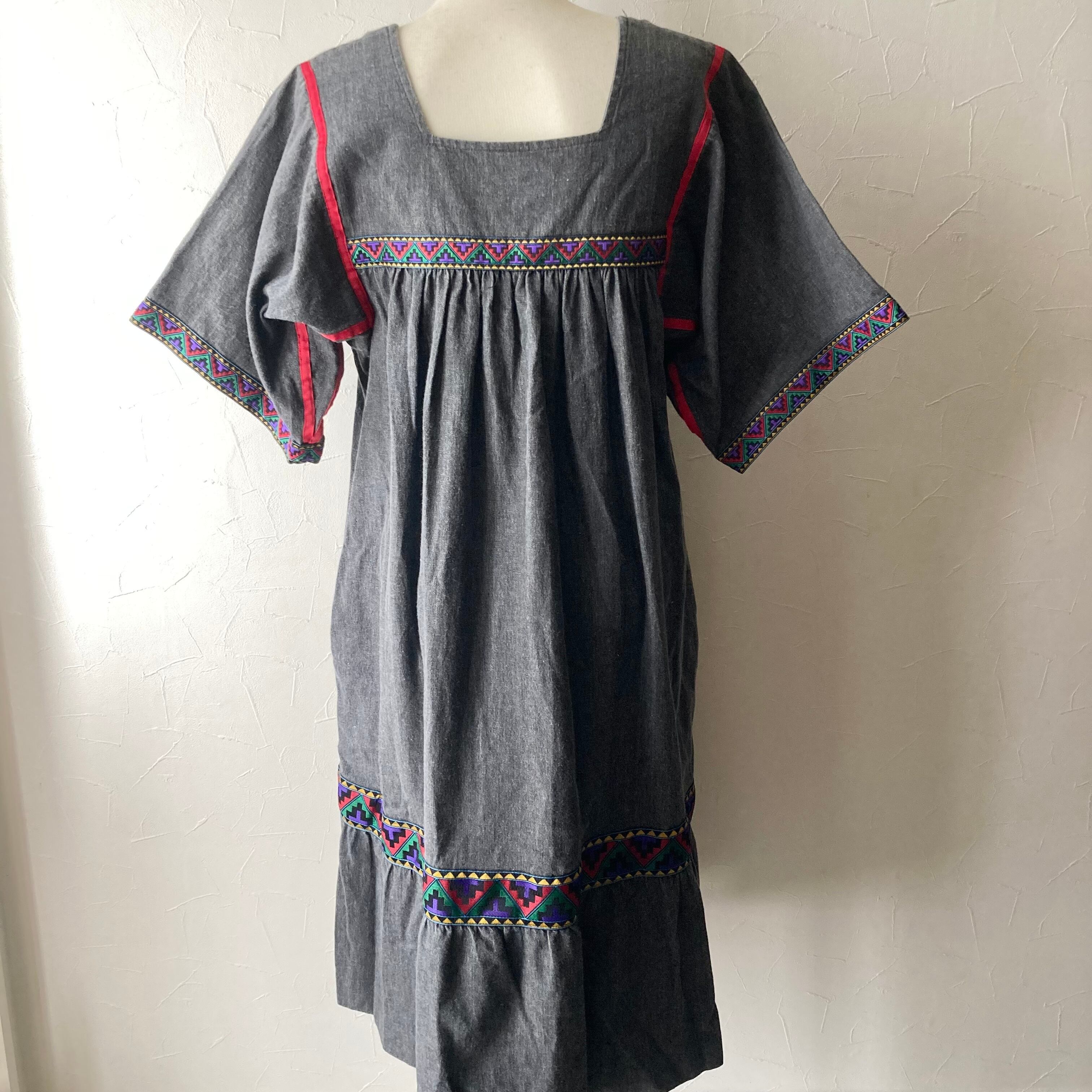 エスニックなチロリアンテープに黒の色落ちしたデニムの組み合わせが可愛らしいワンピース。