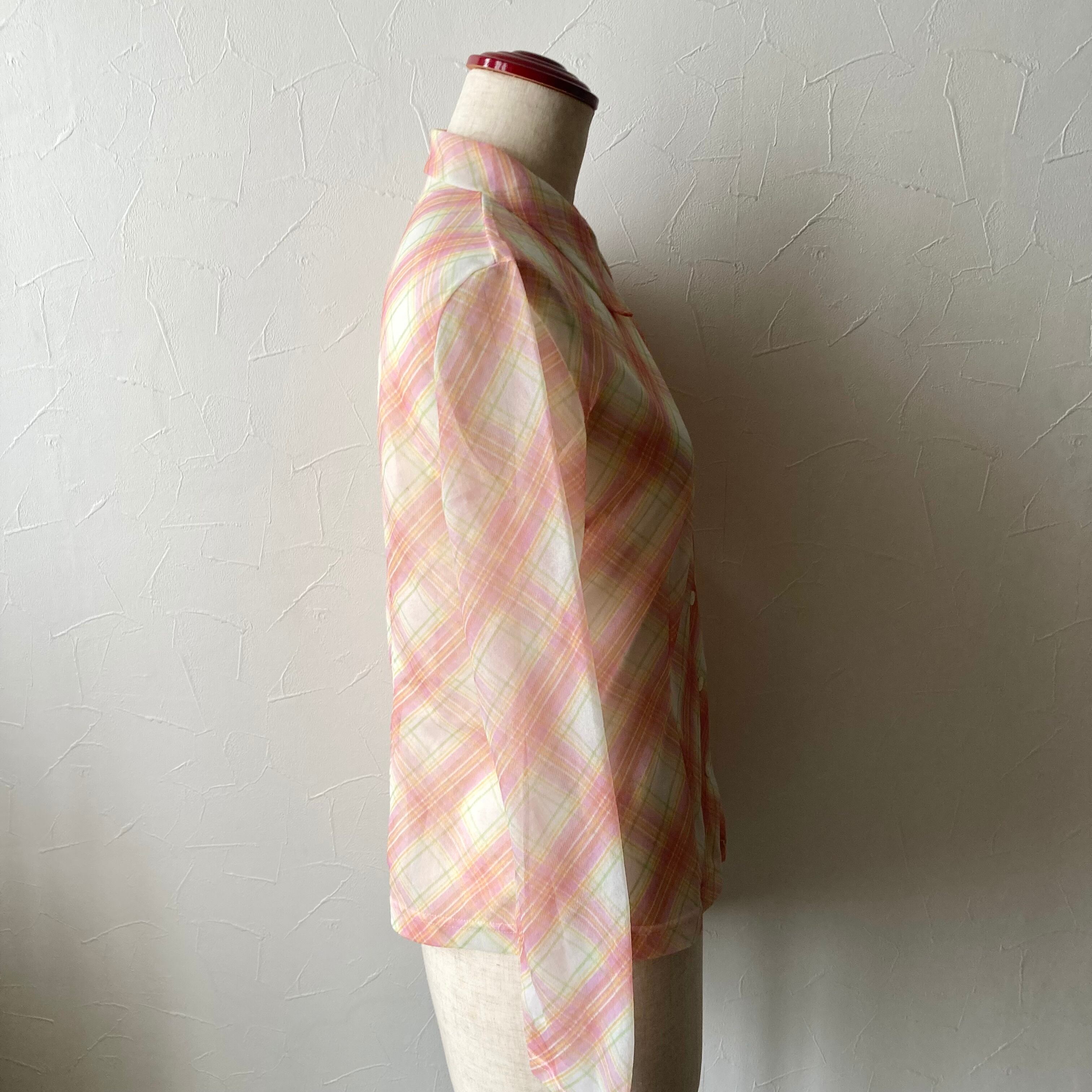 ピンク×グリーン×イエローの淡い配色が可愛らしいシースルーシャツ◯ 透け感がなんともお洒落で可愛いです。