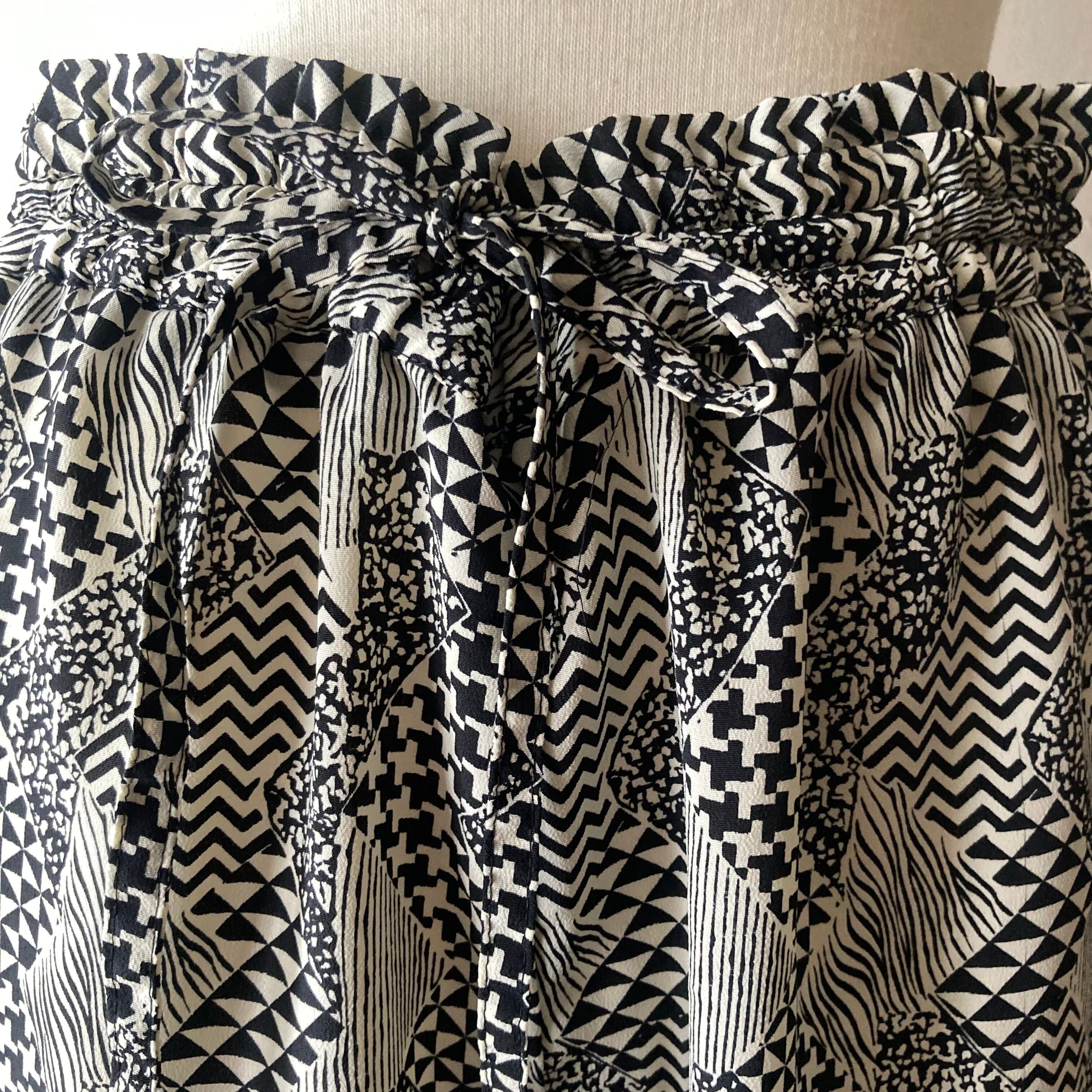 モノトーンなので柄が派手すぎず着やすいかと思います。ウエストも紐調整できるので楽ちんです。