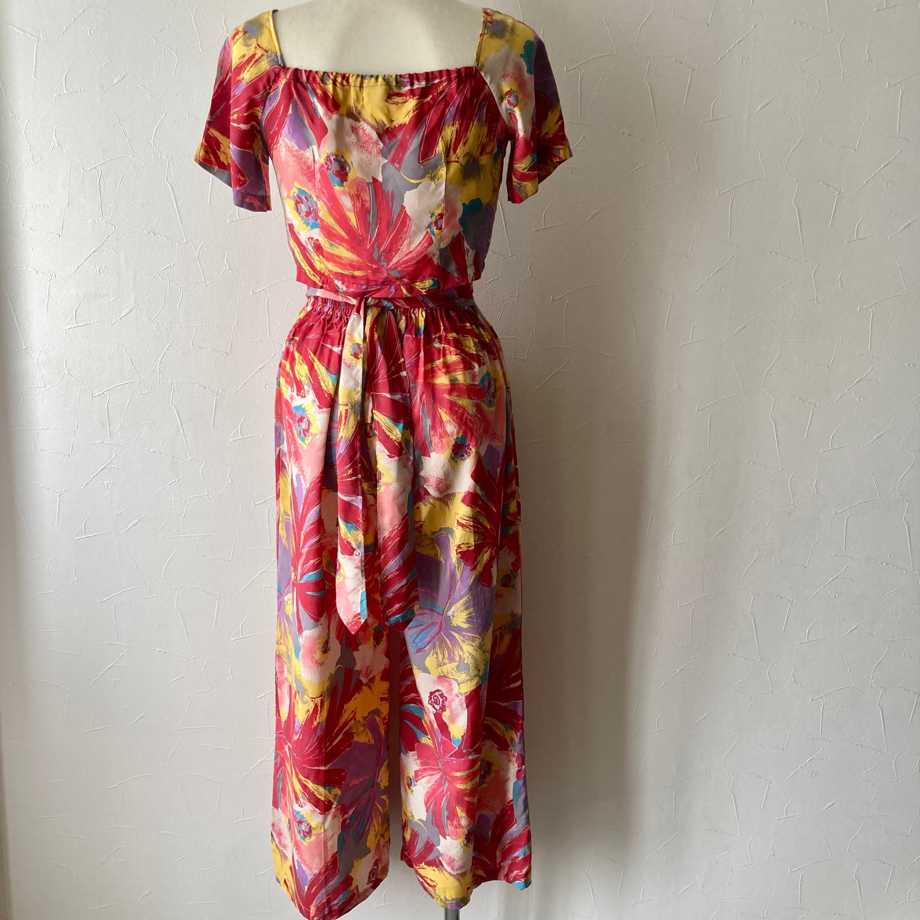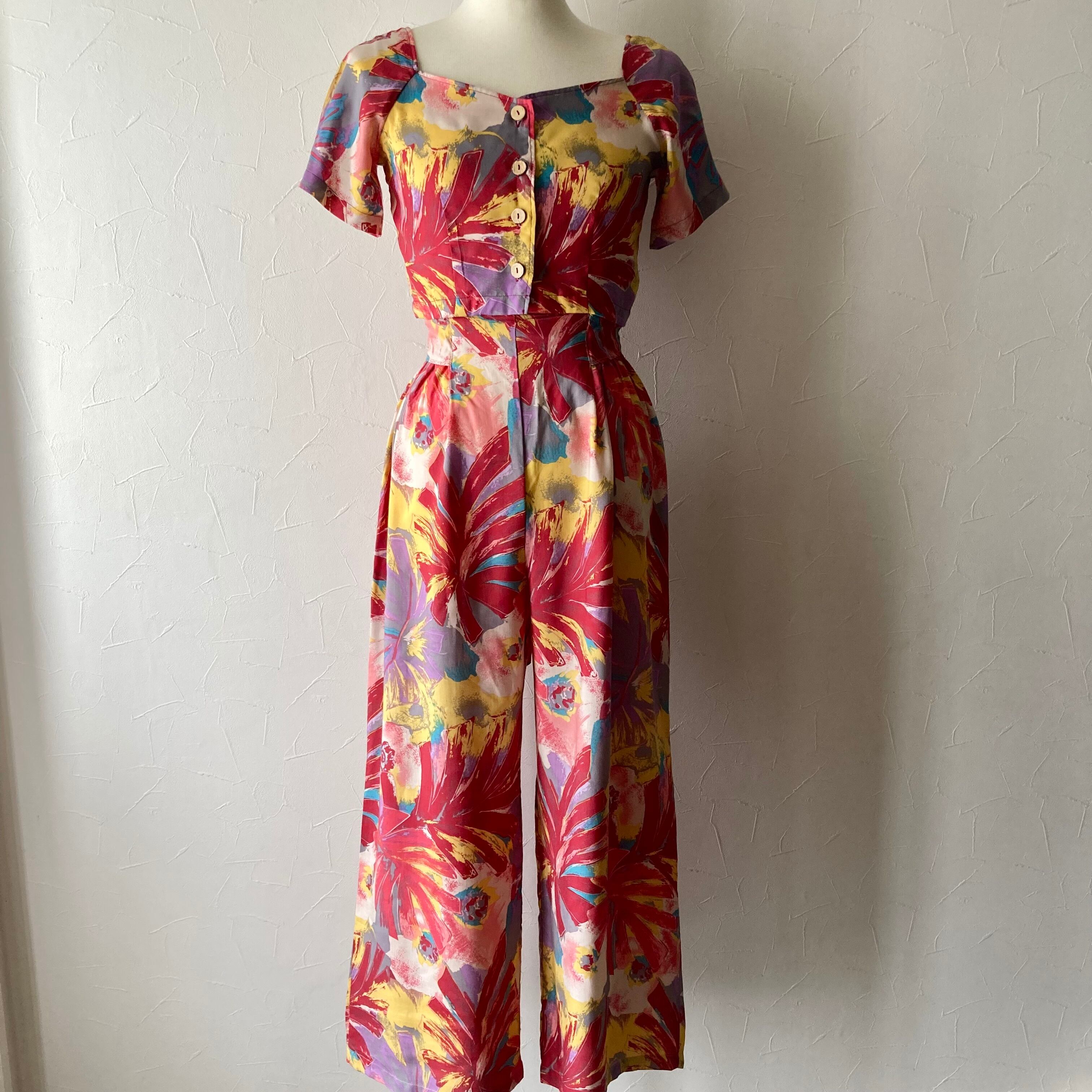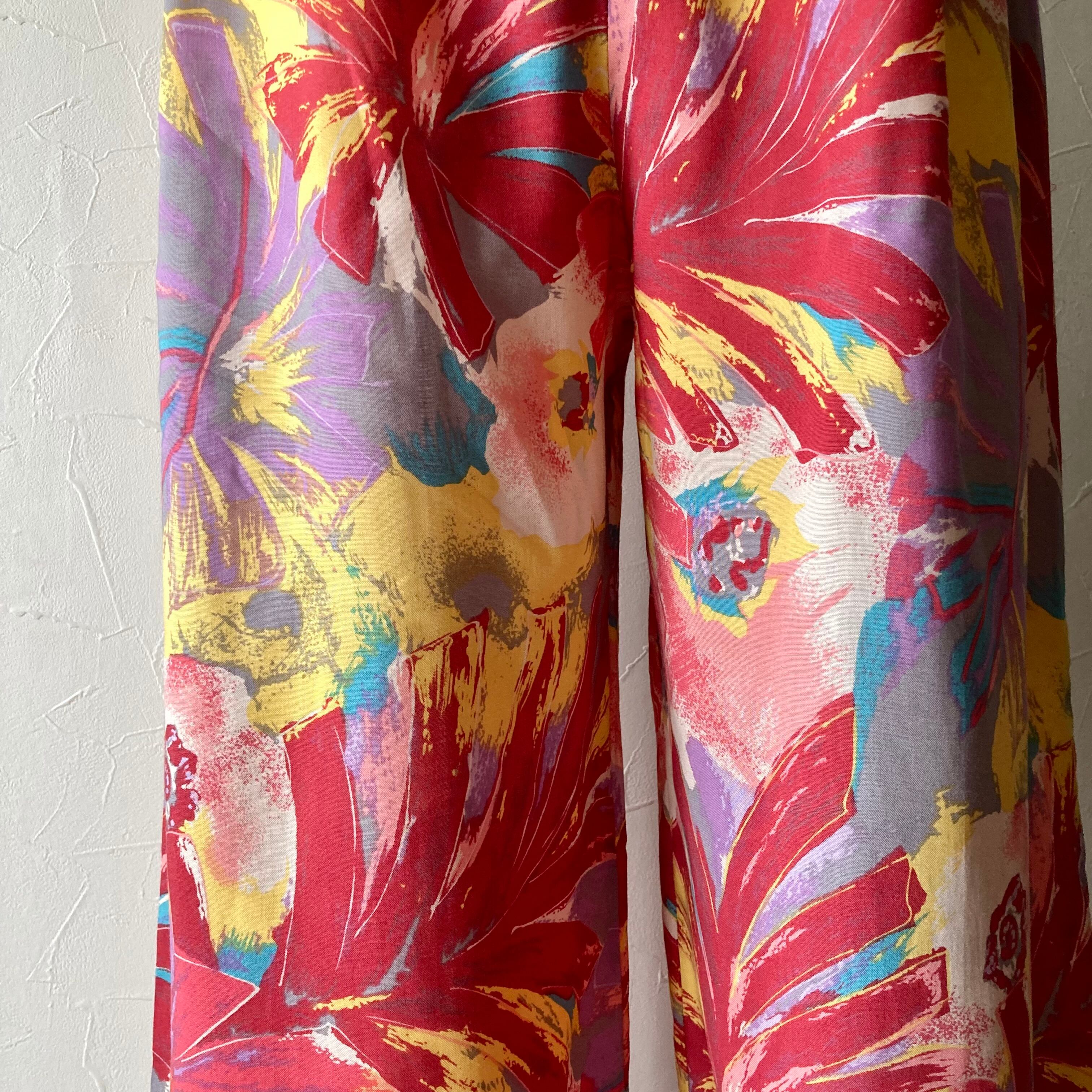 レーヨンのさらっとした肌触りの涼しげなセットアップ◯ 暑い夏に弾ける古着らしい柄がかっこよいです。短めのトップスはデニムと合わせたりショートパンツと合わせたり、夏に着やすい一枚。パンツもハイウエストでワイドめな履きやすいシルエット。それぞれが楽しめる嬉しいセットアップになっています。