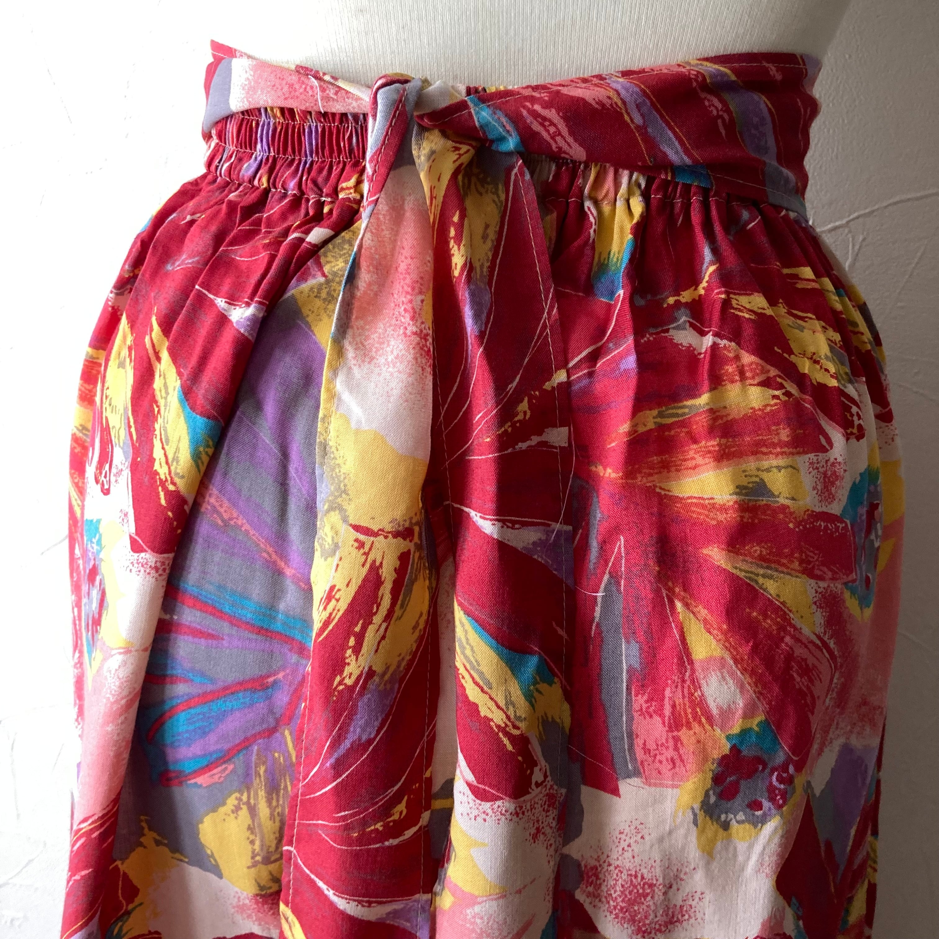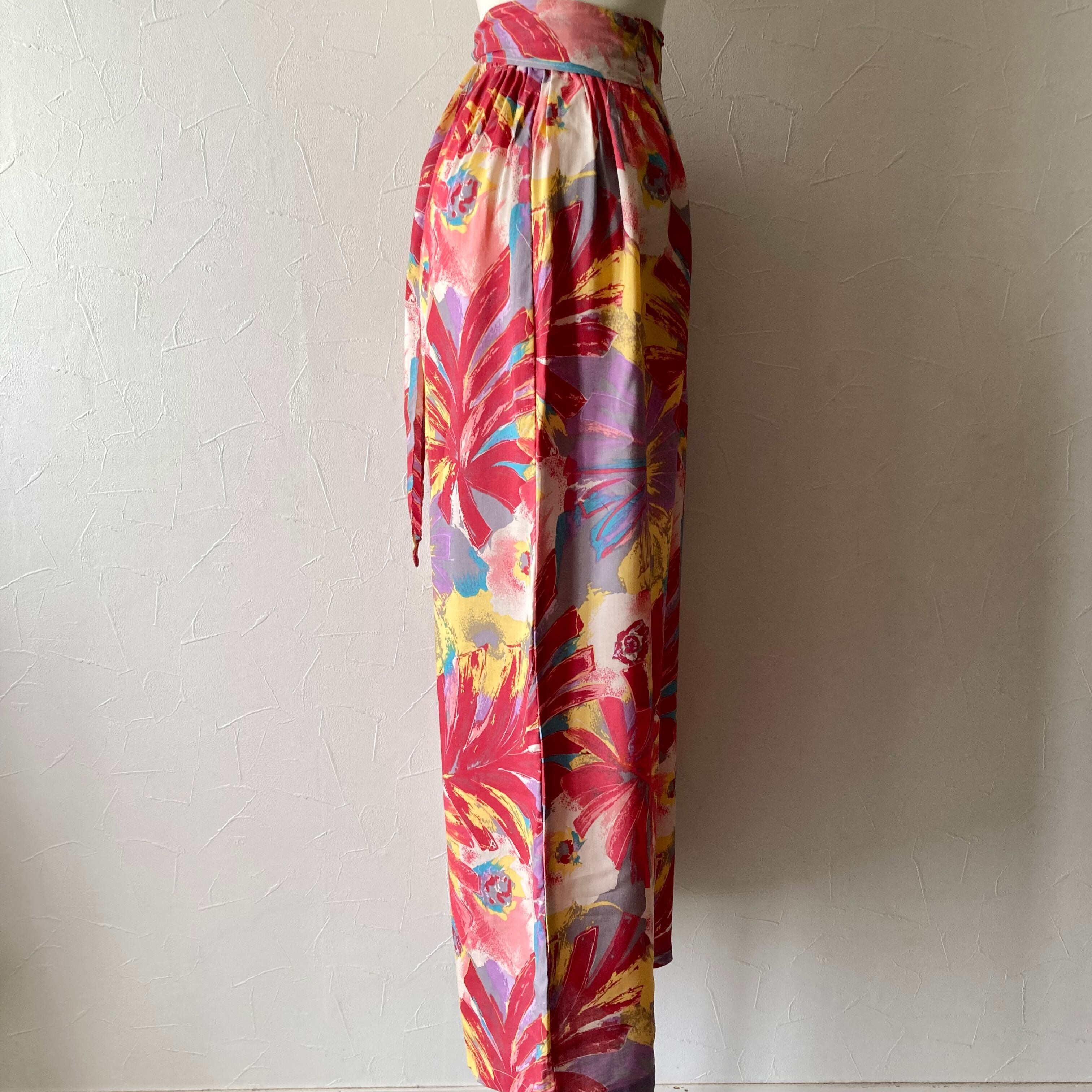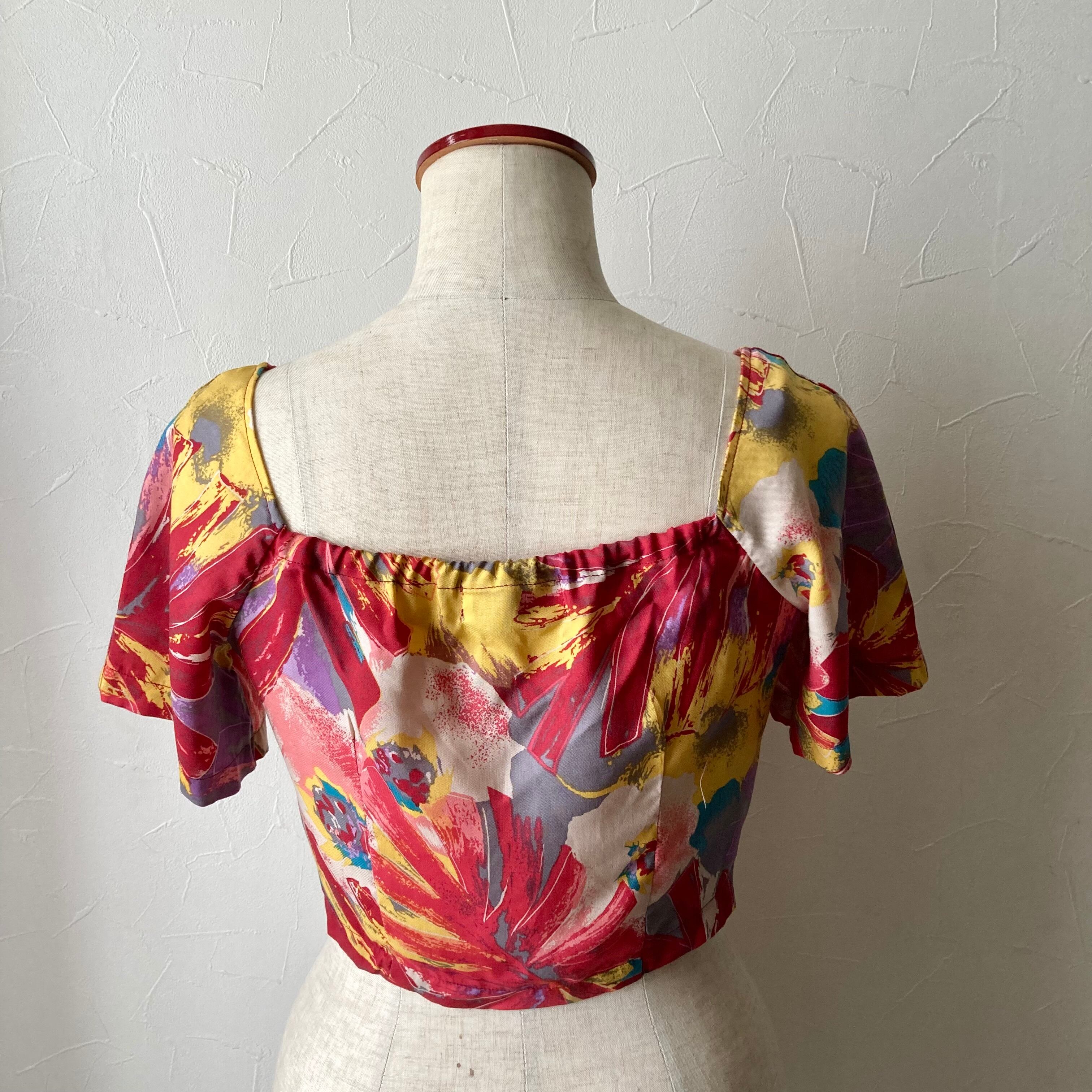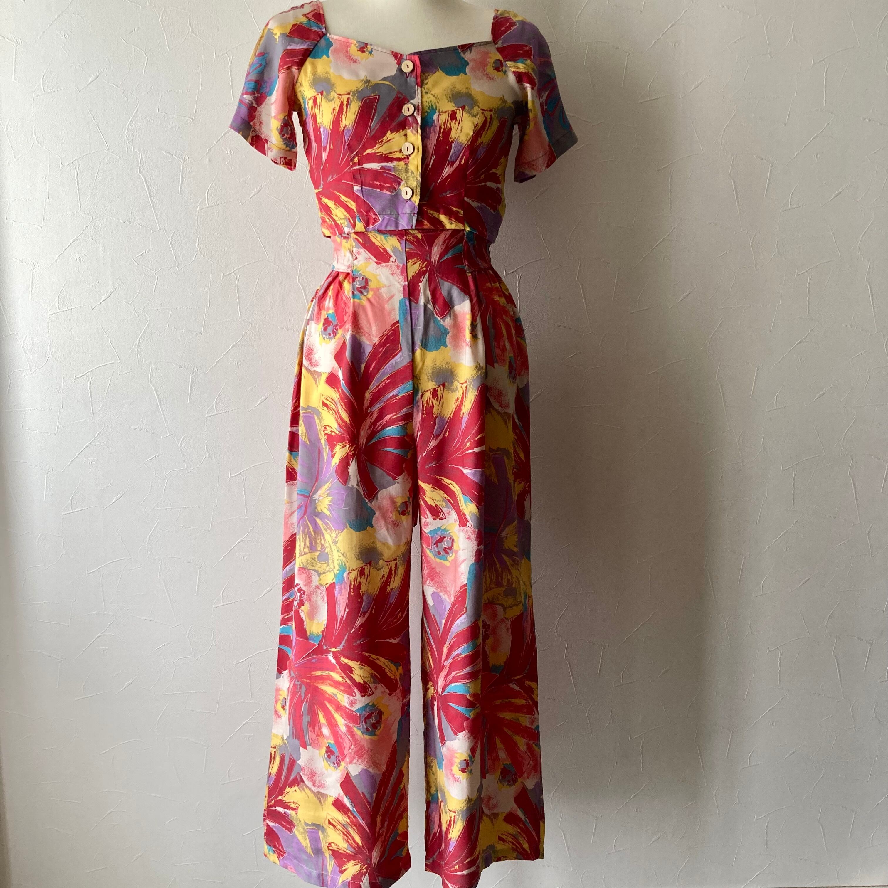 レーヨンのさらっとした肌触りの涼しげなセットアップ◯ 暑い夏に弾ける古着らしい柄がかっこよいです。短めのトップスはデニムと合わせたりショートパンツと合わせたり、夏に着やすい一枚。パンツもハイウエストでワイドめな履きやすいシルエット。それぞれが楽しめる嬉しいセットアップになっています。