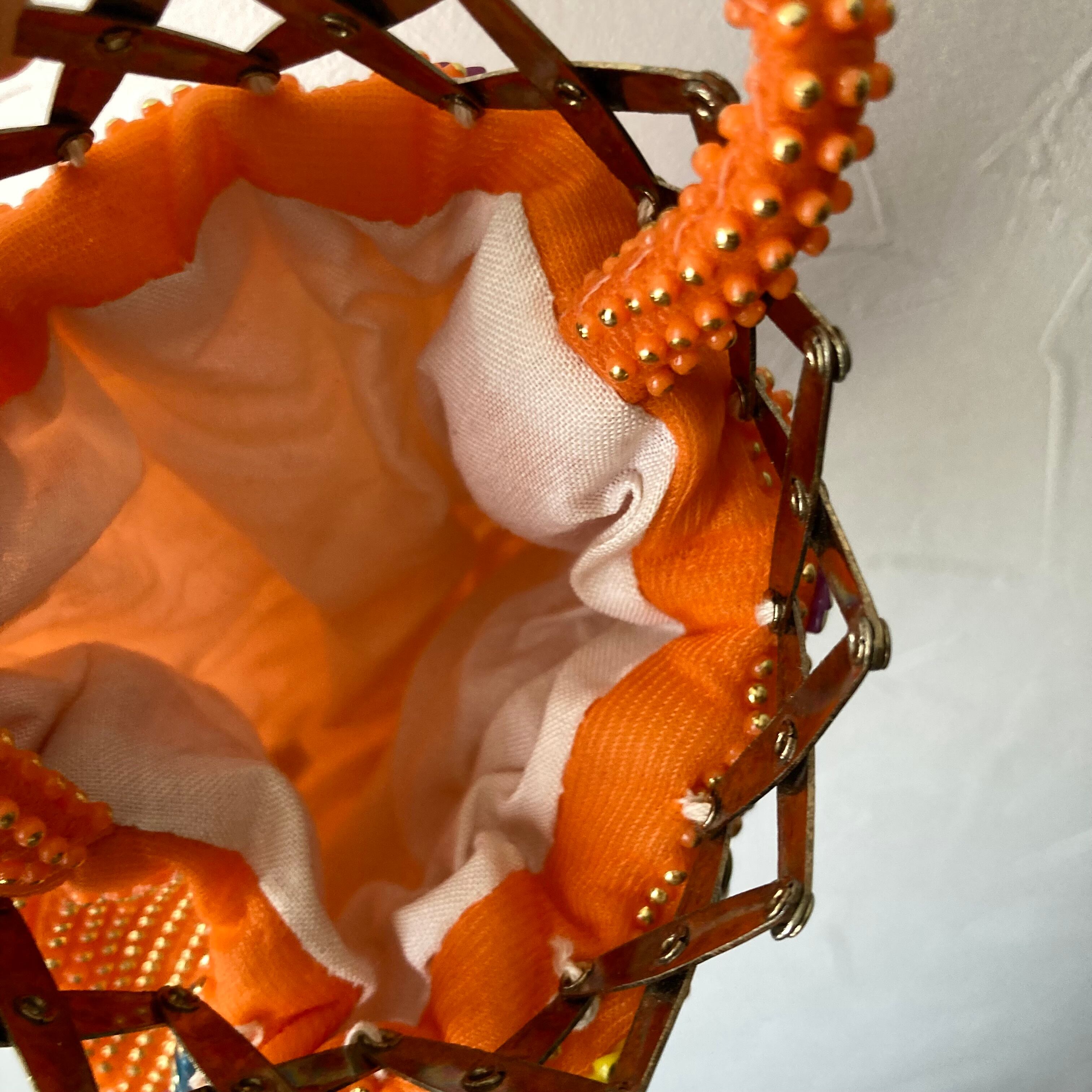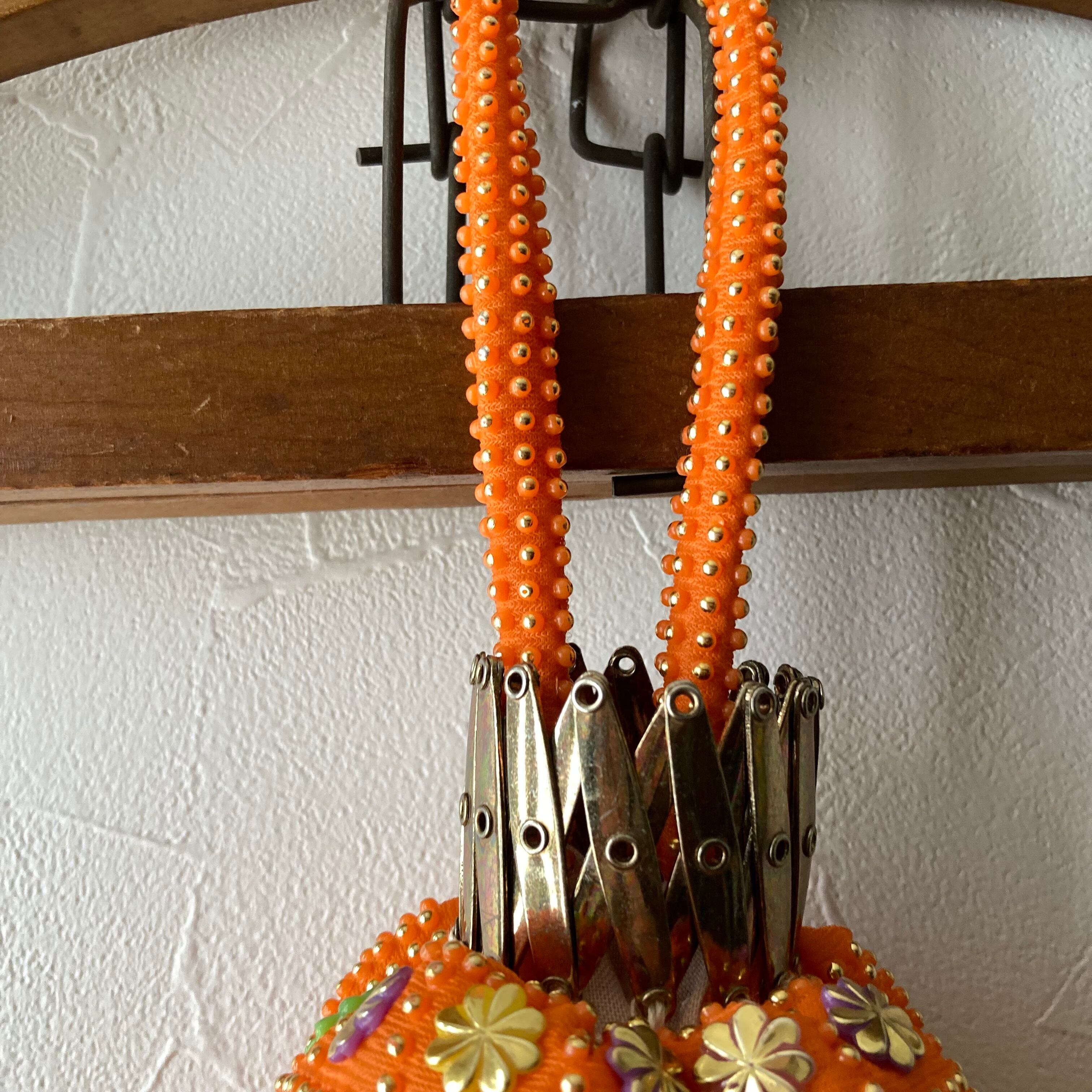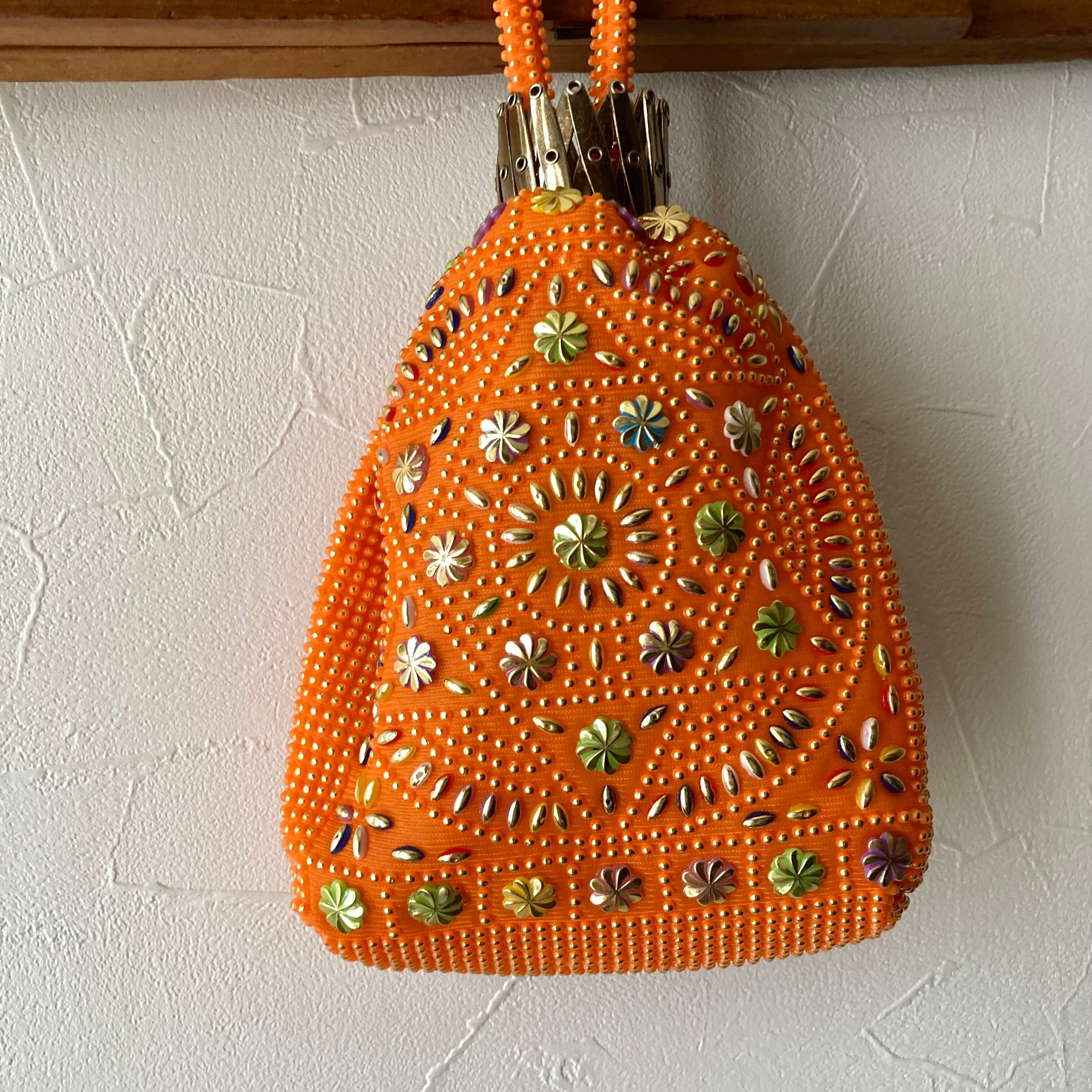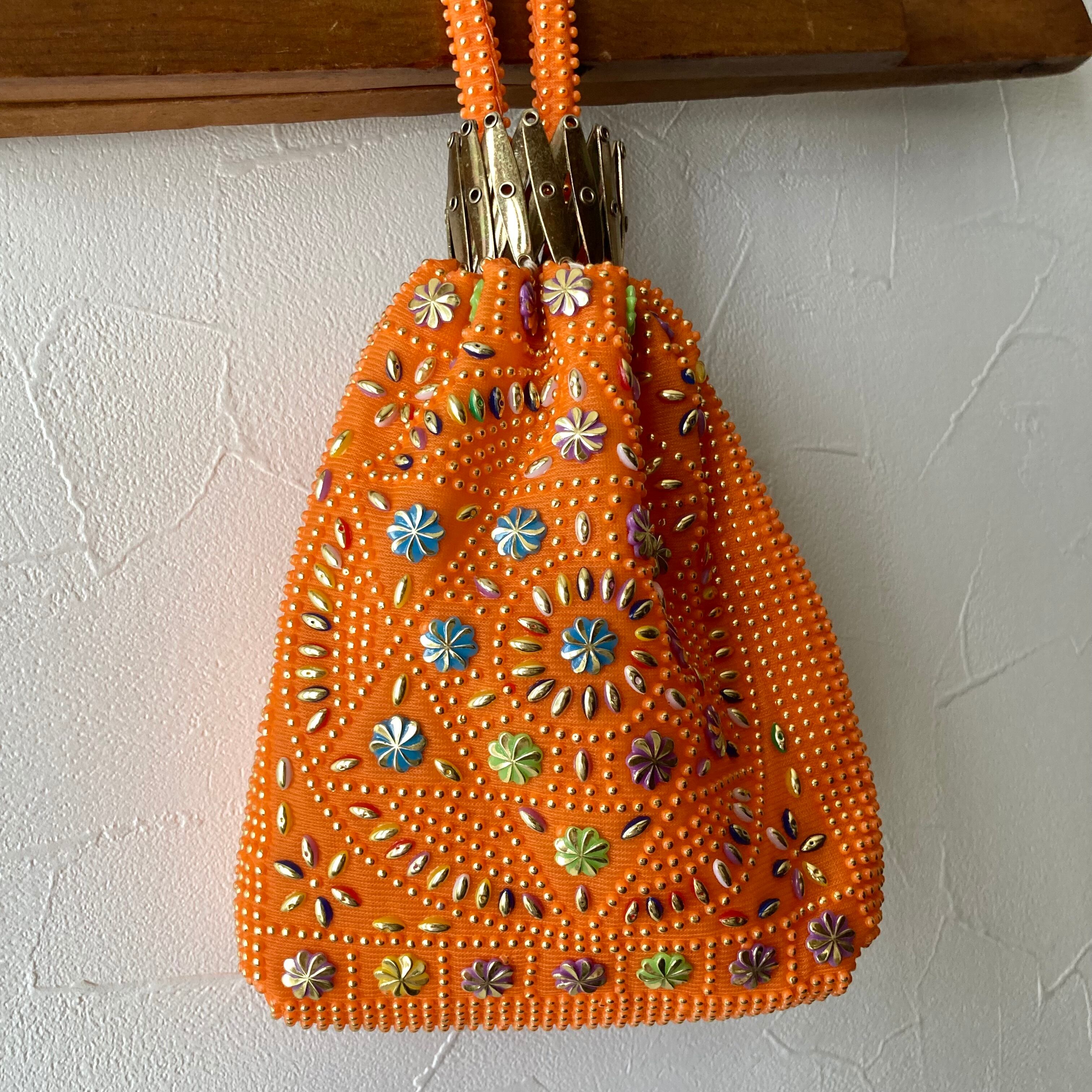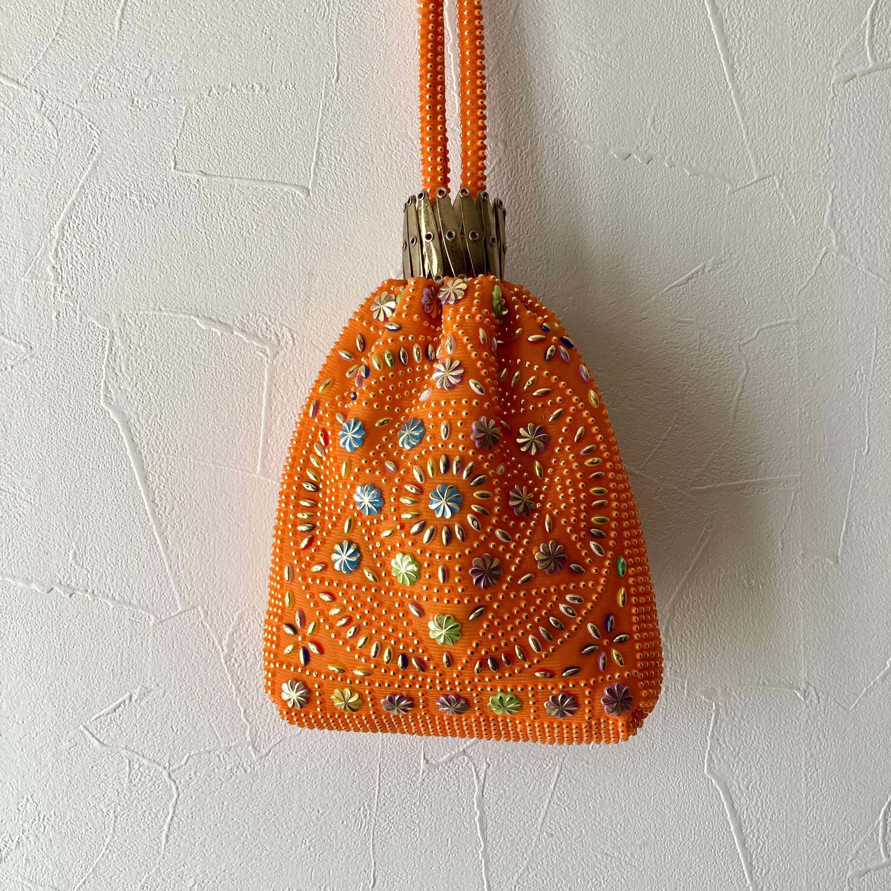 オレンジ色がレトロで可愛いビーズの巾着バッグ◯ 小さめサイズでちょっとそこまでのお財布入れや小物入れに。