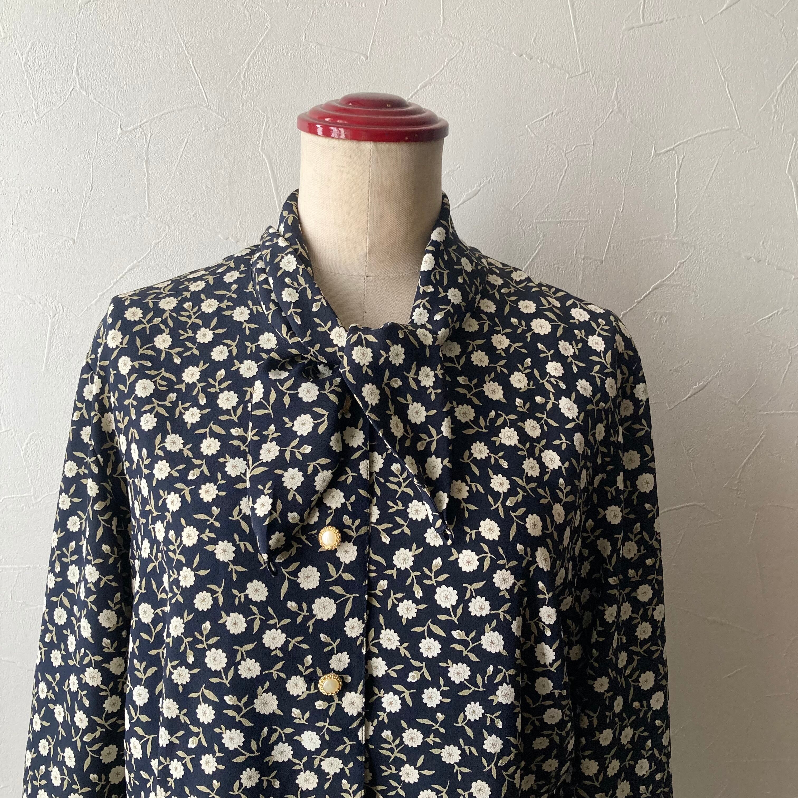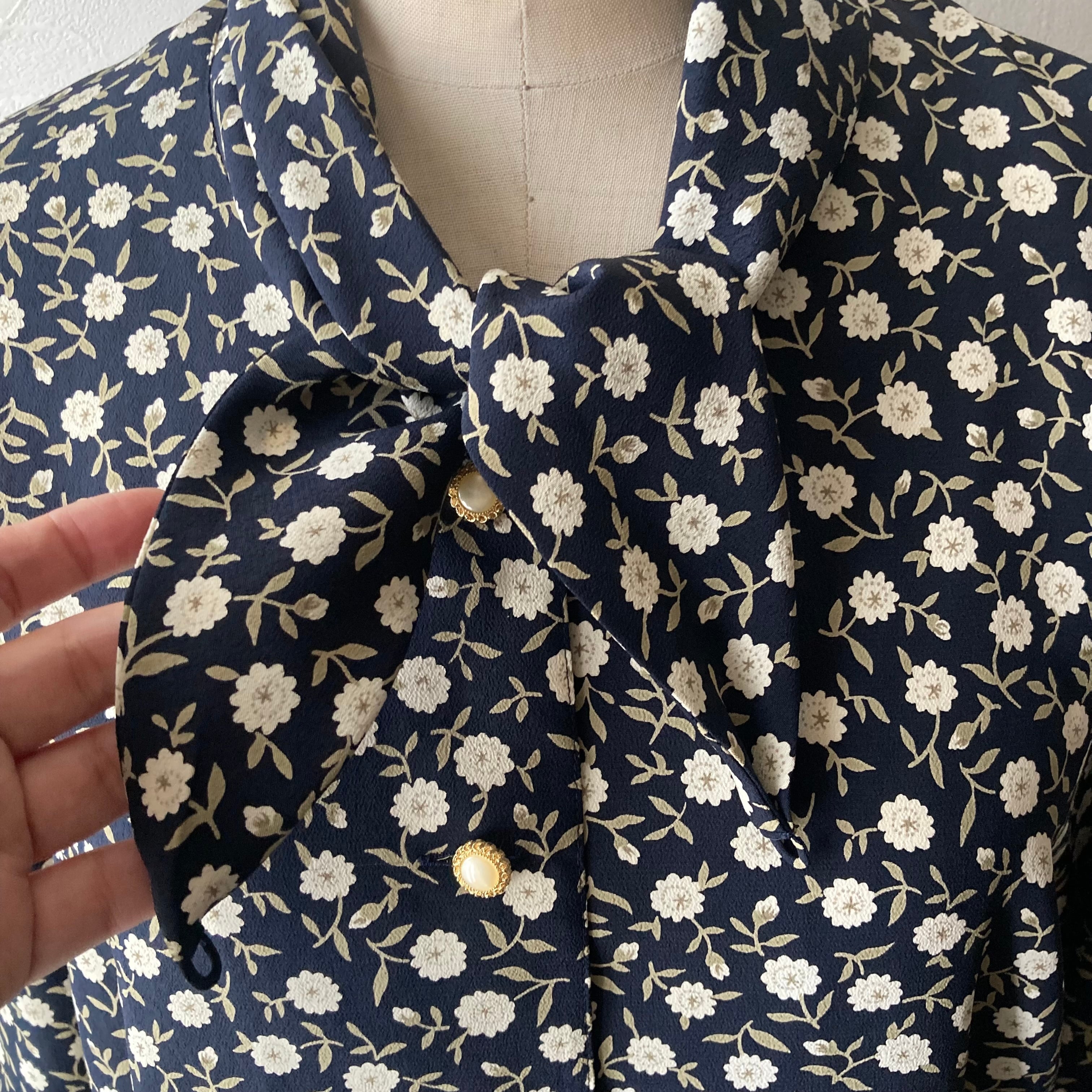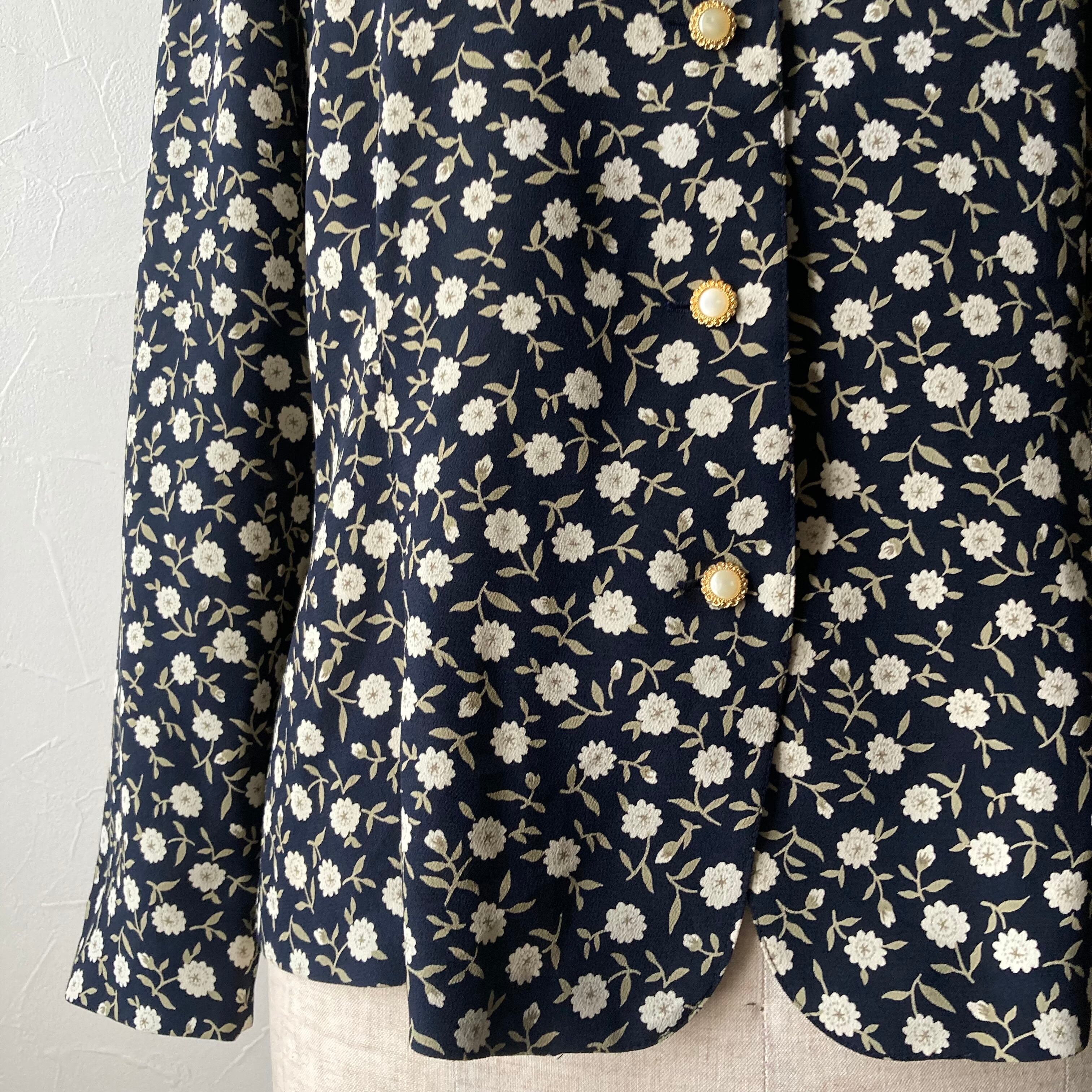 黒に白の花柄とゴールド×パール風のボタンがレトロで可愛らしい90sな雰囲気のブラウスです。