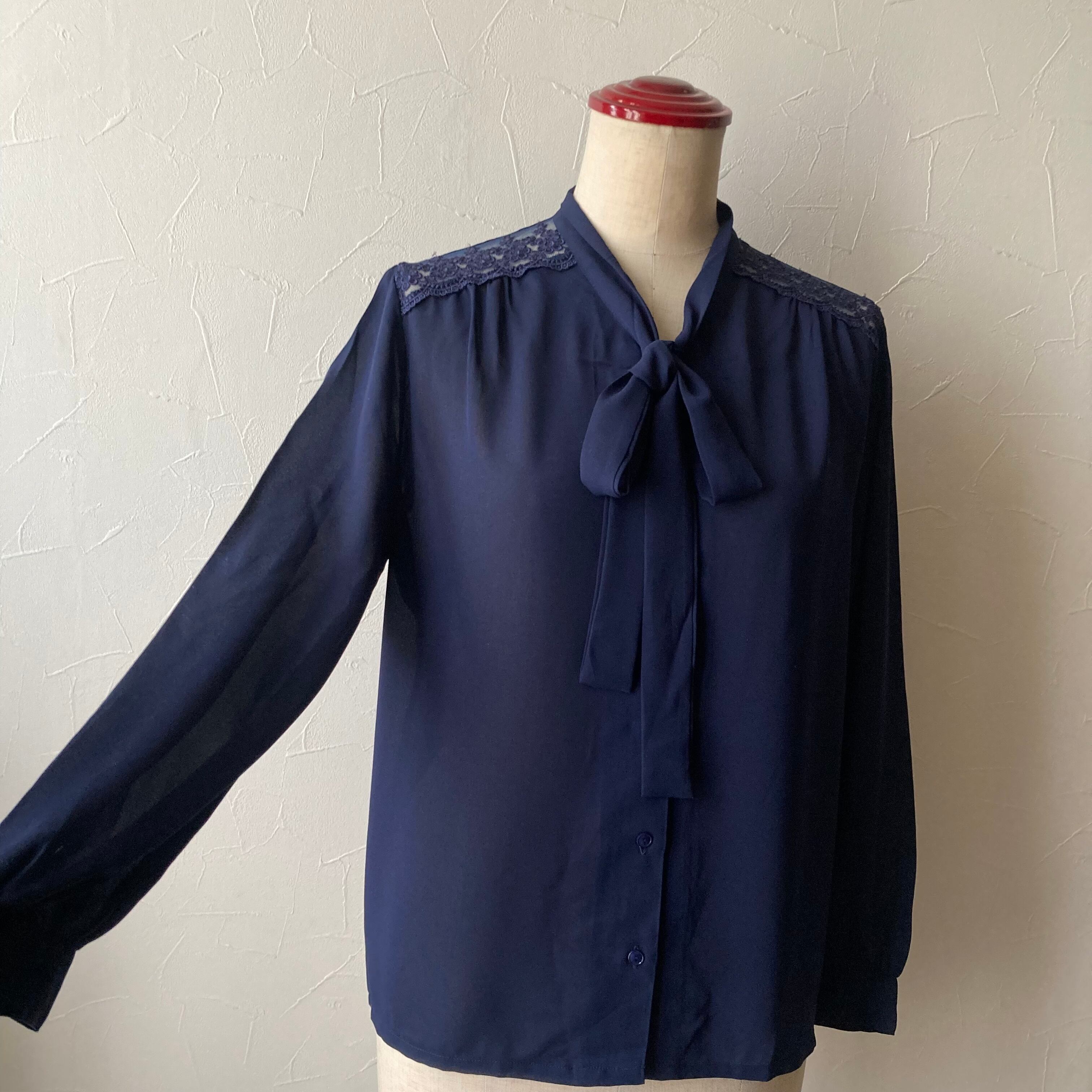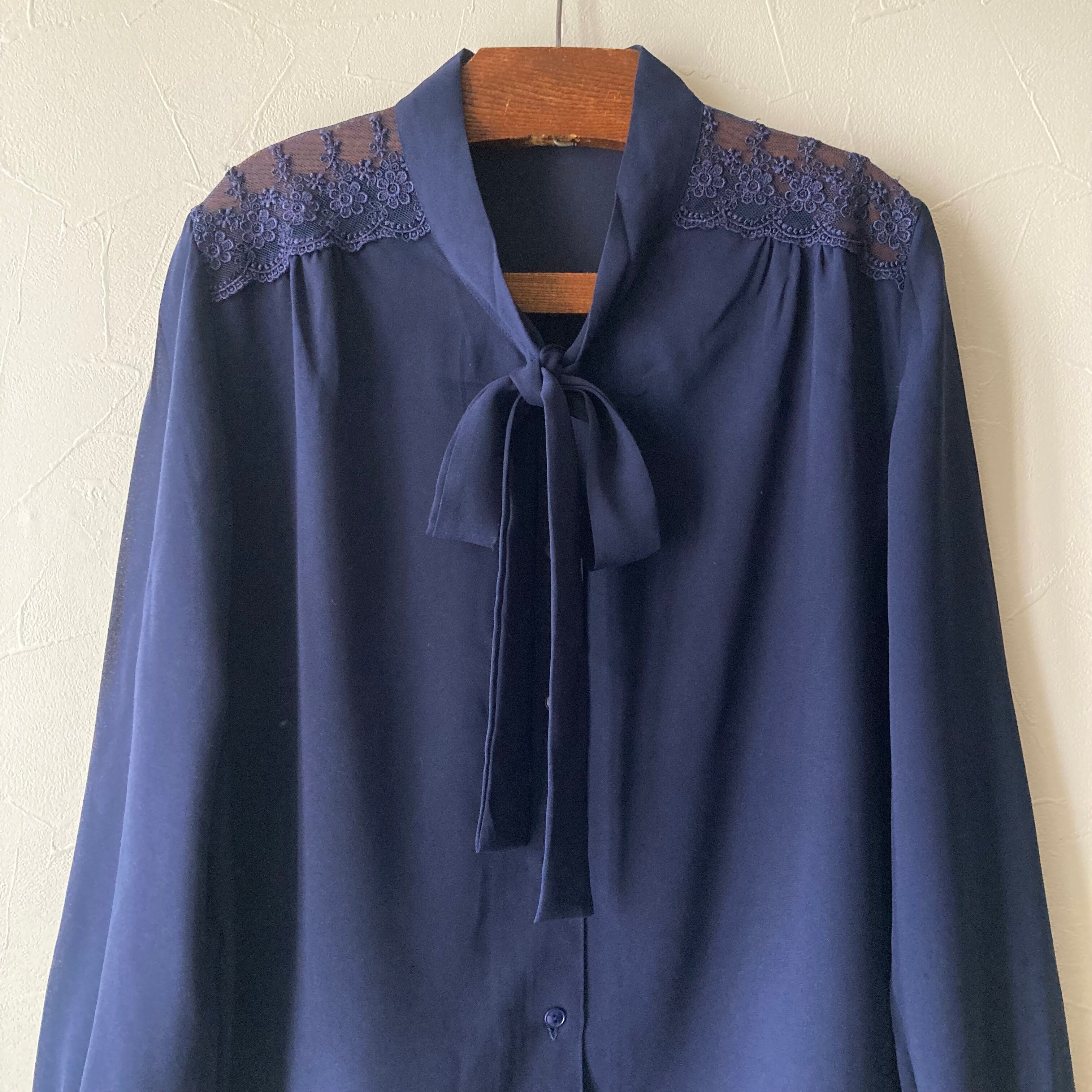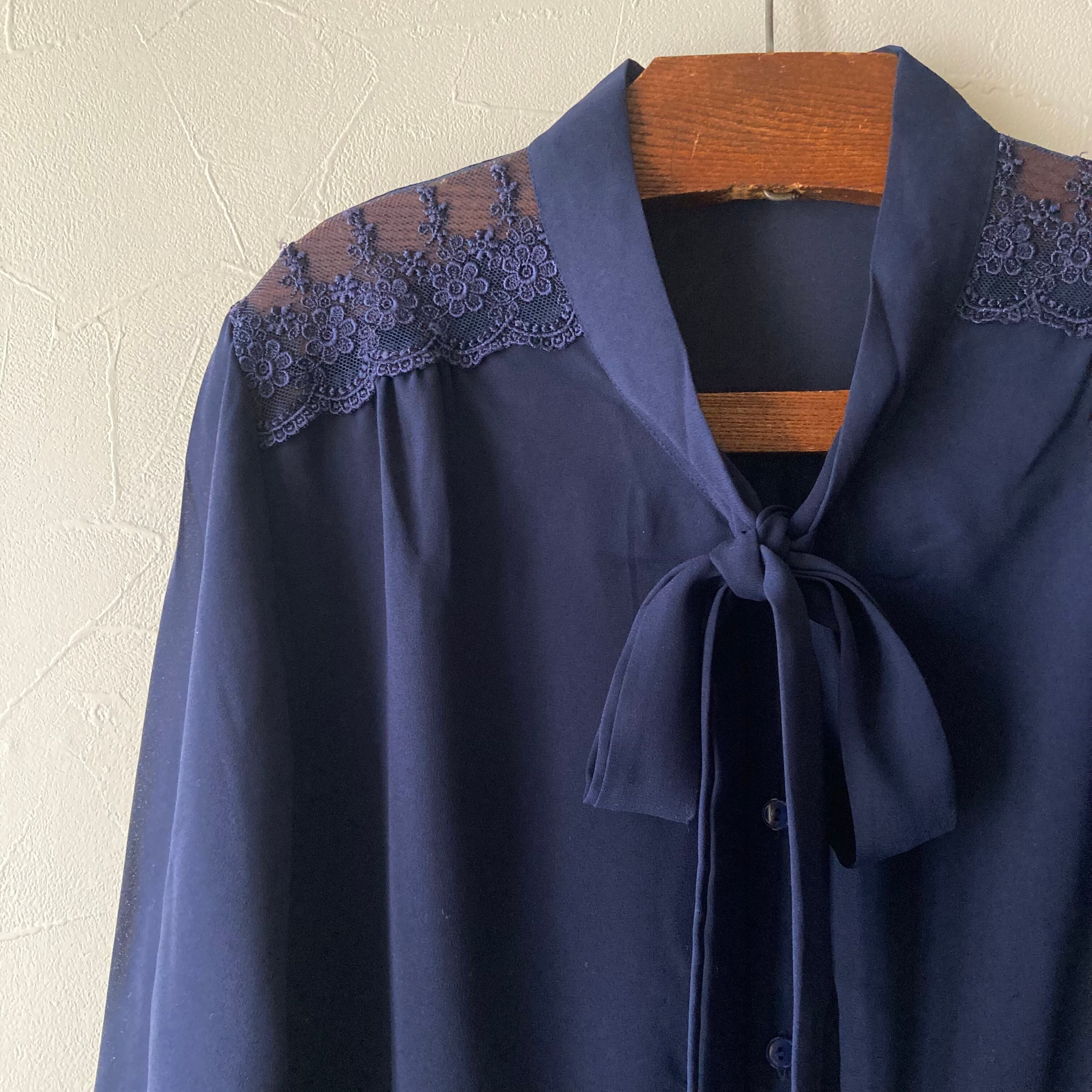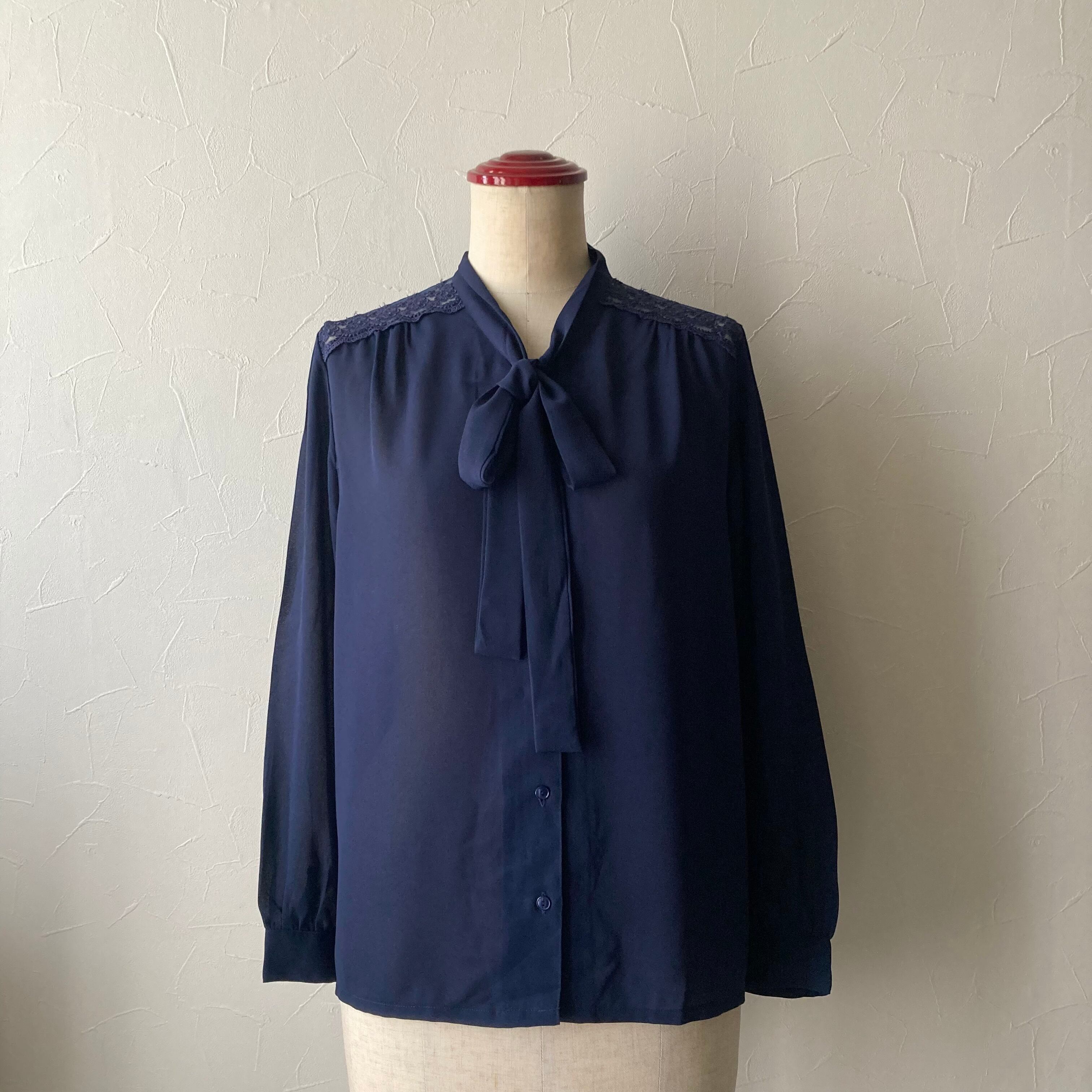 ネイビー肩レースリボンブラウス 古着 used vintage レトロ