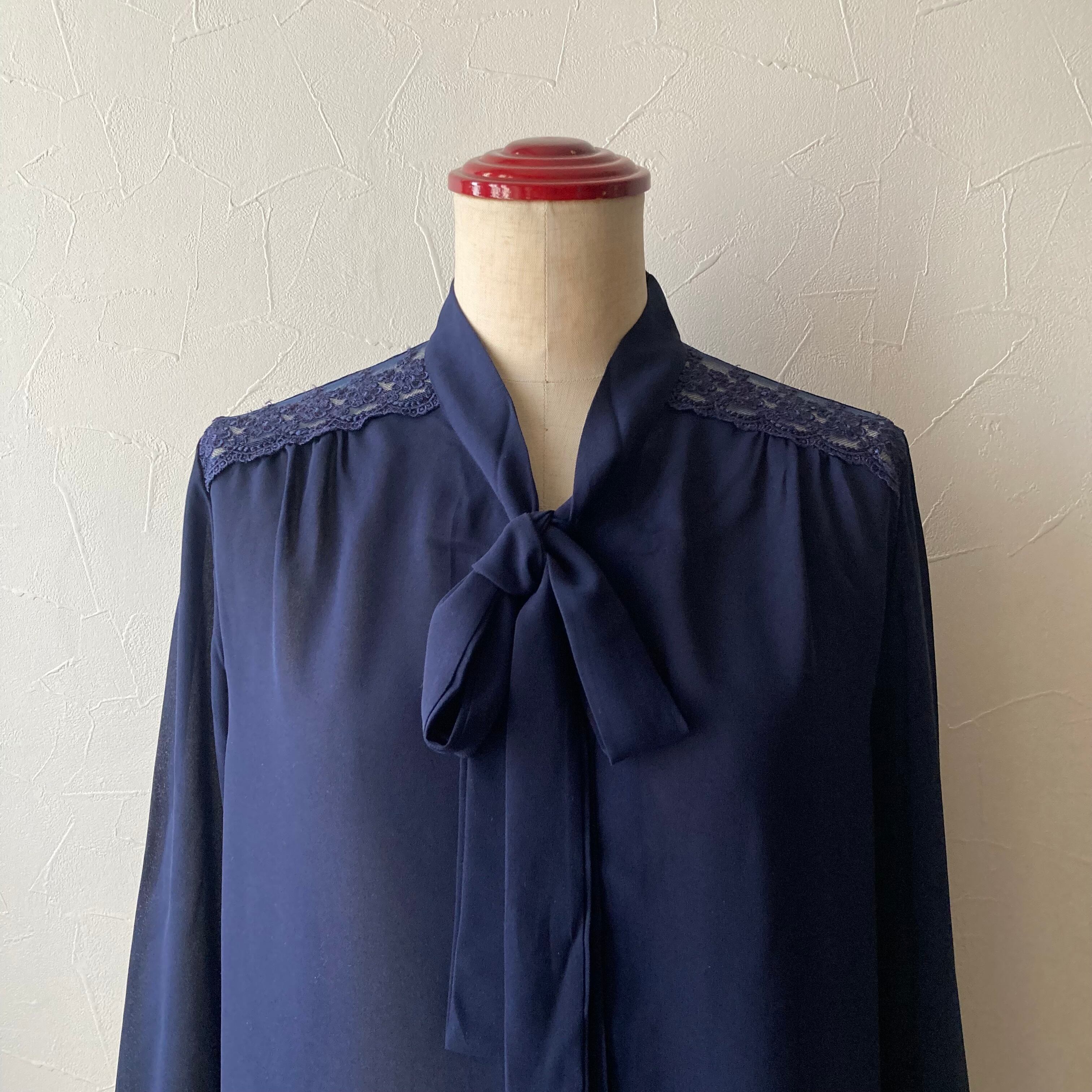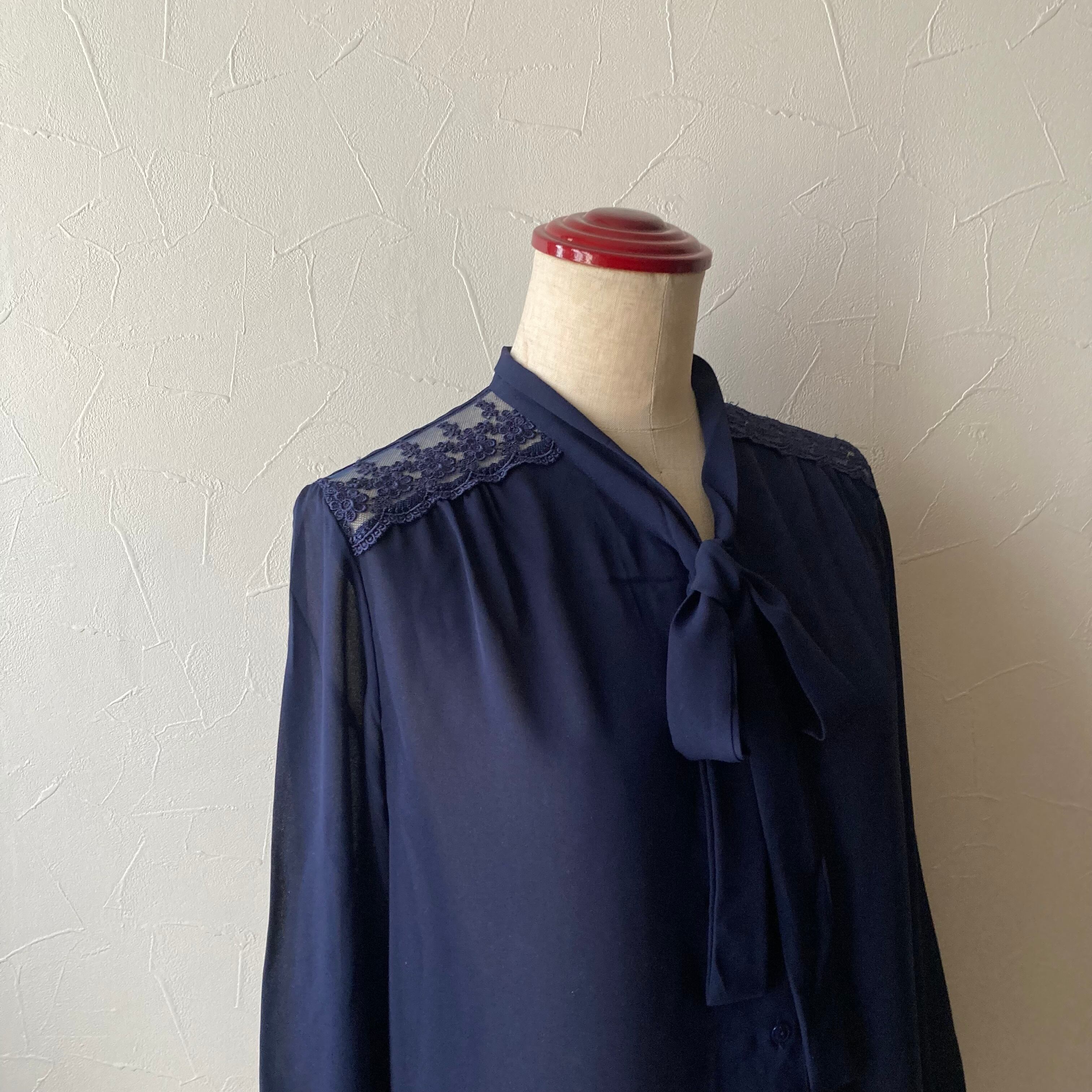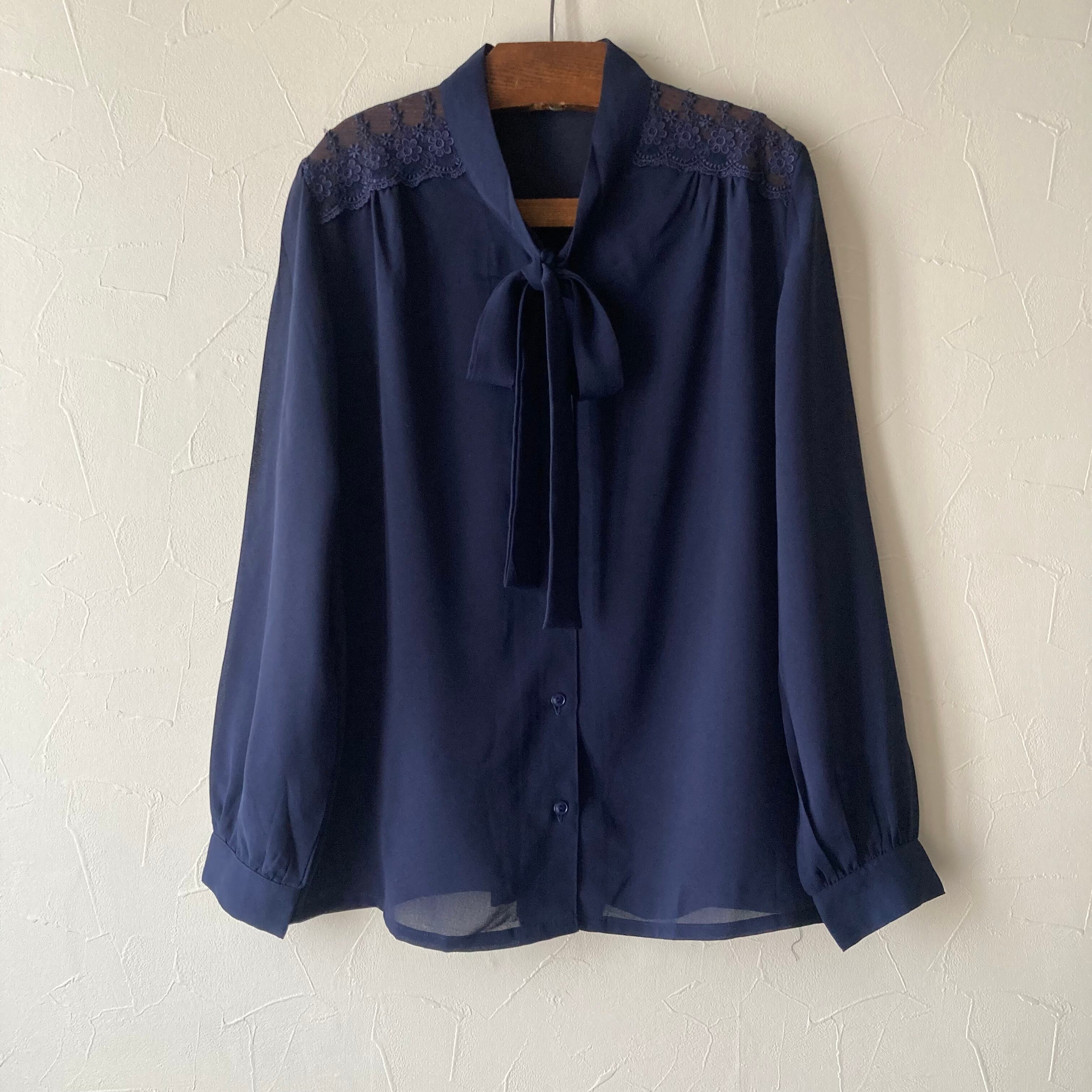 ネイビー肩レースリボンブラウス 古着 used vintage レトロ