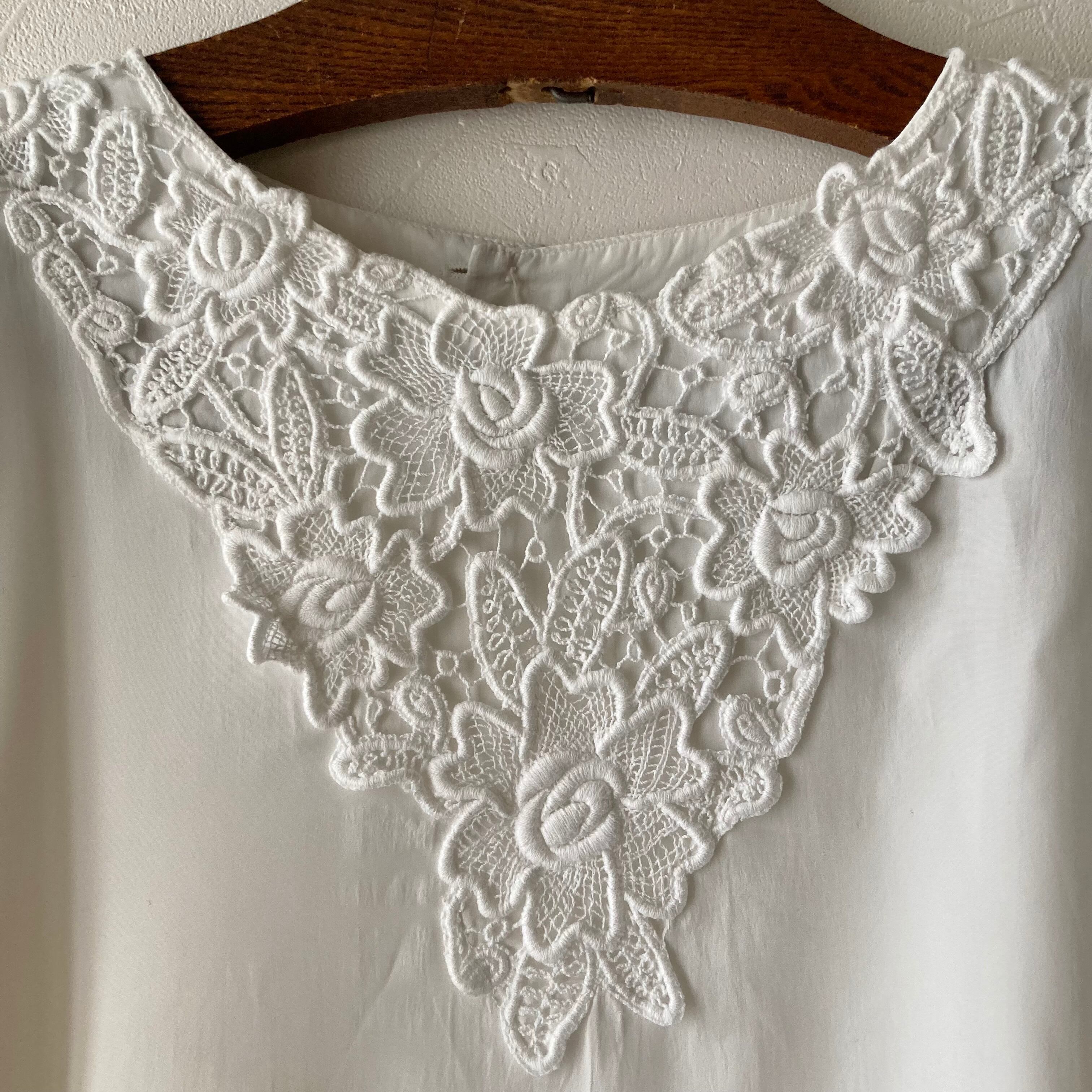 レトロな花刺繍レースが施された後ろボタンのブラウス◯
