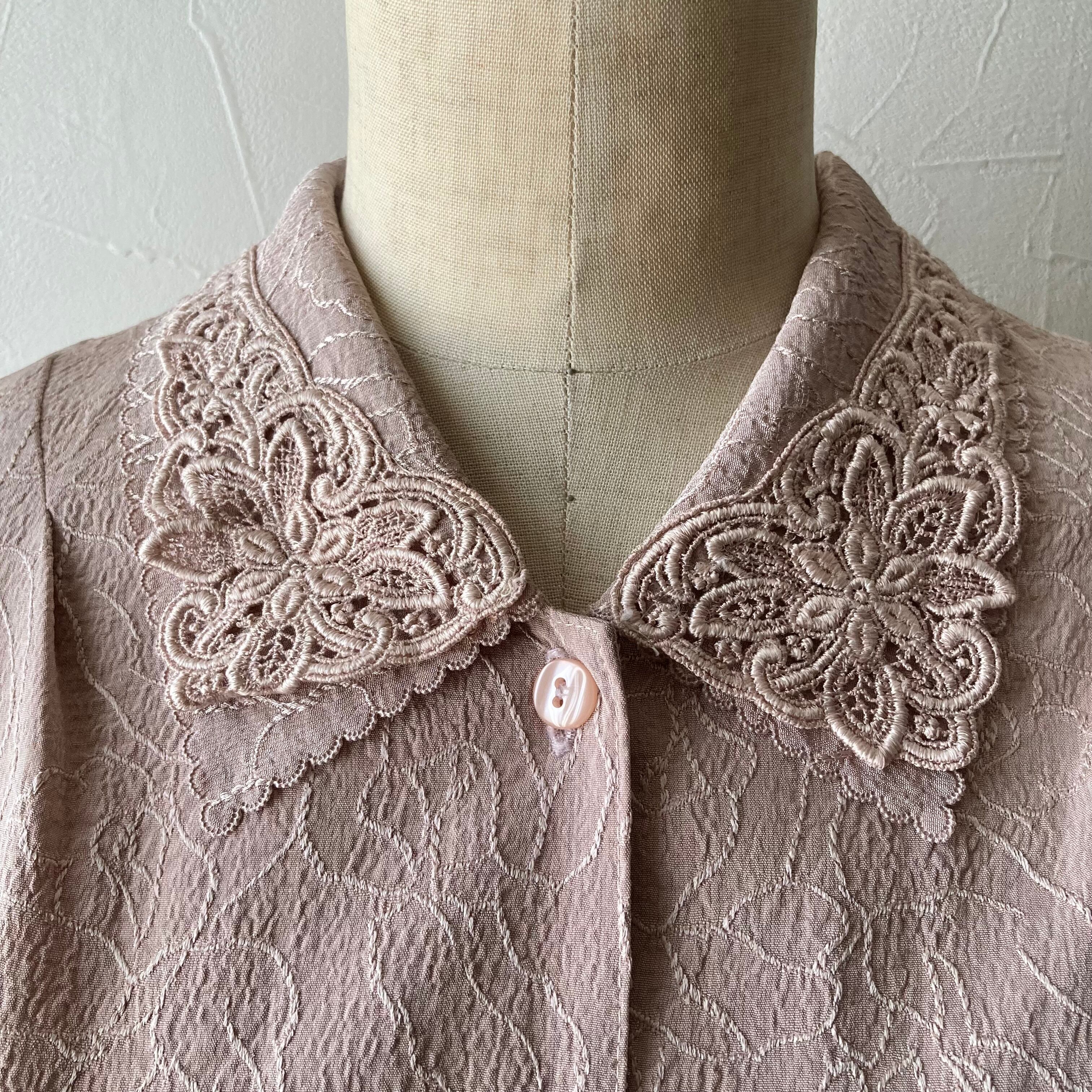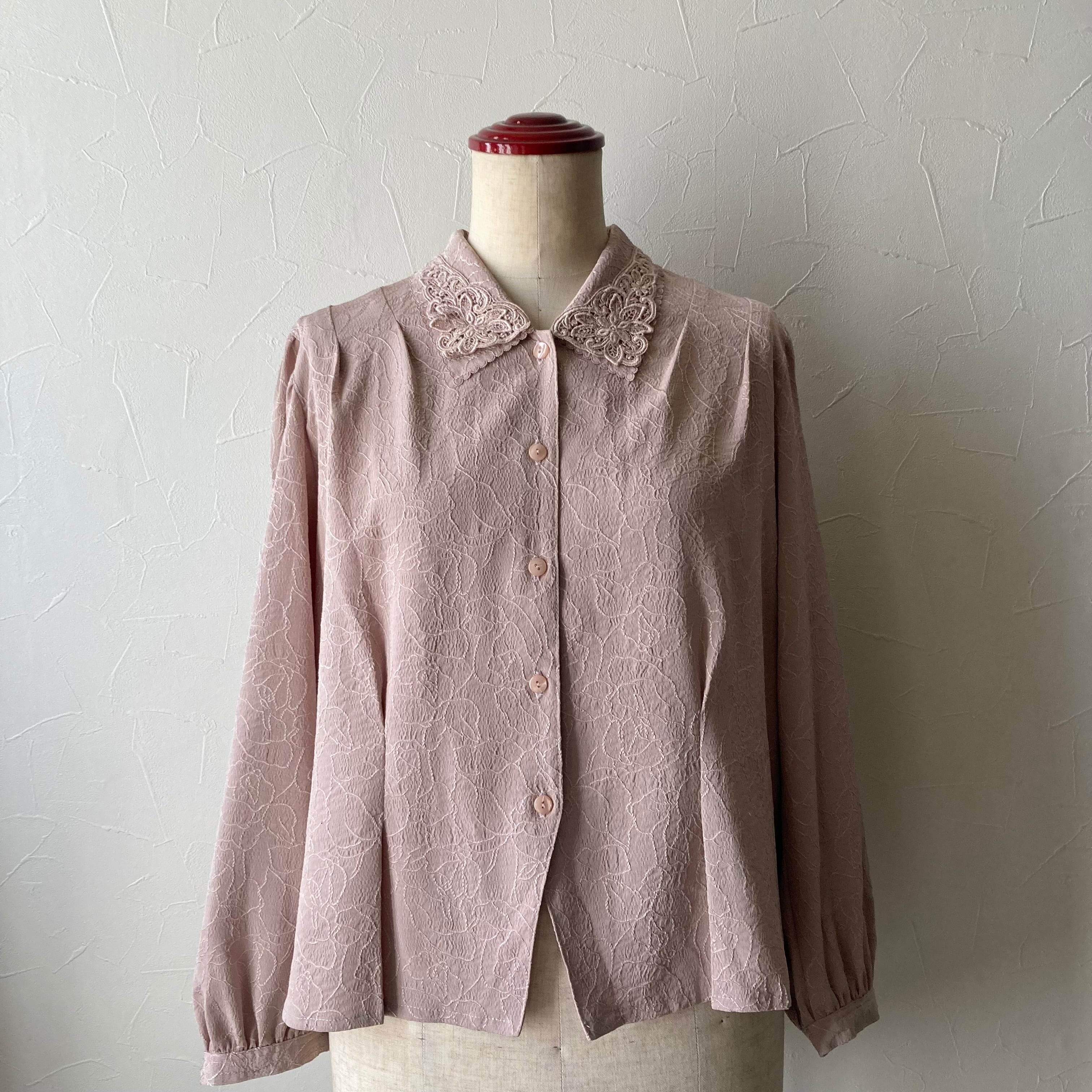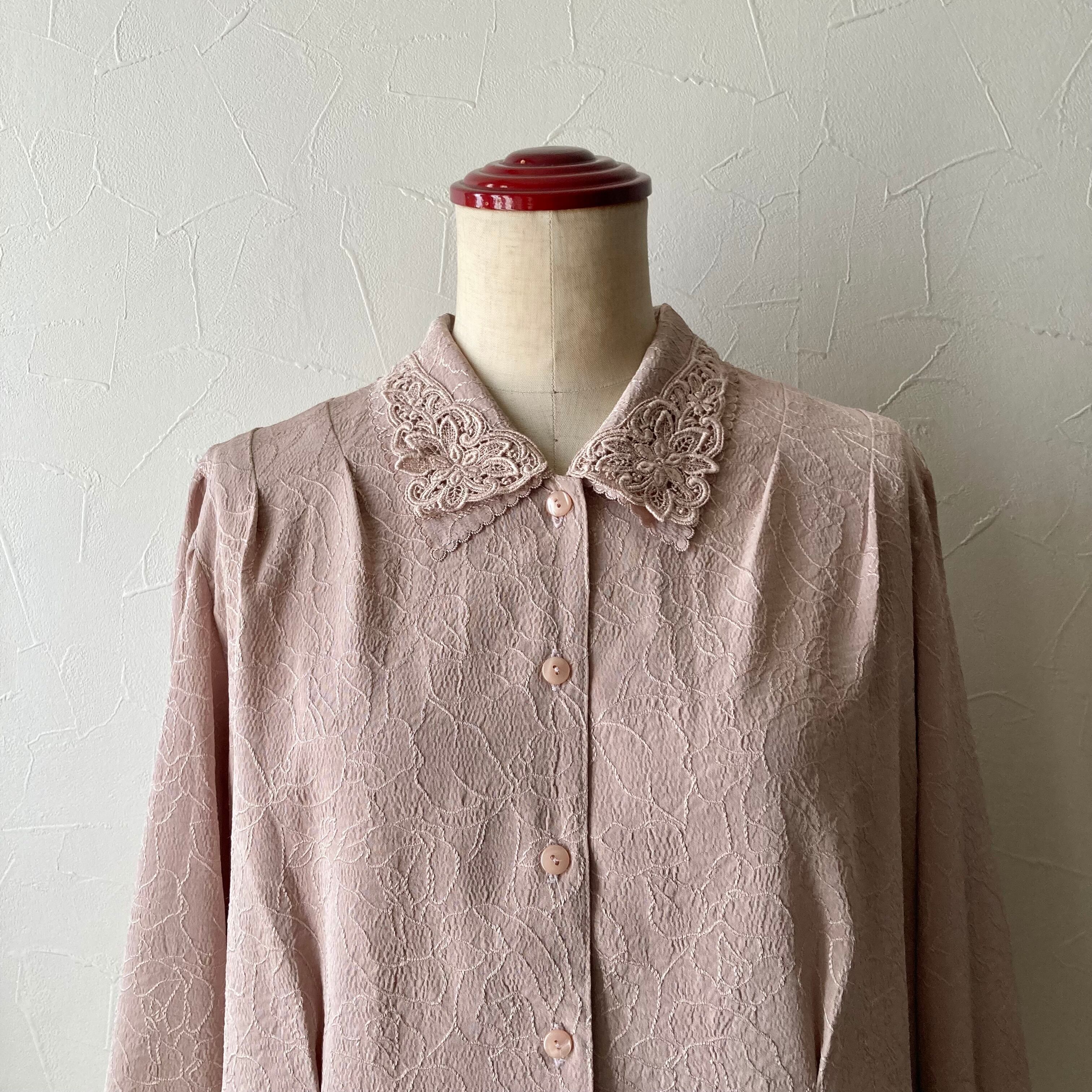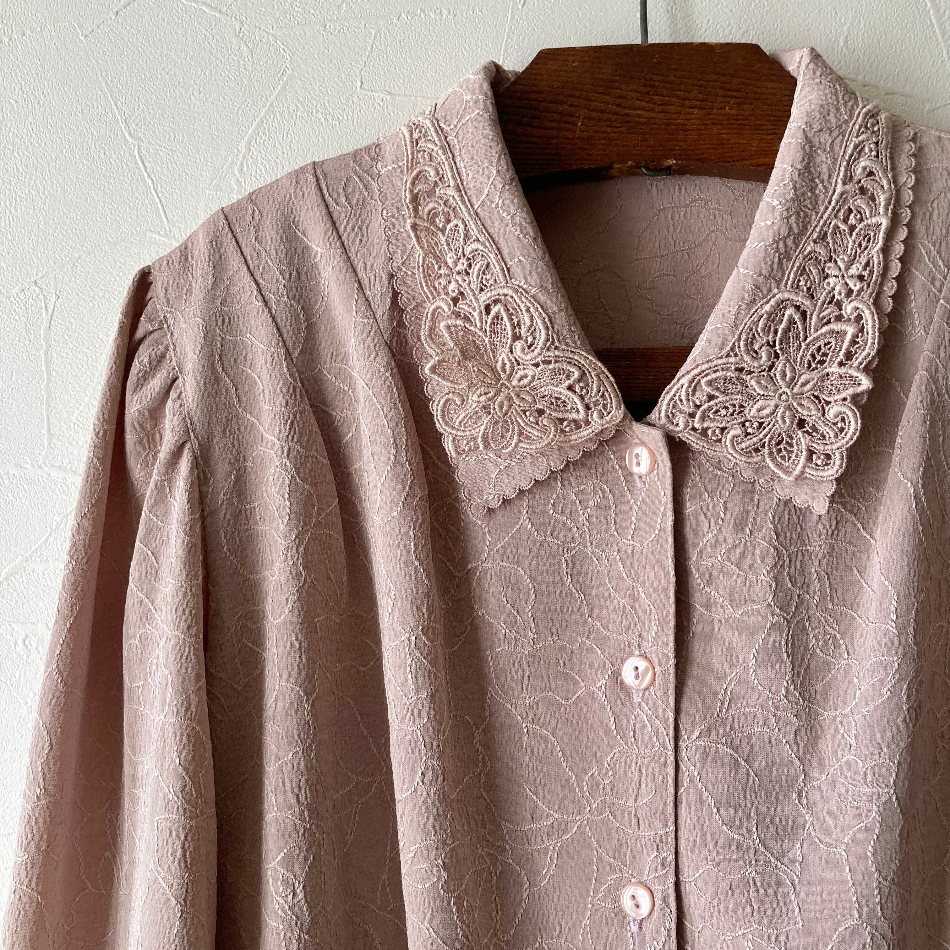 くすんだ色味とレース二重襟、肩にはギャザーが沢山入った可愛いシルエットのレトロブラウスです。