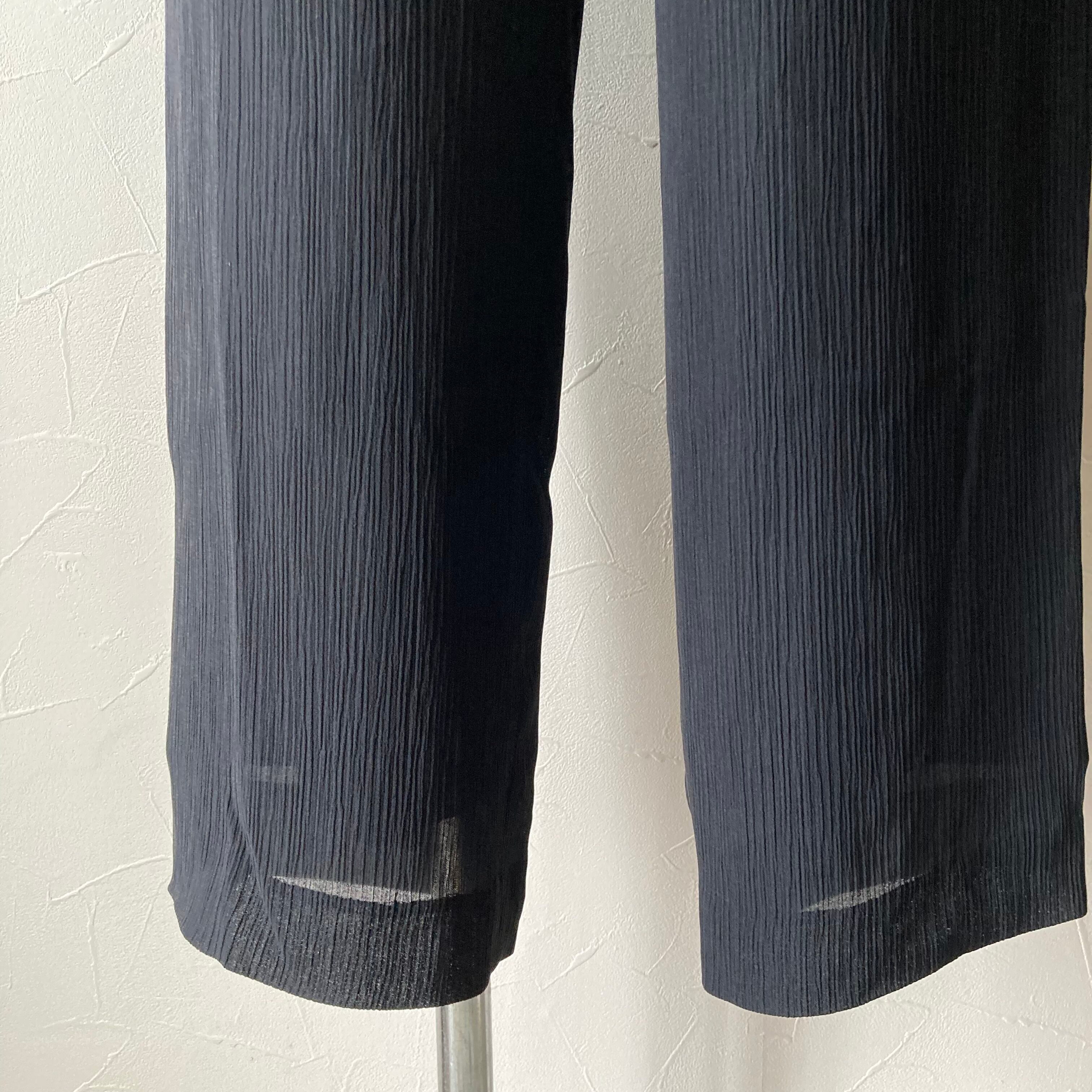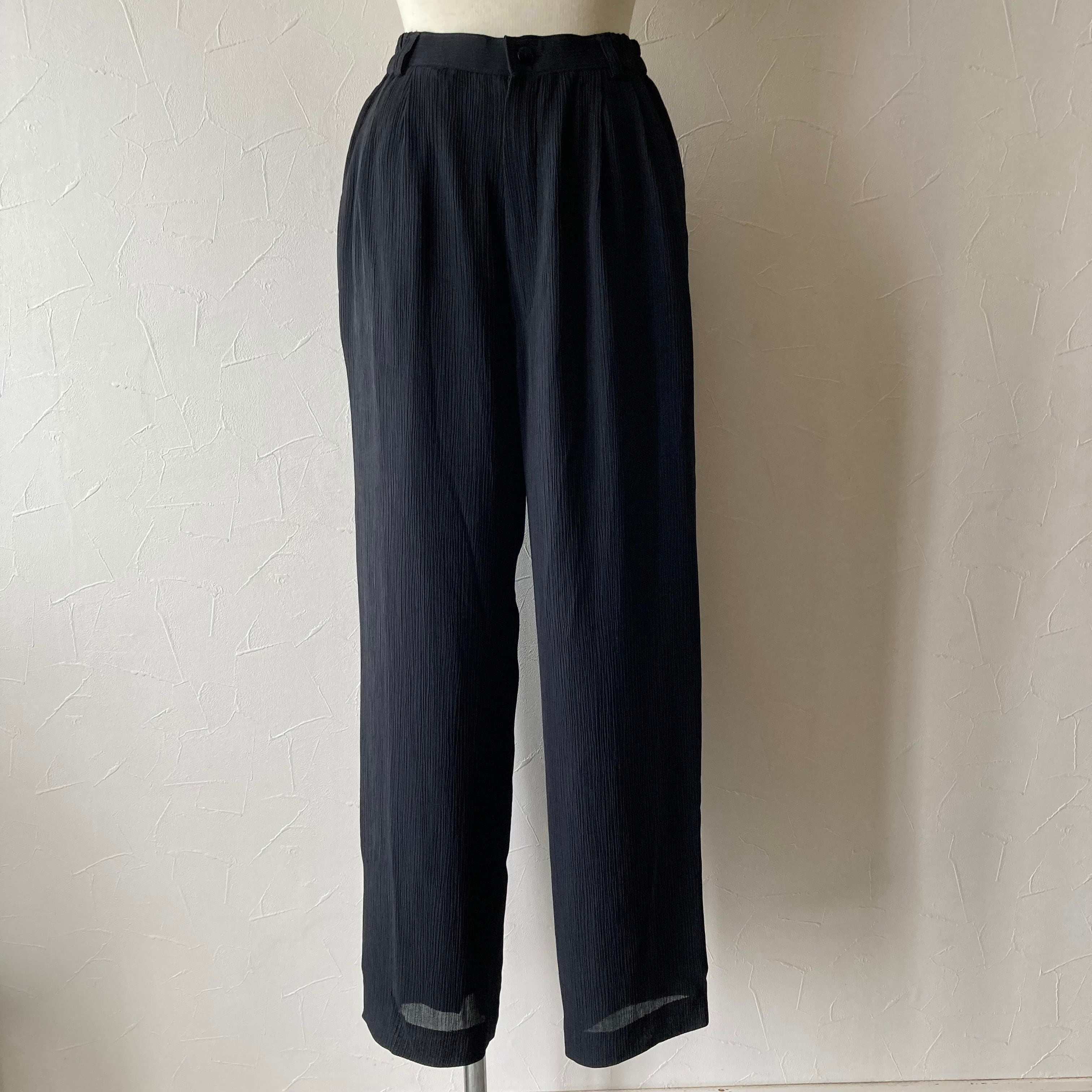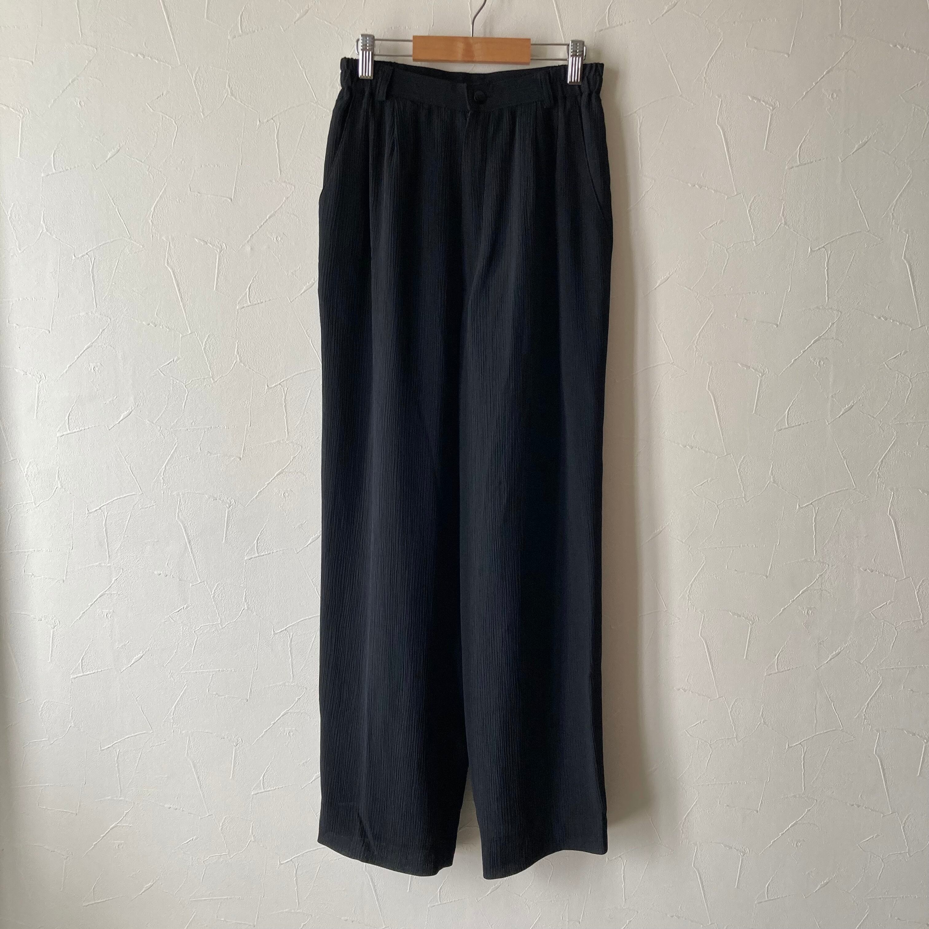シャリっとした肌触りの涼しげな黒色ハイウエストタックパンツ。