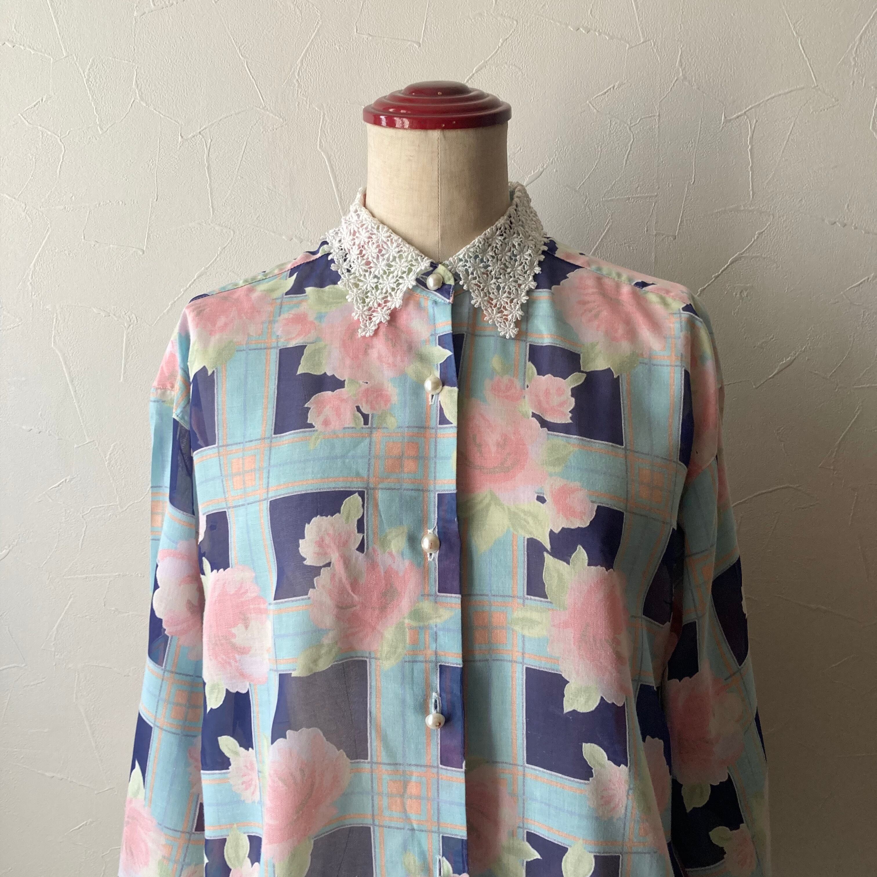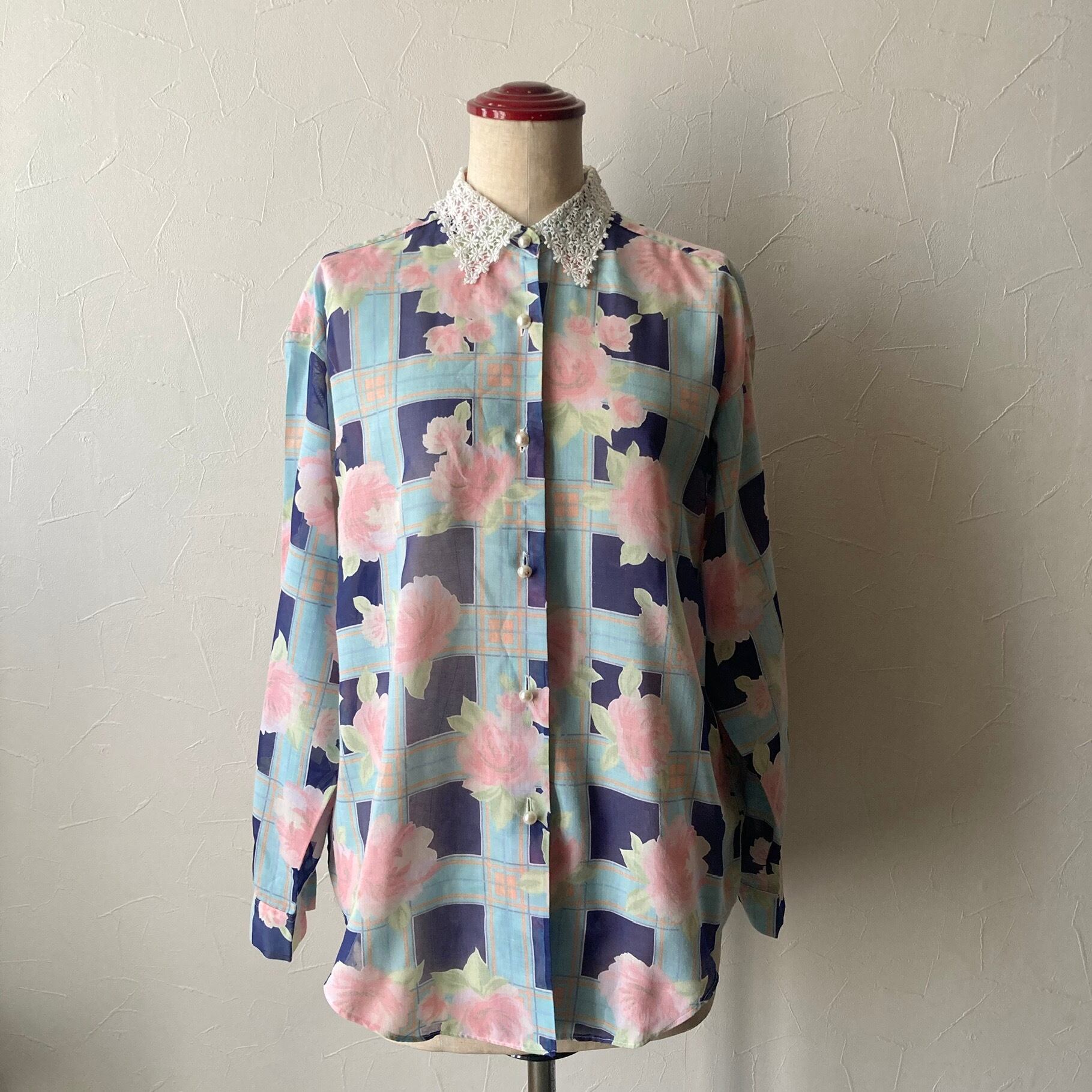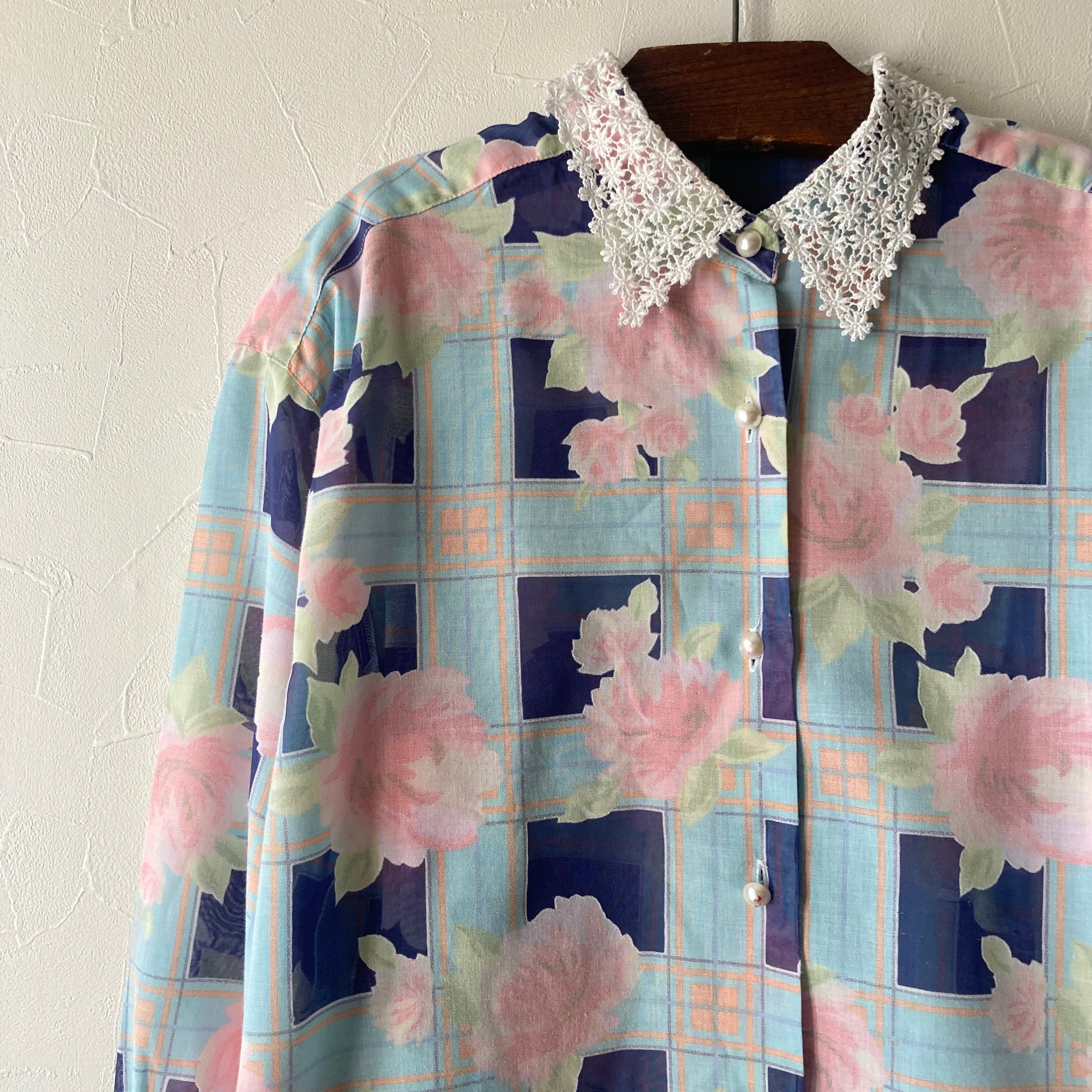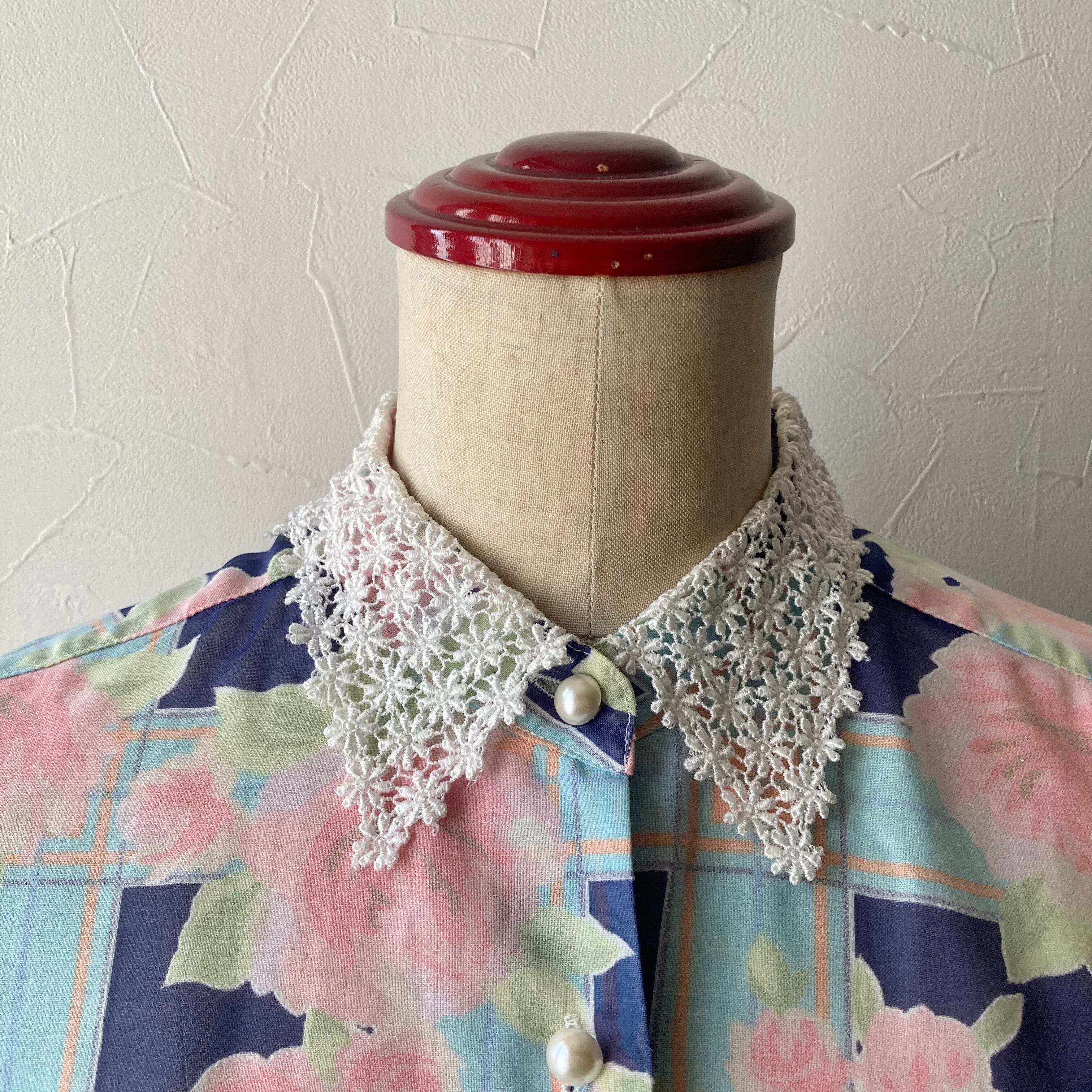 花レース襟コットン混柄ブラウス 古着 used vintage レトロ