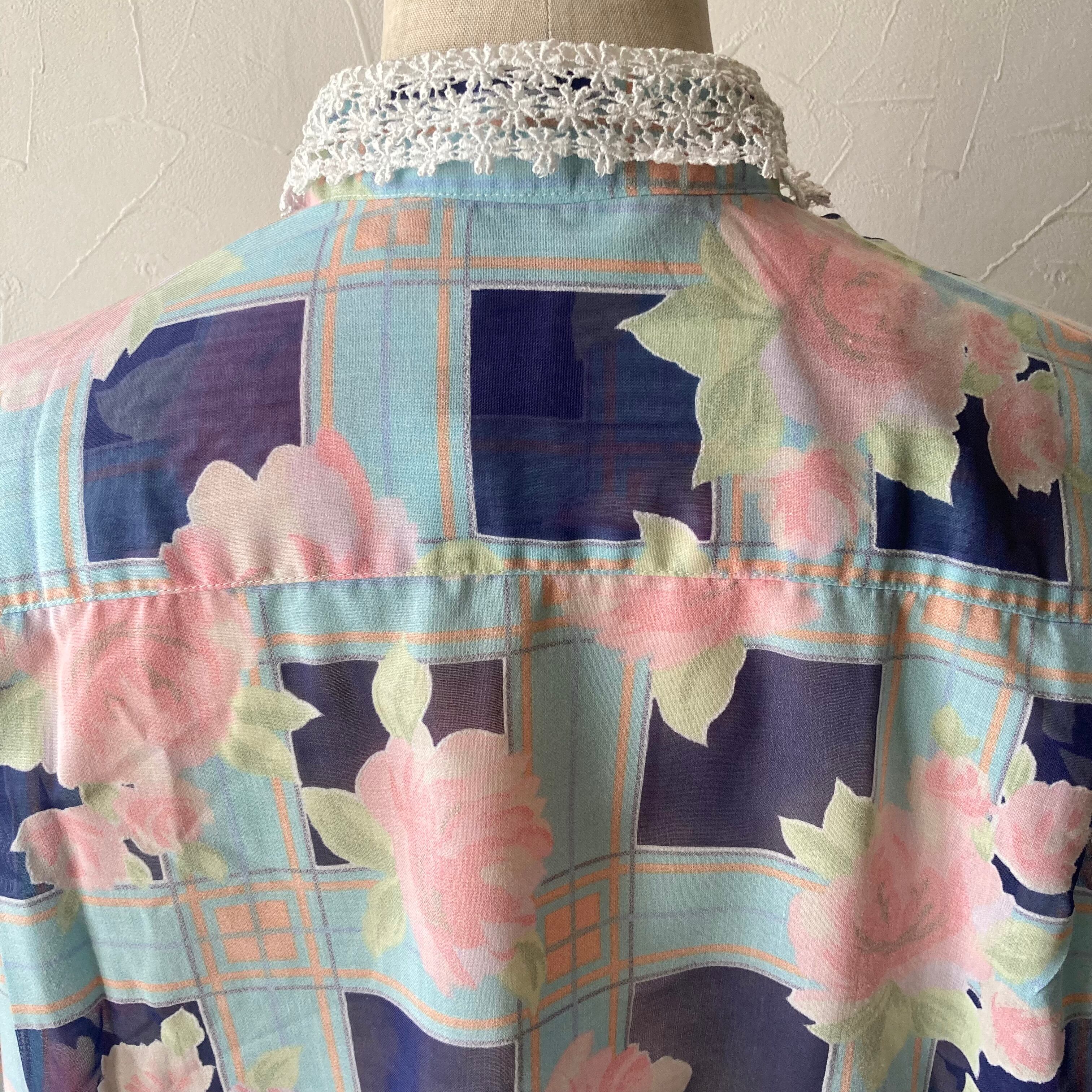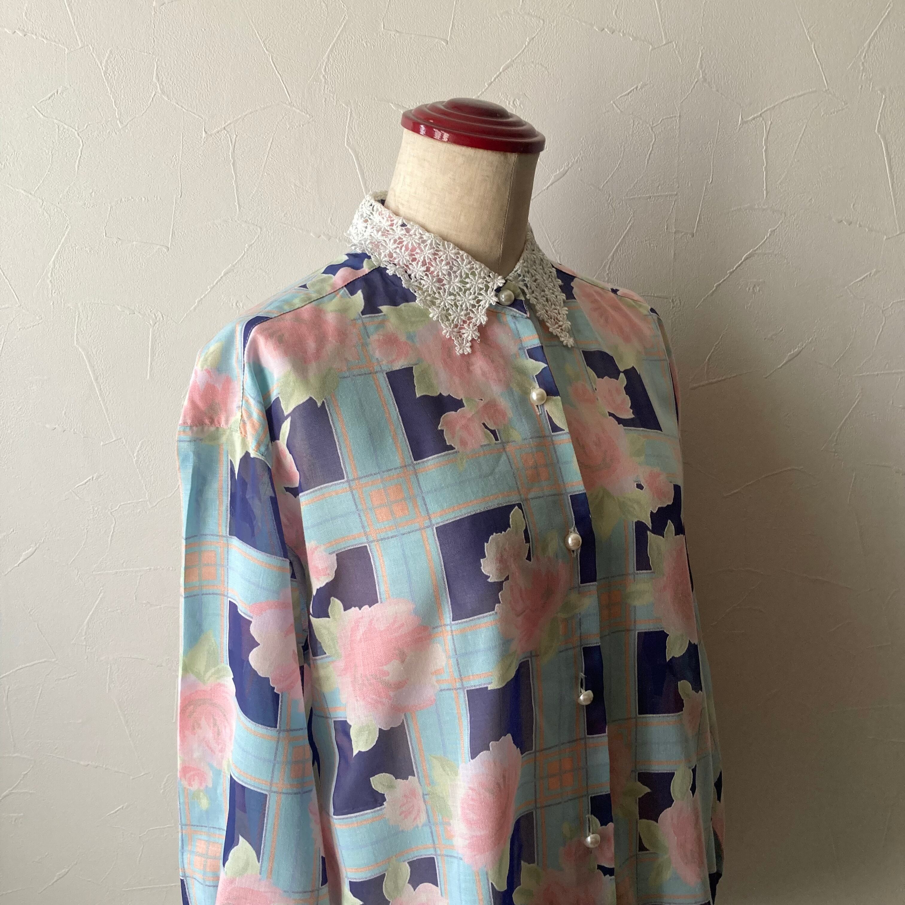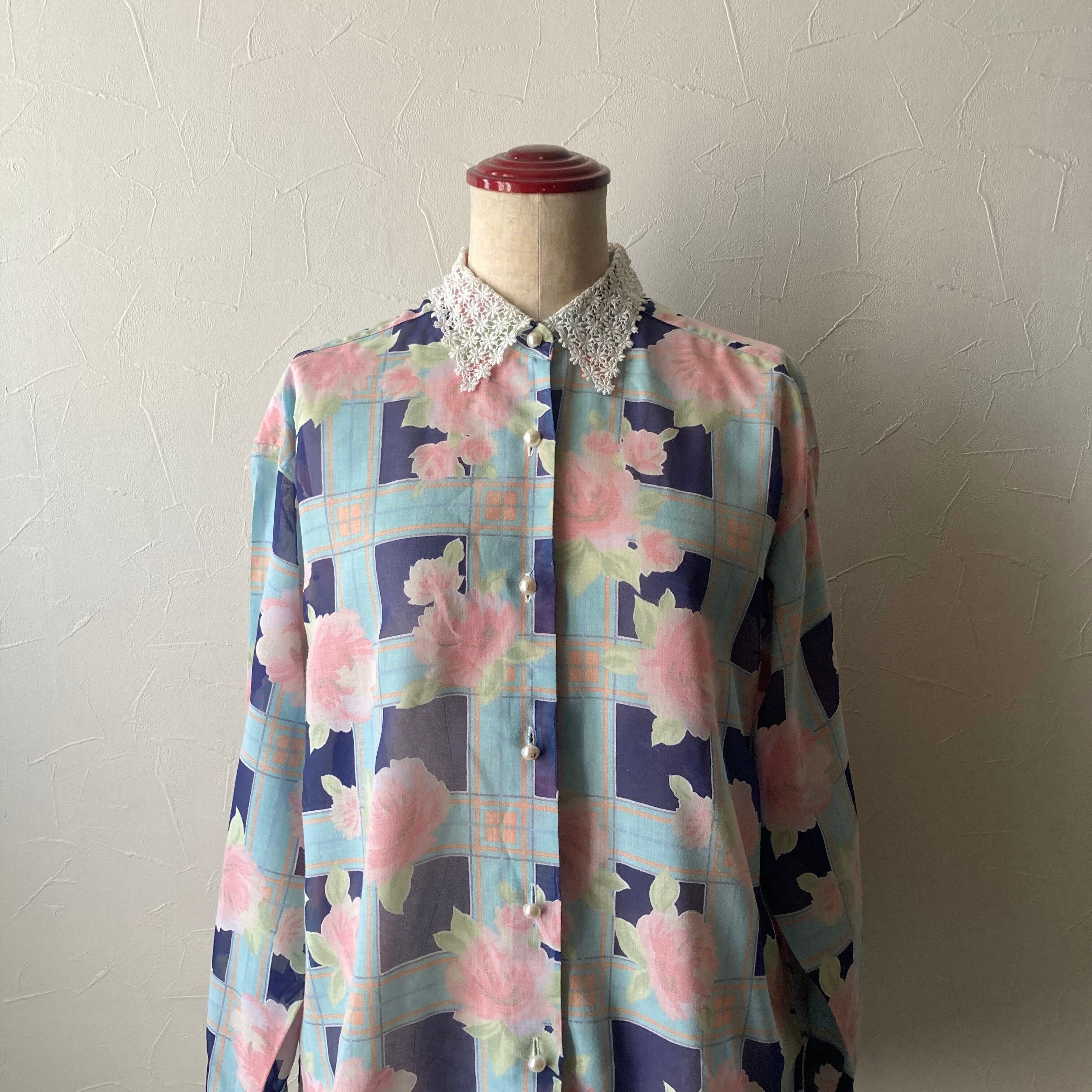 花レース襟コットン混柄ブラウス 古着 used vintage レトロ