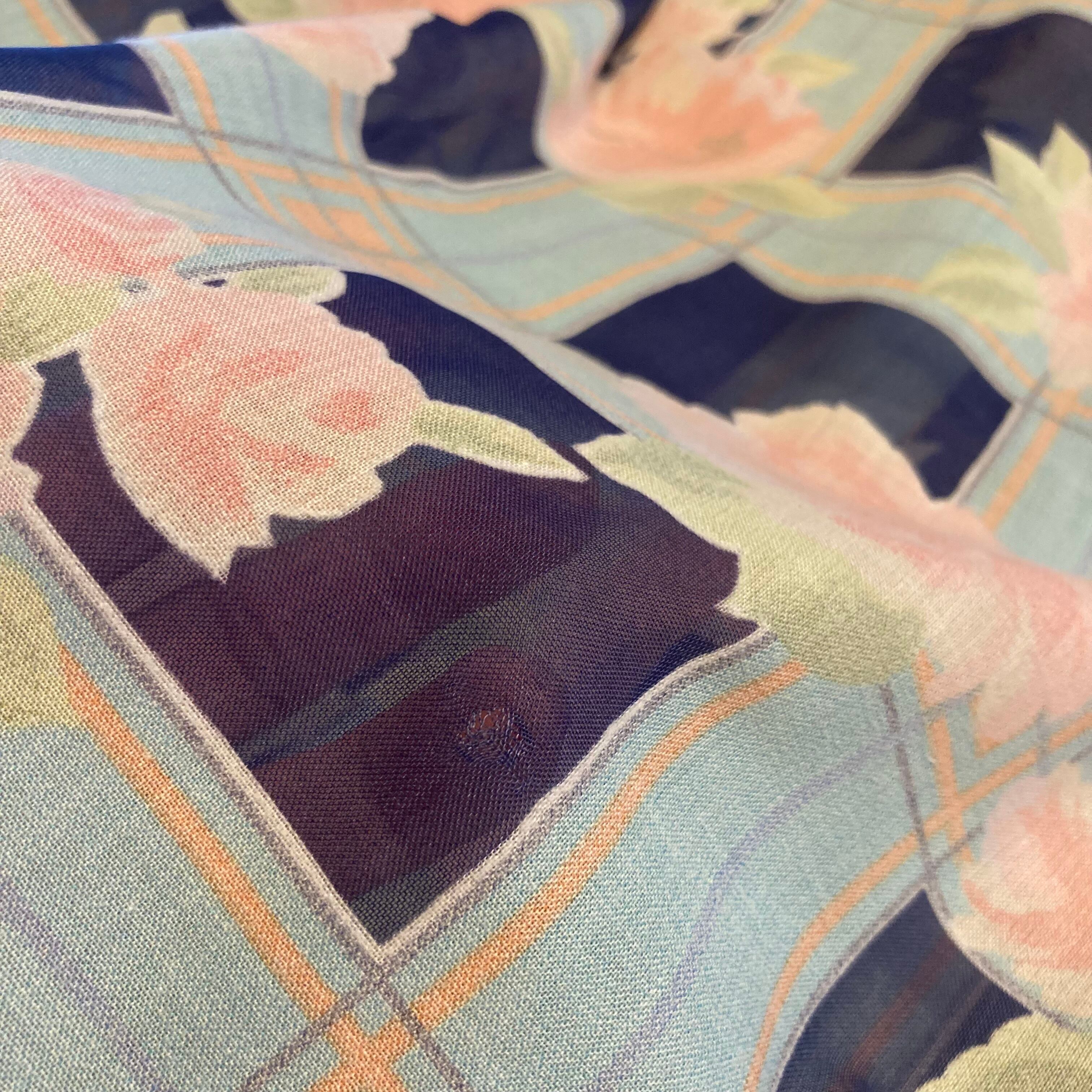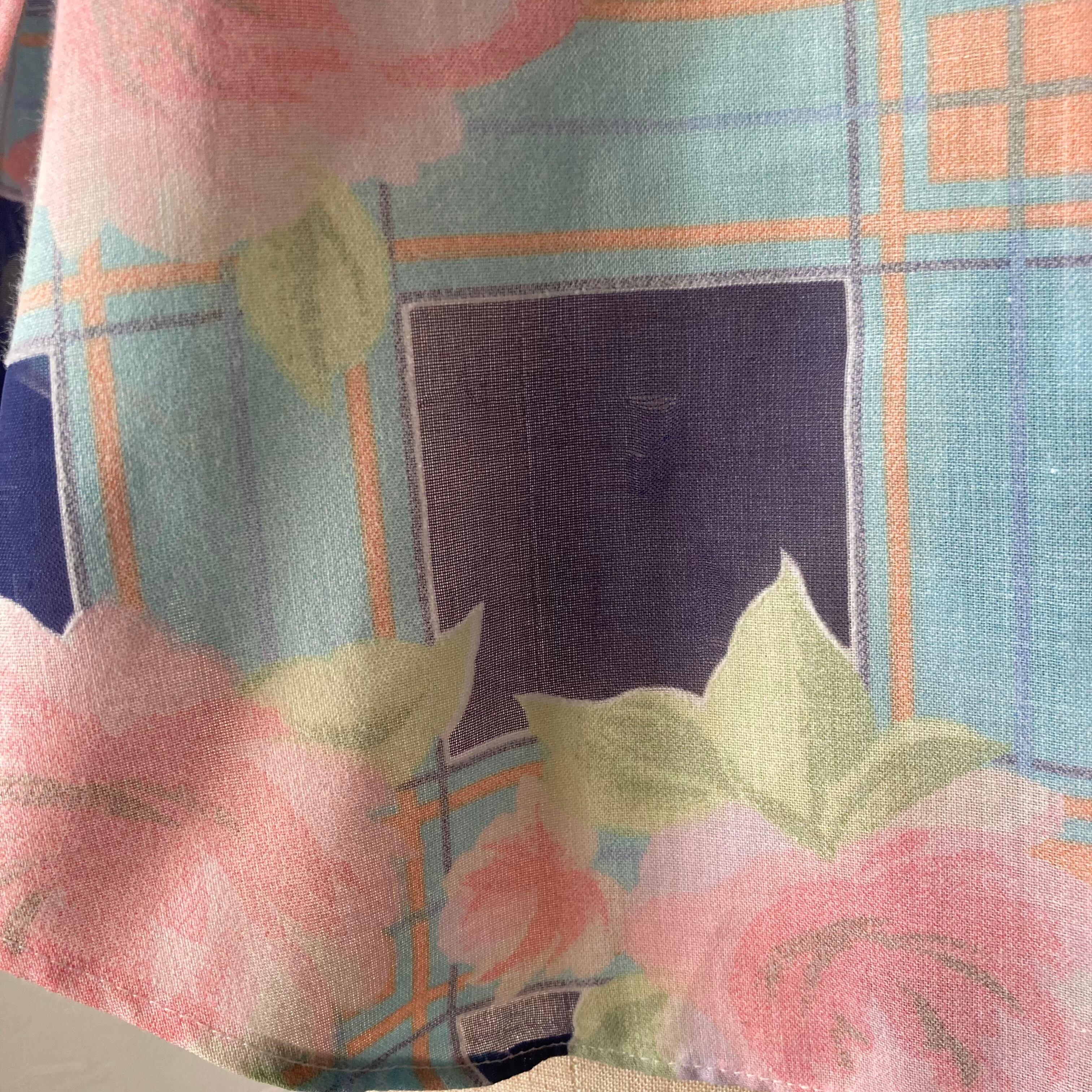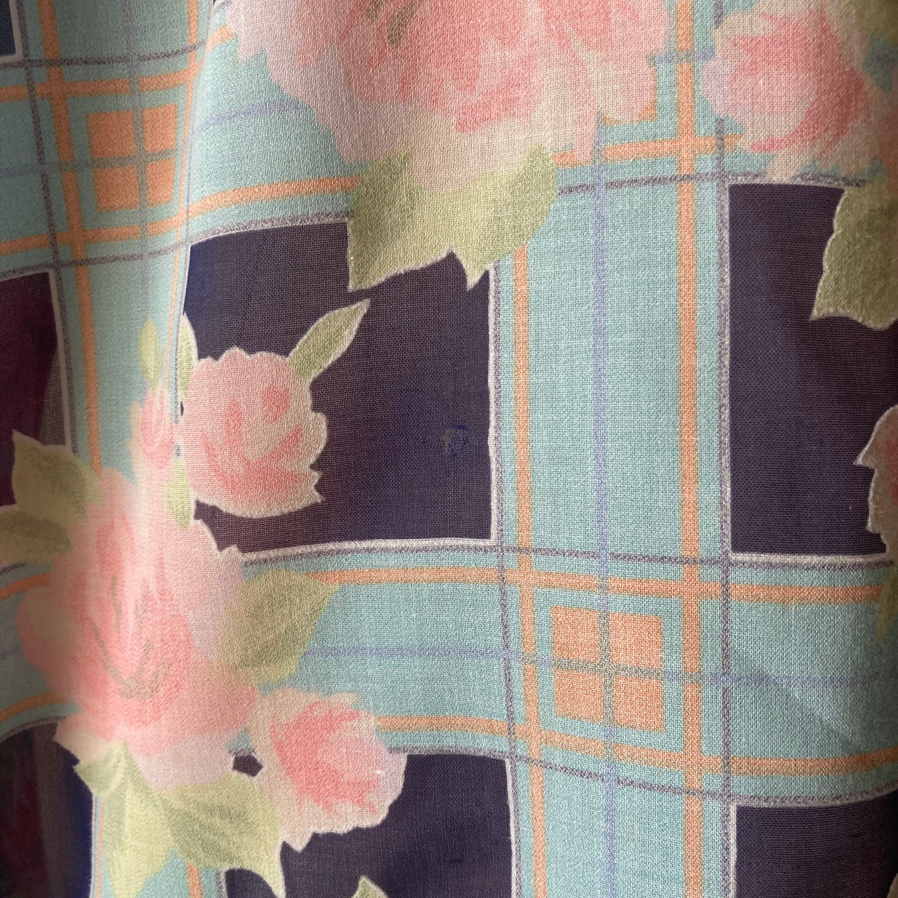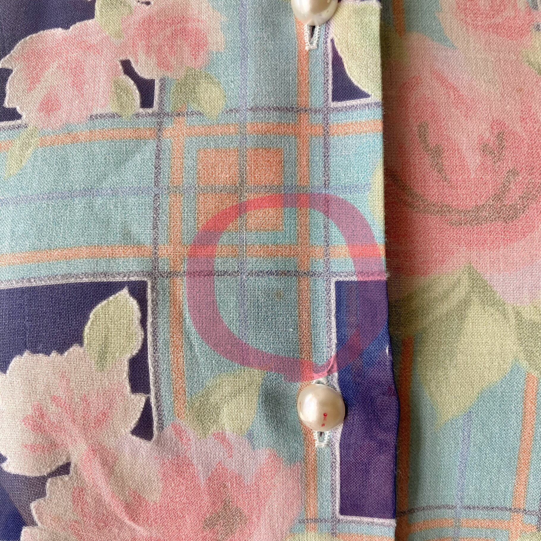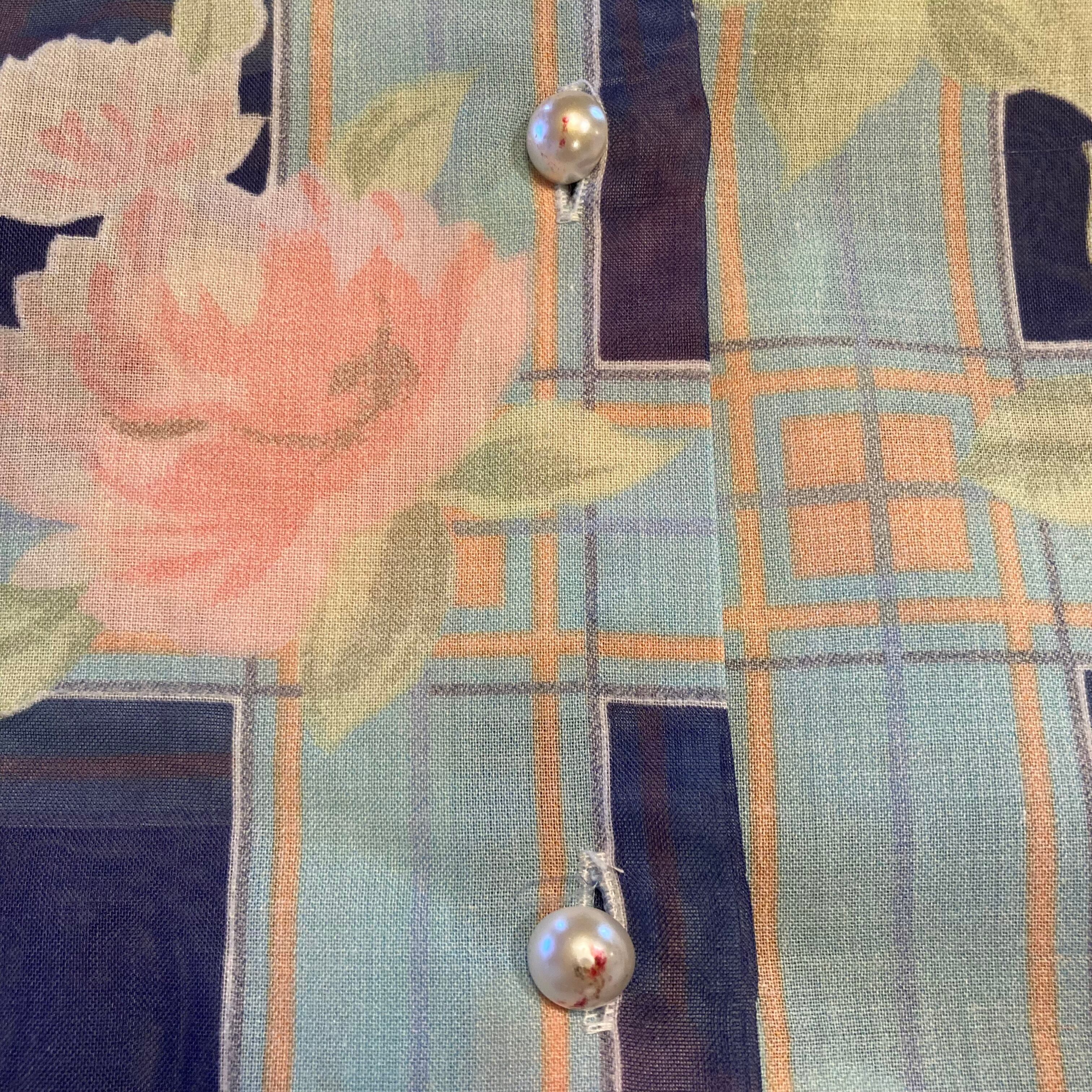 花レース襟と淡いピンクの花×透け感のあるチェック柄の色合わせが可愛らしいレトロなブラウス。ゆったりめのサイズ感とコットン混素材も着やすそう。白のパール風ボタンも可愛いです。
