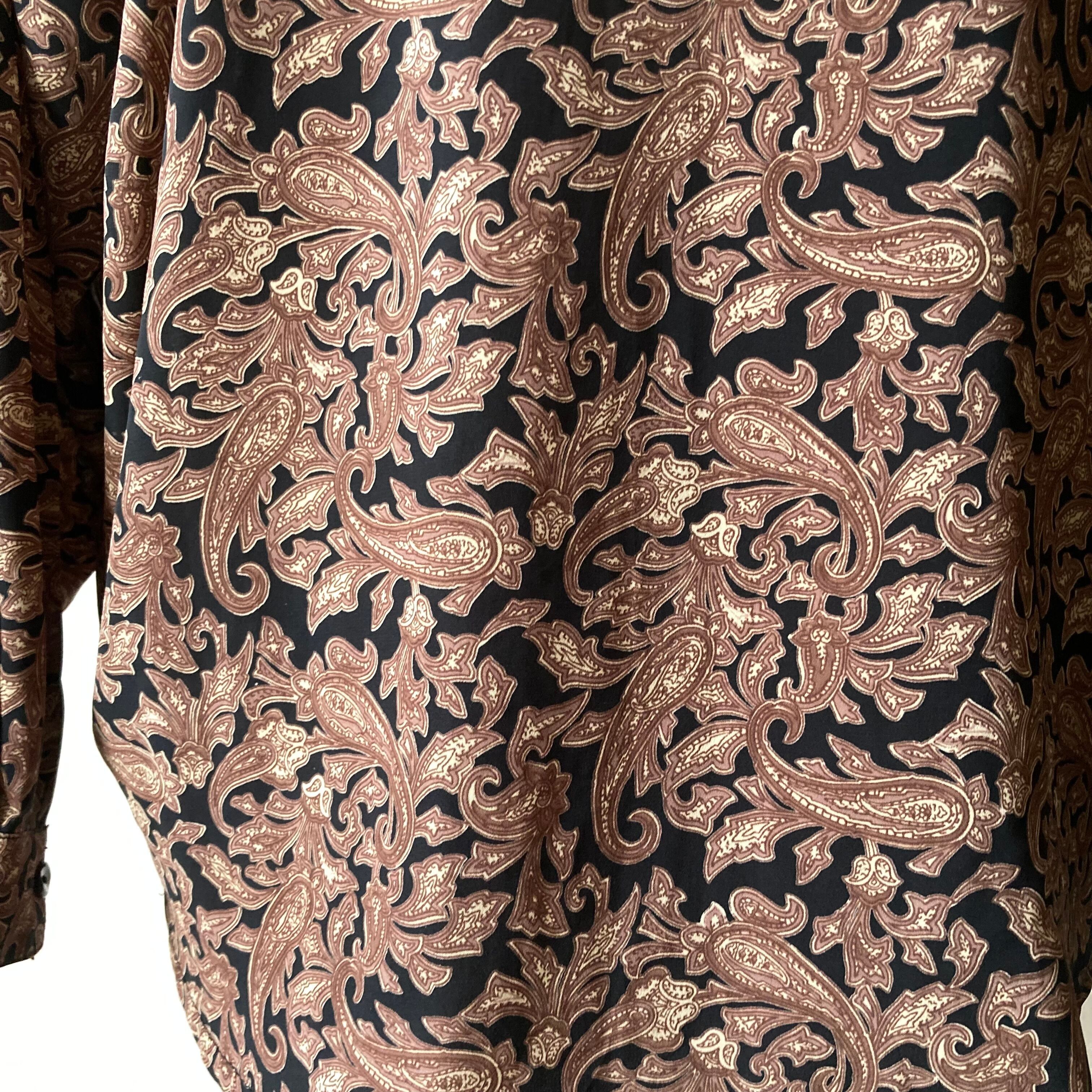 黒にブラウンのレトロな柄が素敵なブラウス。秋らしい色合いでゆるりと着られるサイズ感。ベルボトムやロングスカートなど、合わせるボトムで雰囲気の違いを楽しめる一枚だと思います。