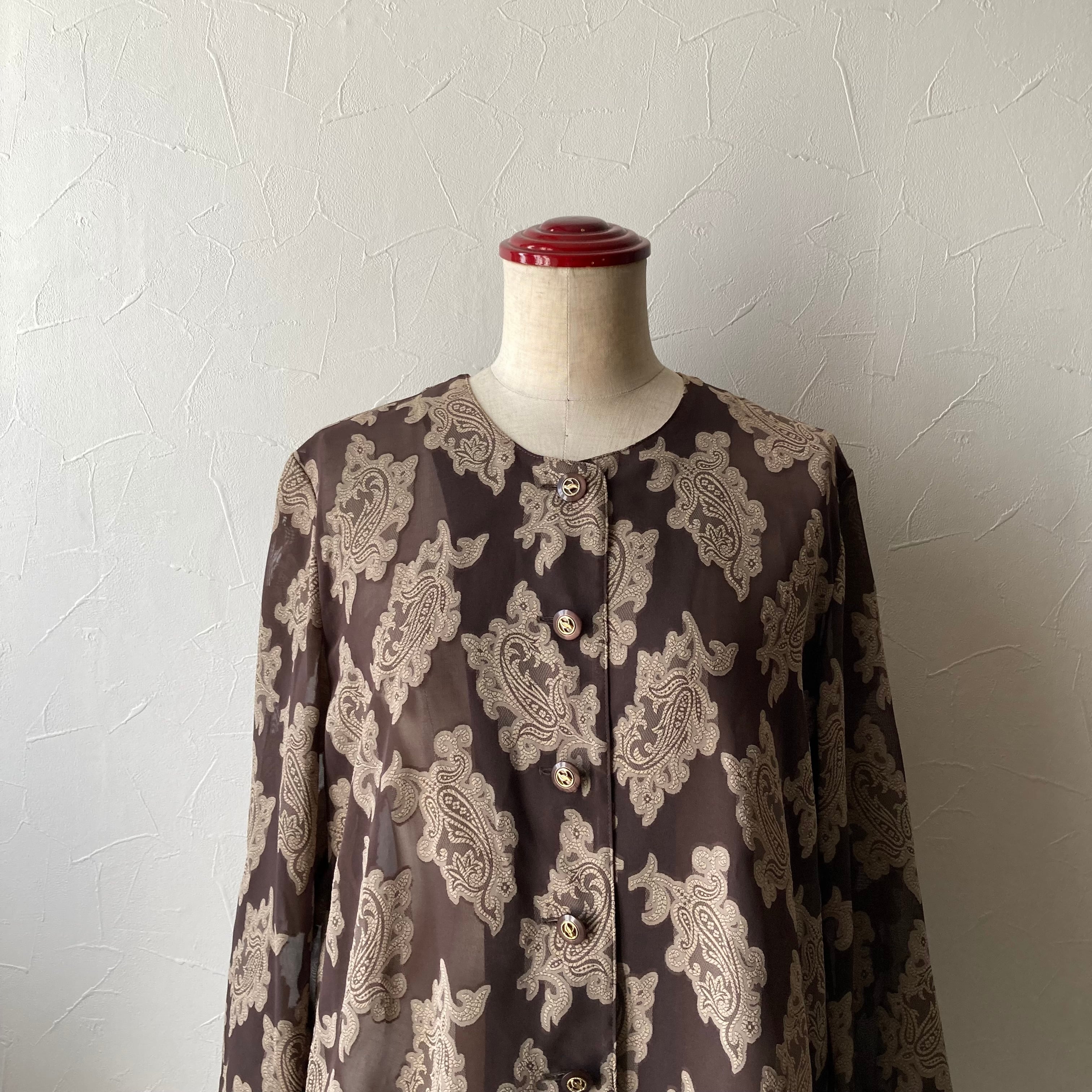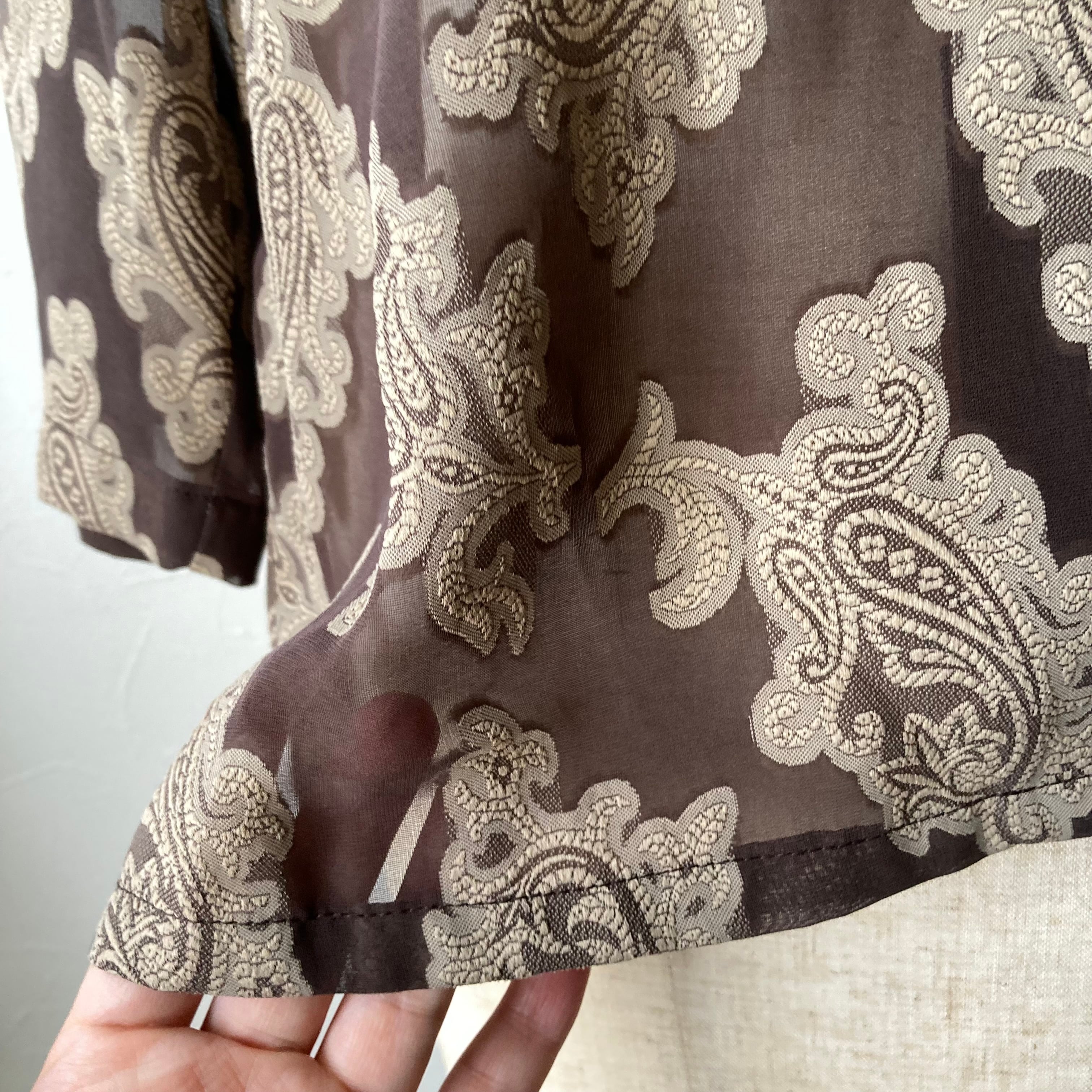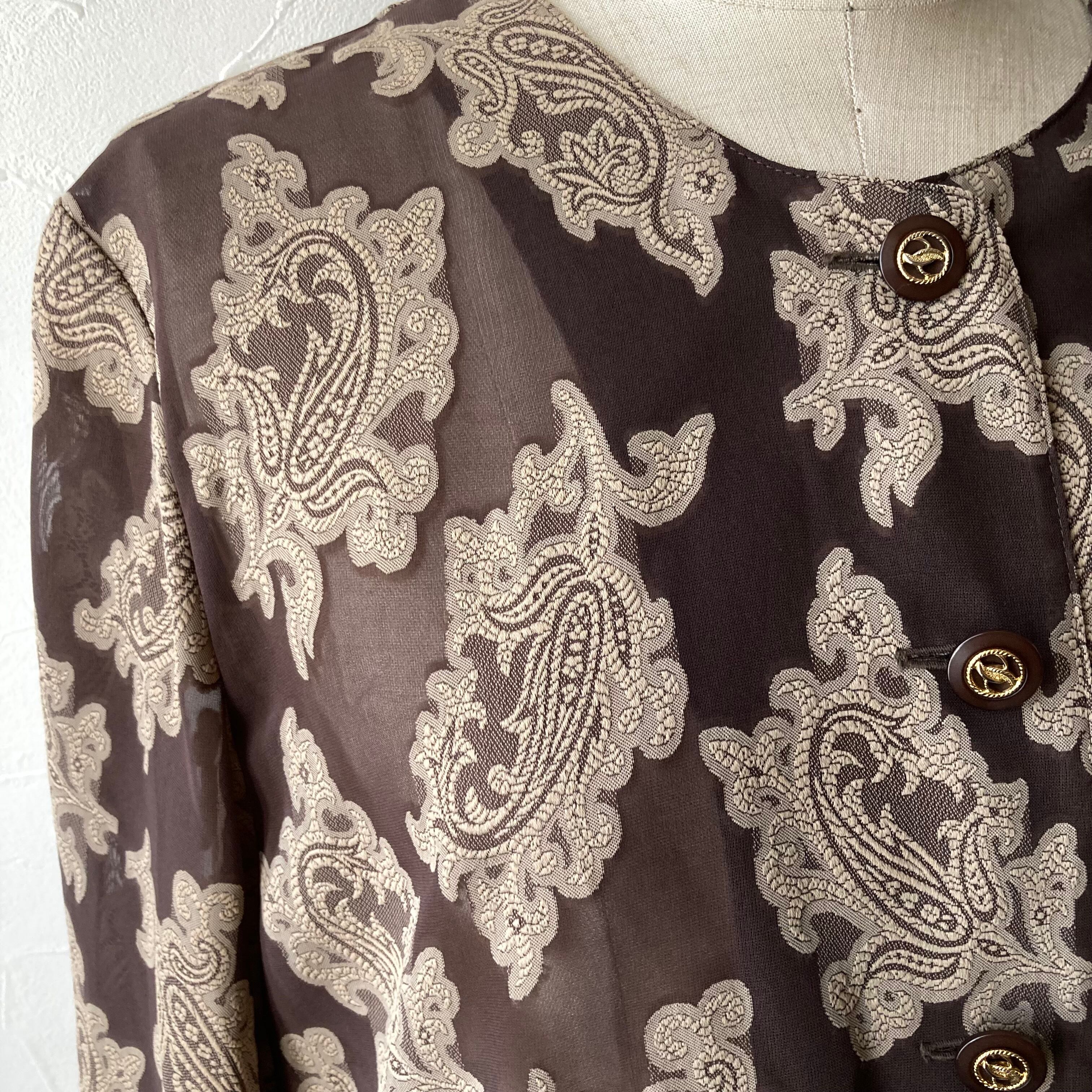 ブラウンのさりげない透け感とレトロな柄が素敵です。目を惹く魅力的な一枚です。