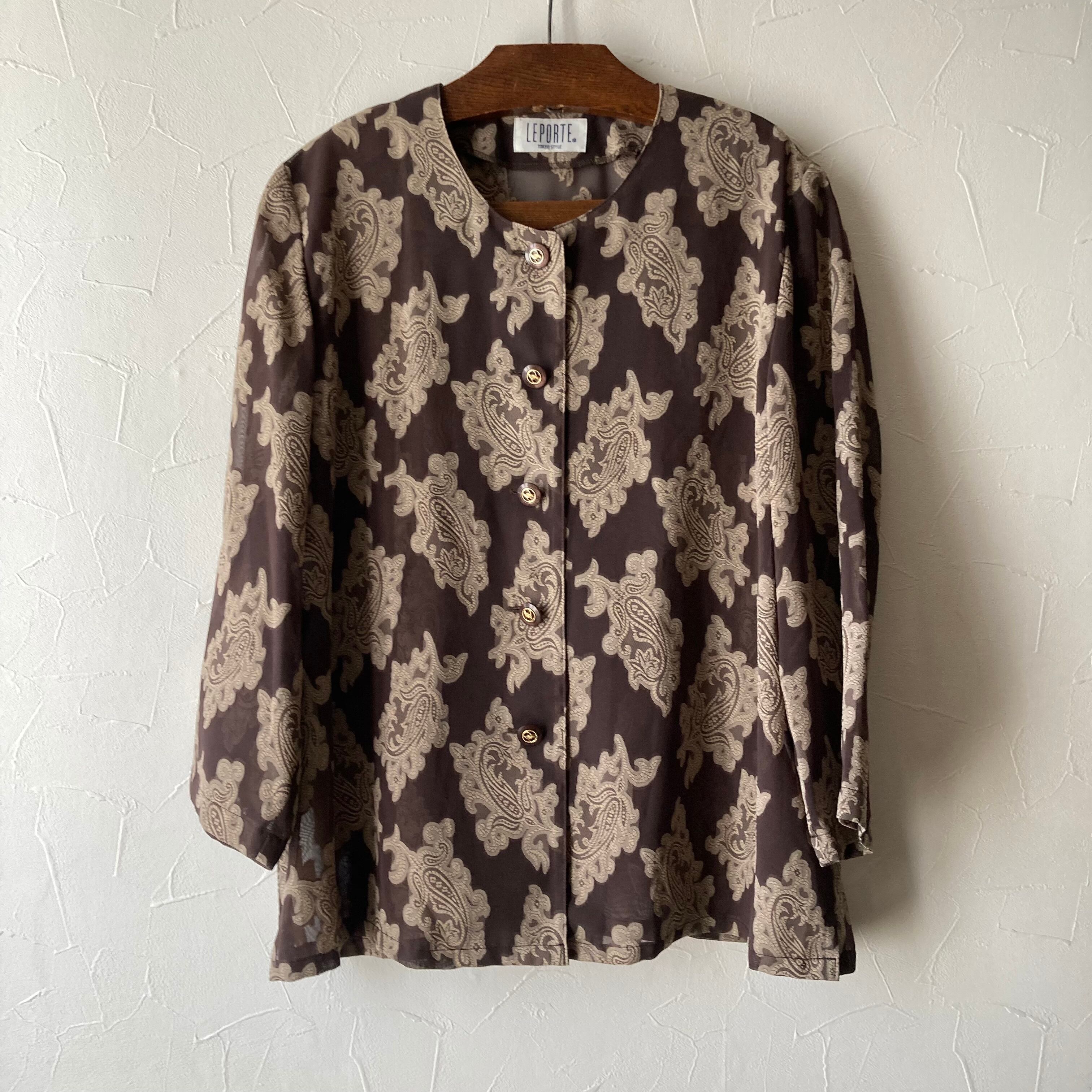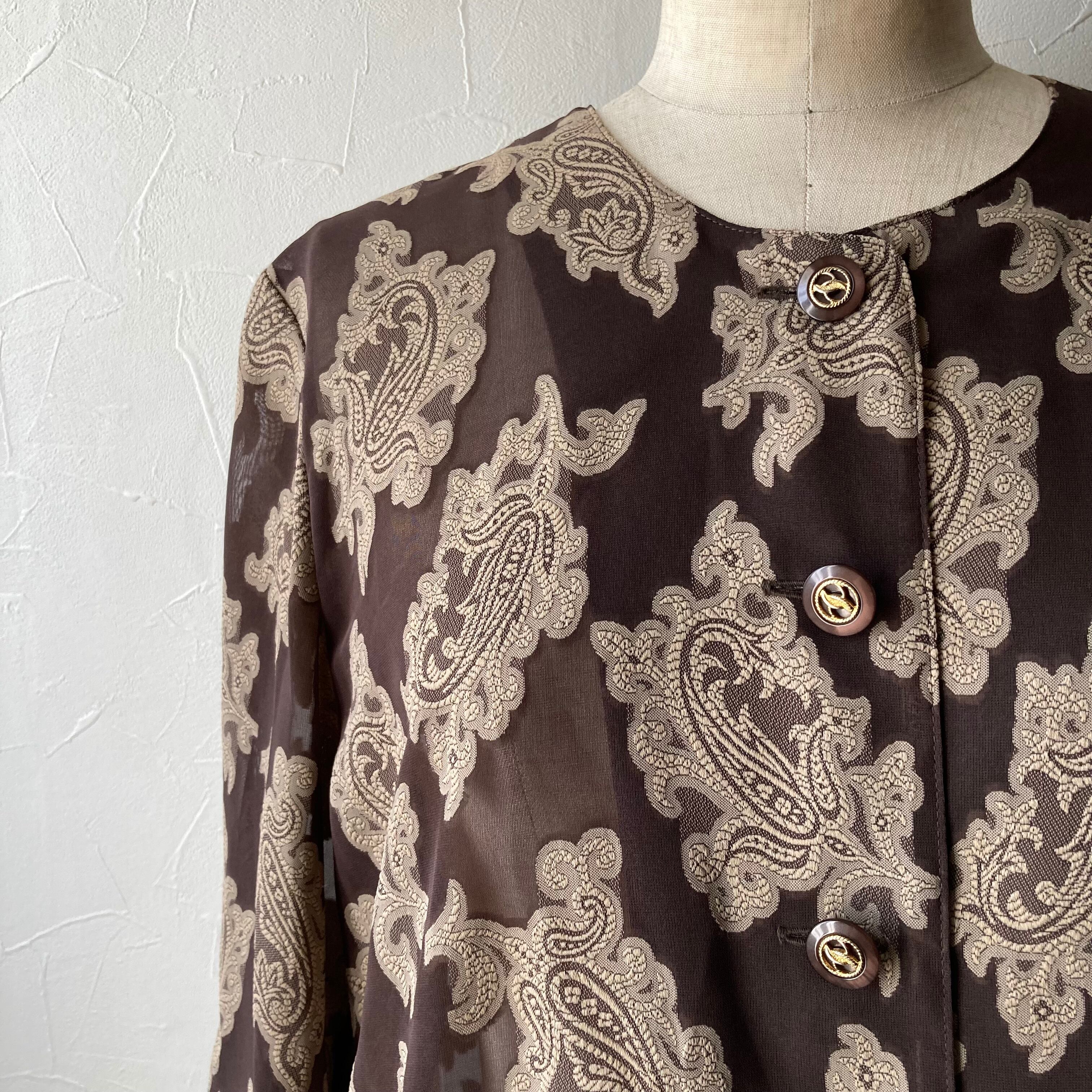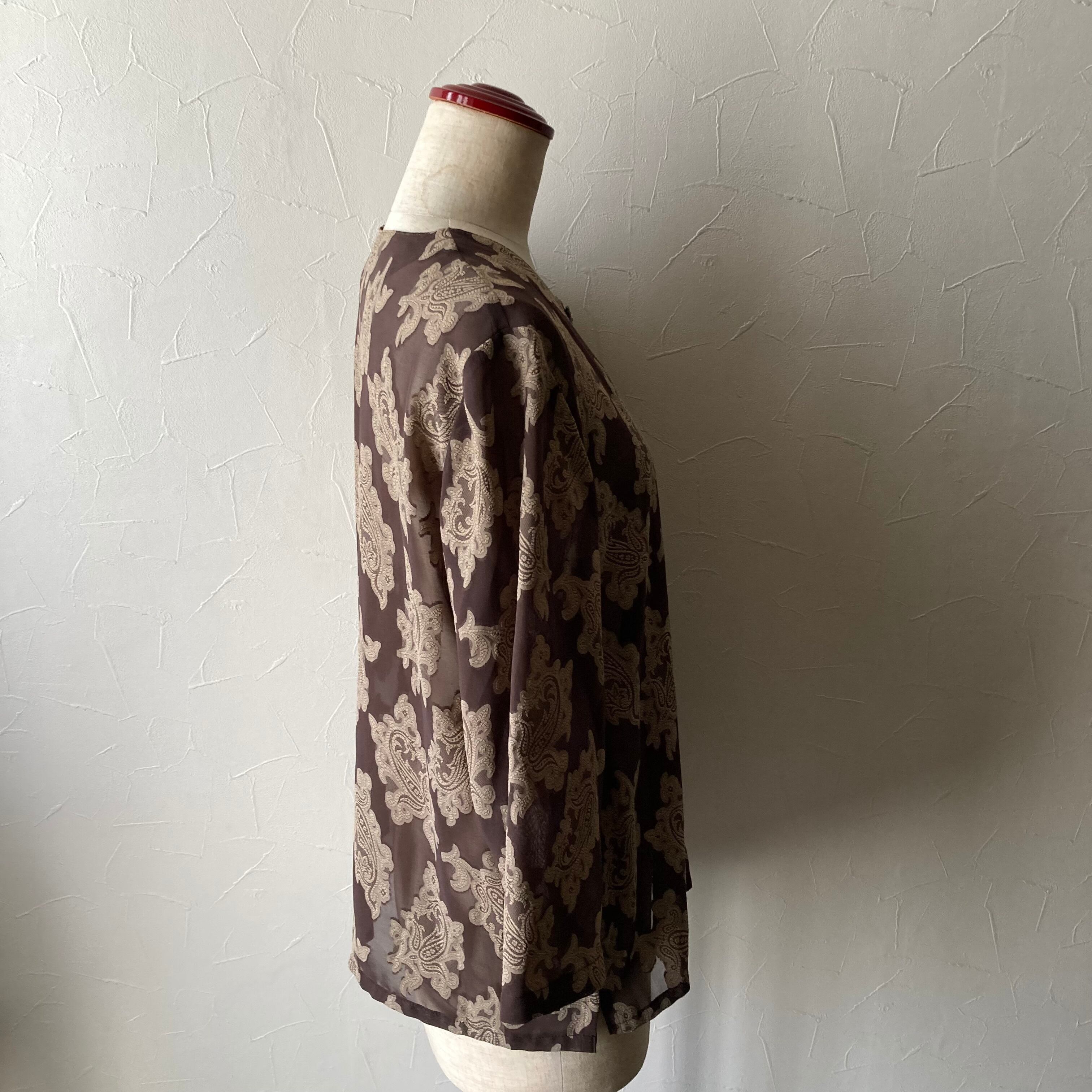 ブラウンのさりげない透け感とレトロな柄が素敵です。目を惹く魅力的な一枚です。