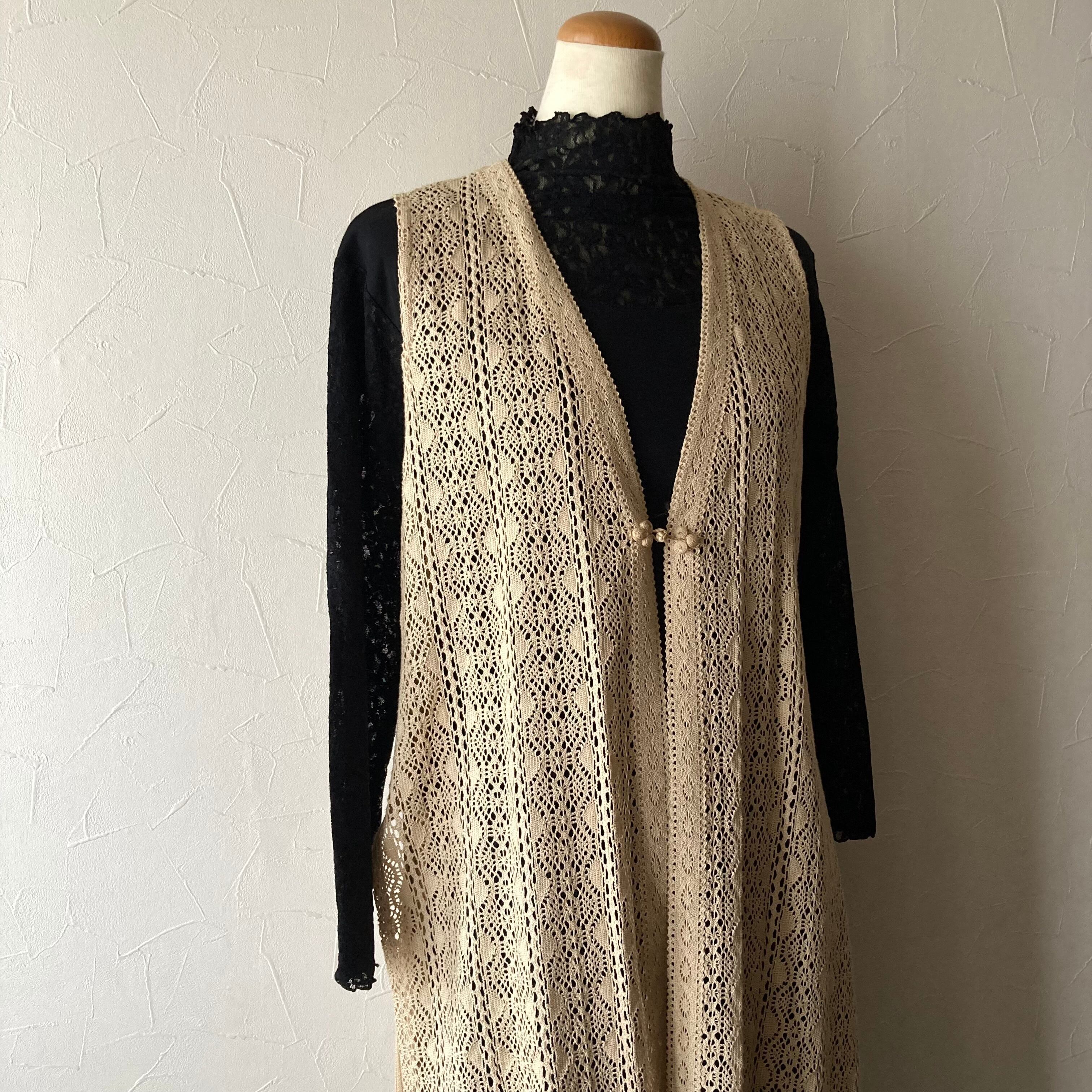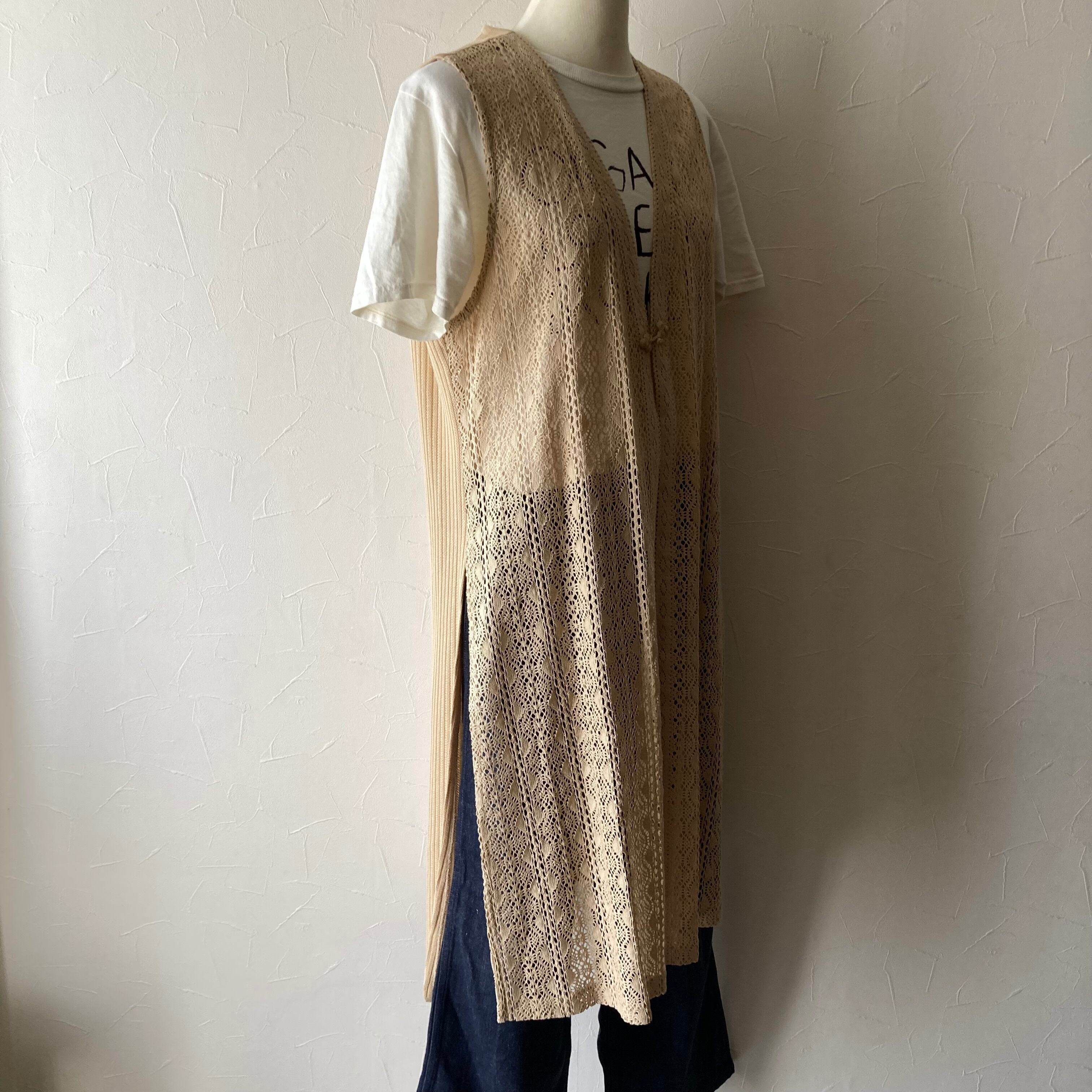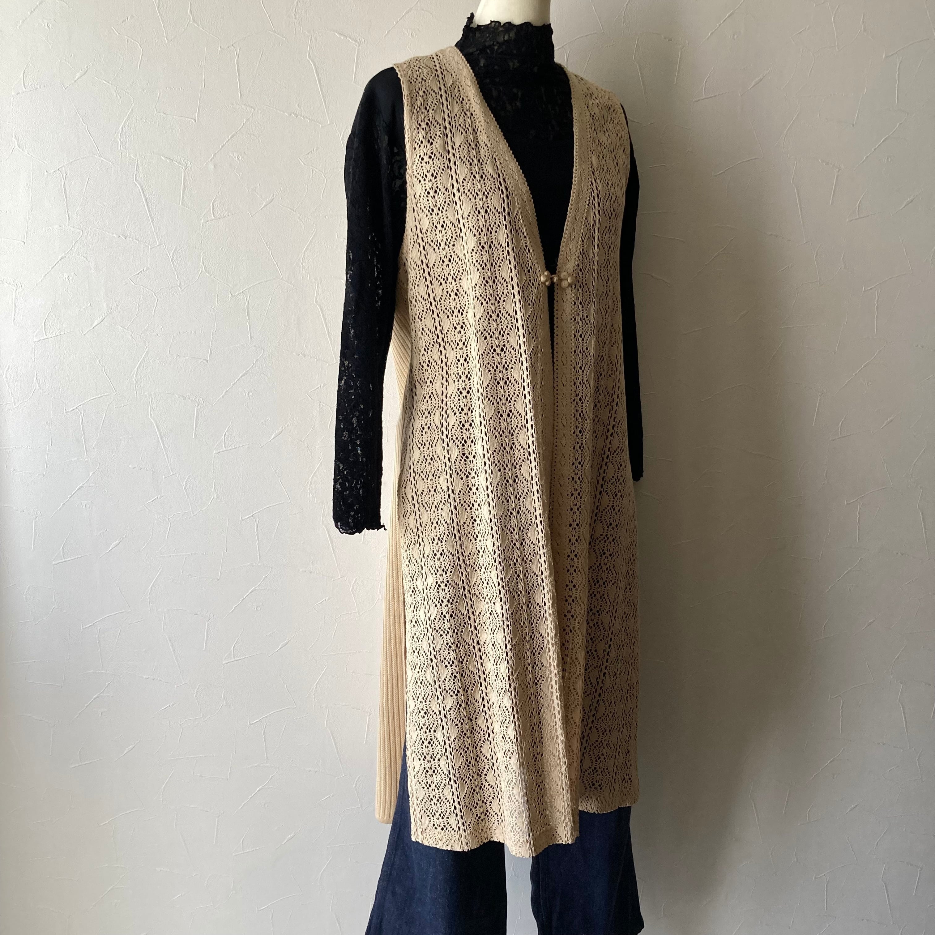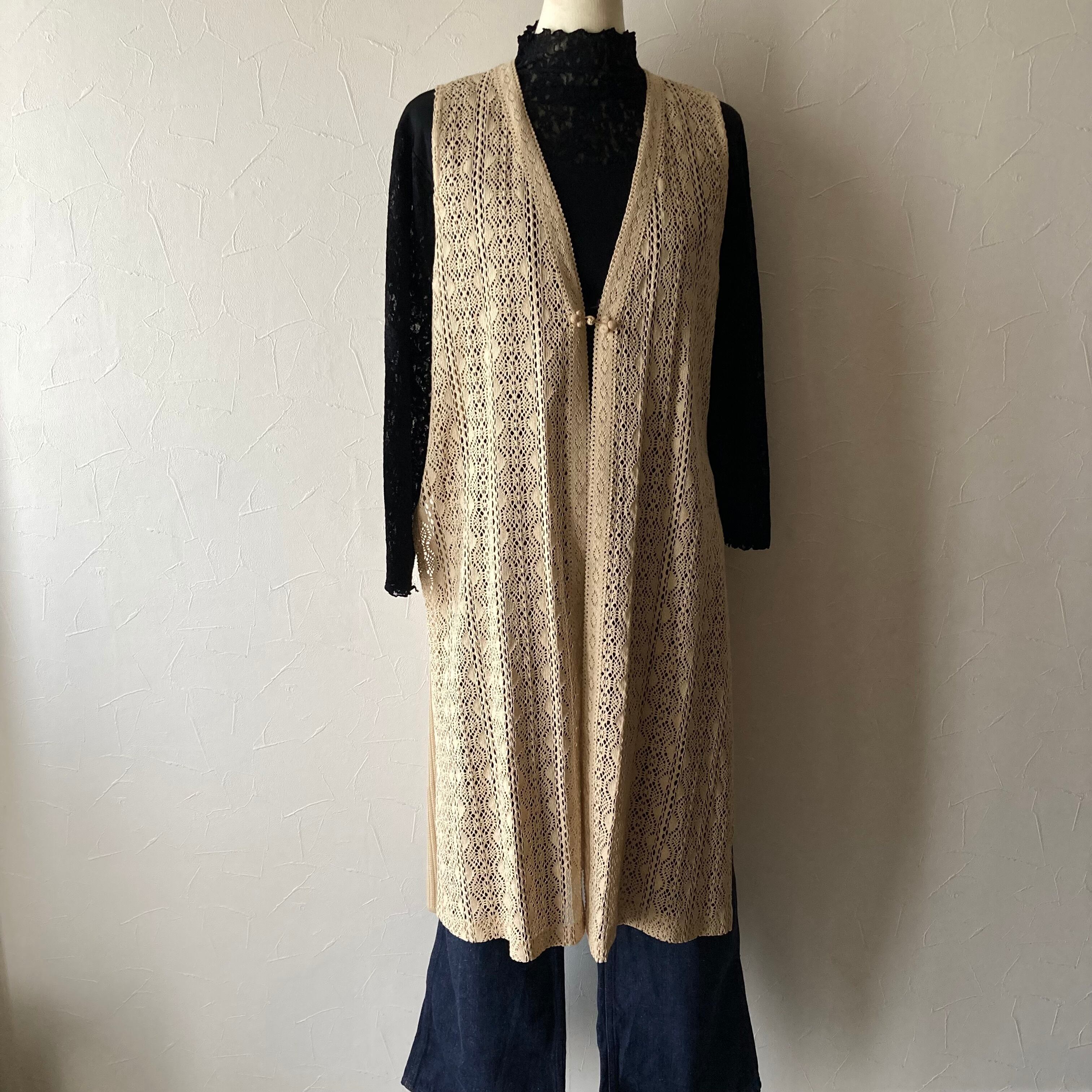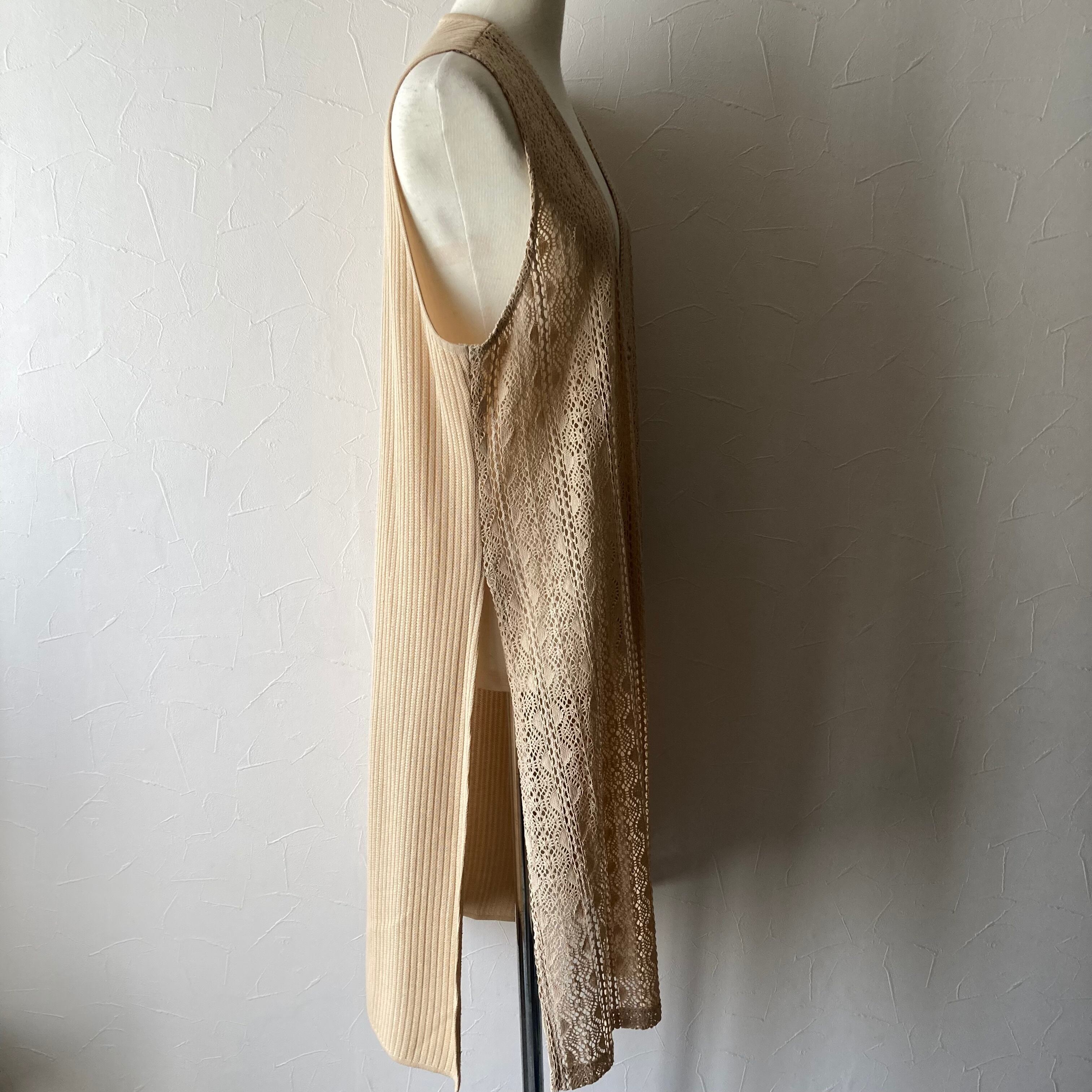 ナチュラルて合わせやすいベージュのレースロングベスト。前はレースで、後ろはリブニット素材。コットン混の生地が今の時期から秋まで着やすい一枚だと思います。
