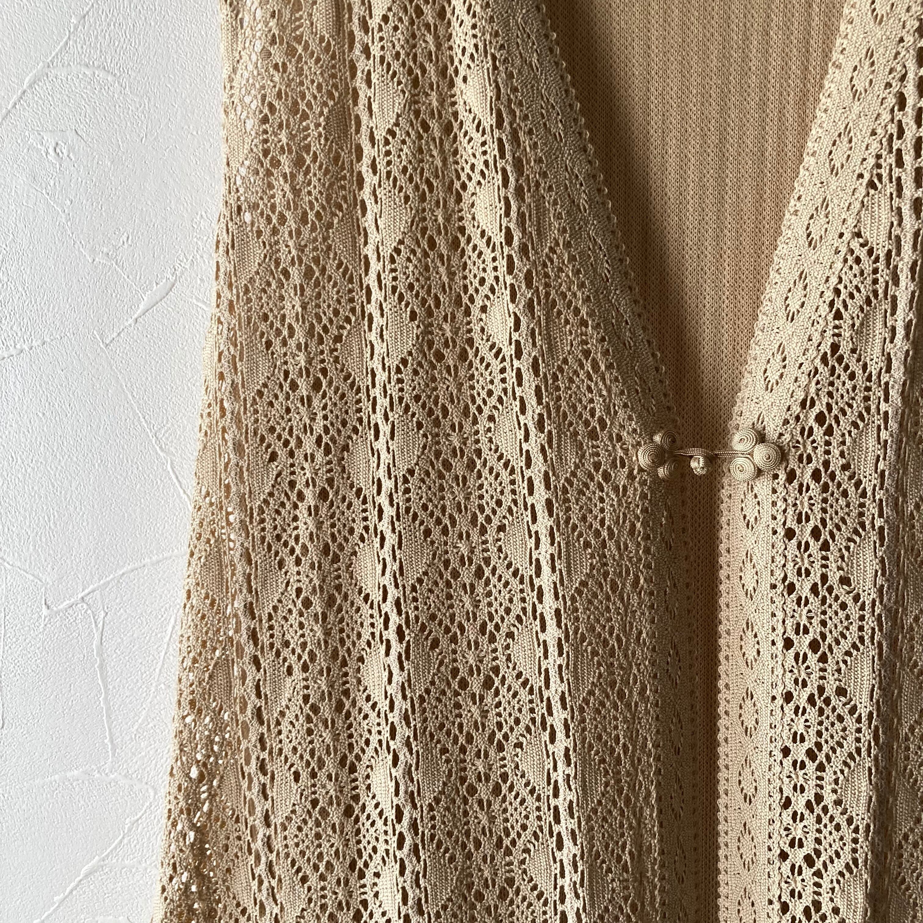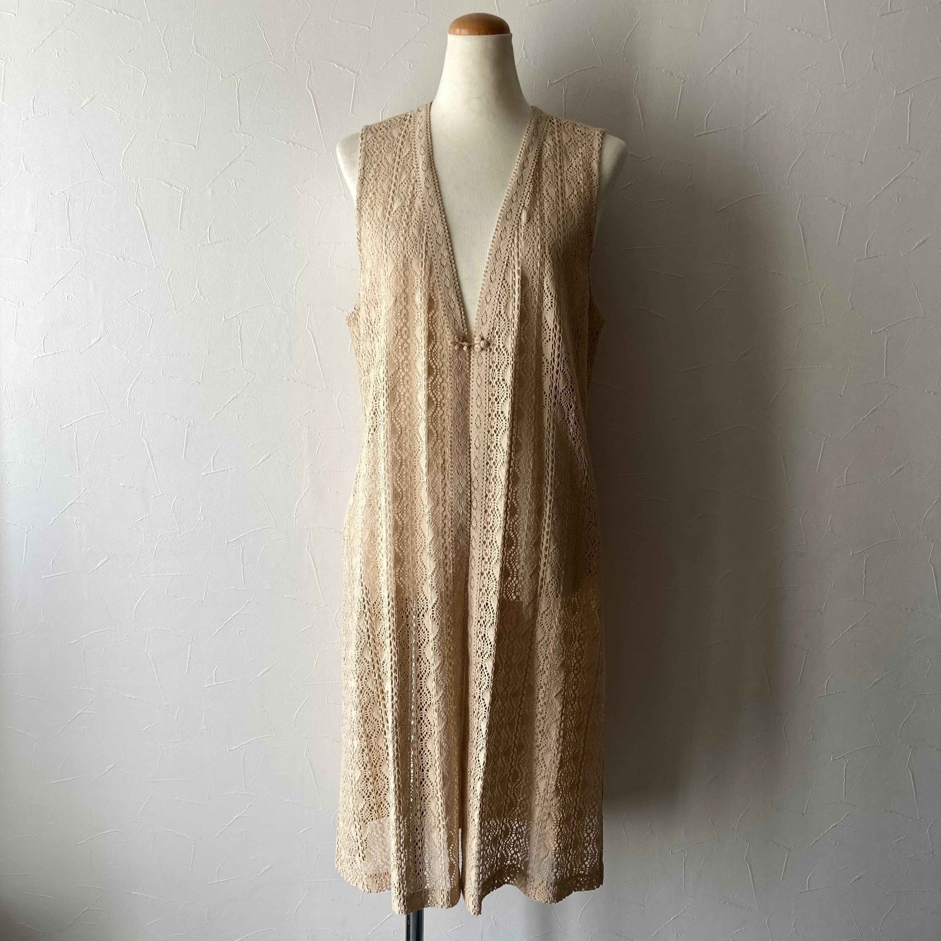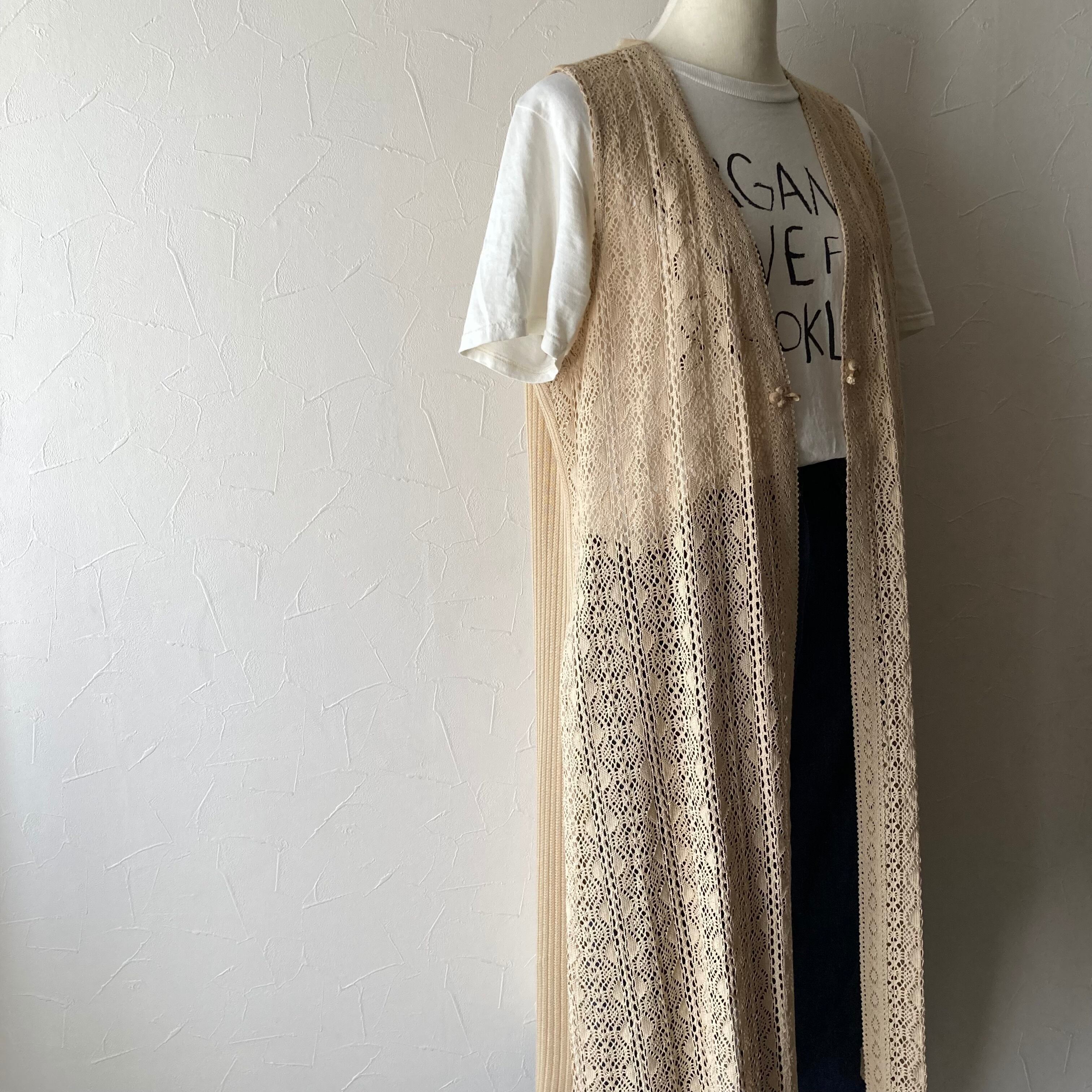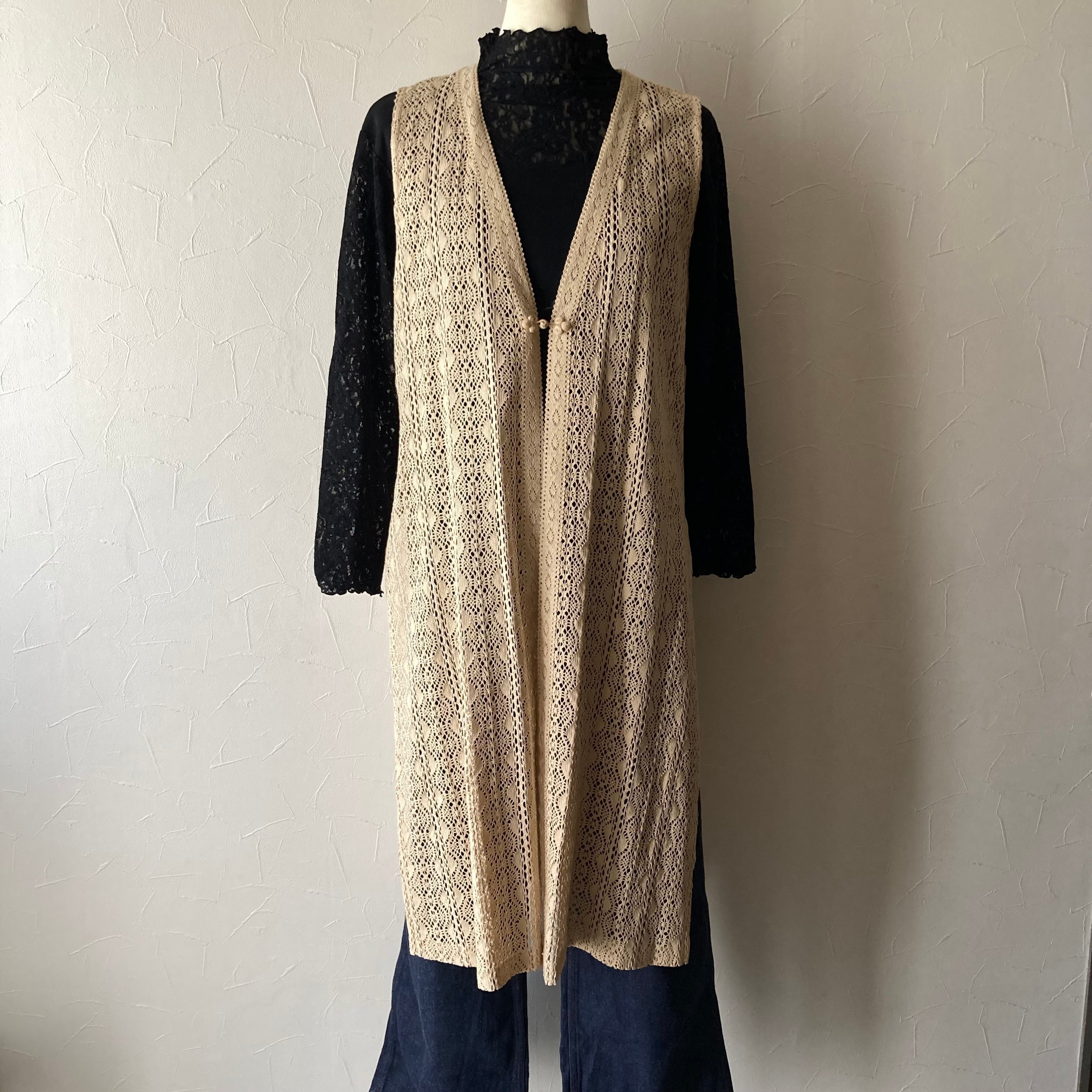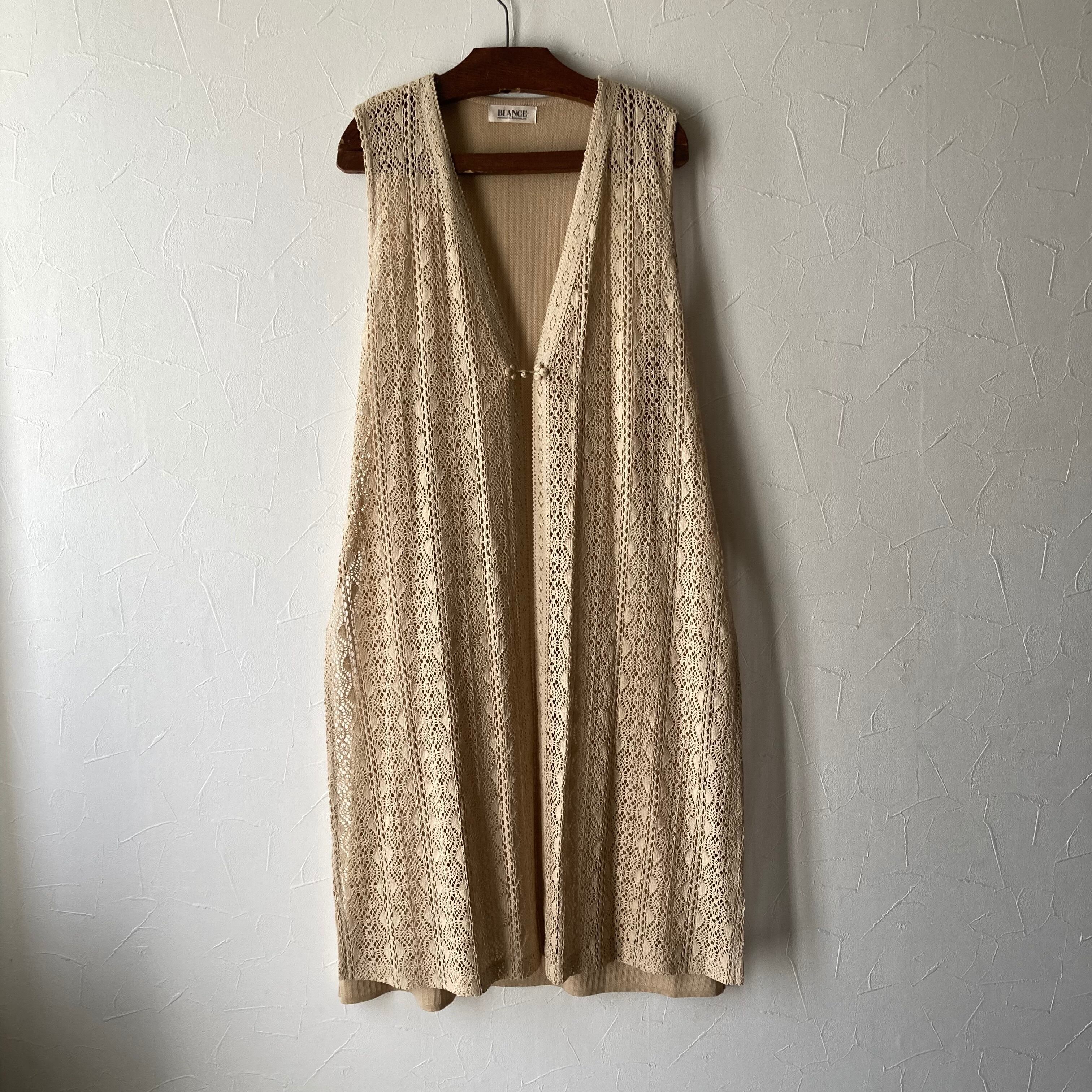 ナチュラルて合わせやすいベージュのレースロングベスト。前はレースで、後ろはリブニット素材。コットン混の生地が今の時期から秋まで着やすい一枚だと思います。