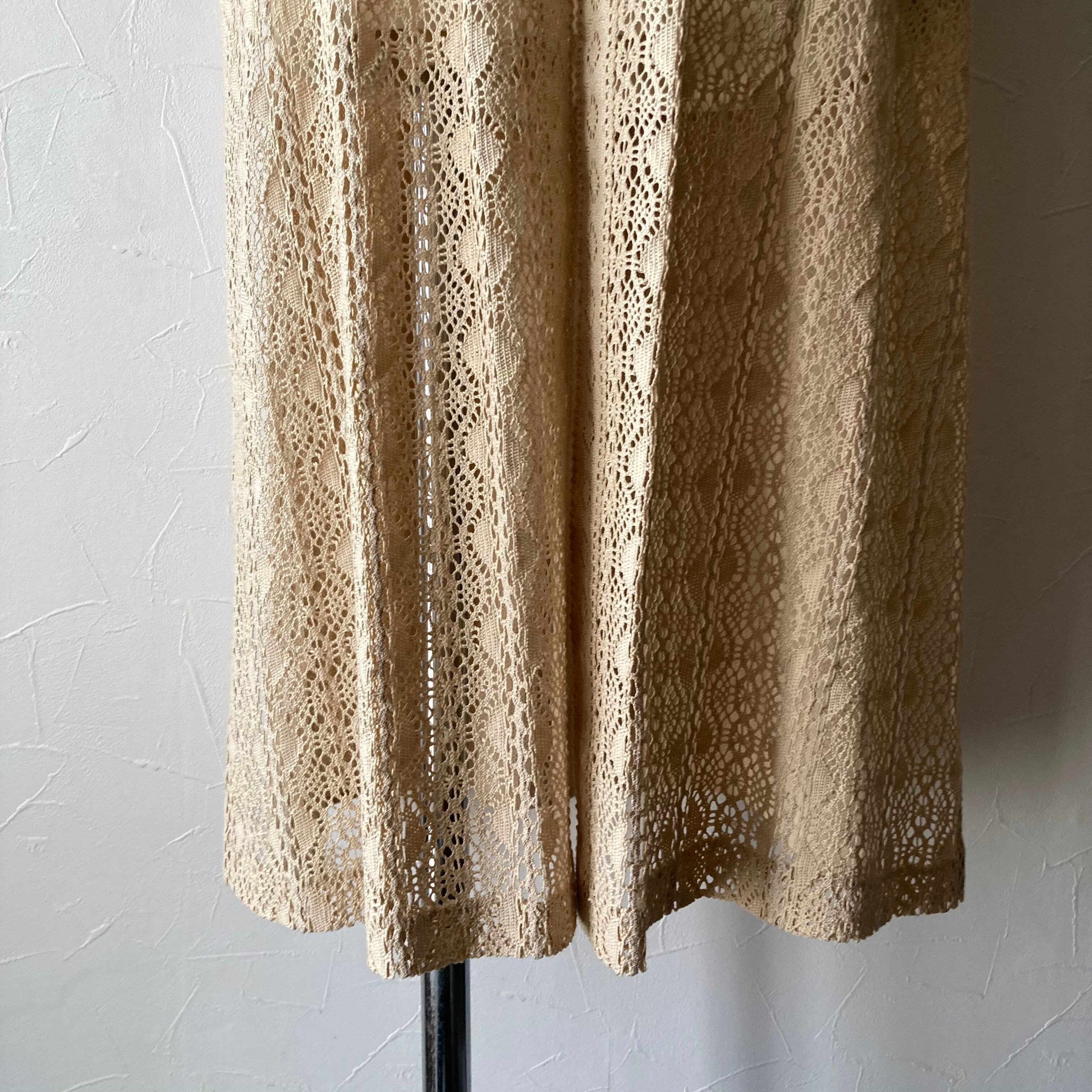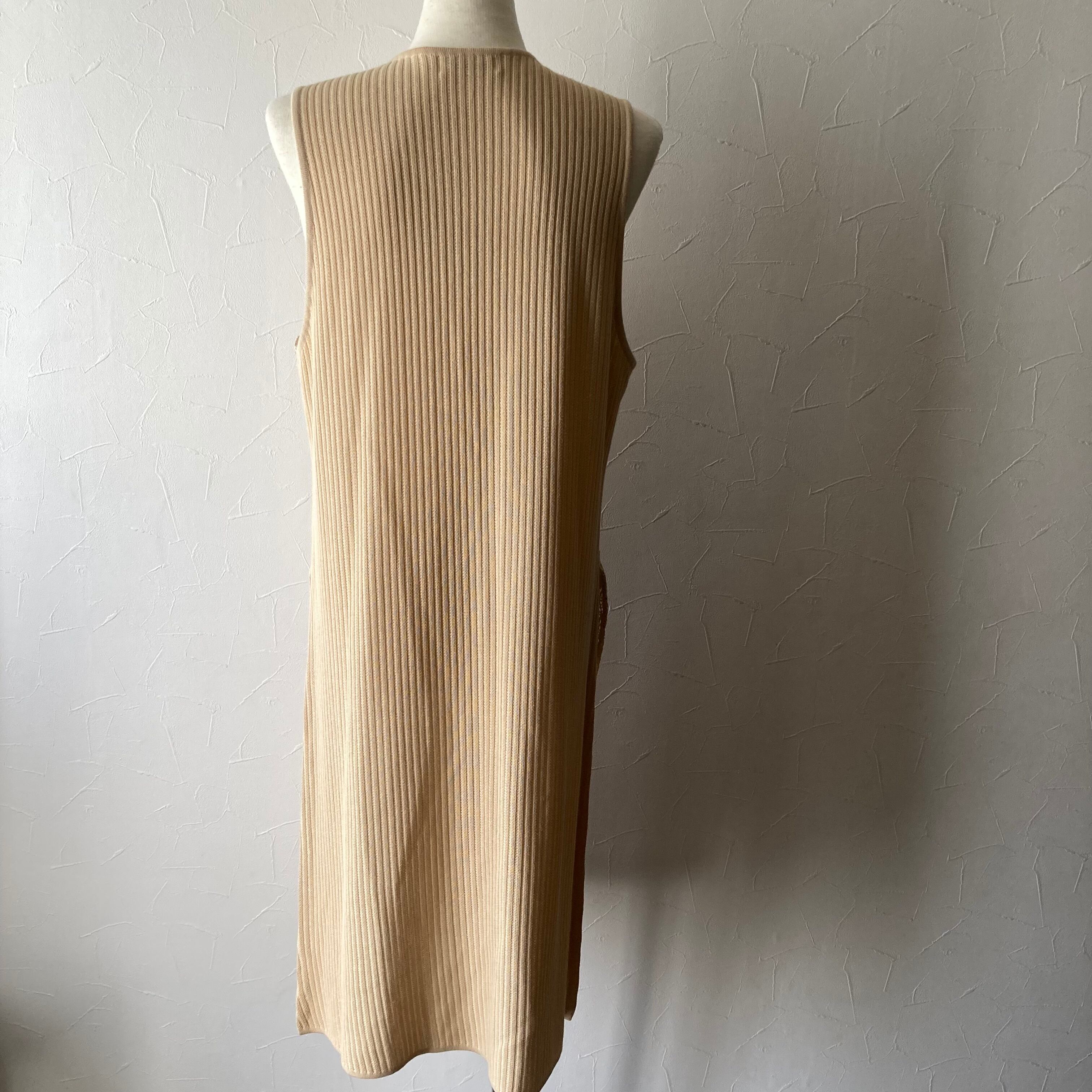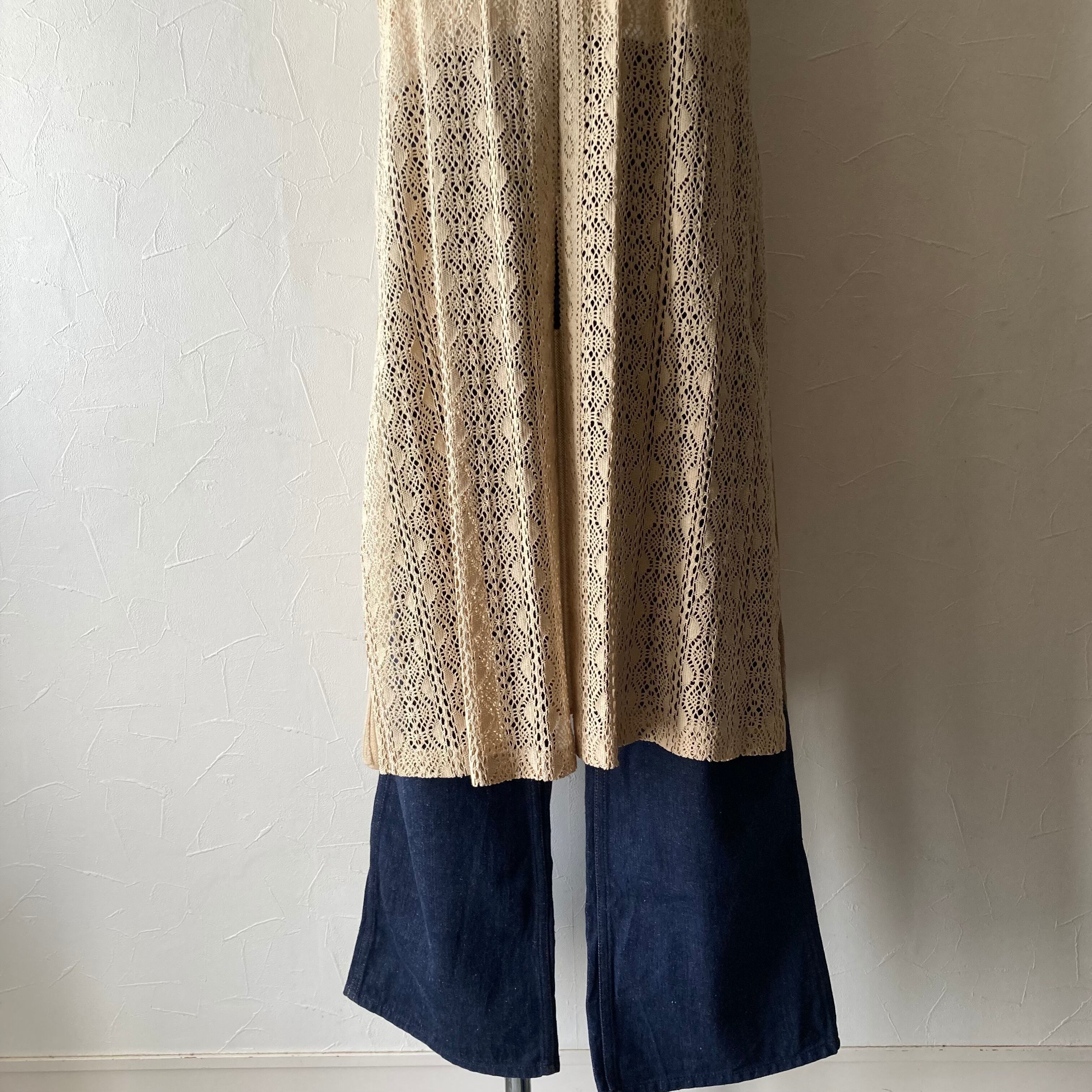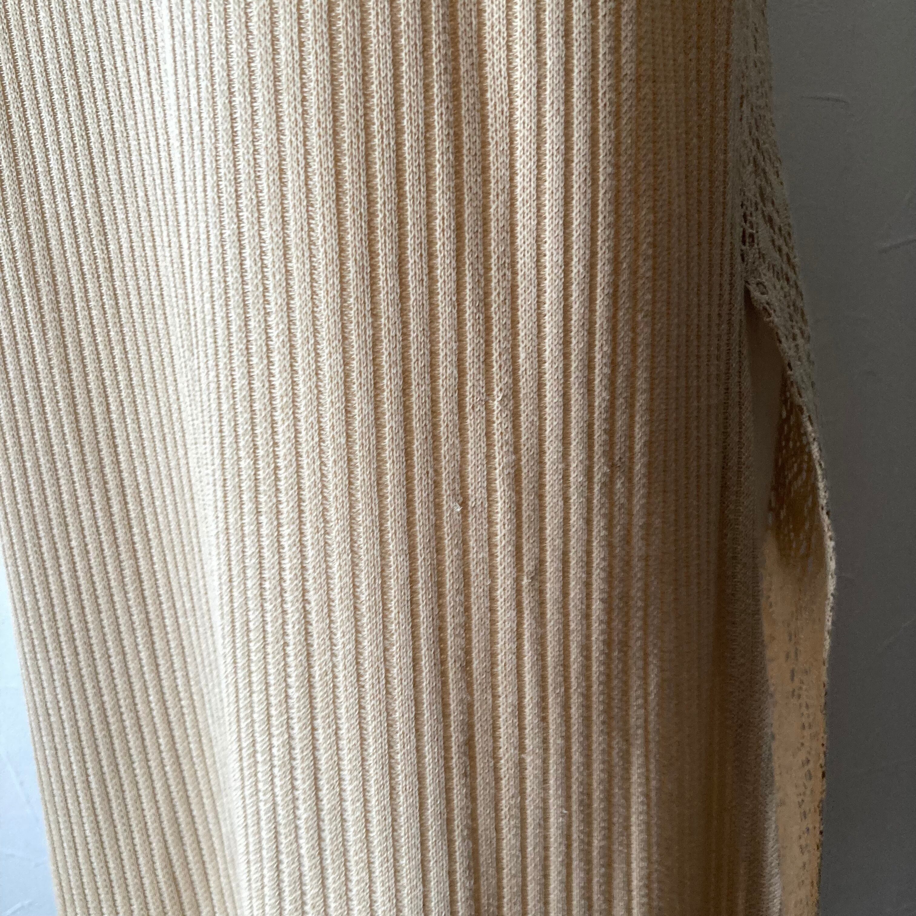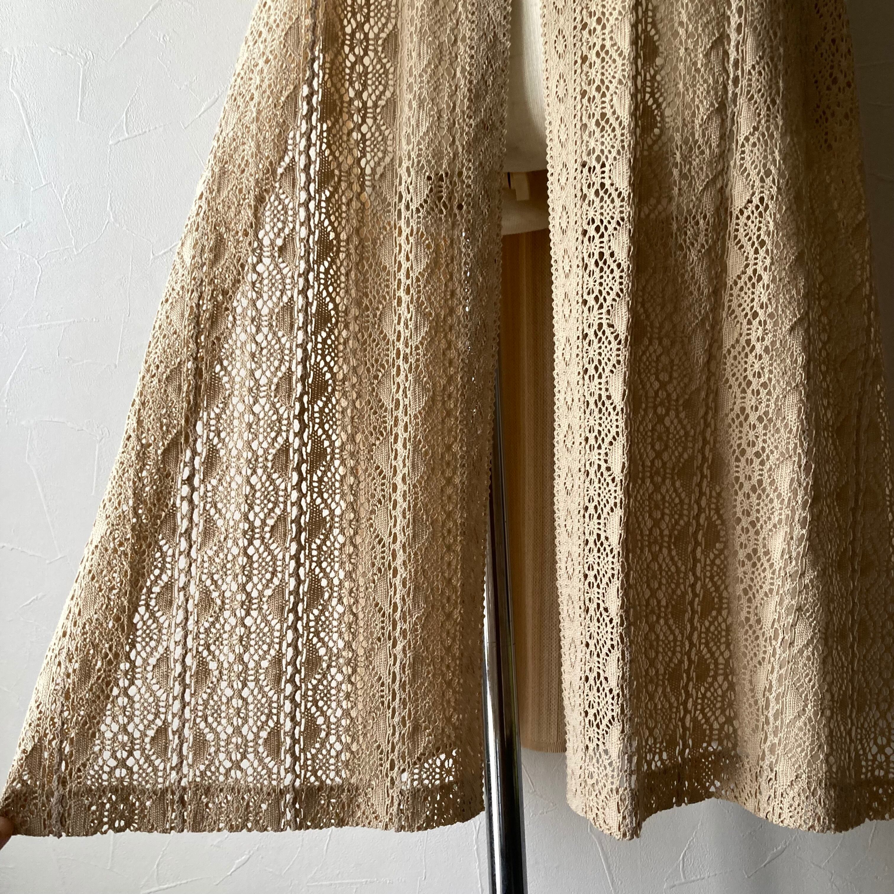 ナチュラルて合わせやすいベージュのレースロングベスト。前はレースで、後ろはリブニット素材。コットン混の生地が今の時期から秋まで着やすい一枚だと思います。