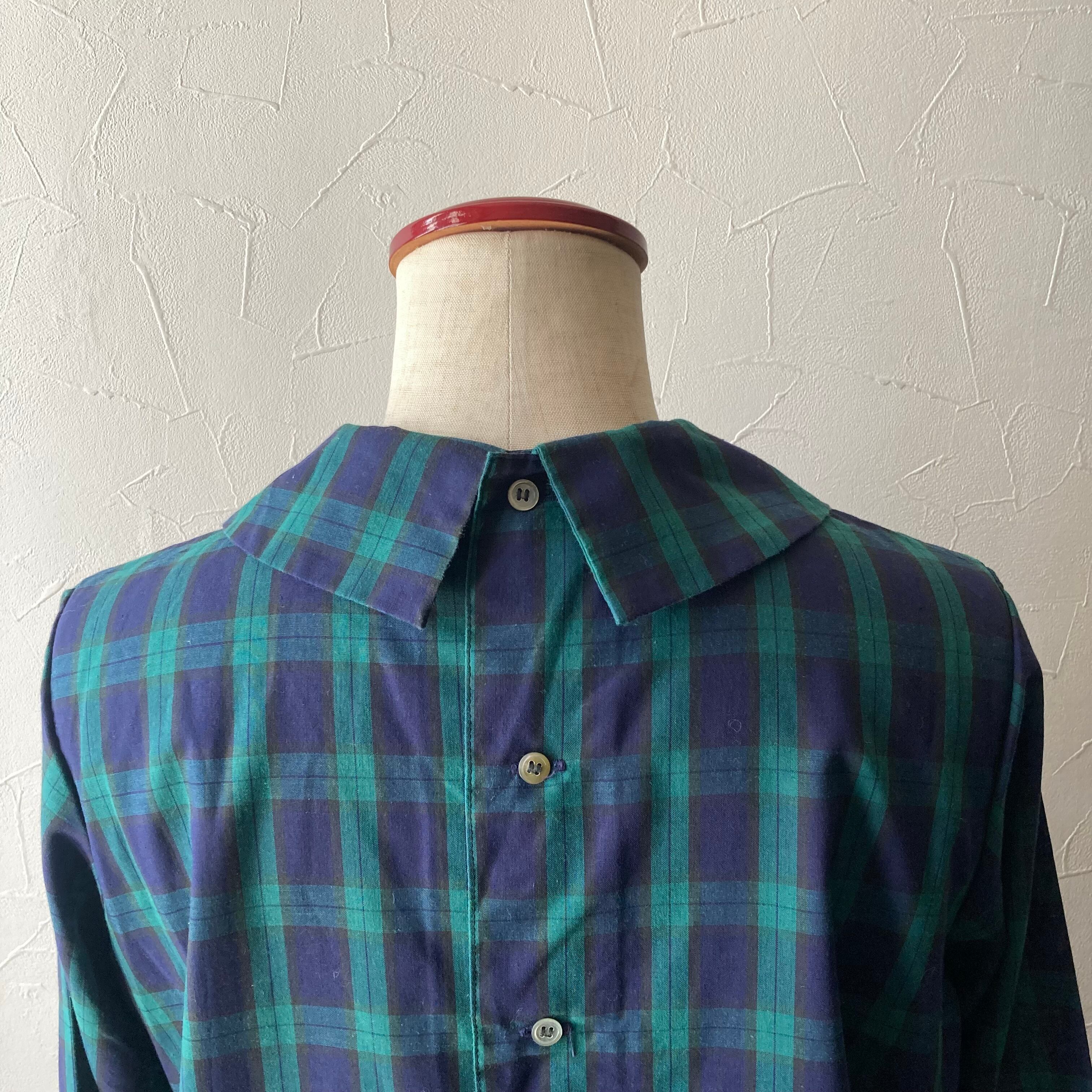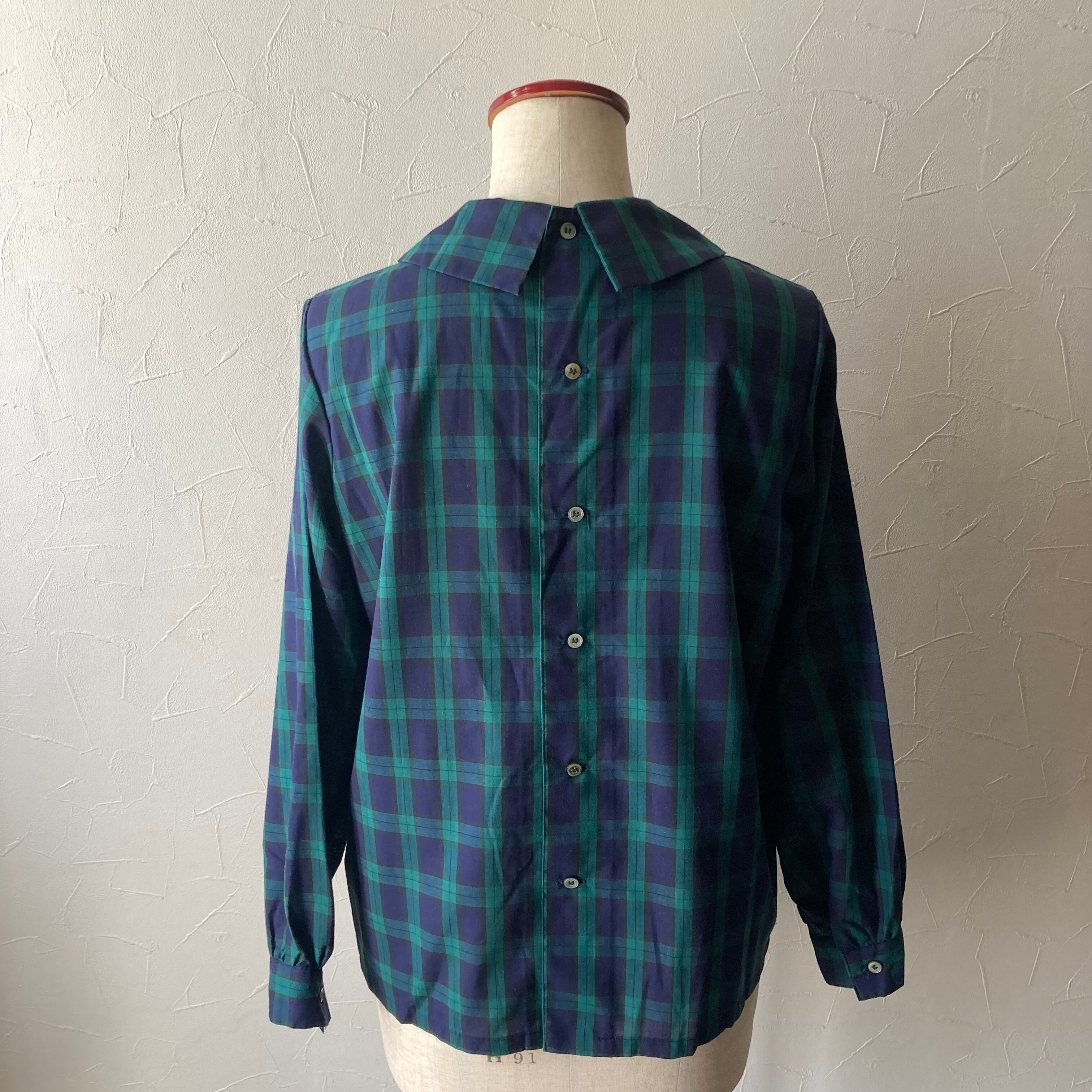 トラディショナルな色合いのタータンチェックの後ろボタンのブラウス。