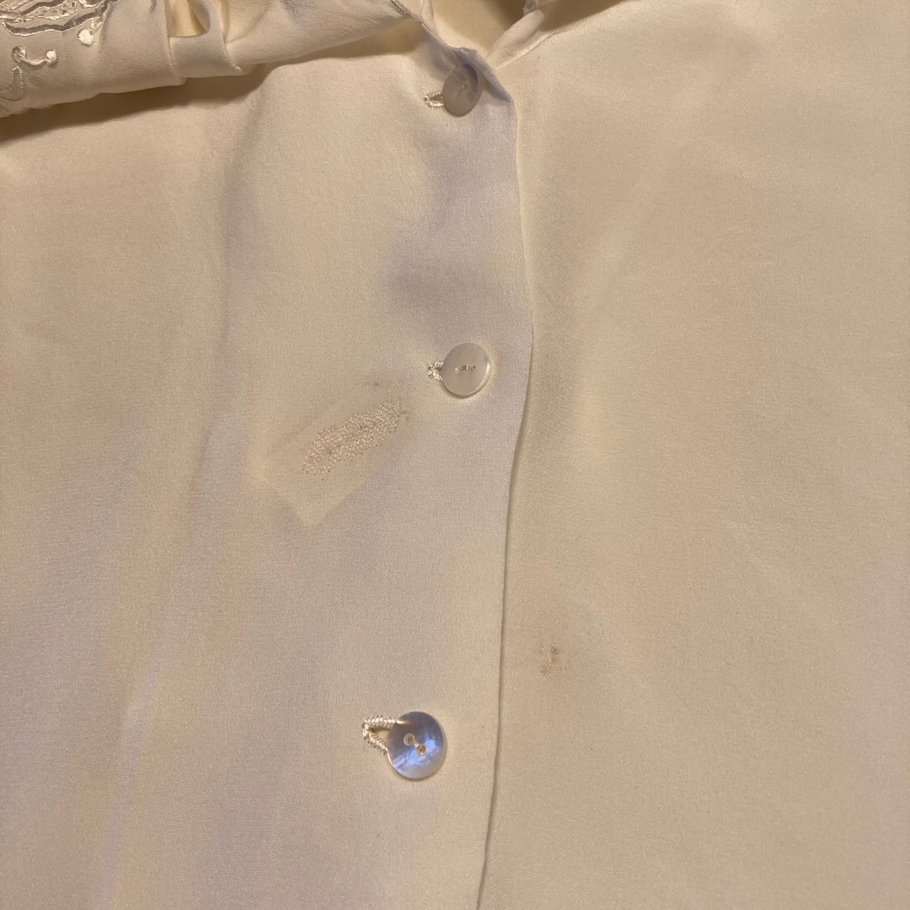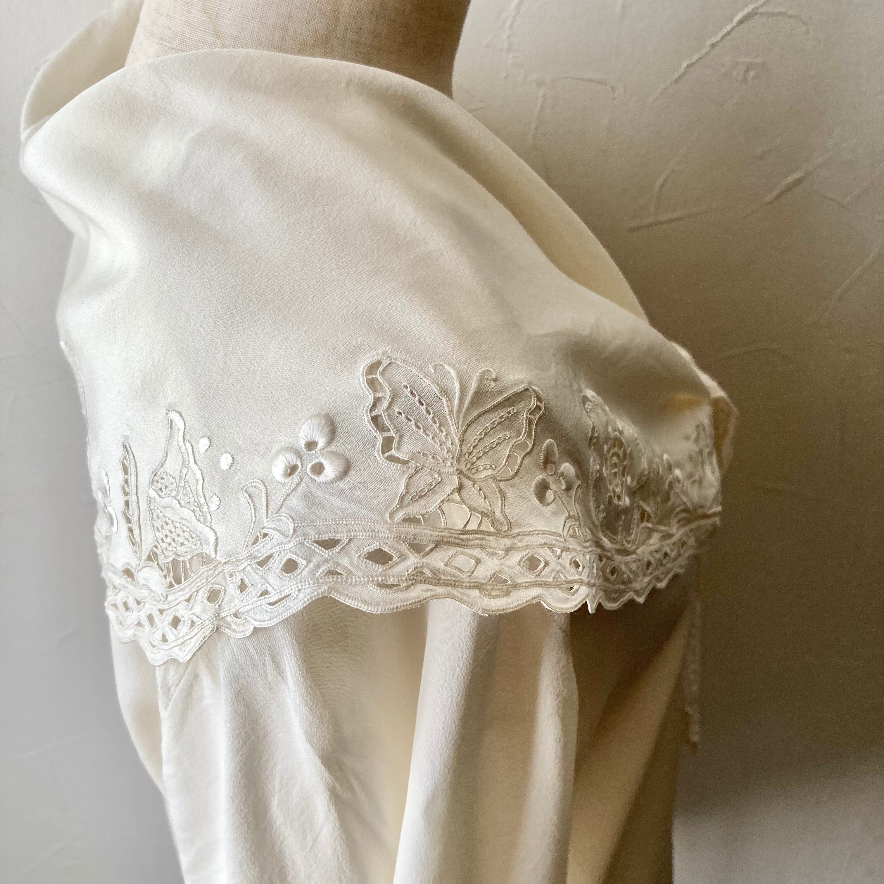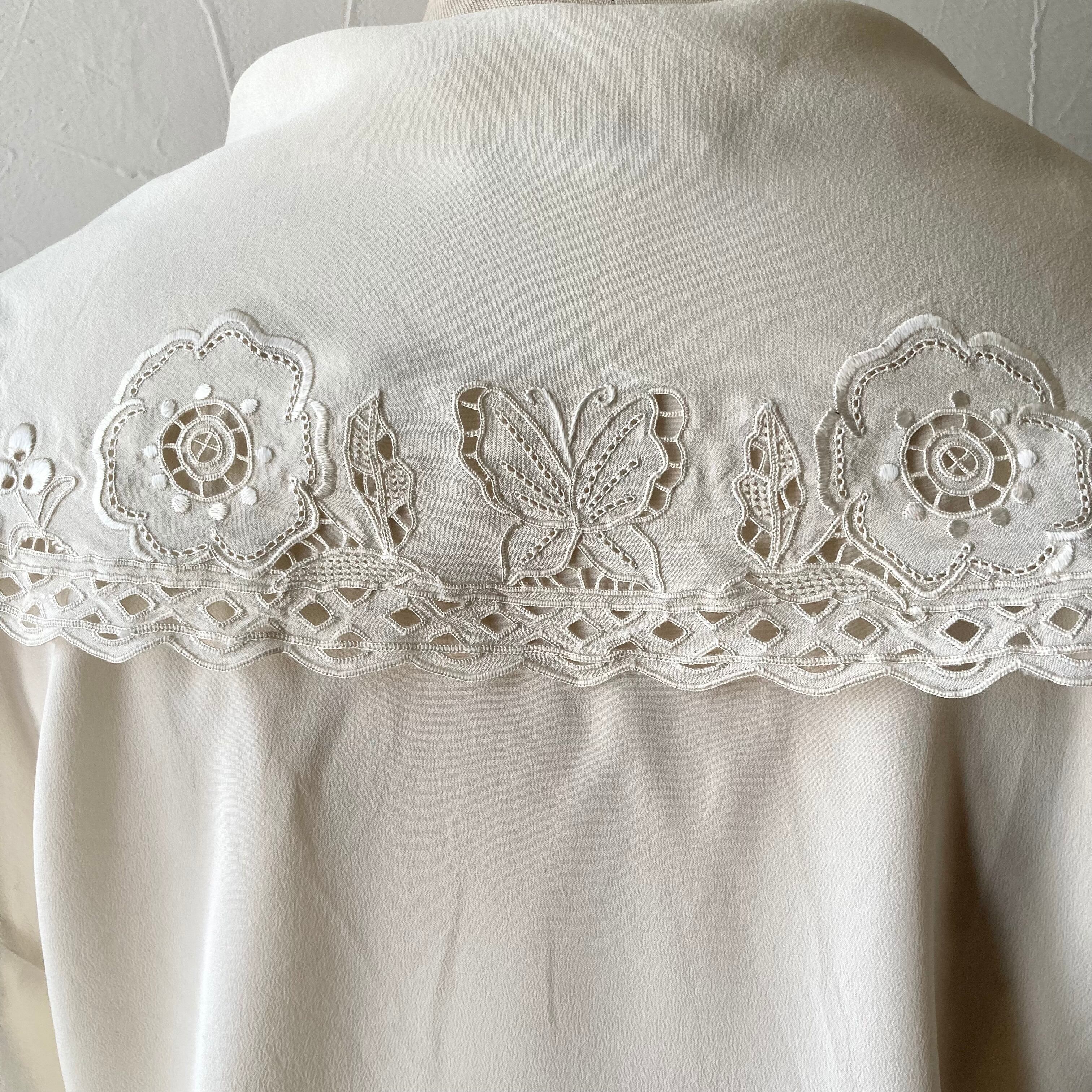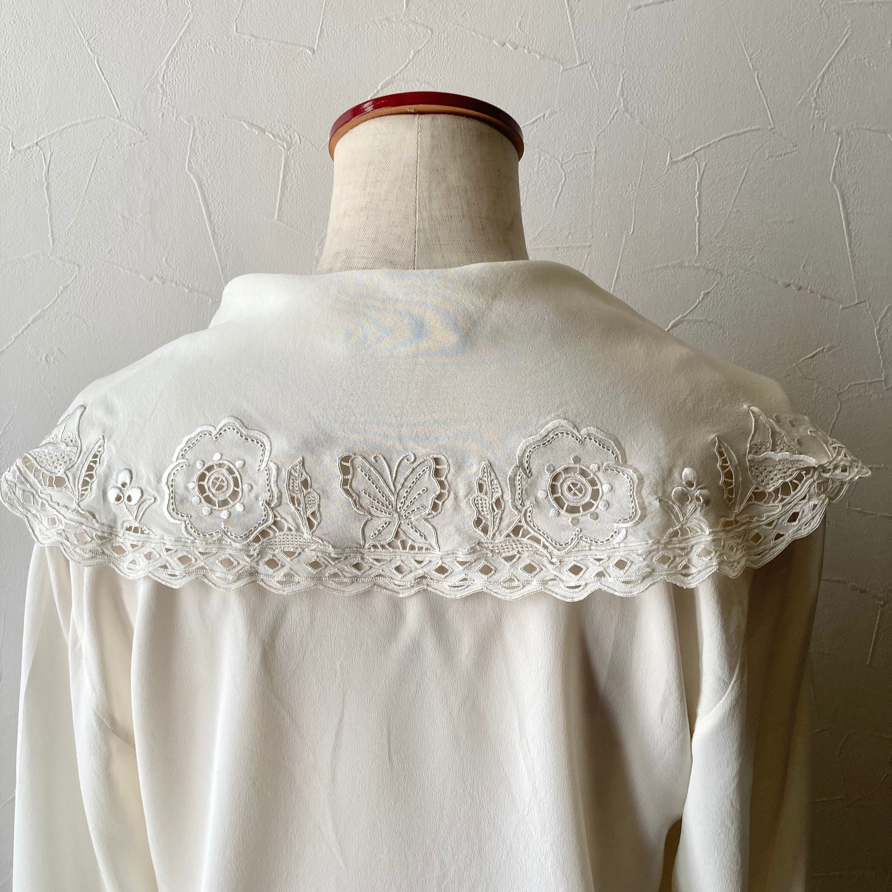 大きな襟の花と蝶々のカットワーク刺繍がとっても素敵なHANAE MORIのブラウス。