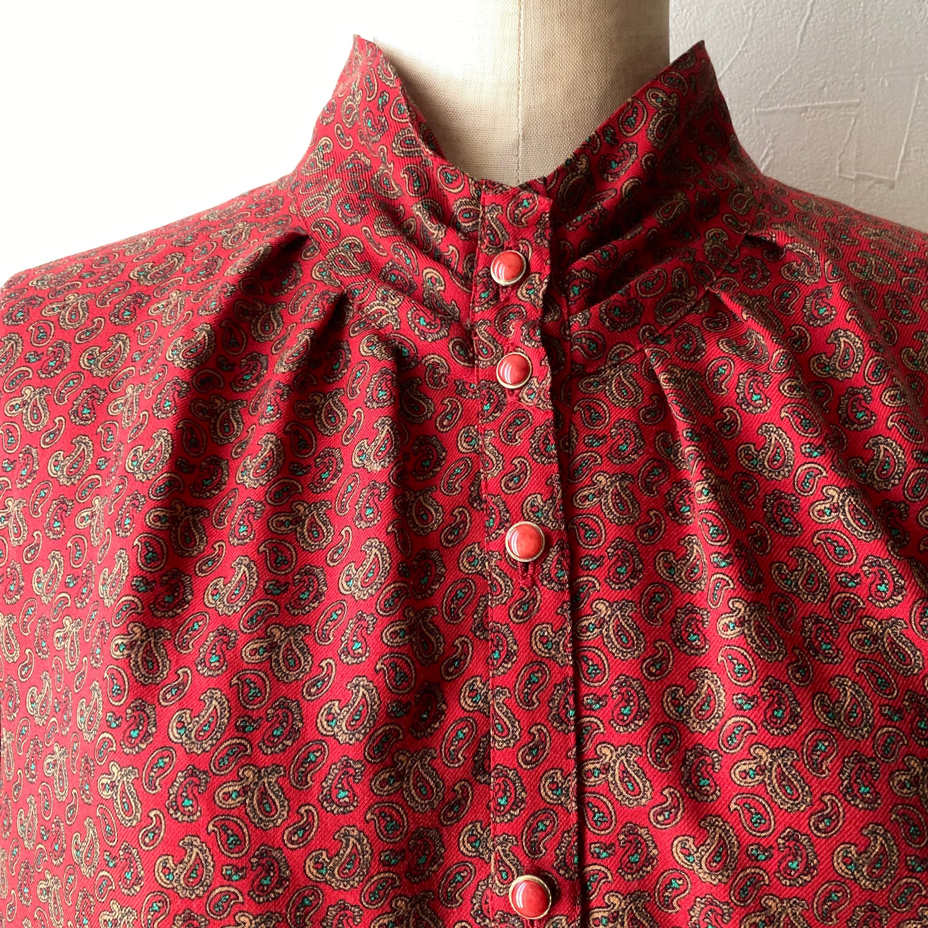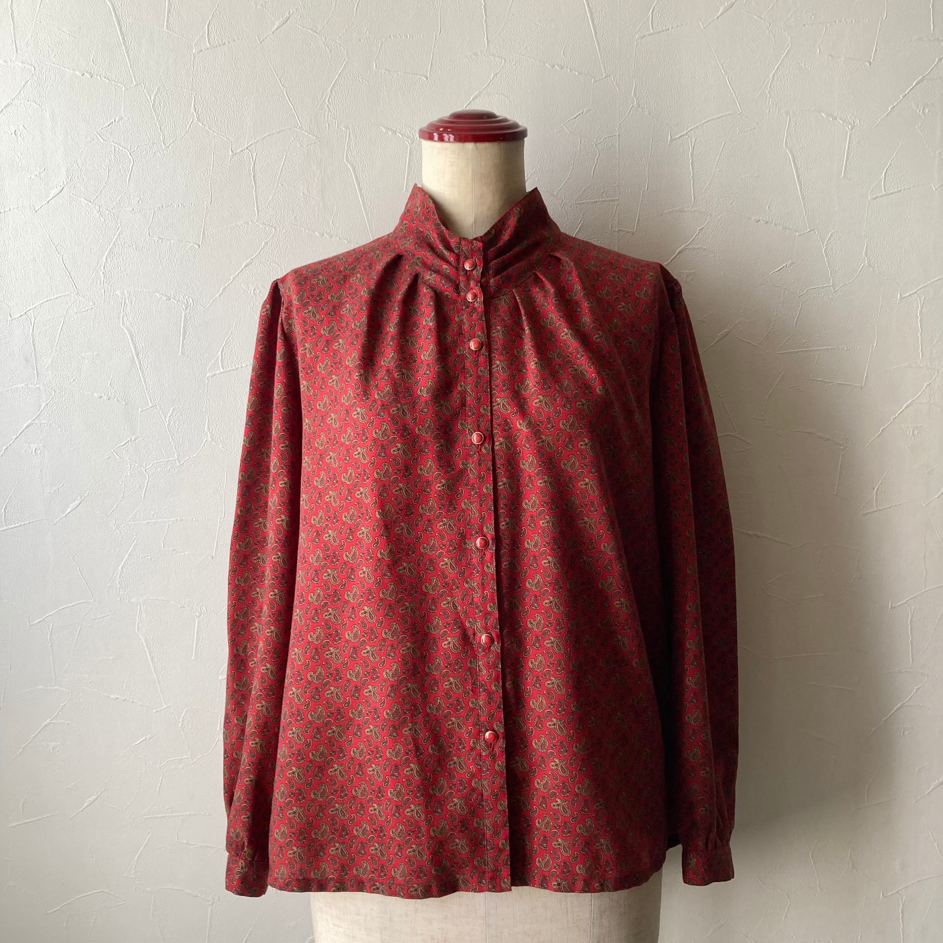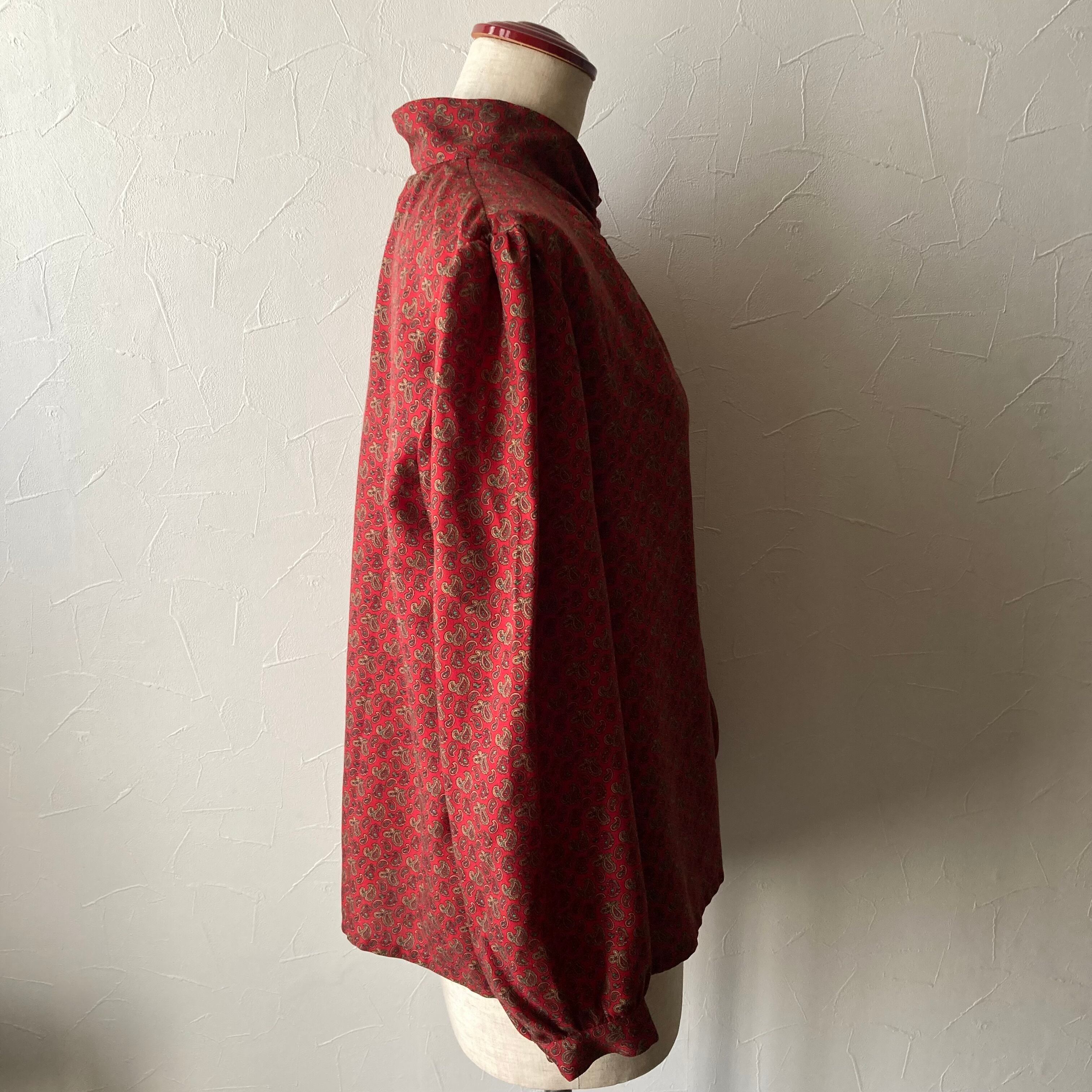 落ち着いたら赤色に小さなペイズリー何のブラウス。パフスリーブでレトロな雰囲気。黒や茶色などダークなボトムと合わせて秋に活躍してくれそうな一枚です。