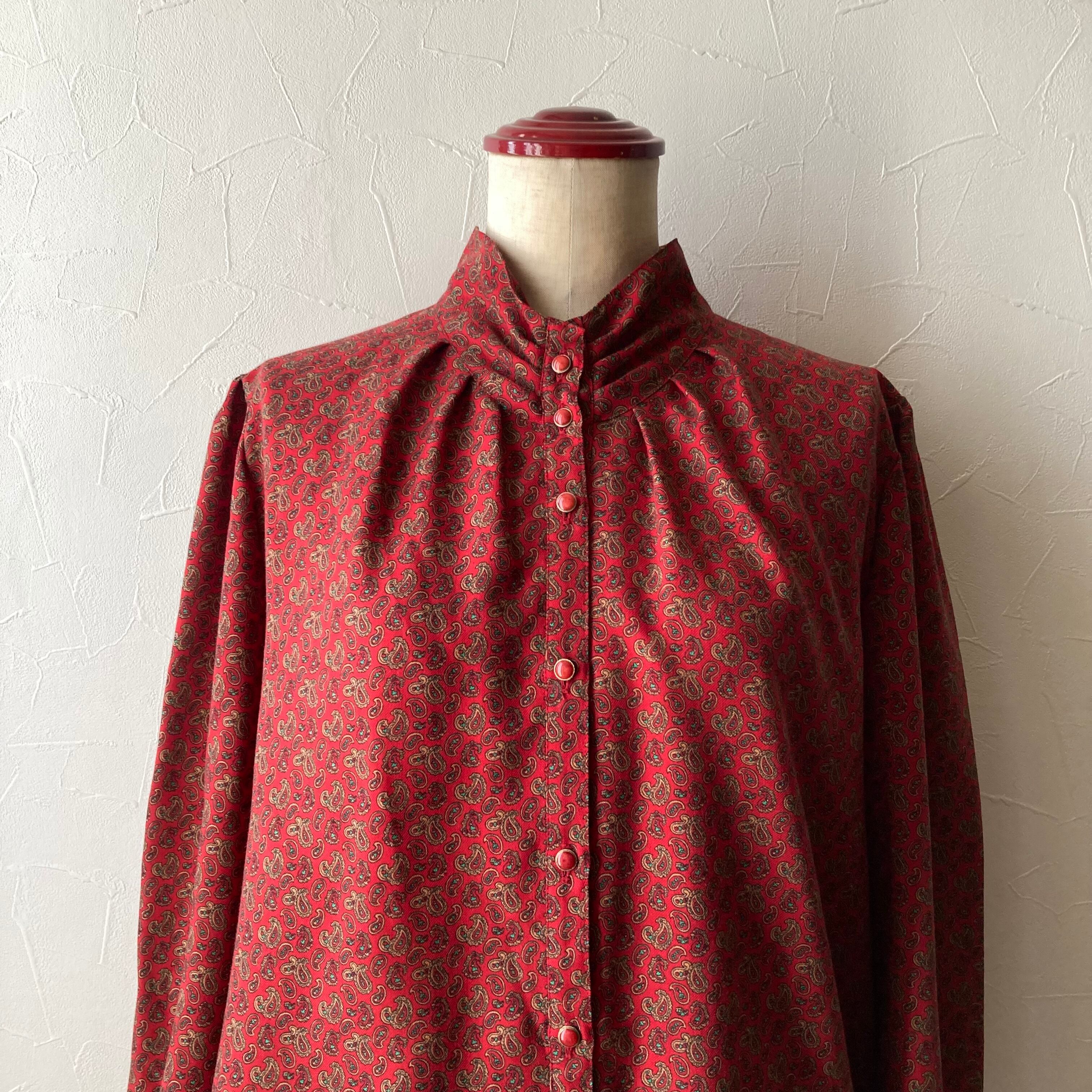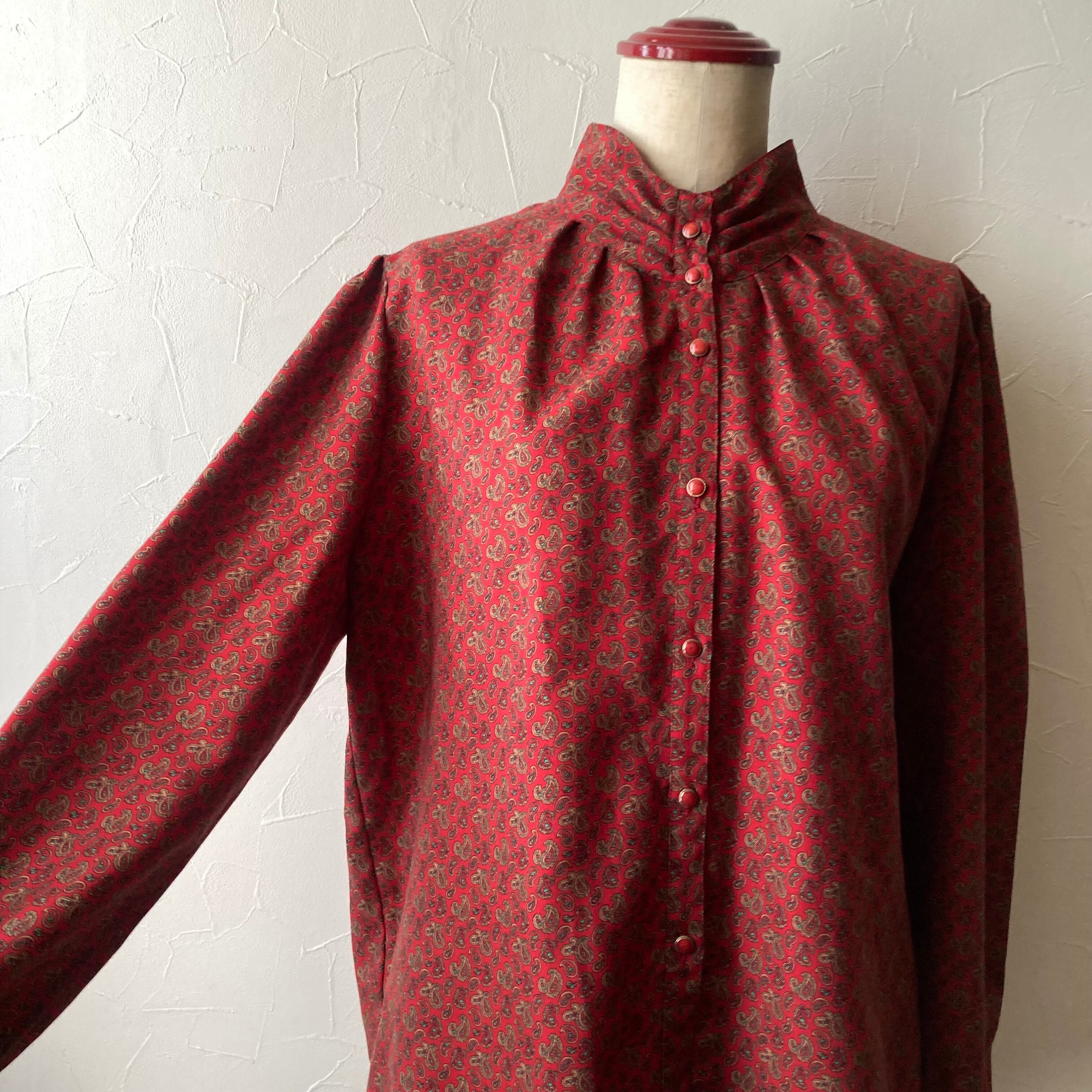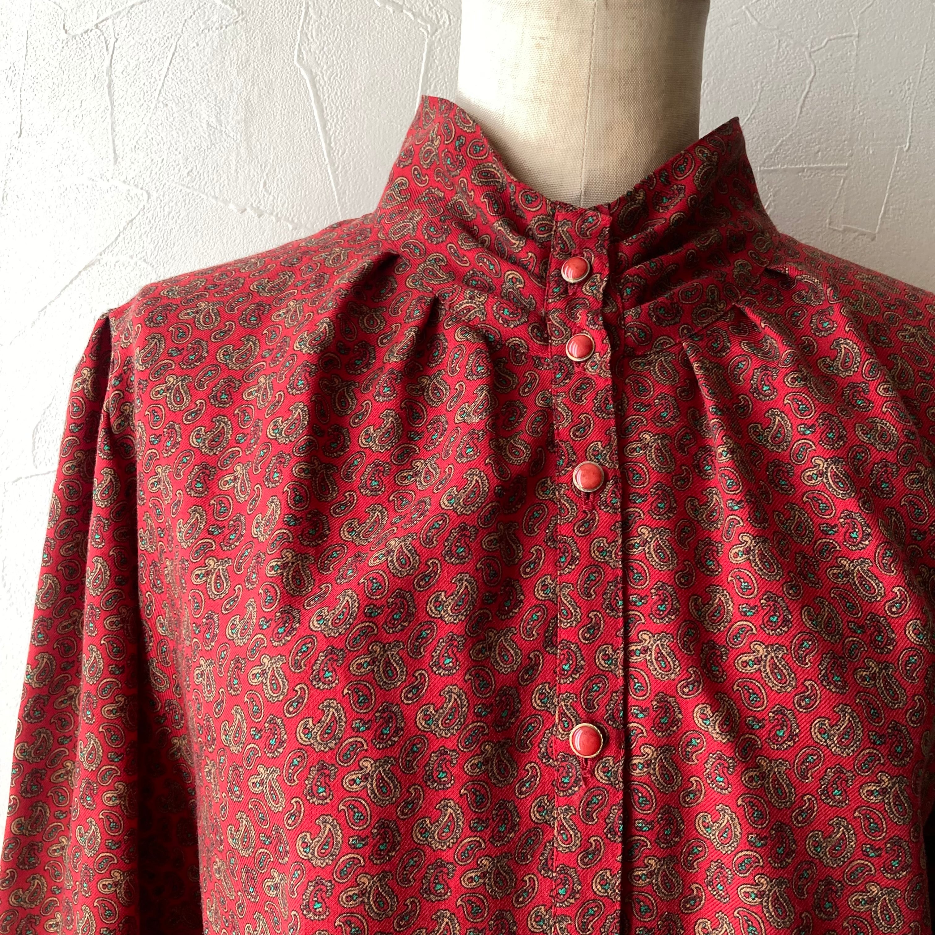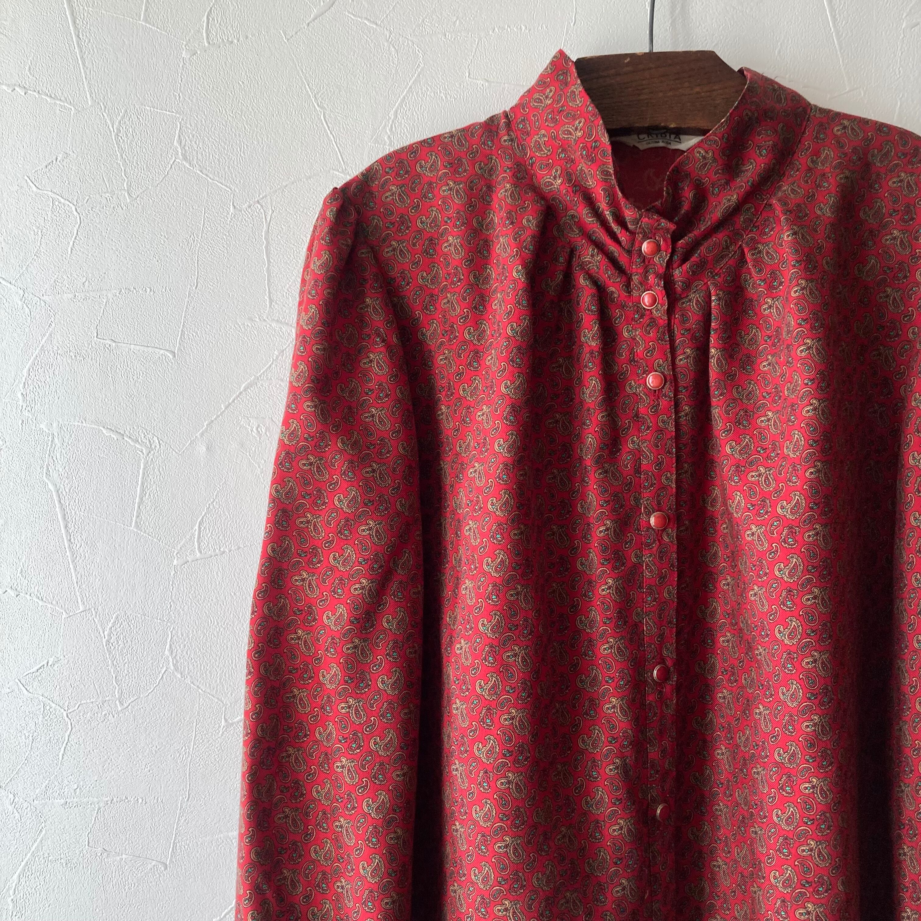 落ち着いたら赤色に小さなペイズリー何のブラウス。パフスリーブでレトロな雰囲気。黒や茶色などダークなボトムと合わせて秋に活躍してくれそうな一枚です。