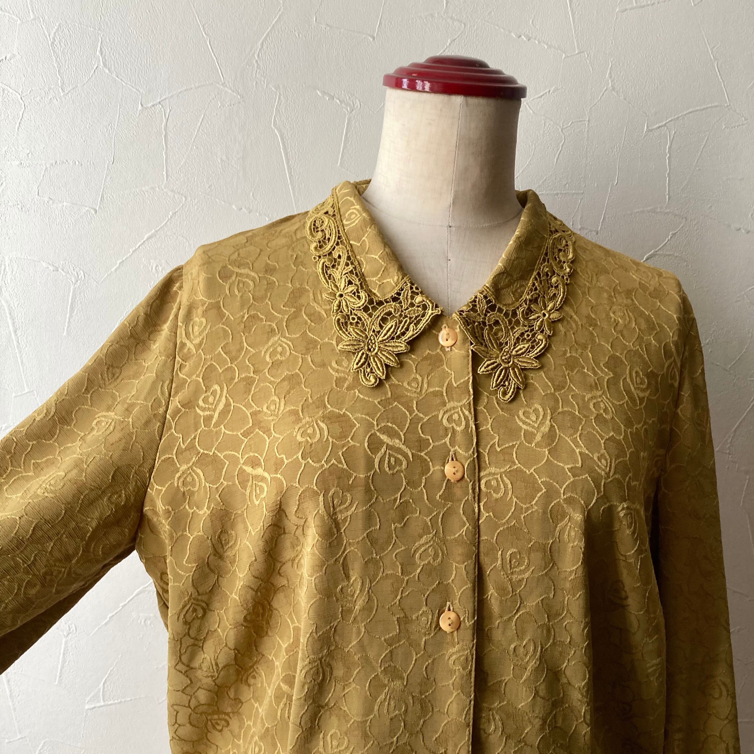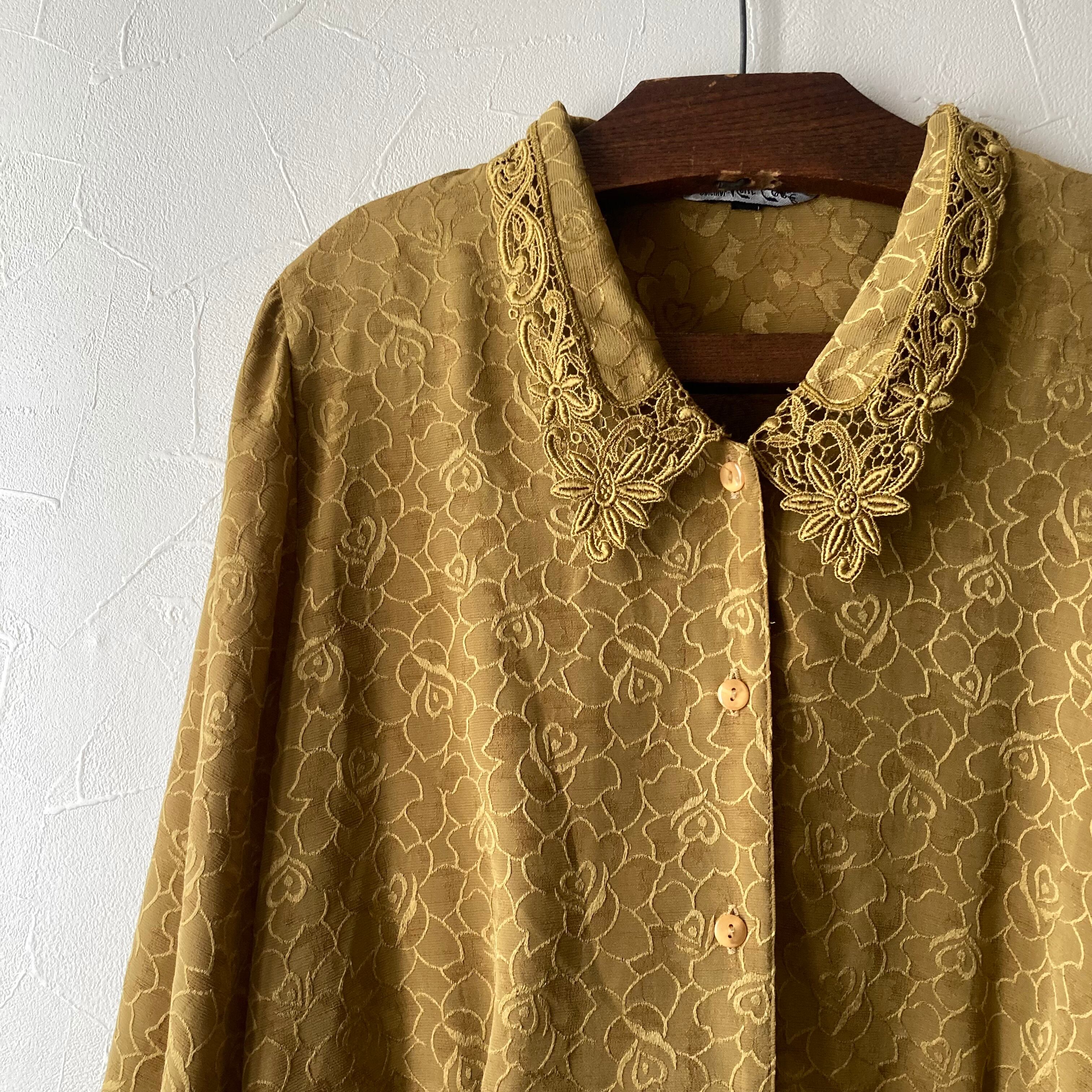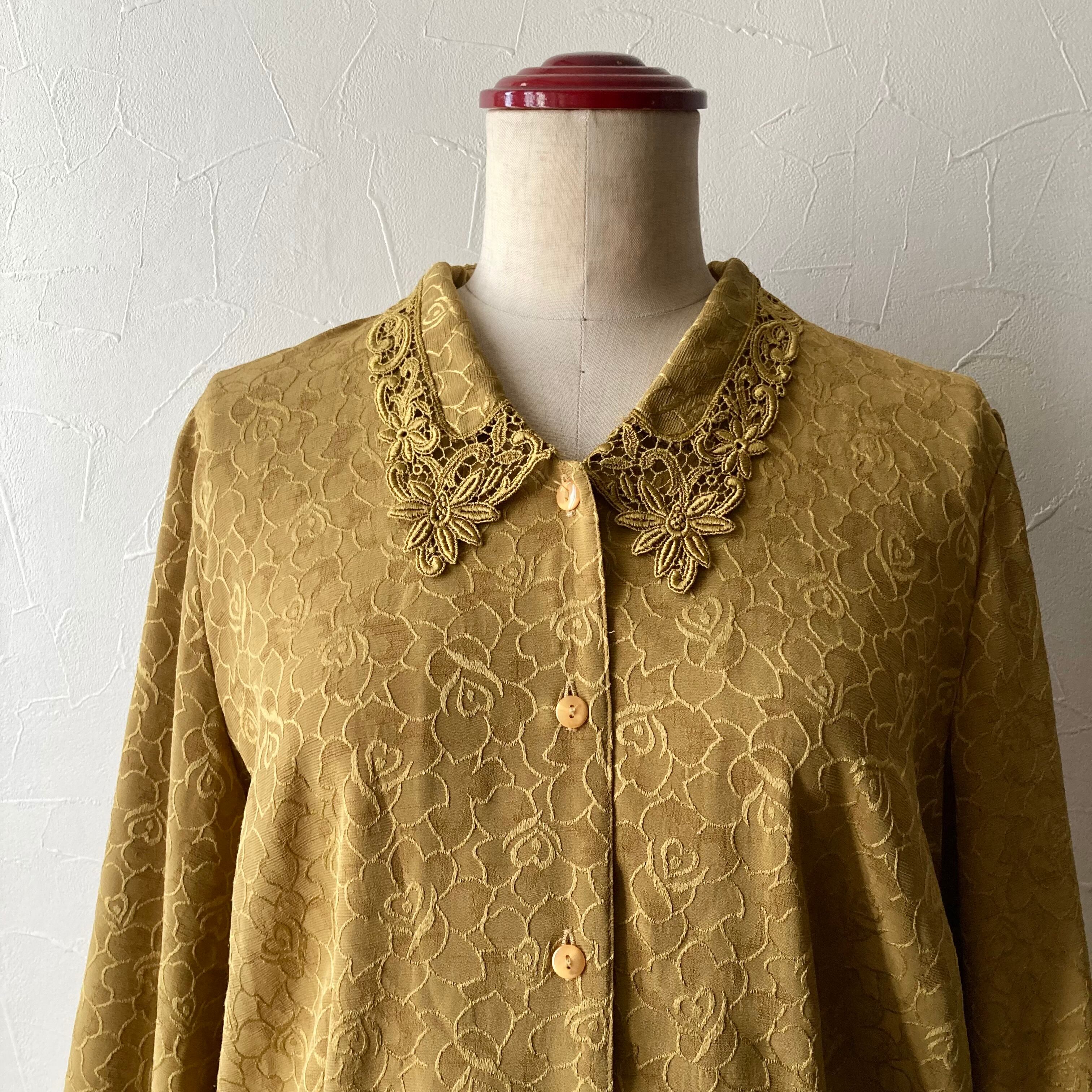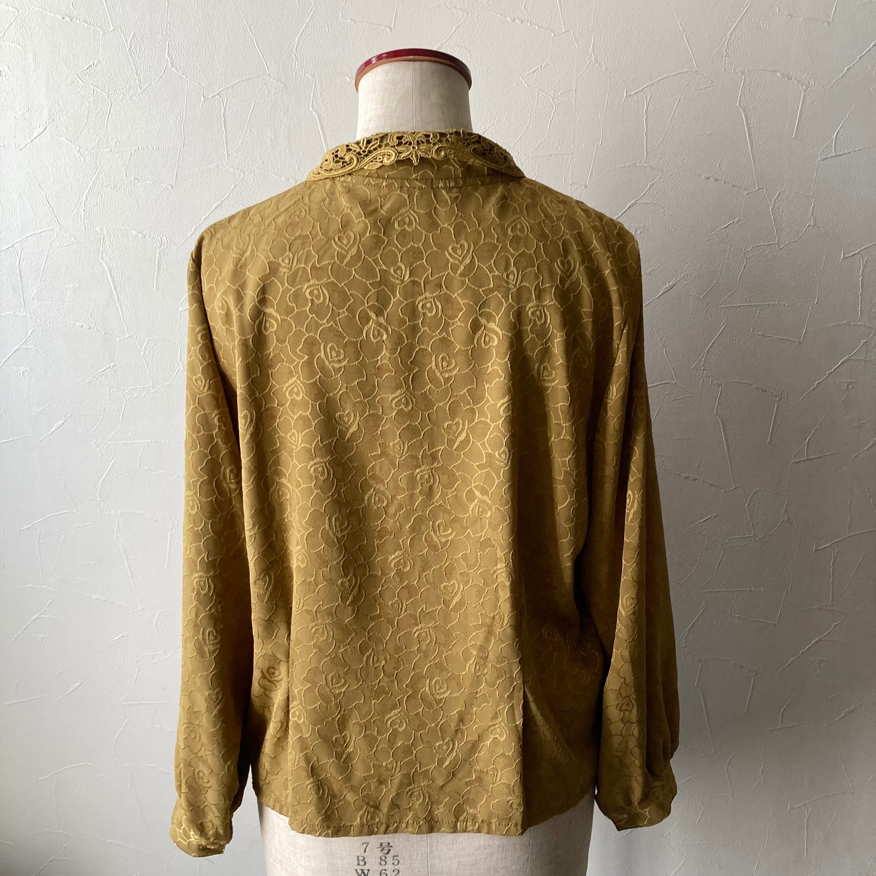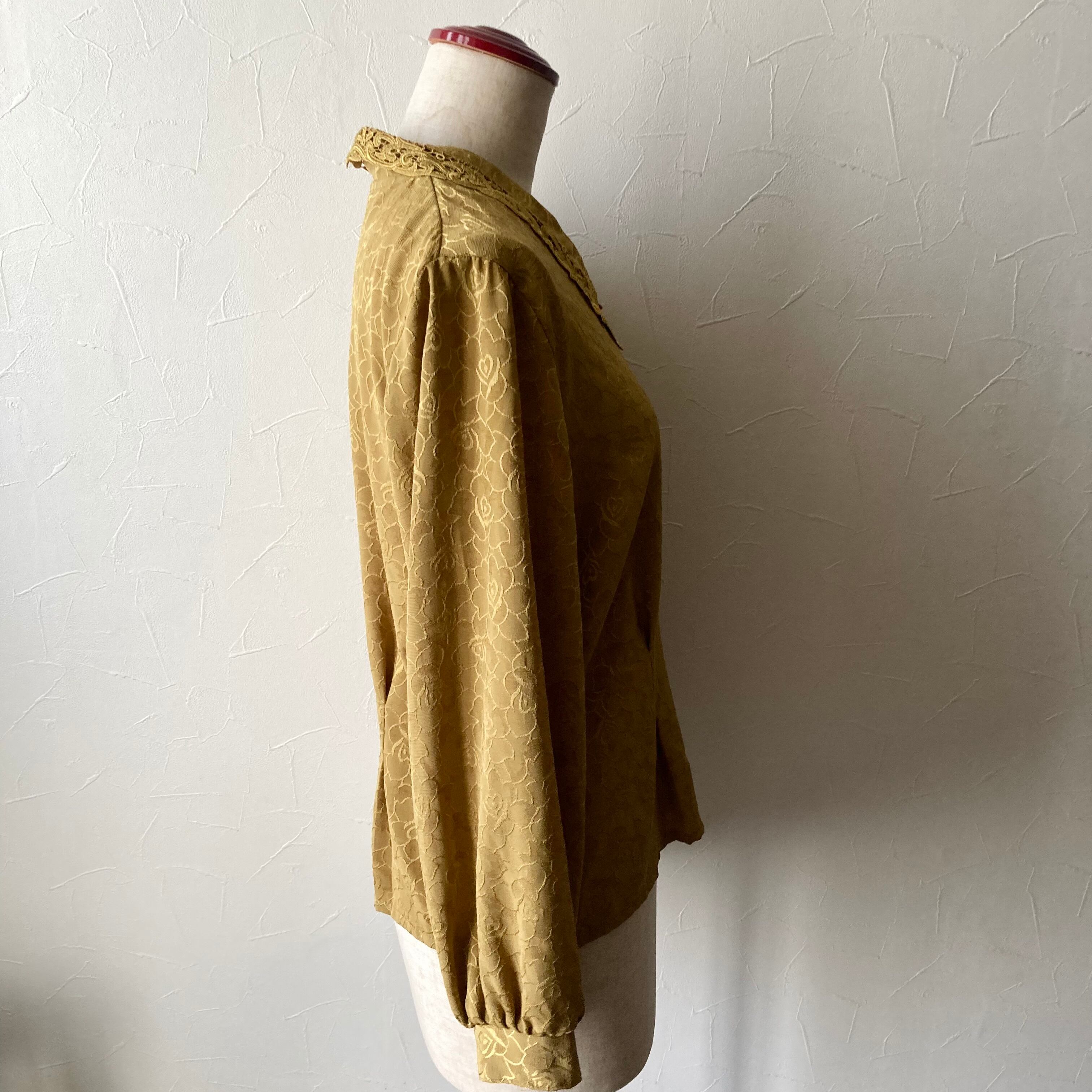 花模様の入ったマスタードカラーの生地が秋らしくて素敵なレトロなブラウス。襟には花レースが施されています。ふわりとした袖も可愛く味わいのある一枚です。