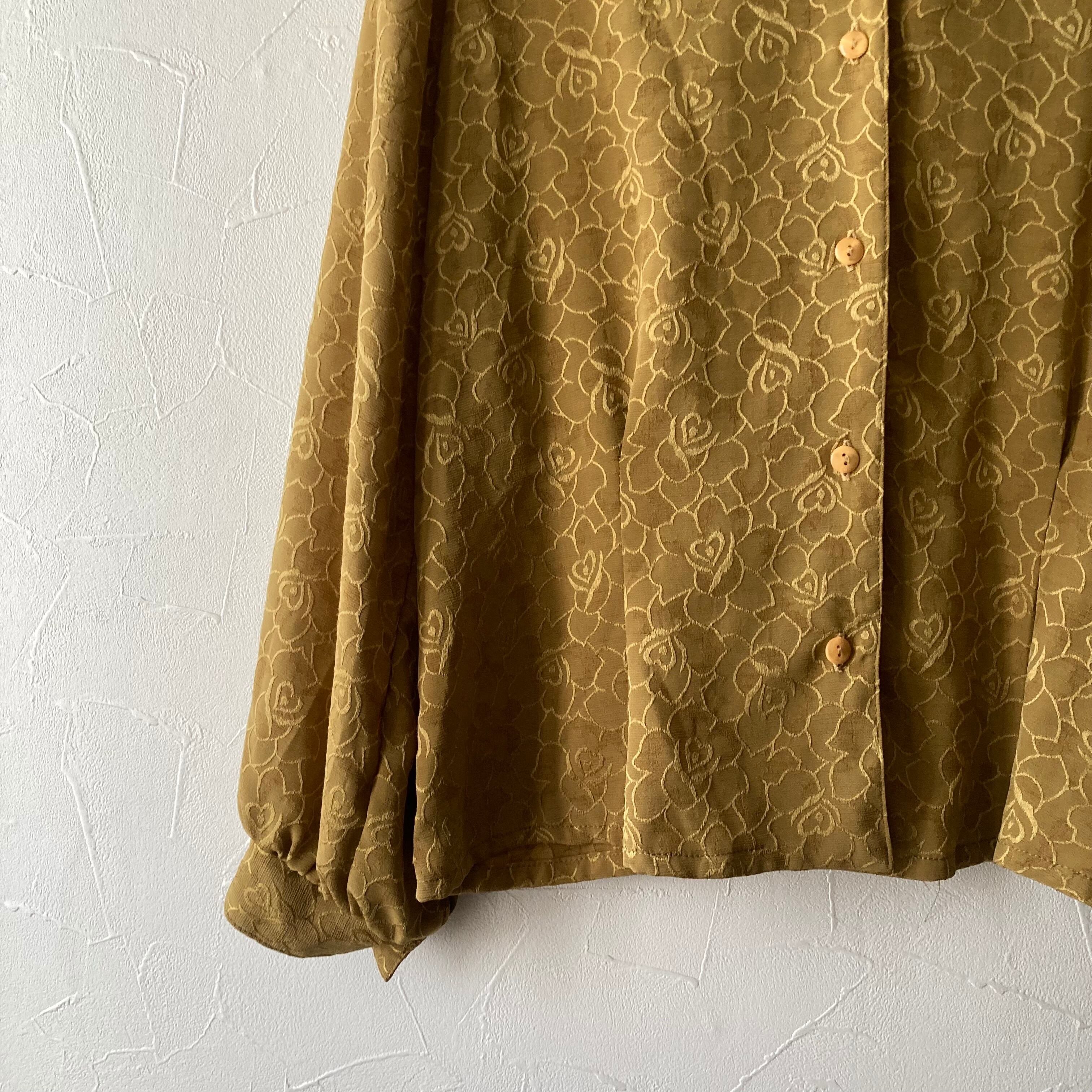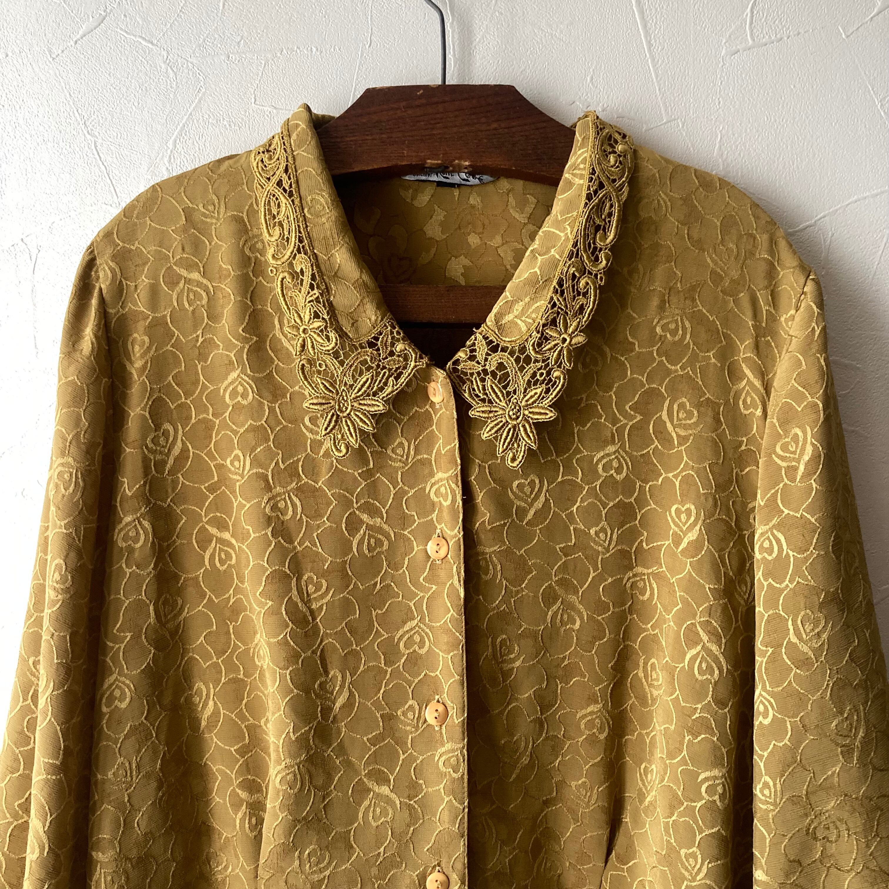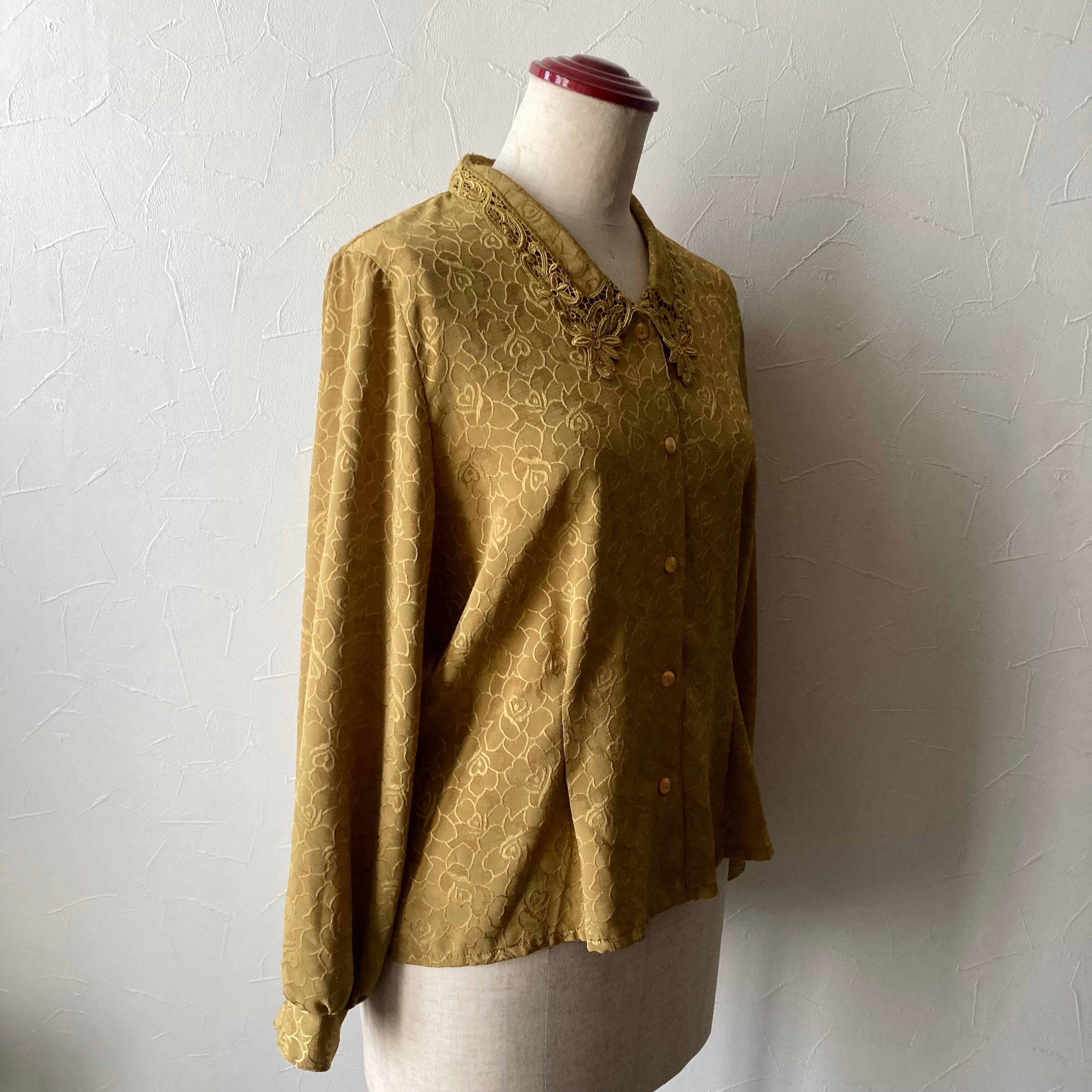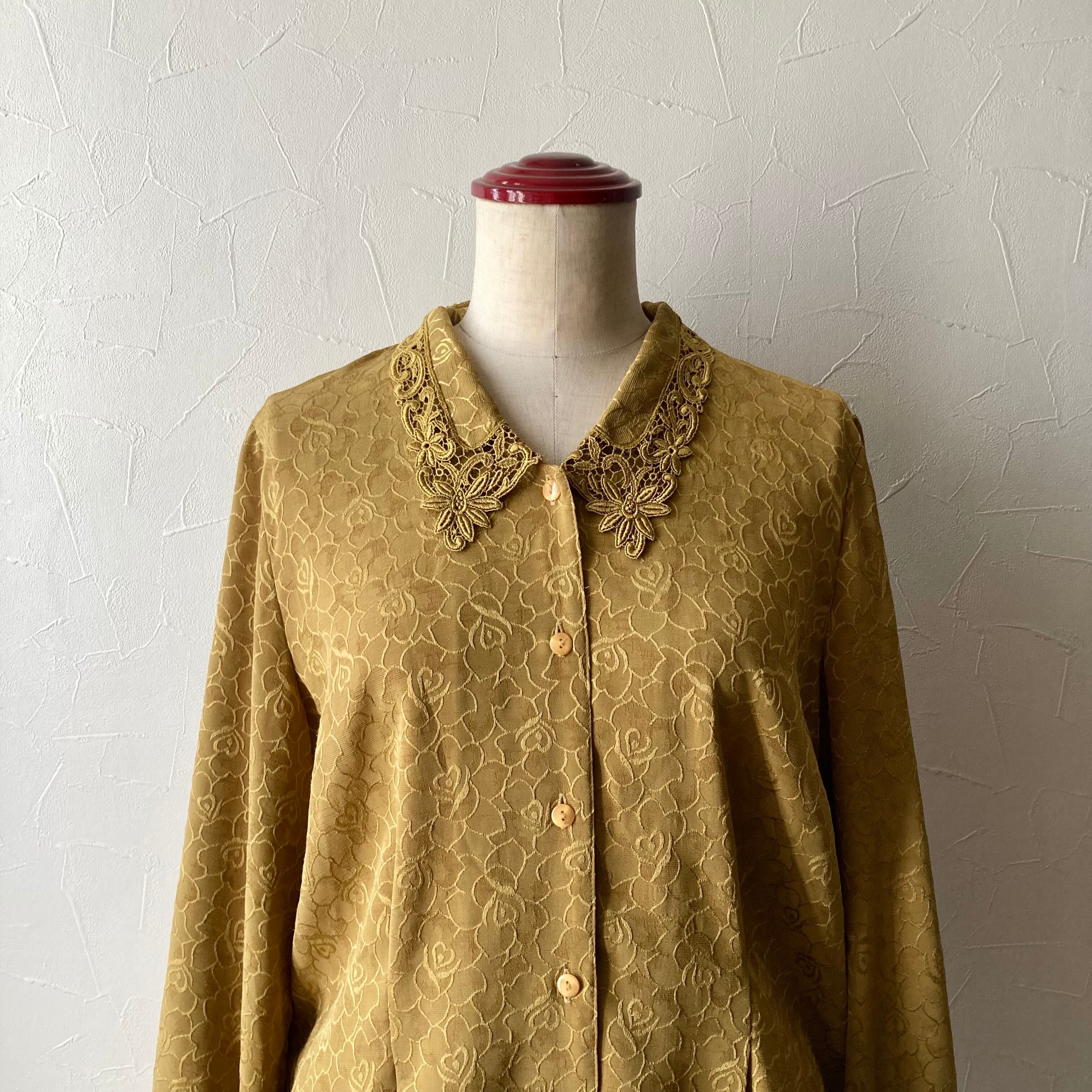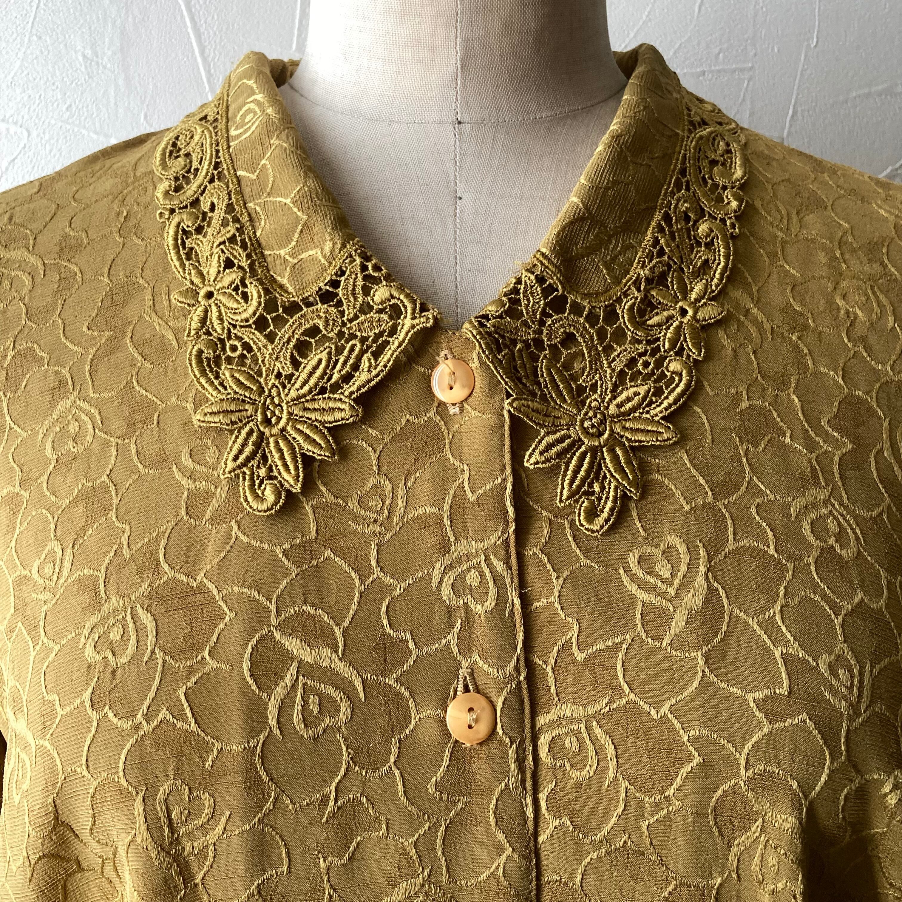 花模様の入ったマスタードカラーの生地が秋らしくて素敵なレトロなブラウス。襟には花レースが施されています。ふわりとした袖も可愛く味わいのある一枚です。