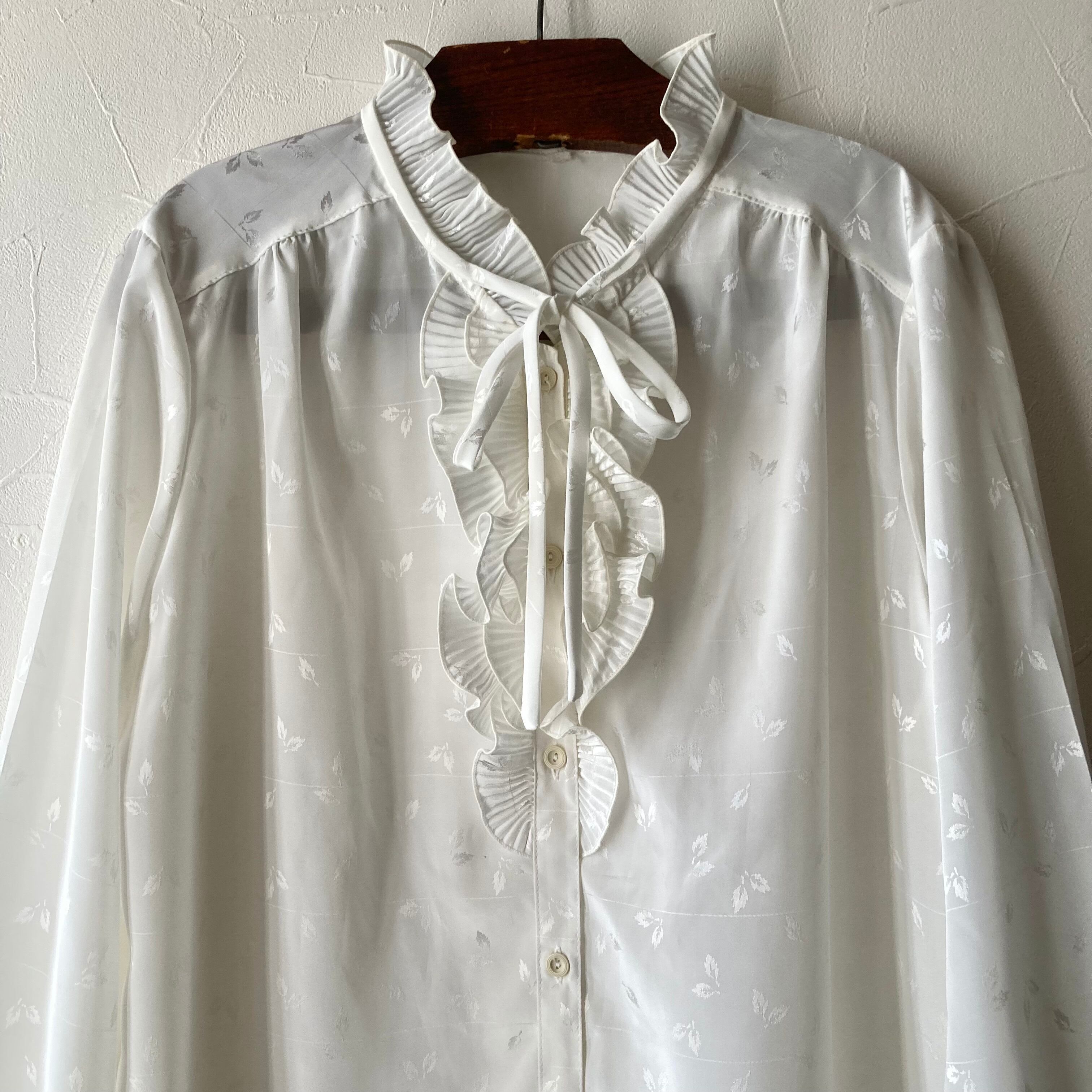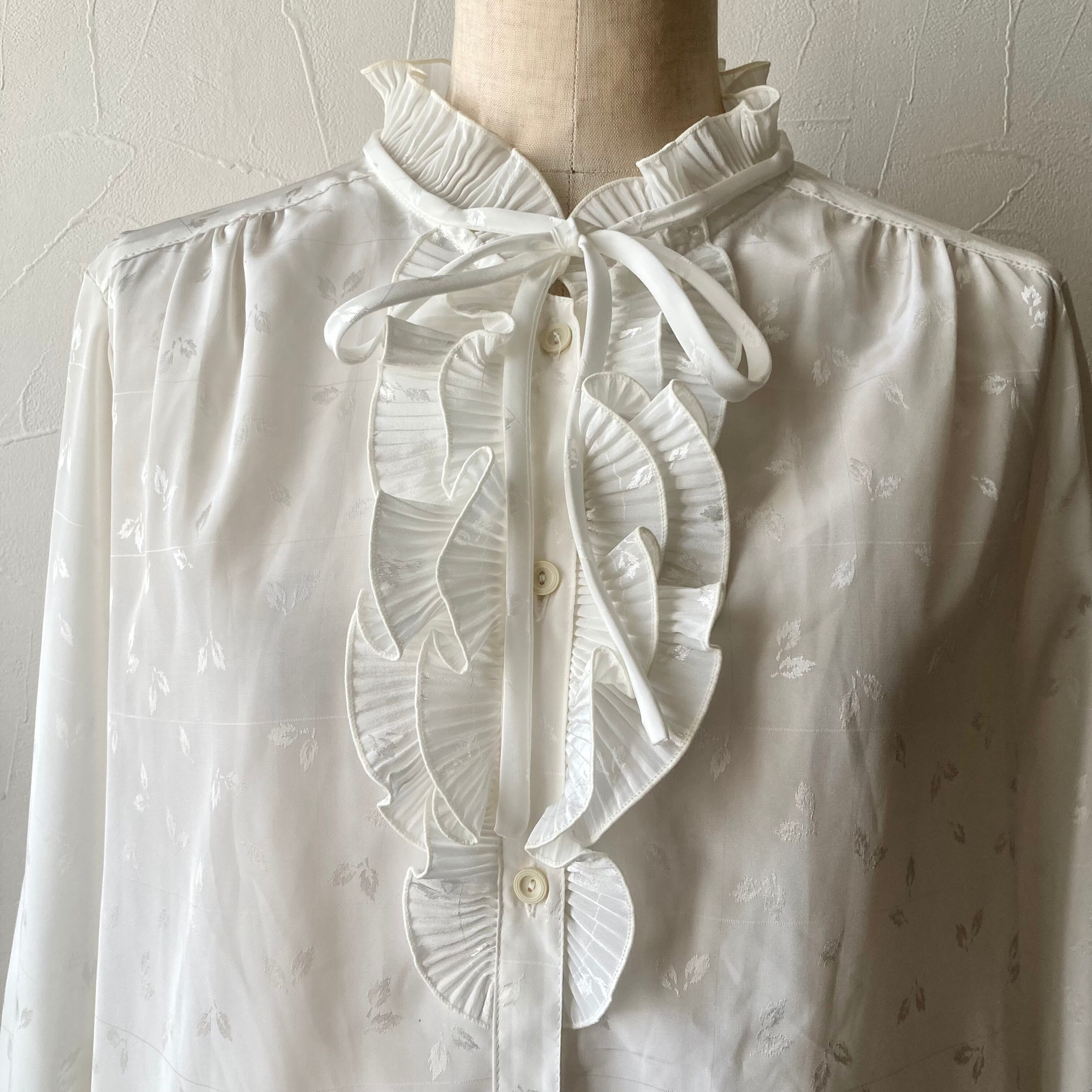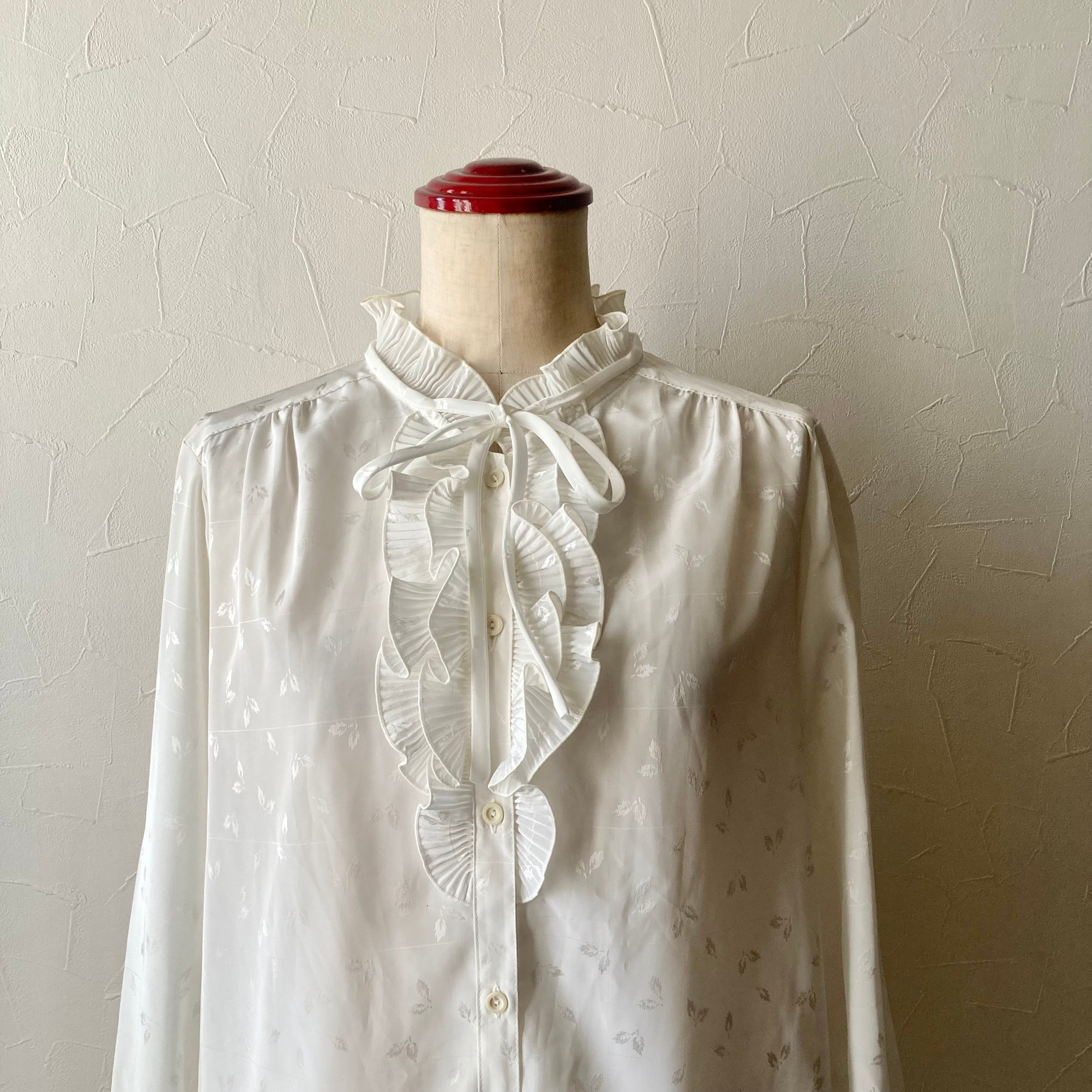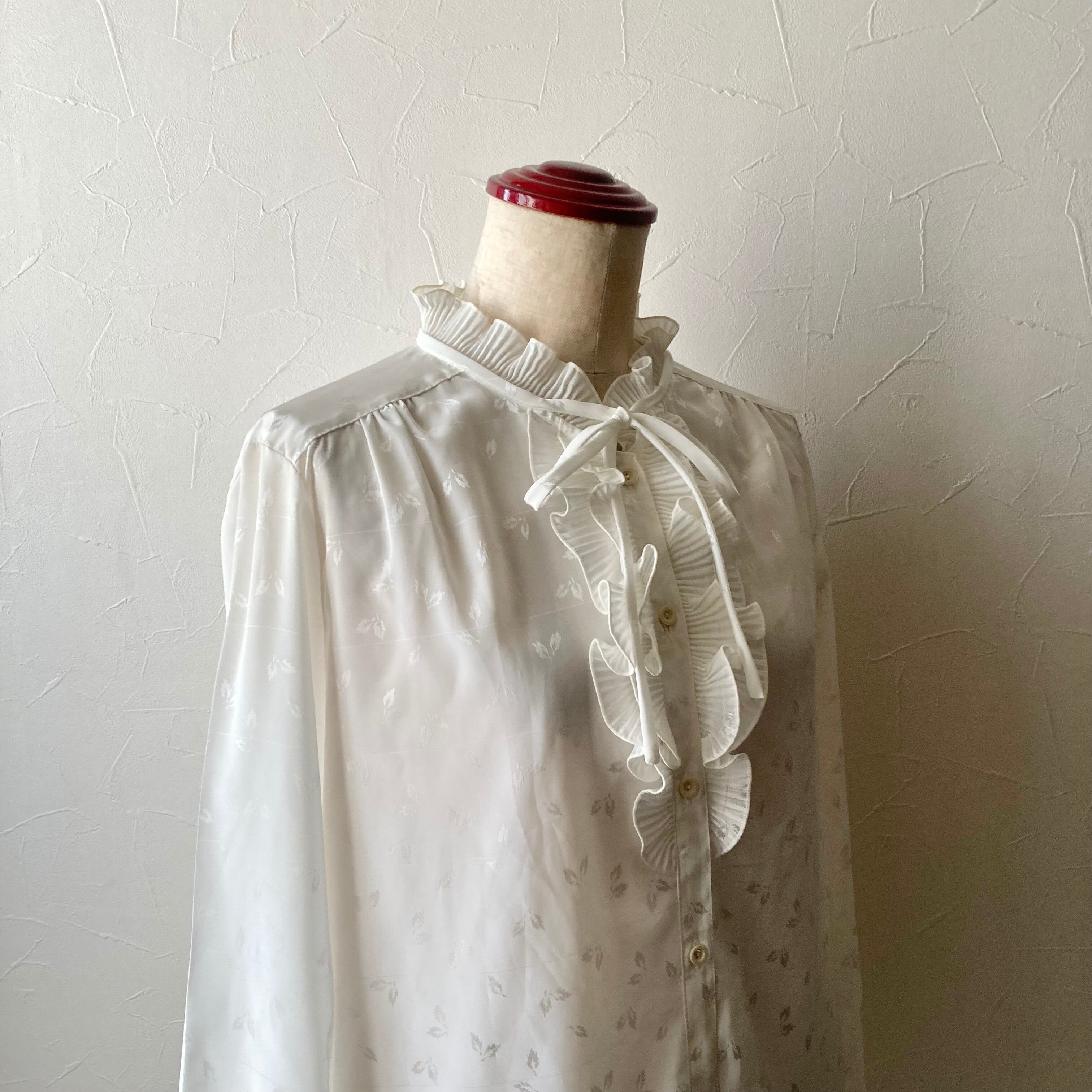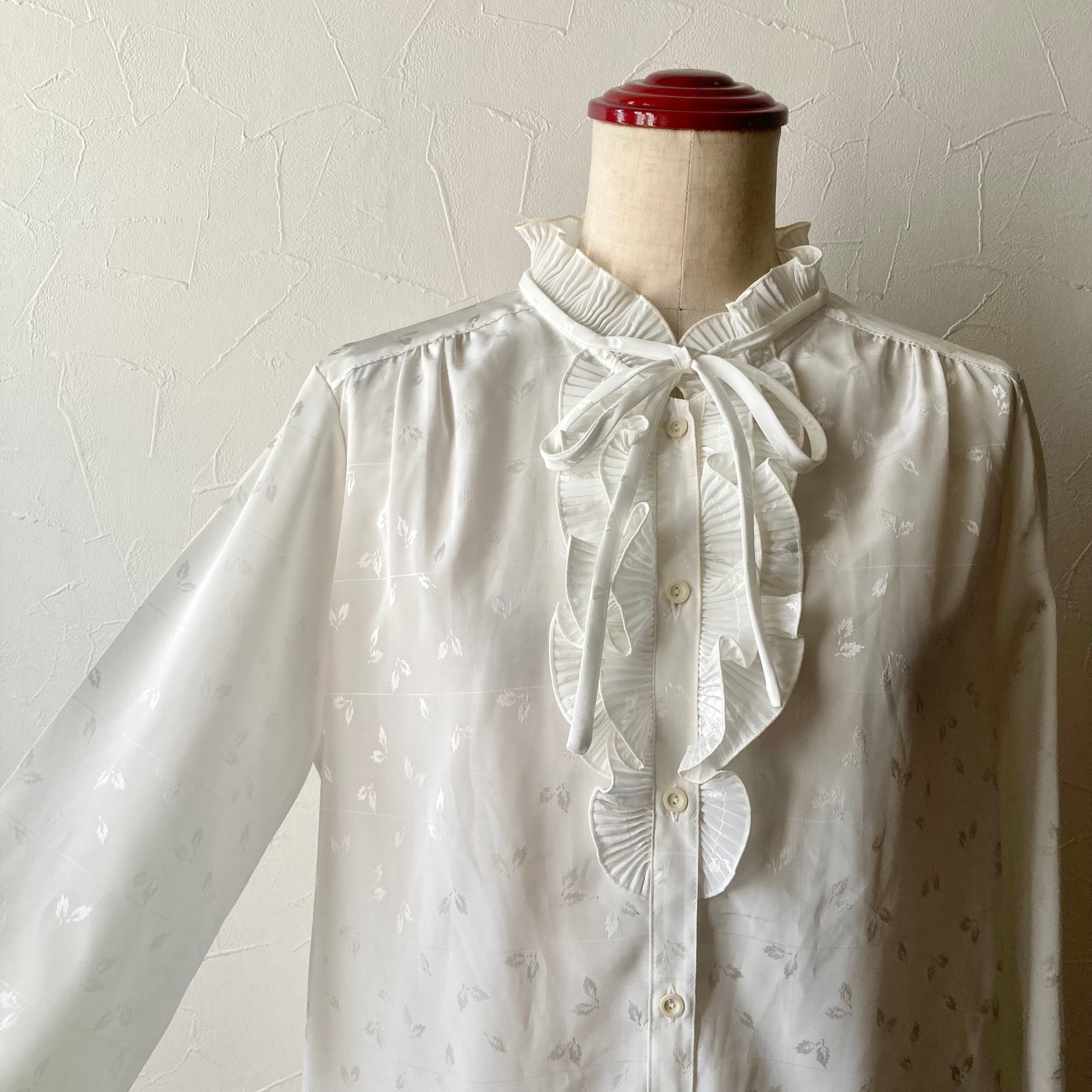 リーフフリルリボンホワイトブラウス 古着 used vintage レトロ