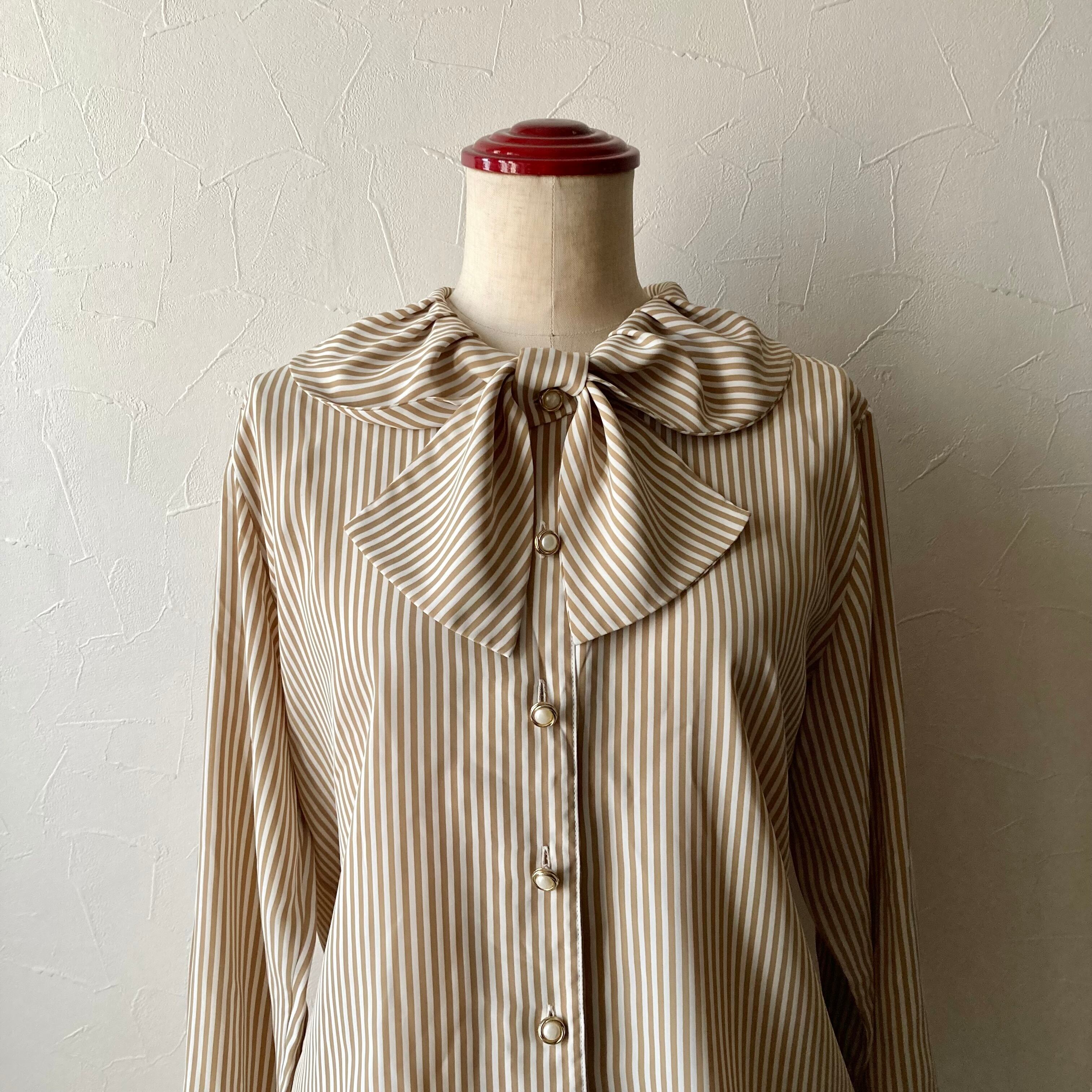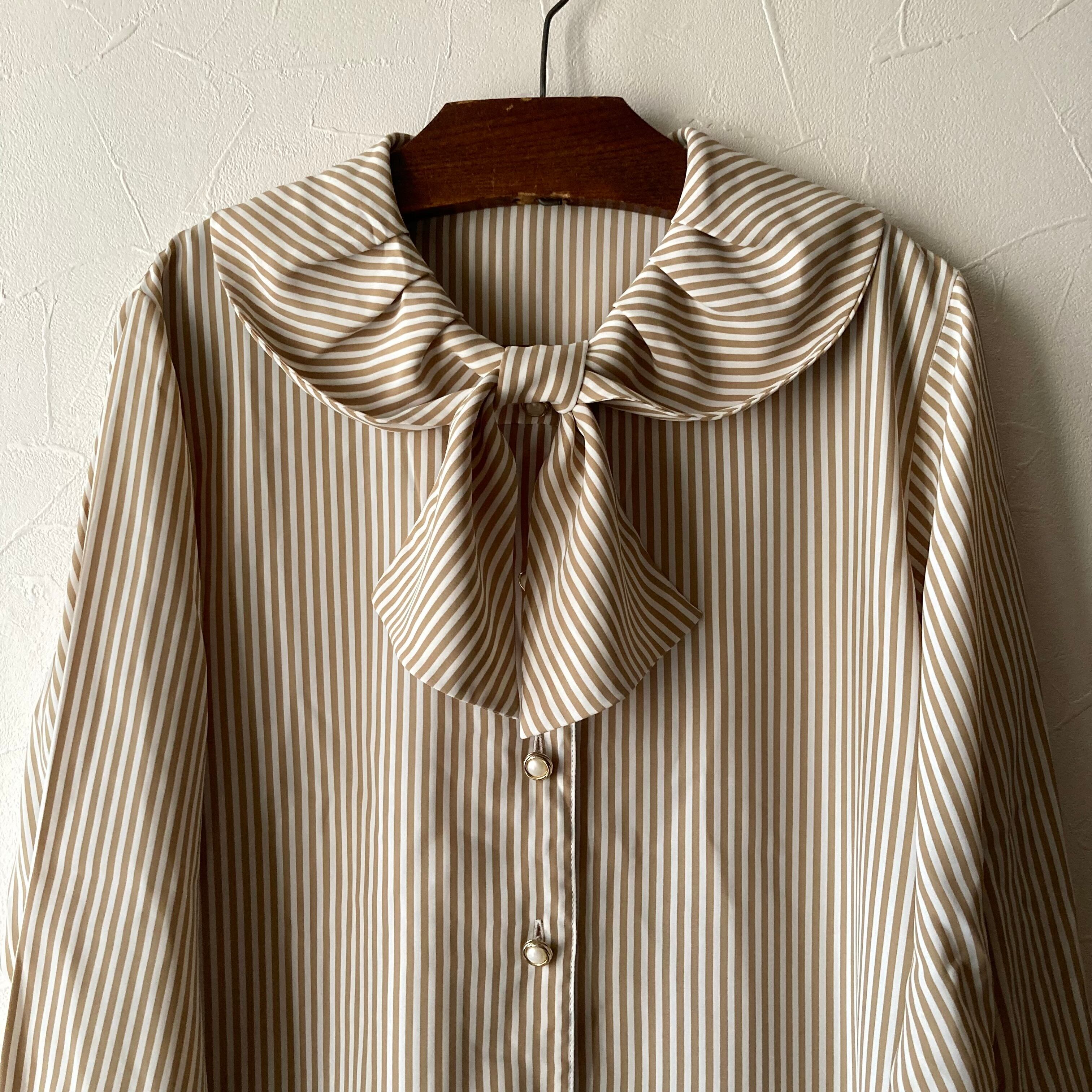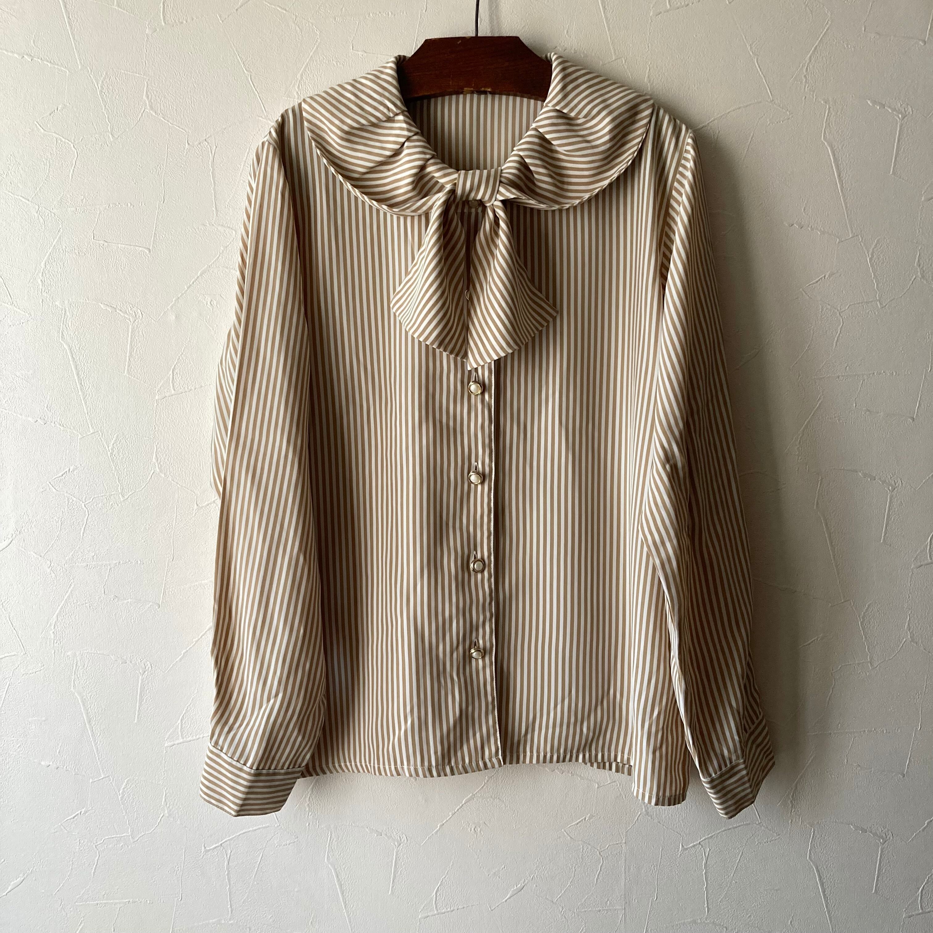 リボンのデザインがユニークで可愛らしいレトロなストライプ柄のブラウス。オフィスや普段着、お洒落着としても万能に着ていただけると思います。