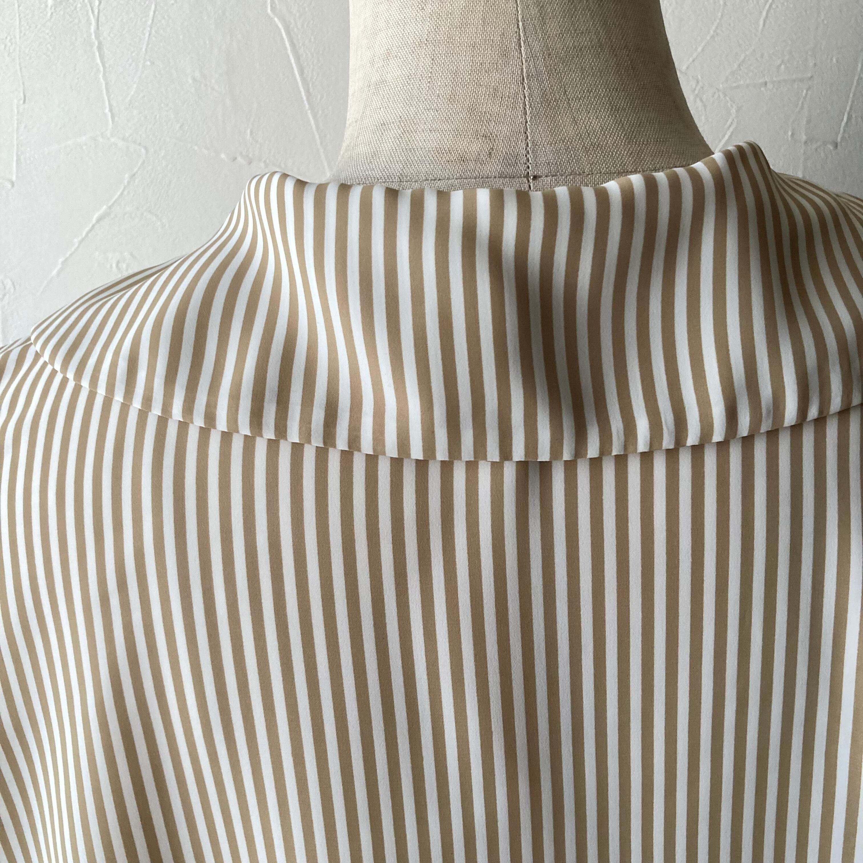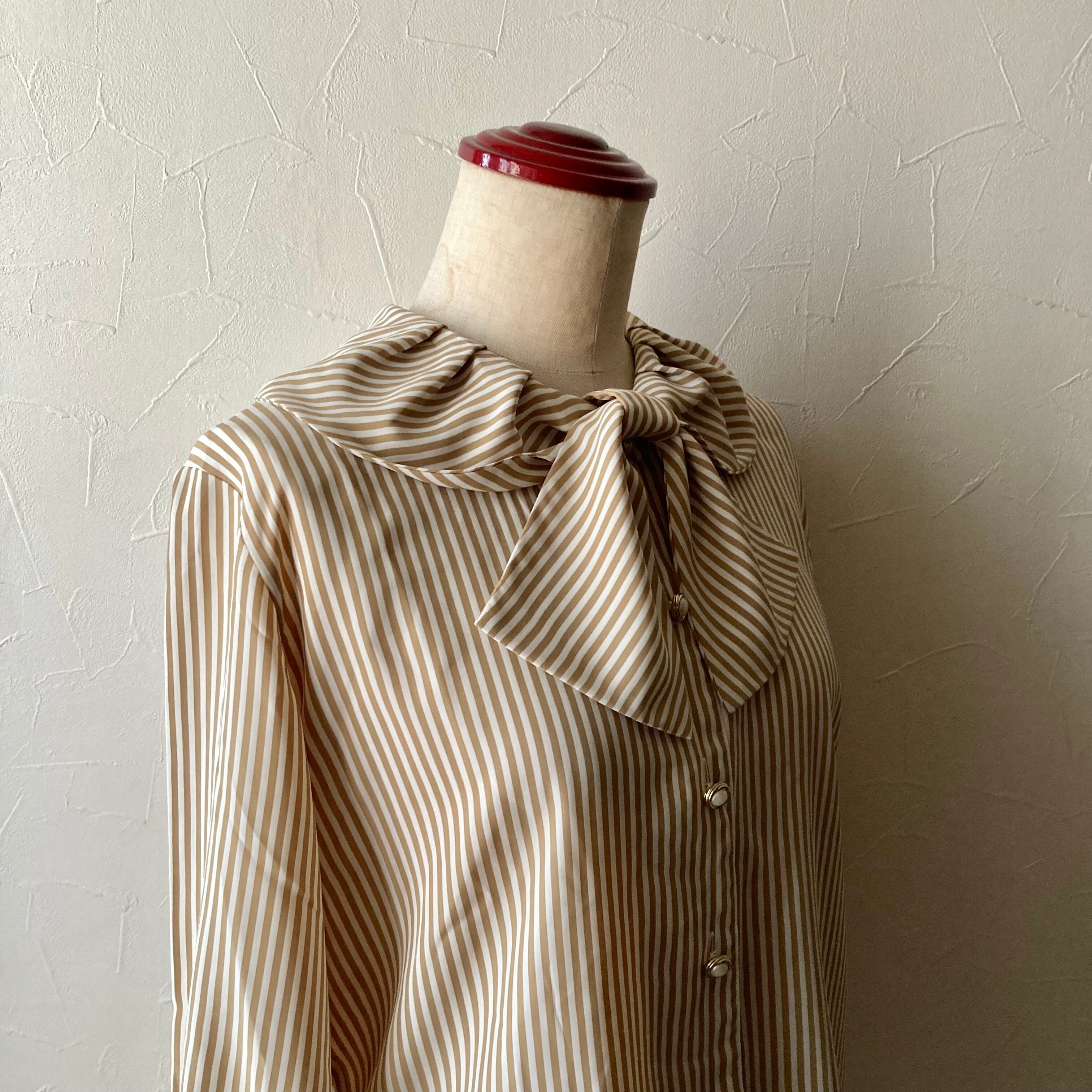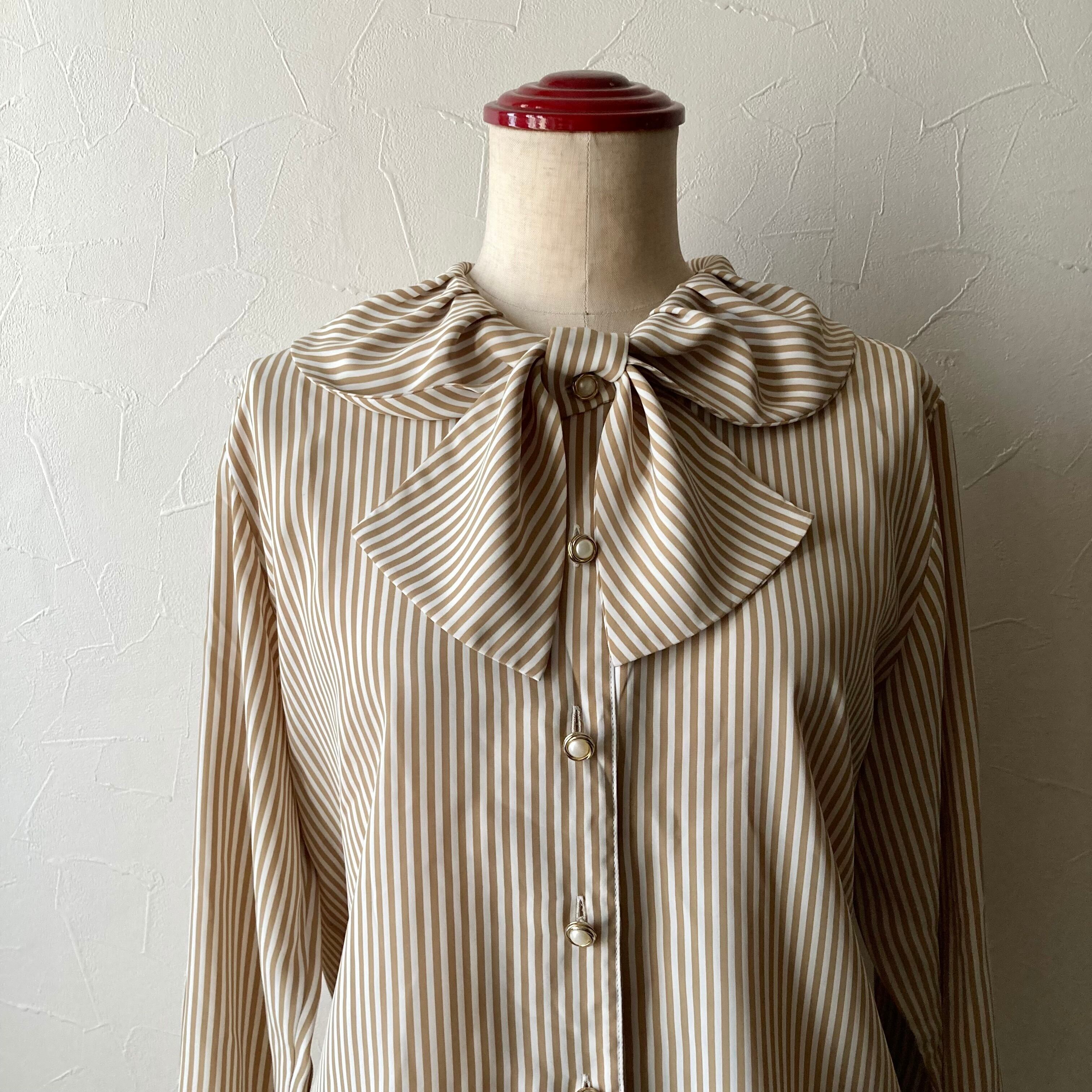 リボンのデザインがユニークで可愛らしいレトロなストライプ柄のブラウス。オフィスや普段着、お洒落着としても万能に着ていただけると思います。