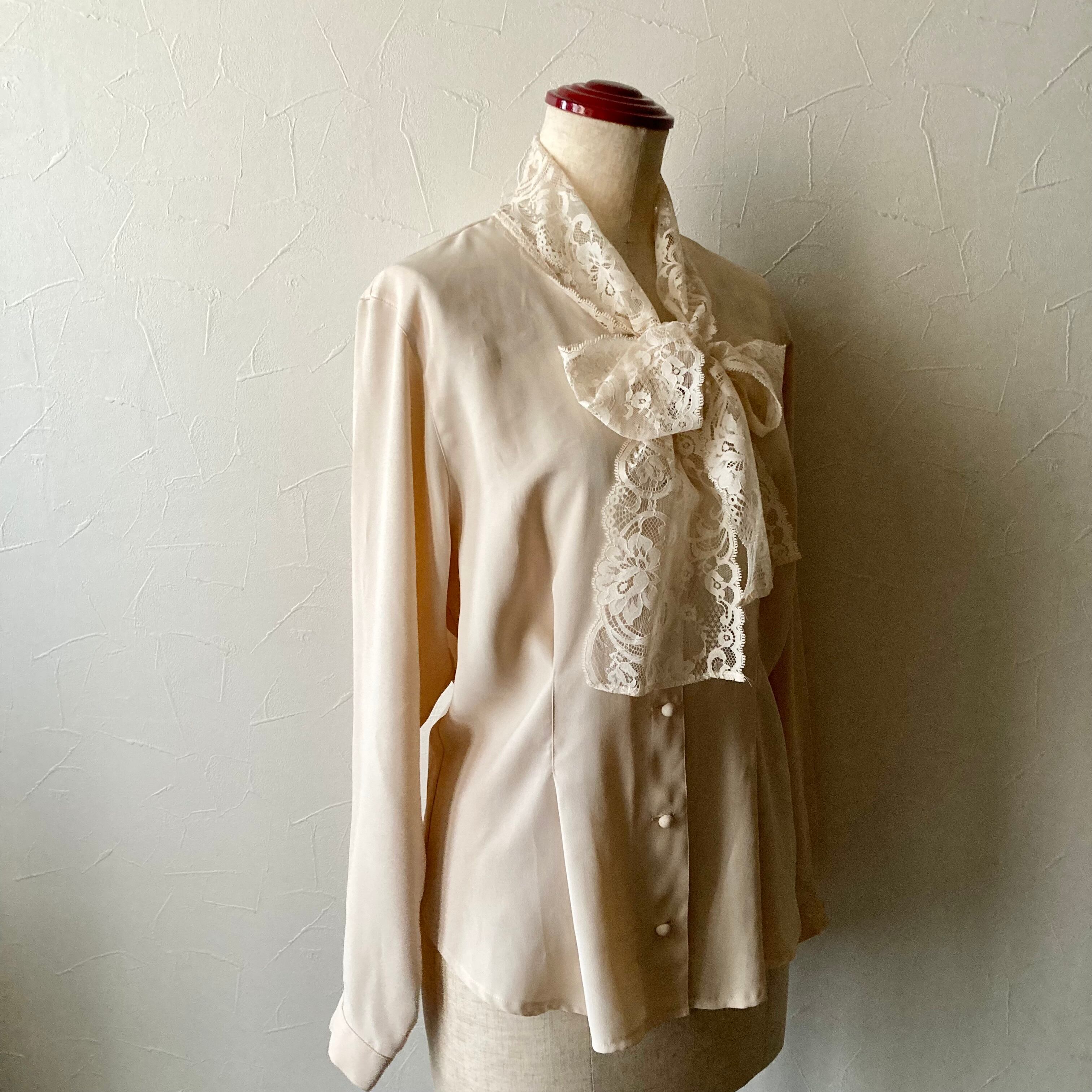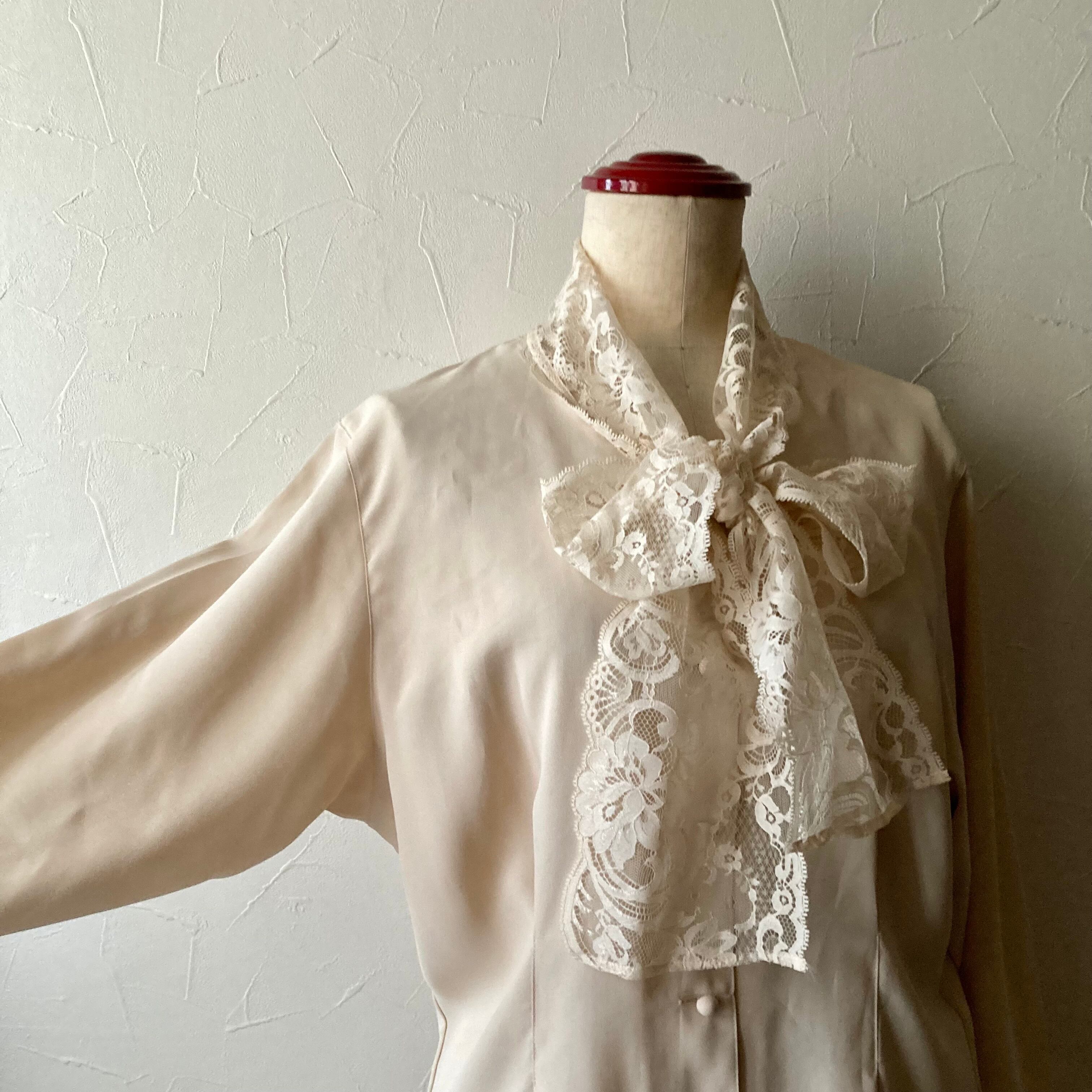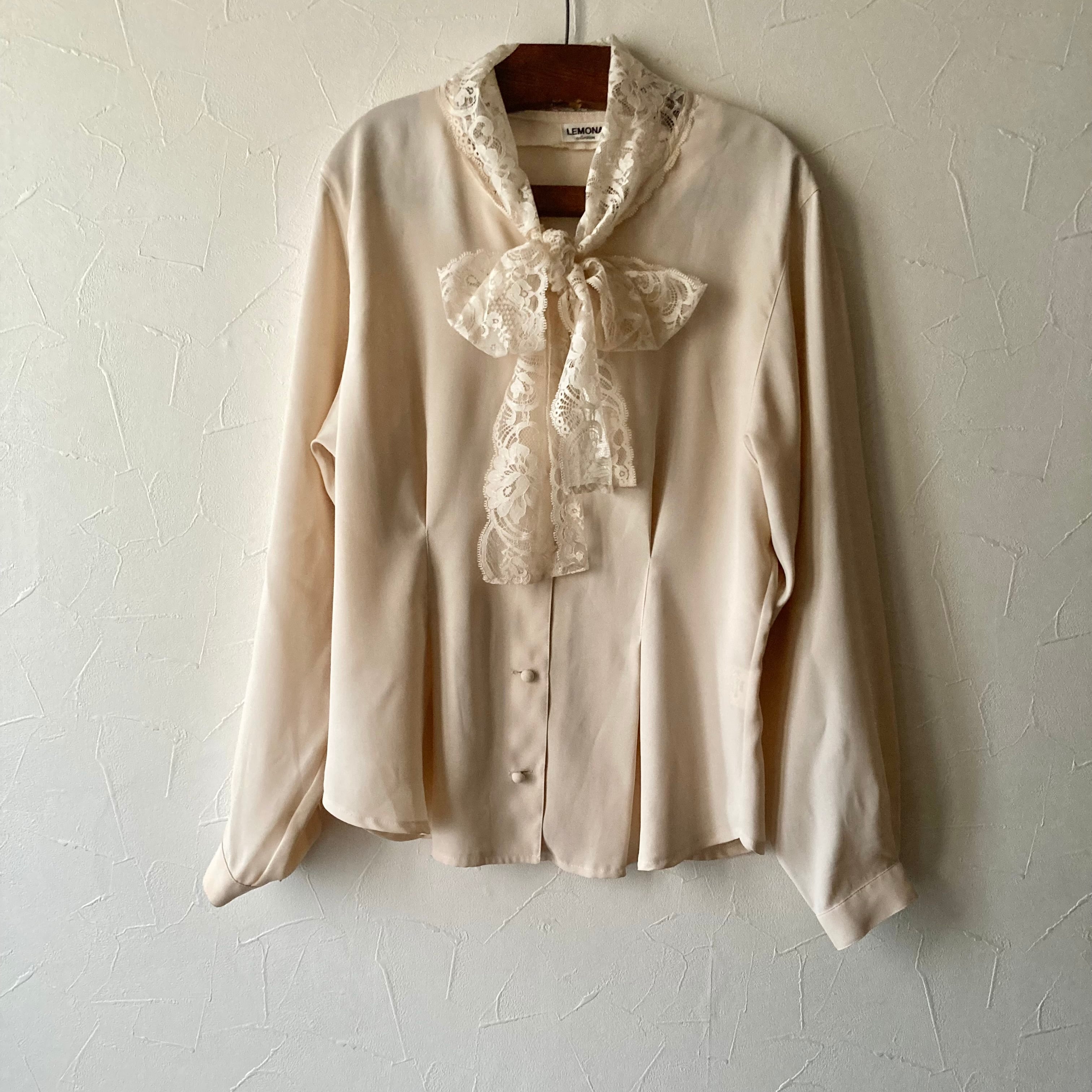 優しい色味の大きなレースのリボンがなんとも可愛いレトロなブラウスです。