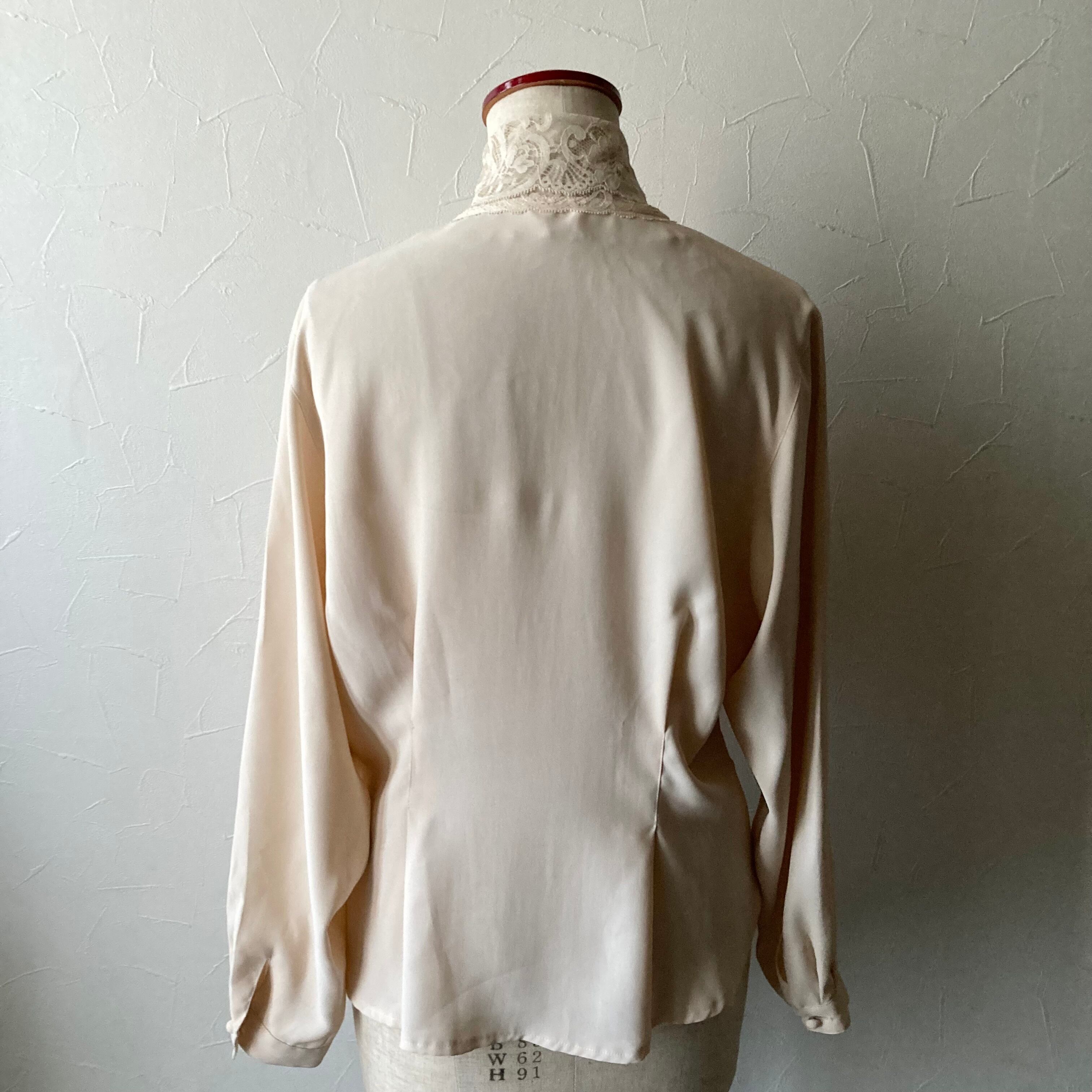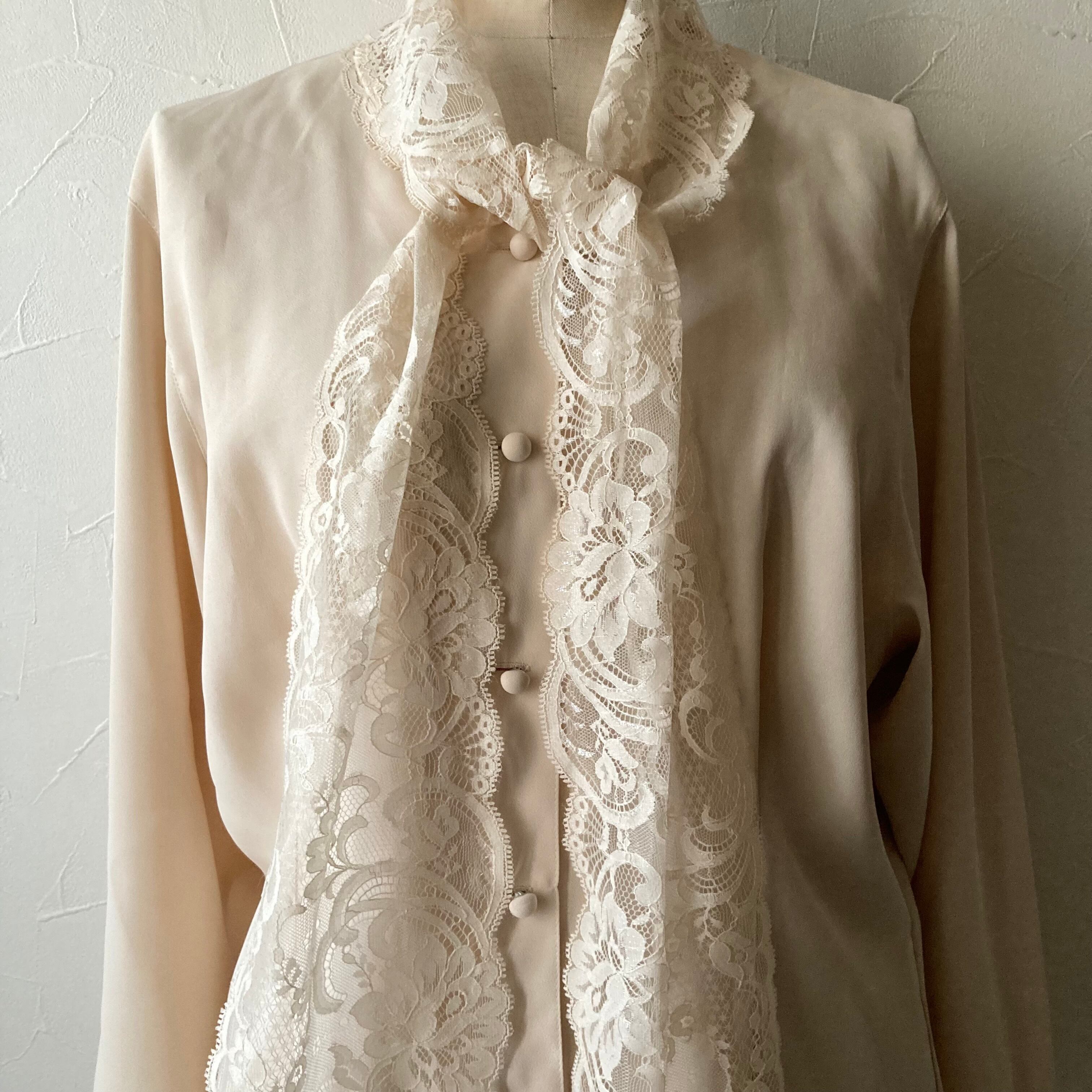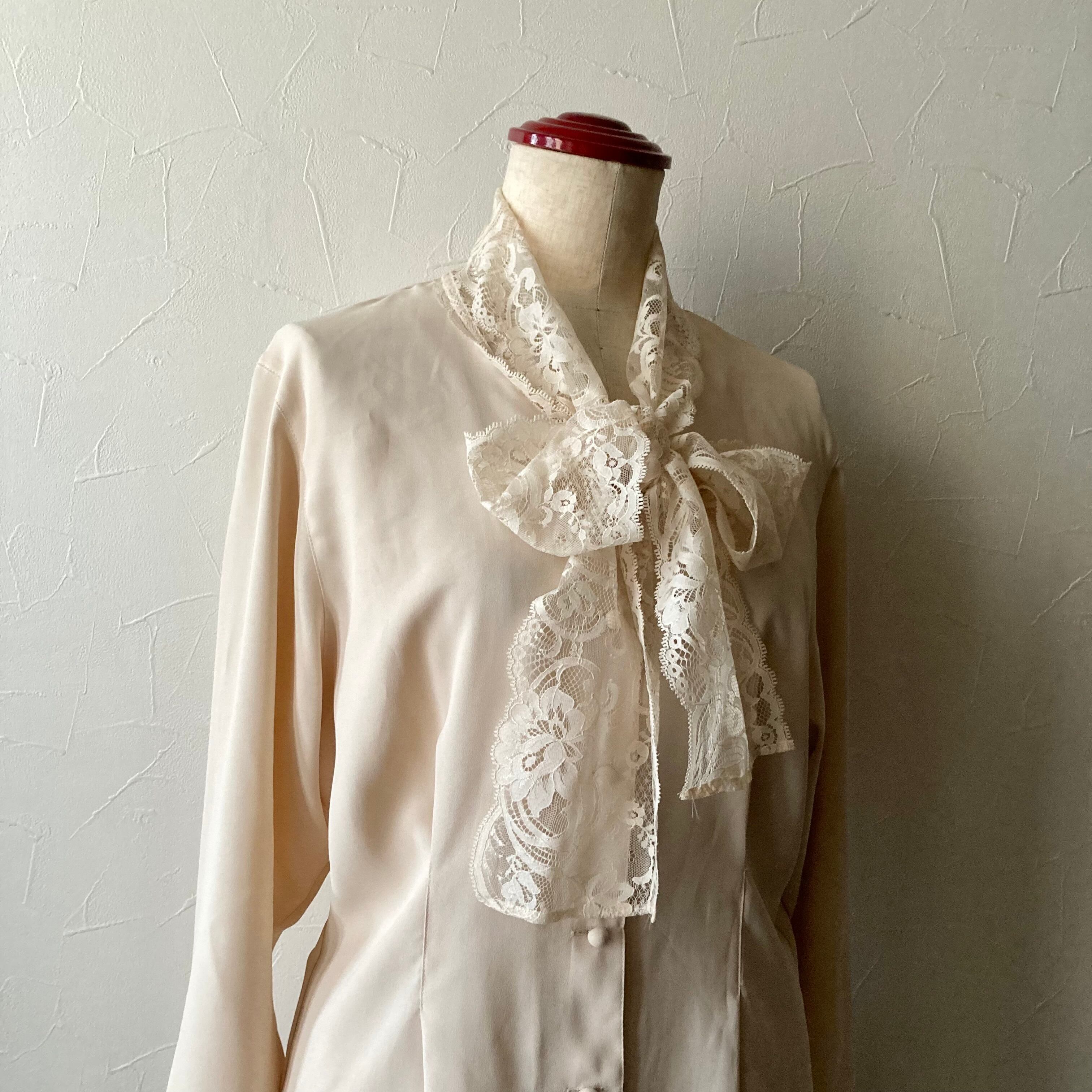 優しい色味の大きなレースのリボンがなんとも可愛いレトロなブラウスです。
