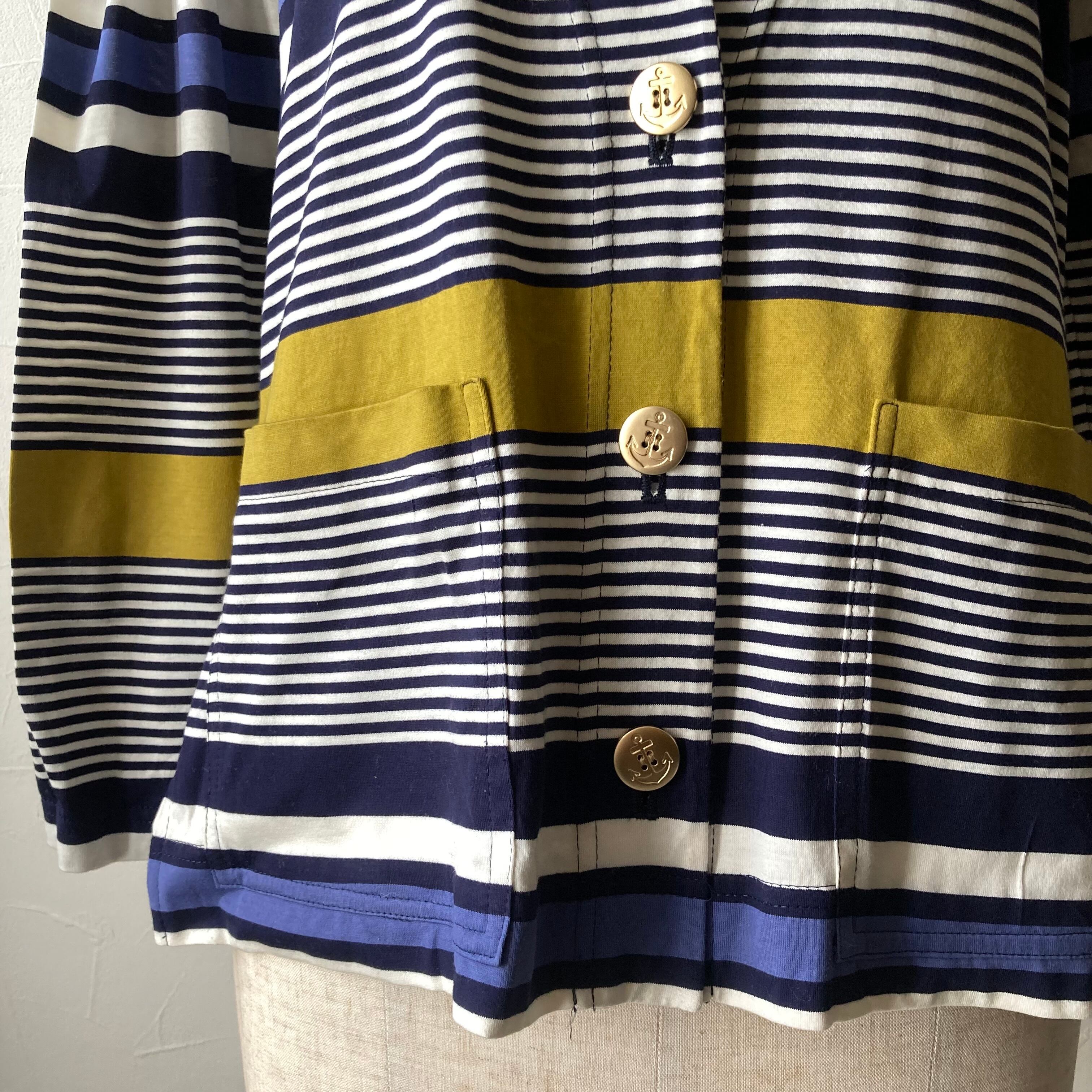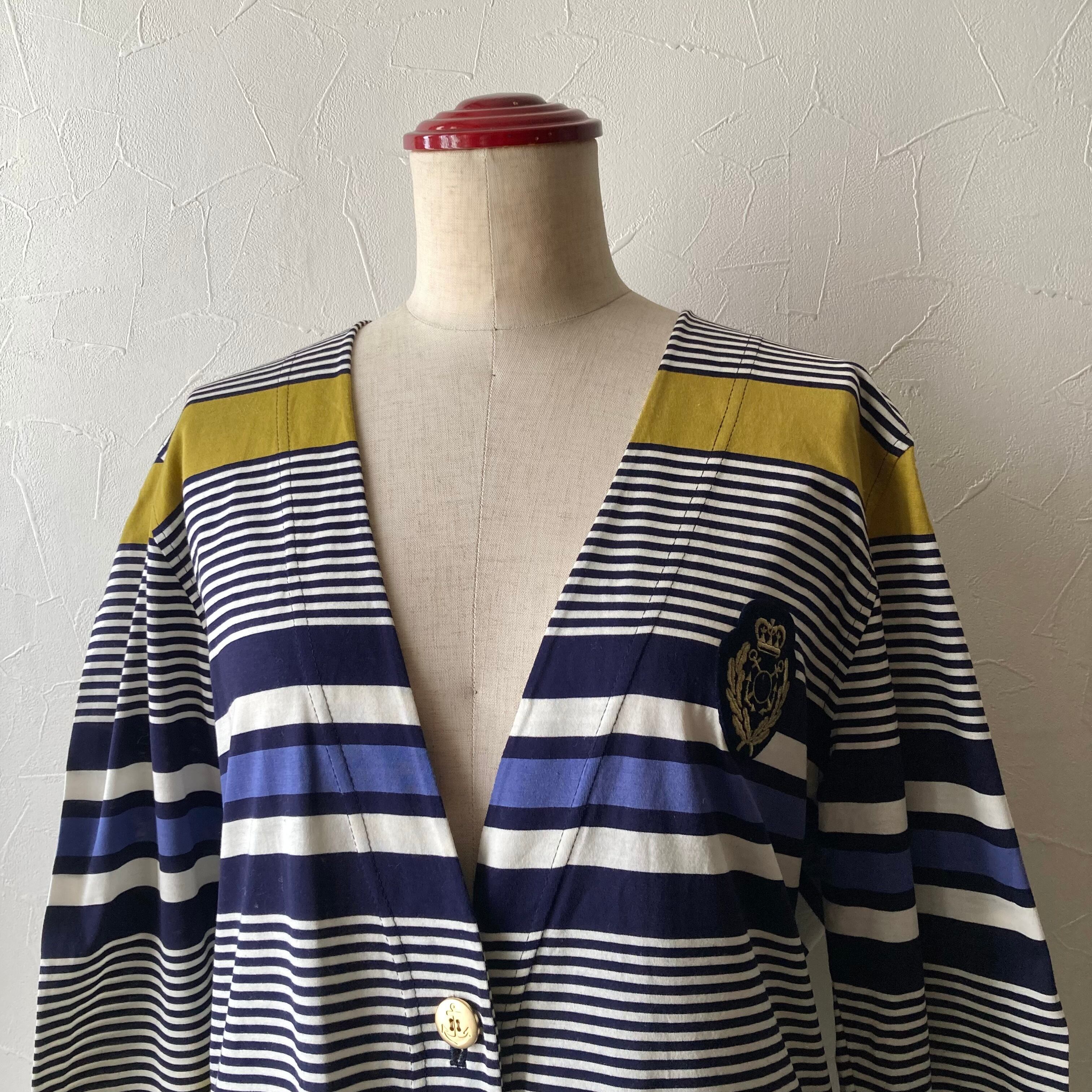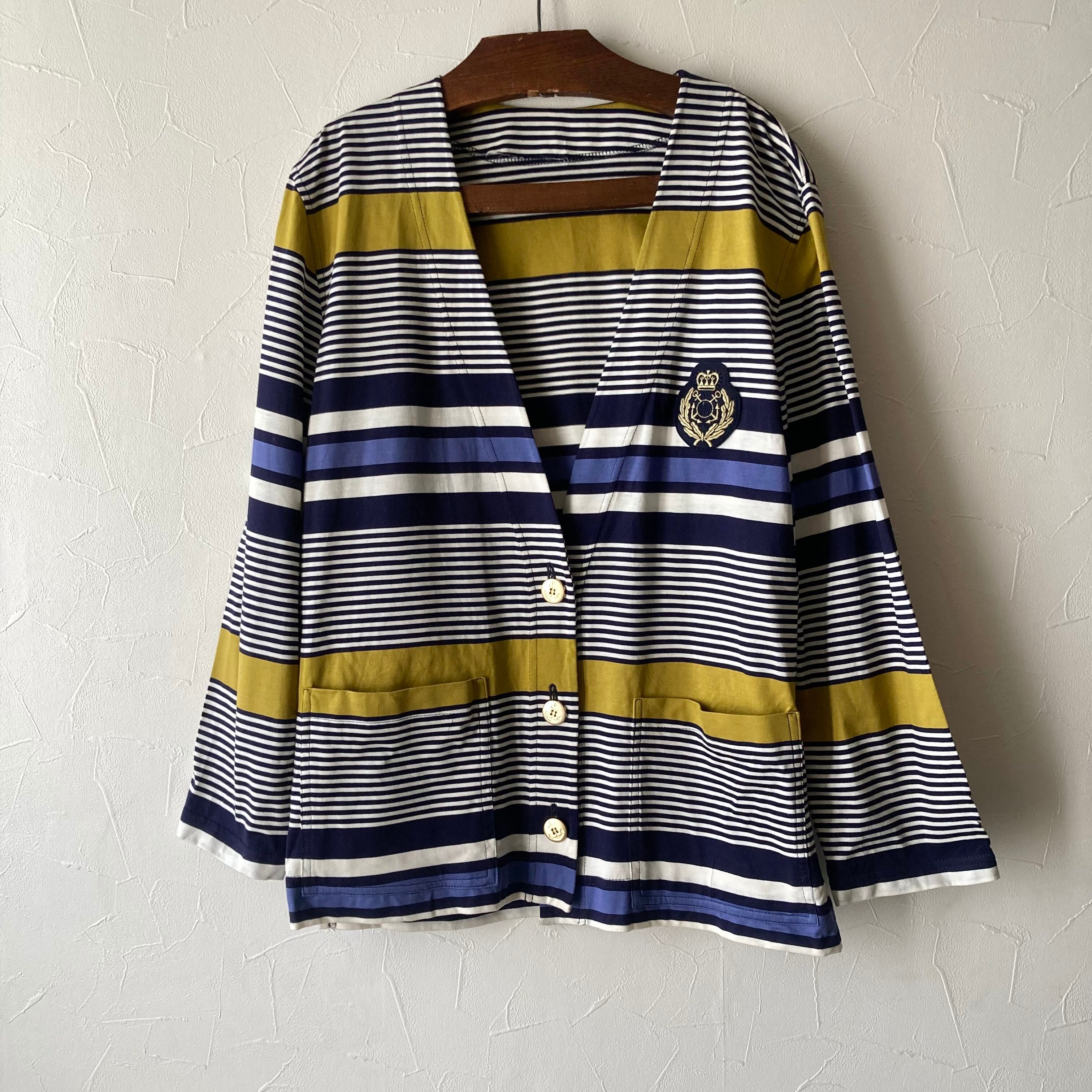可愛い色合わせのボーダーコットンカーディガン。エンブレムワッペンとマリンマークのゴールドボタンもレトロで可愛いです。コットン素材で着心地も良さそうです。
