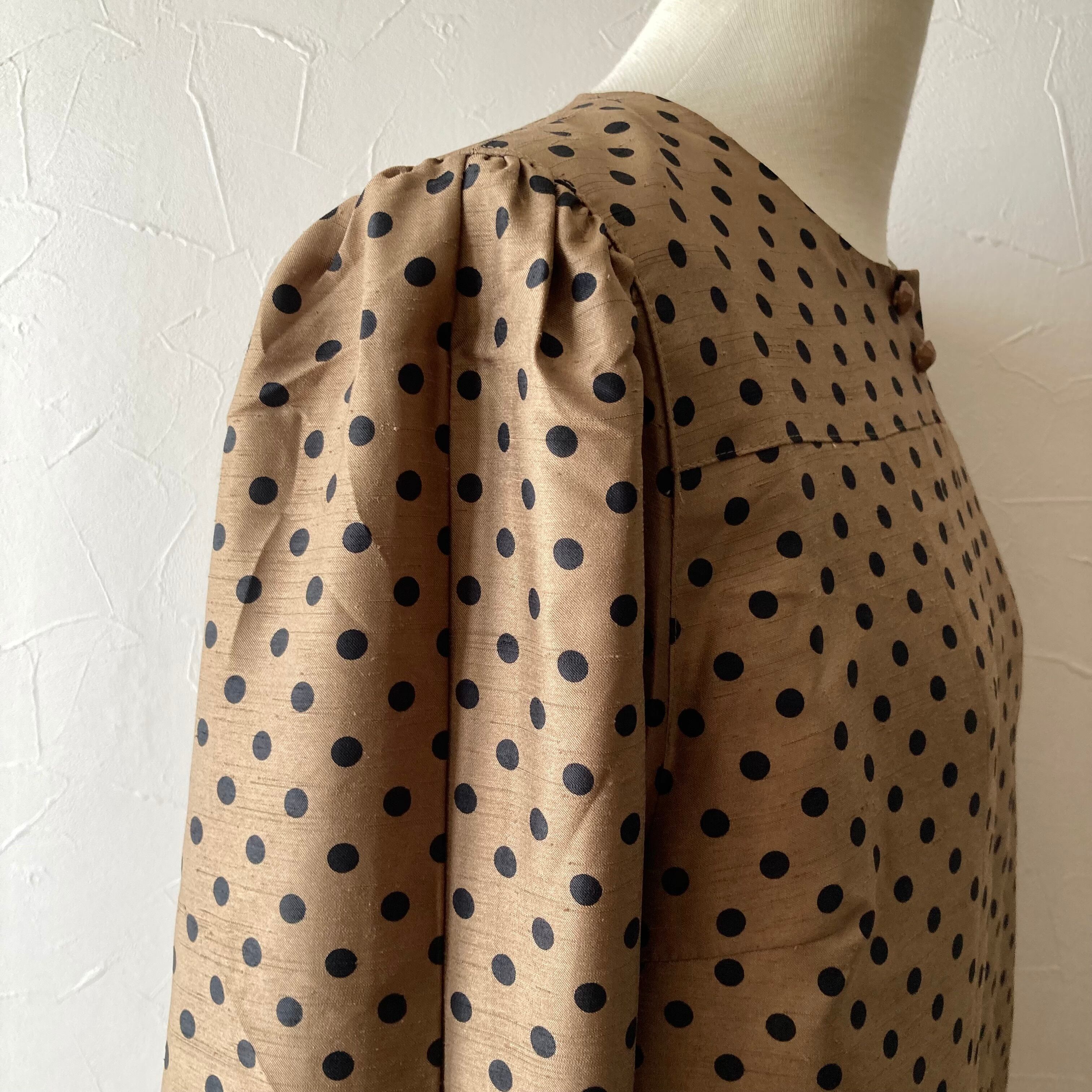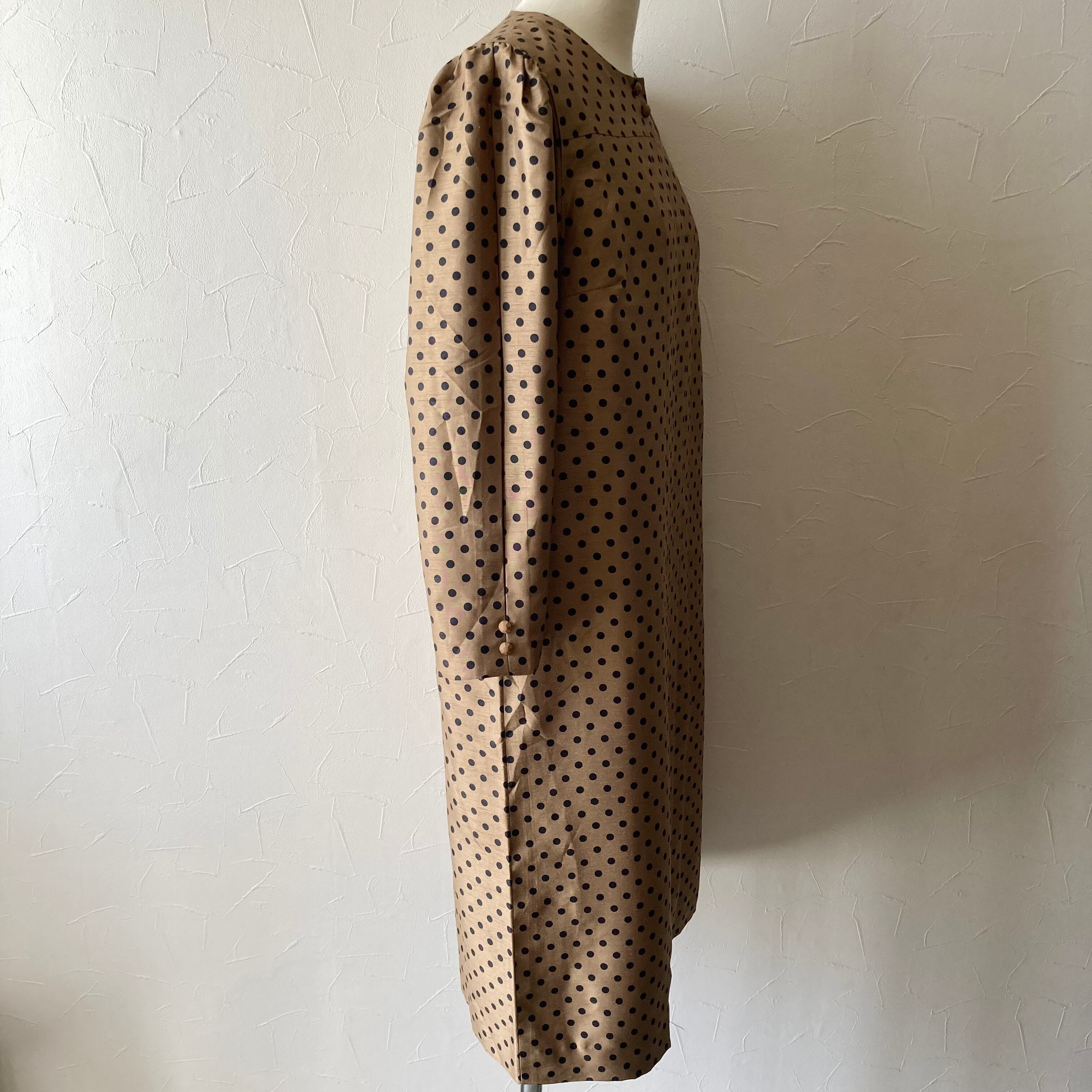 ライトブラウンに黒のドット柄がレトロで可愛いレナウン製ワンピース。プリーツデザインと裾はパフスリーブでレトロなシルエットがとってもキュートです。リボンが付いていますが、ウエストに巻くものかと思いますが、頭に巻いても可愛いと思います♡ パンツを重ねてもよし◎