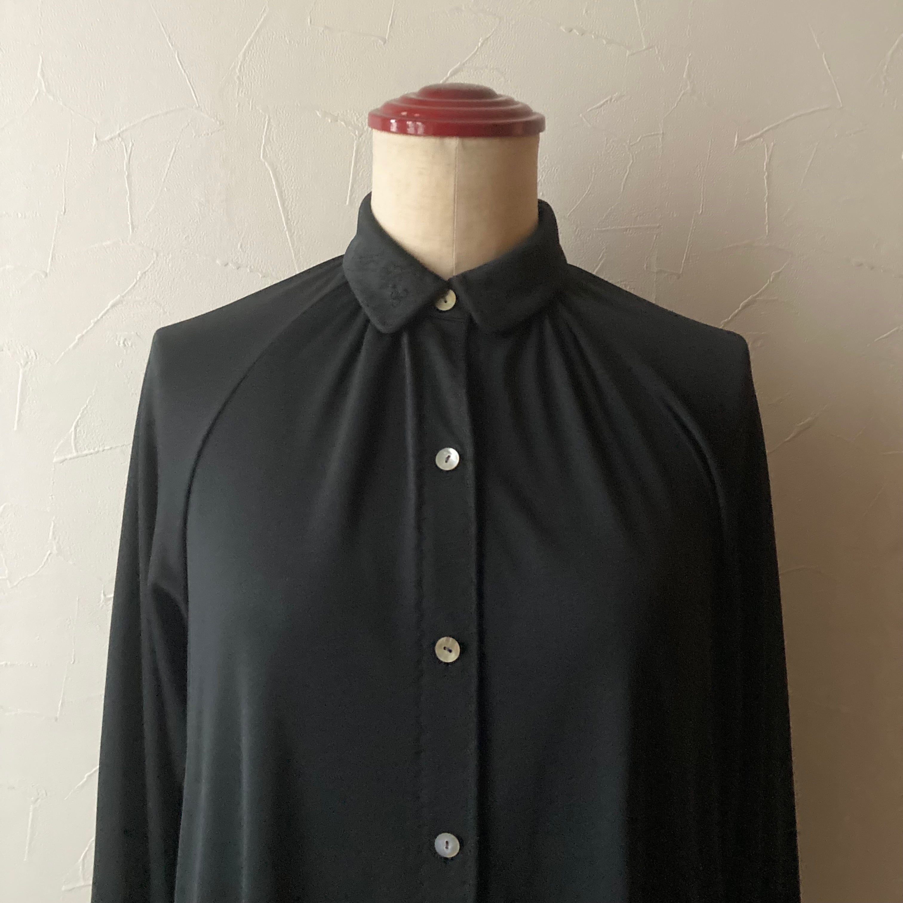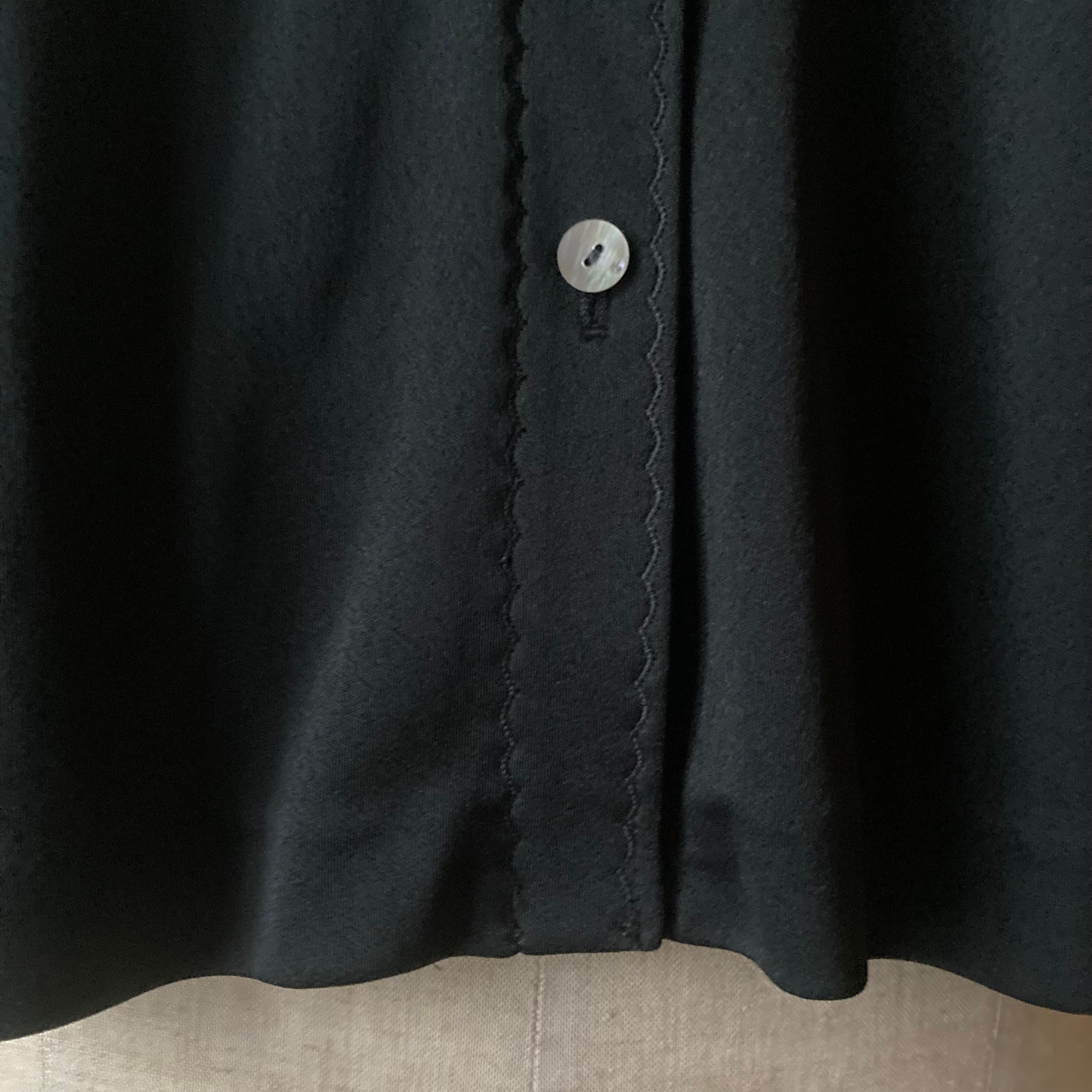 シルエットがきれいな黒のブラウス。小さなちょこんとした襟には花刺繍、ボタンの合わせ部分にはスカラップ刺繍が施されています。シンプルの中にお洒落なデザインを感じる一枚。生地もしっかりしていて一枚でも温かです。