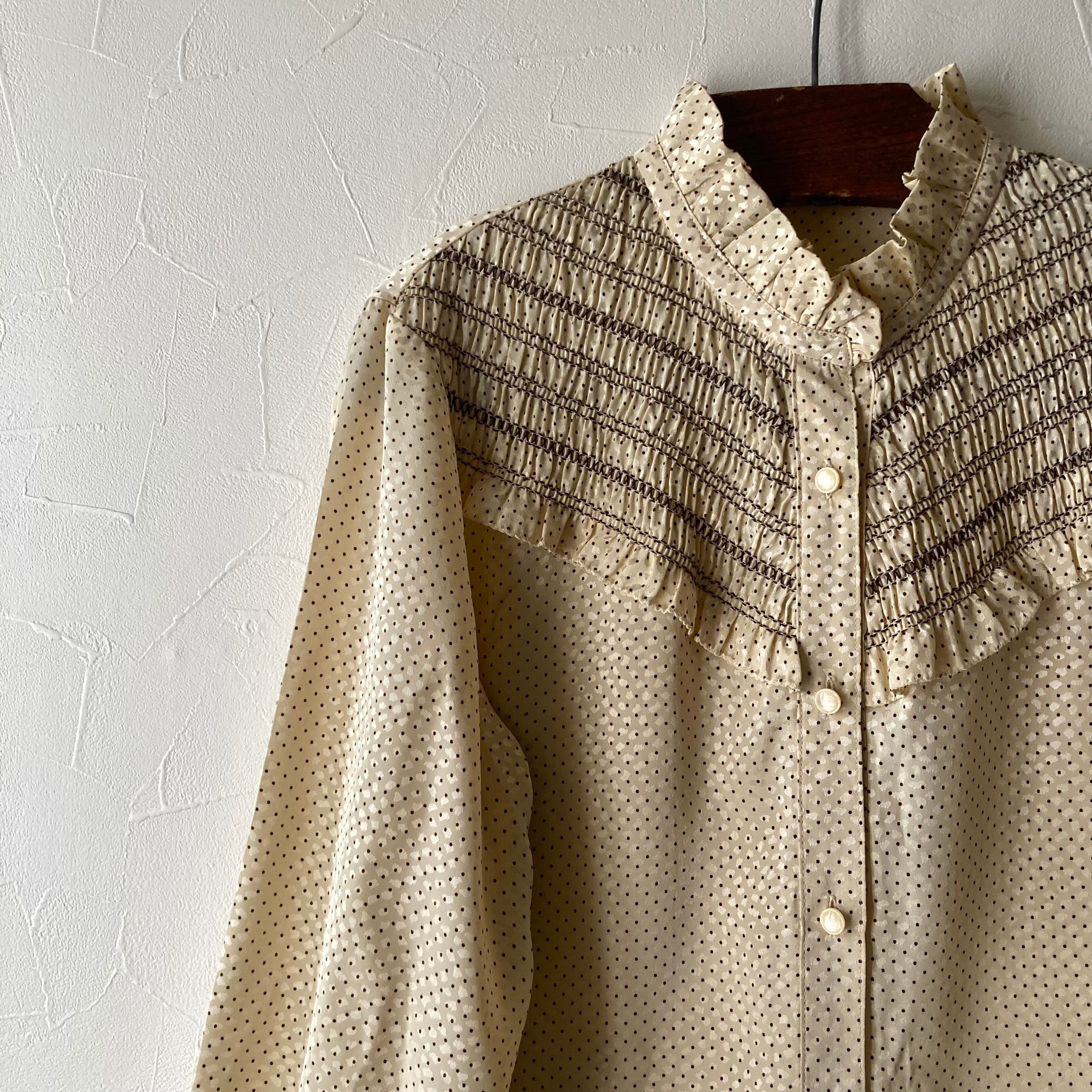 クリーム色に小さなドットとクシュクシュ刺繍が可愛いデザインの東京ブラウス製ブラウス。