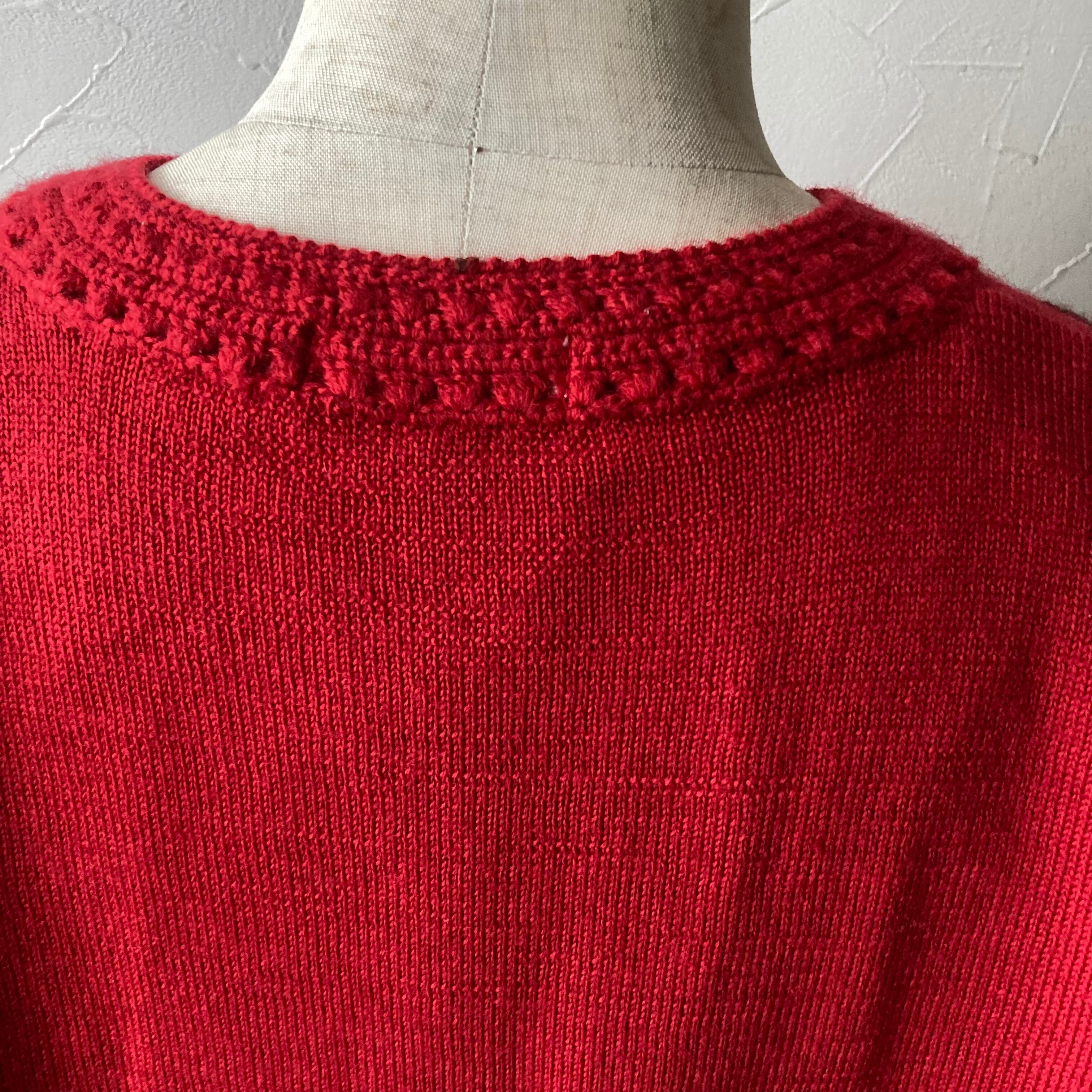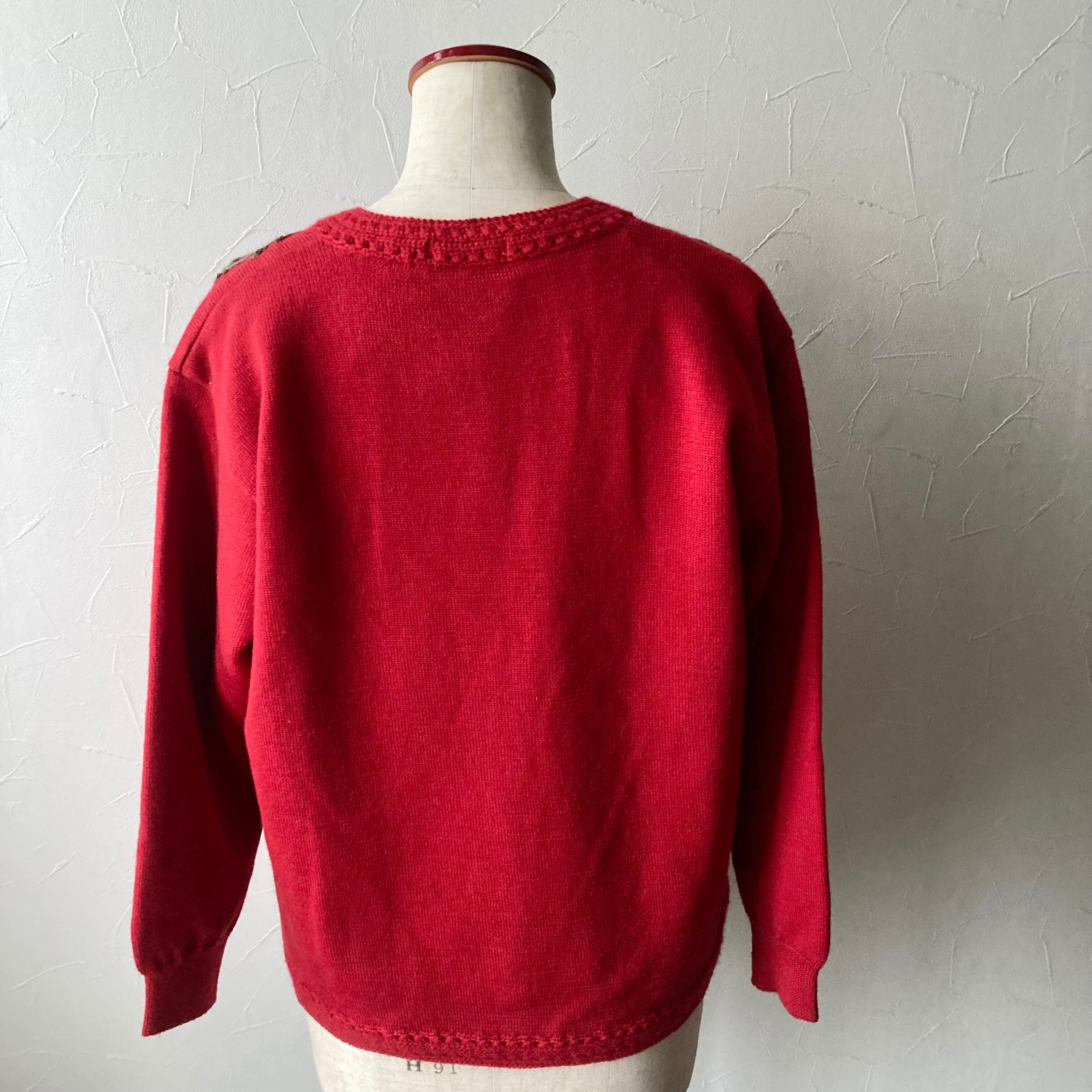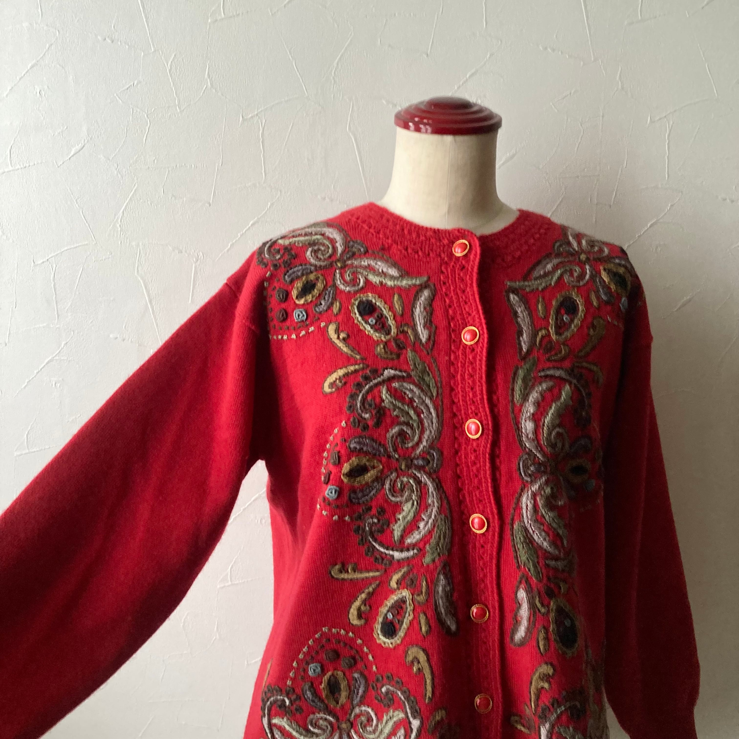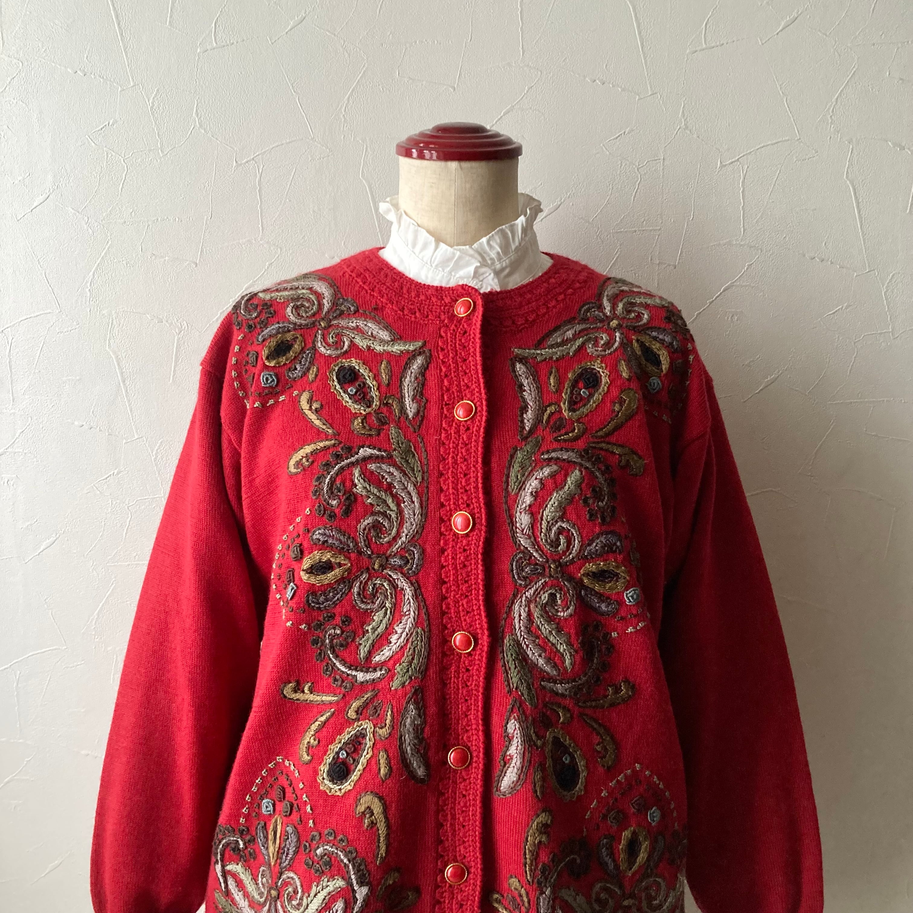 赤色とレトロな刺繍が可愛いニットカーディガン◯ 赤とゴールドのボタンも可愛いです。